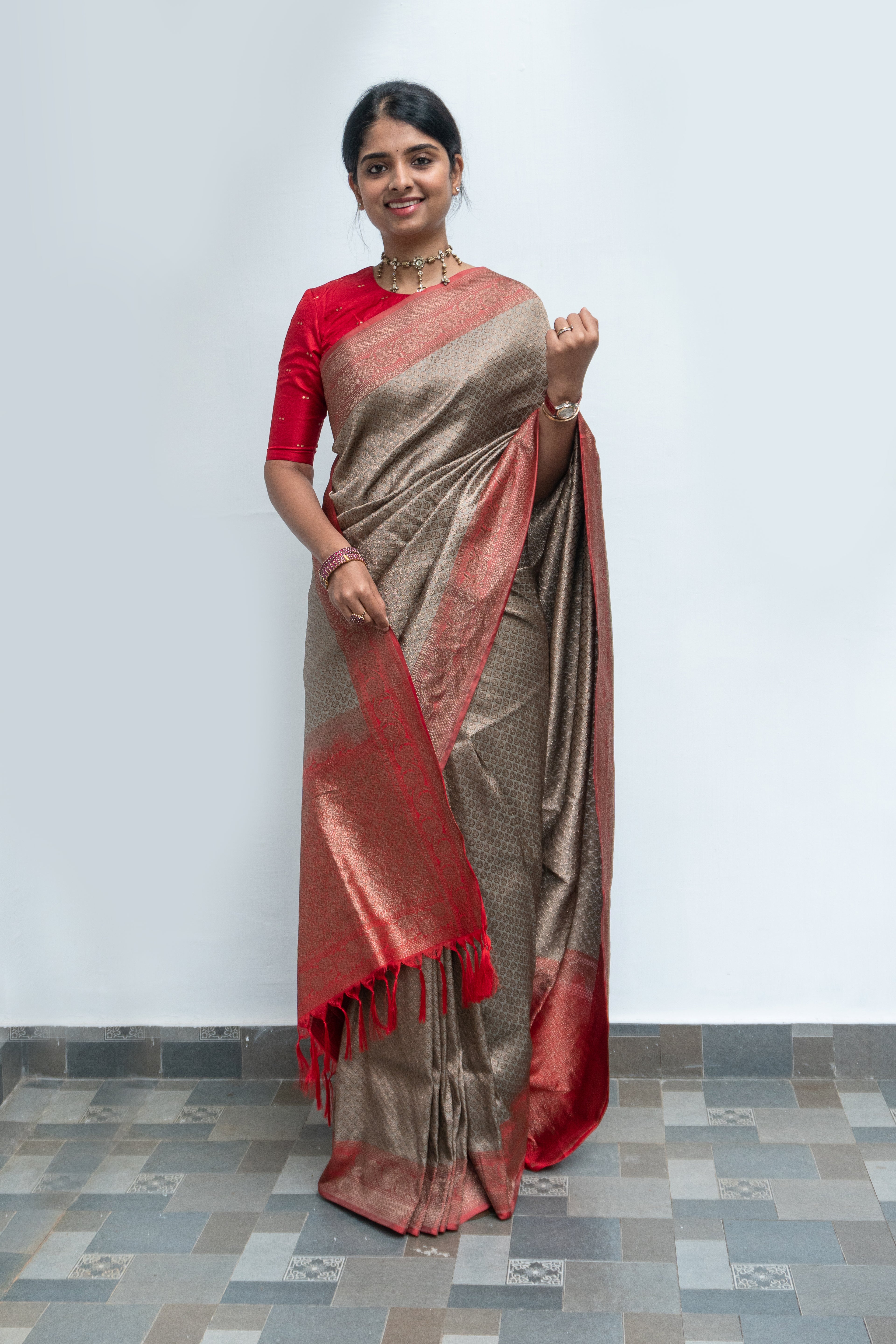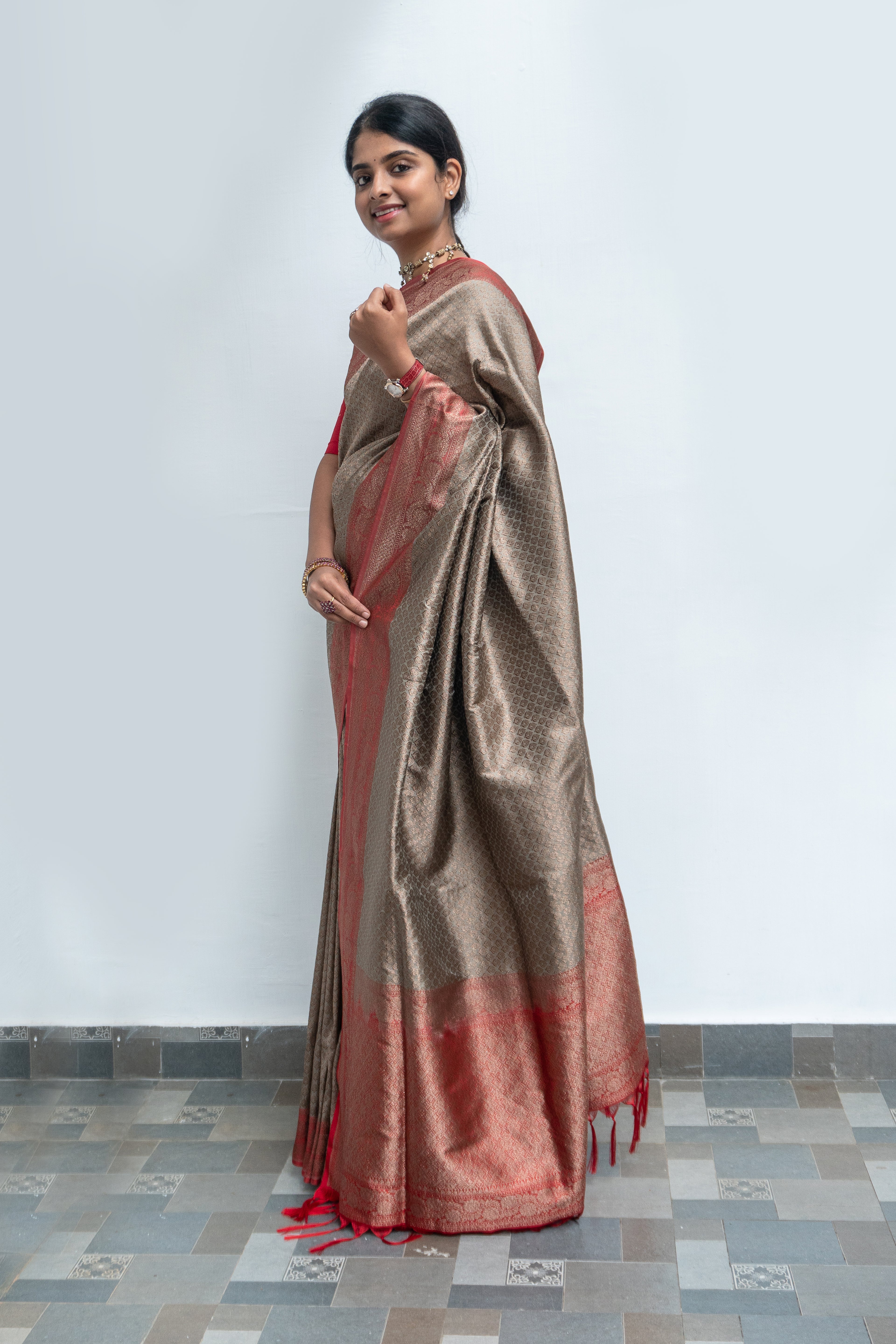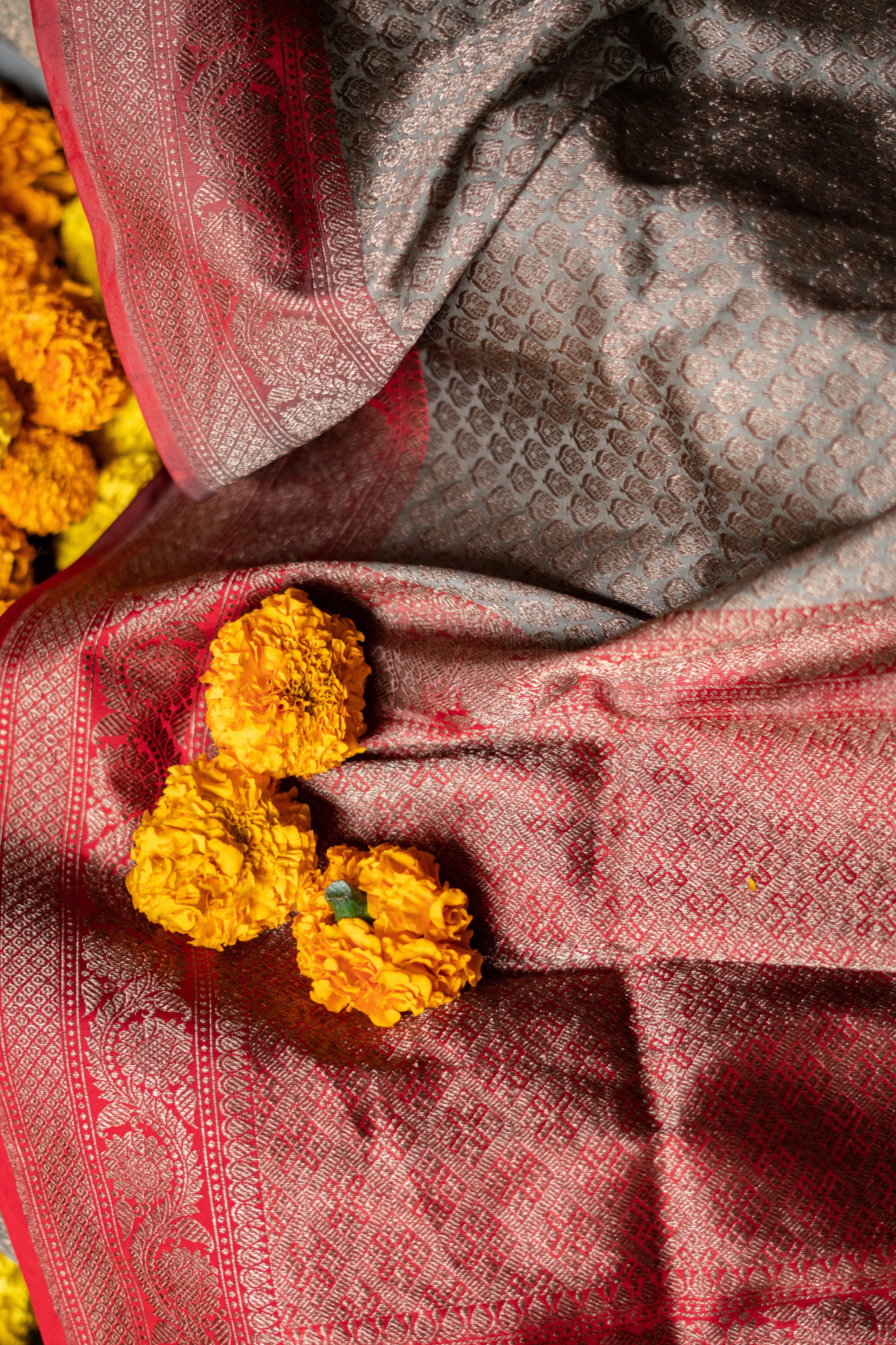 Metallic Grey Banarasi Saree with Red Border