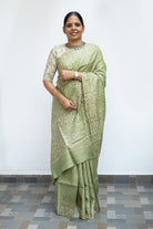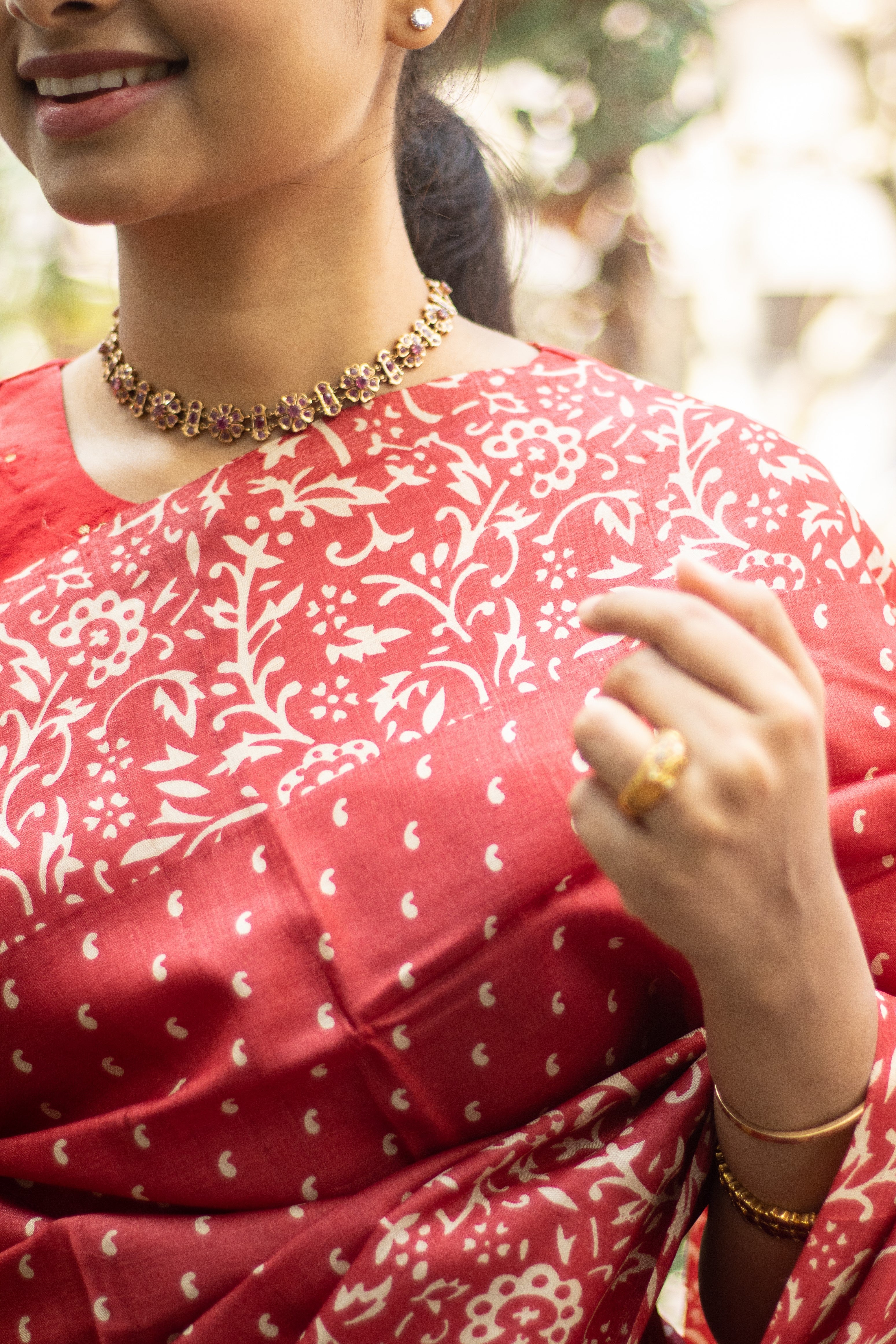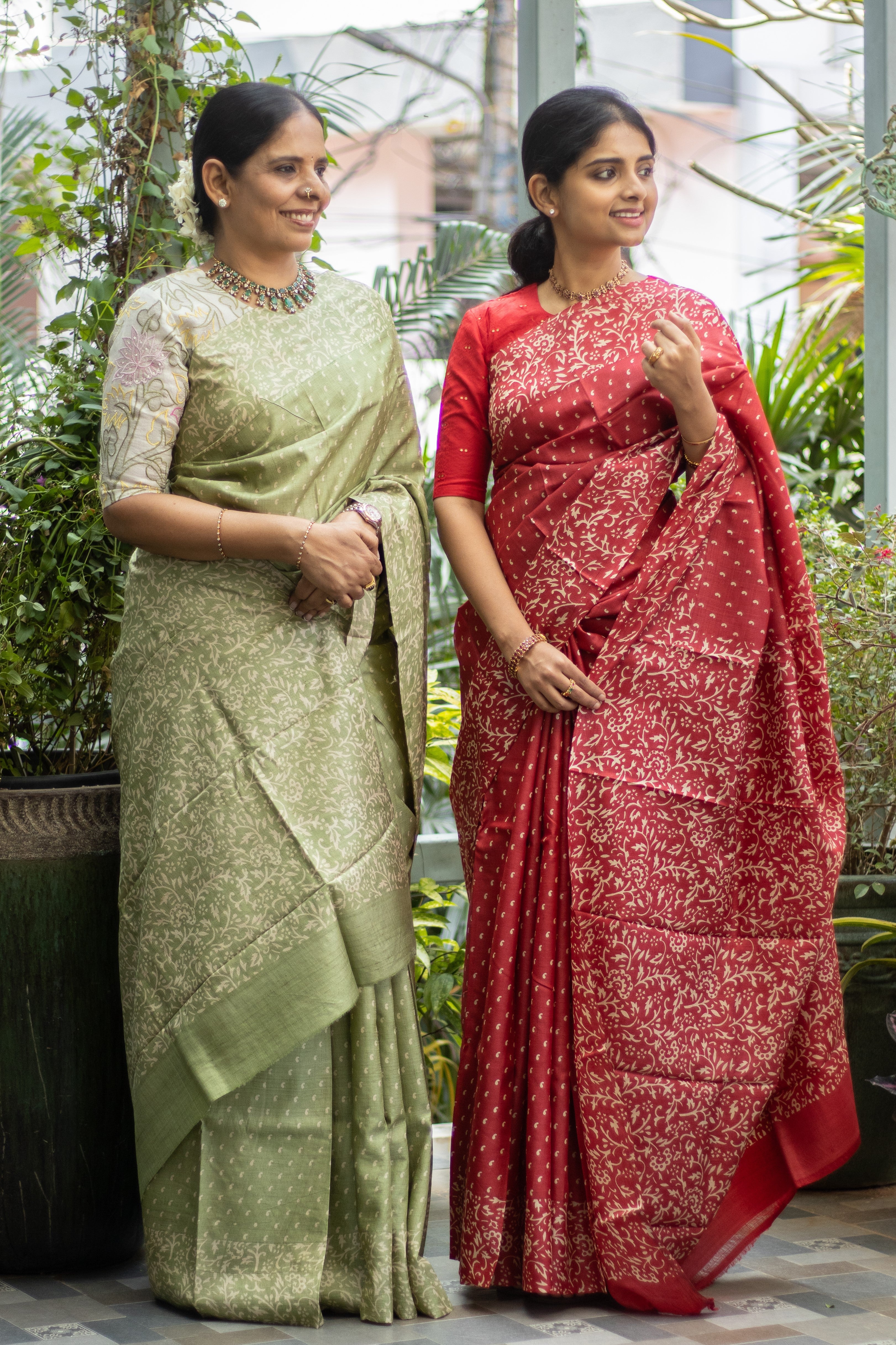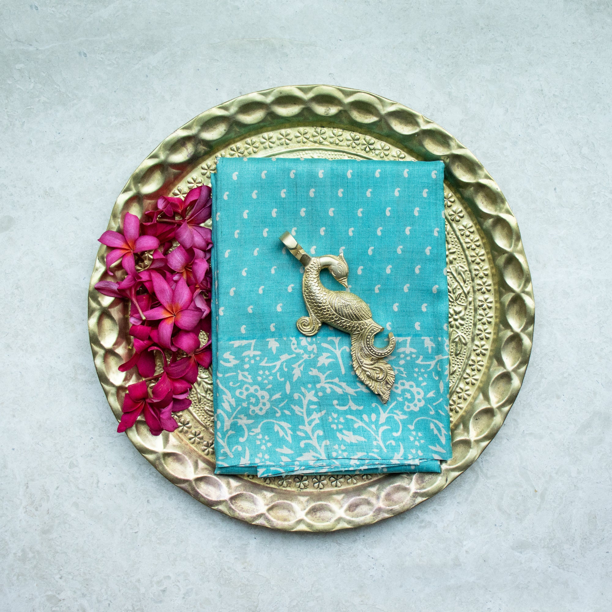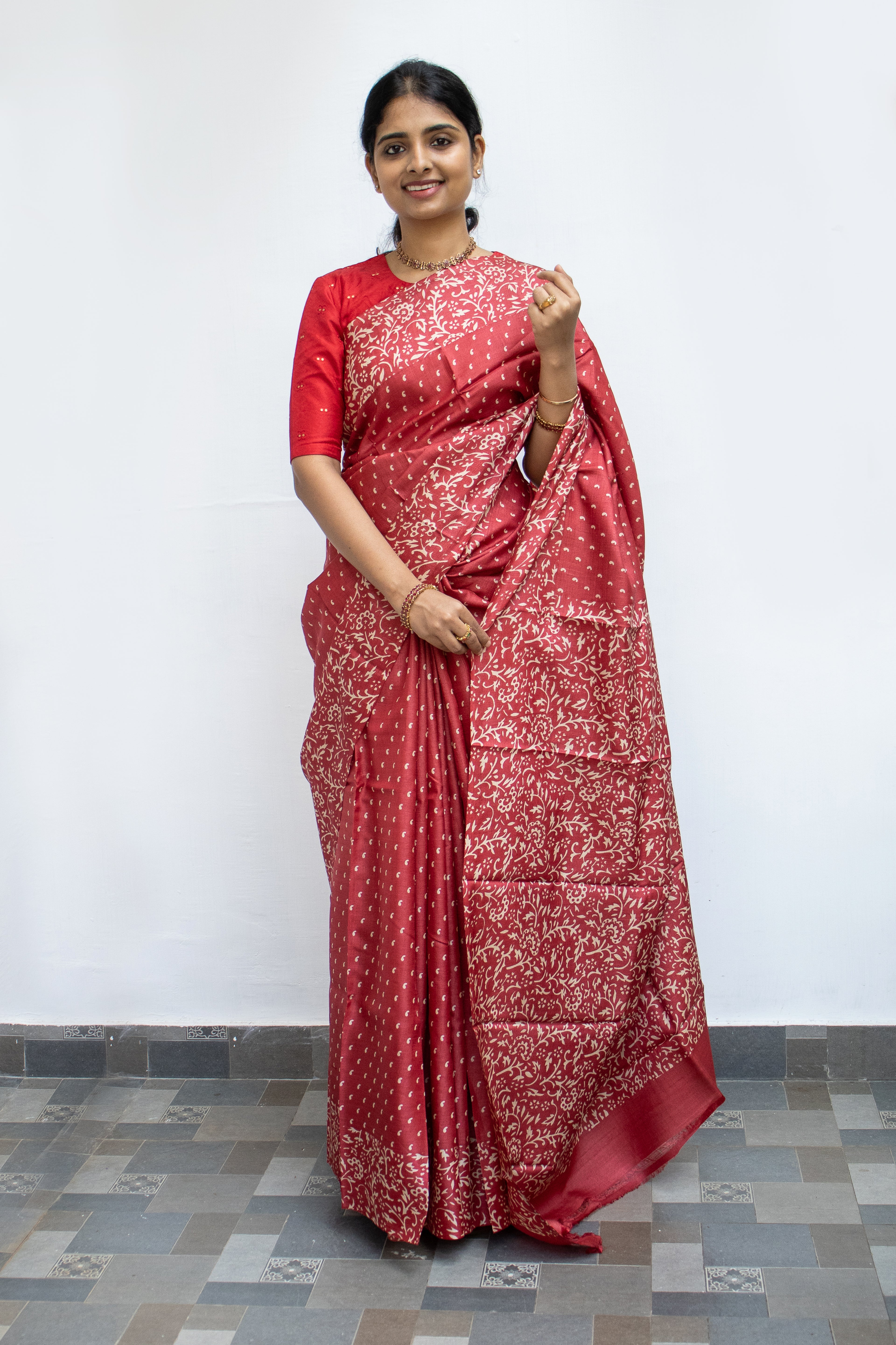 Crafted from pure Tussar silk, this saree features exquisite hand block–printed motifs across the body, with each design individually printed to reflect true artisanal craftsmanship. The fabric’s natural texture and subtle matte sheen enhance its understated elegance, while the fluid, graceful drape ensures effortless wear.