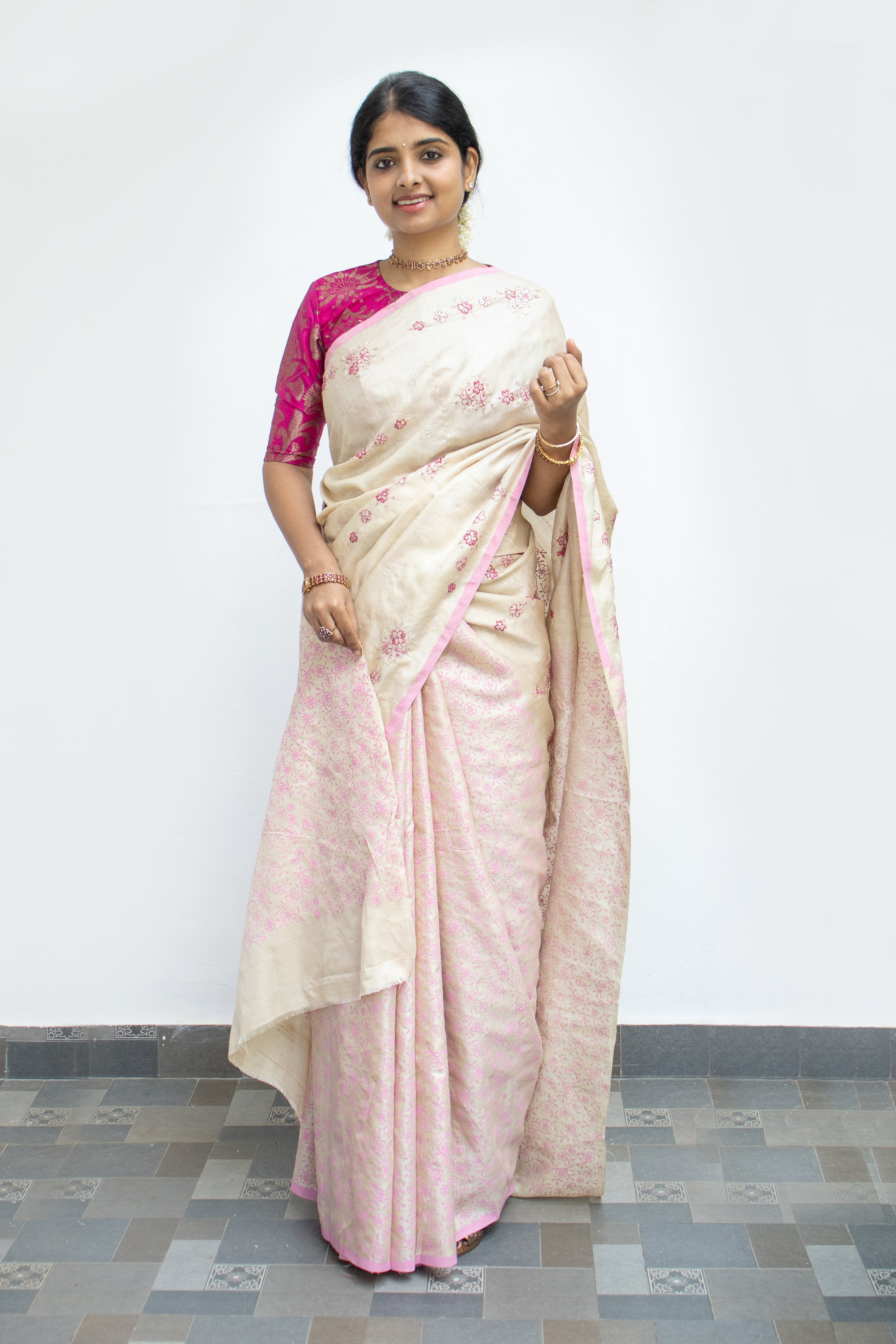 Tussar Silk Saree with Shadow Work Embroidery & Hand Block Floral Print