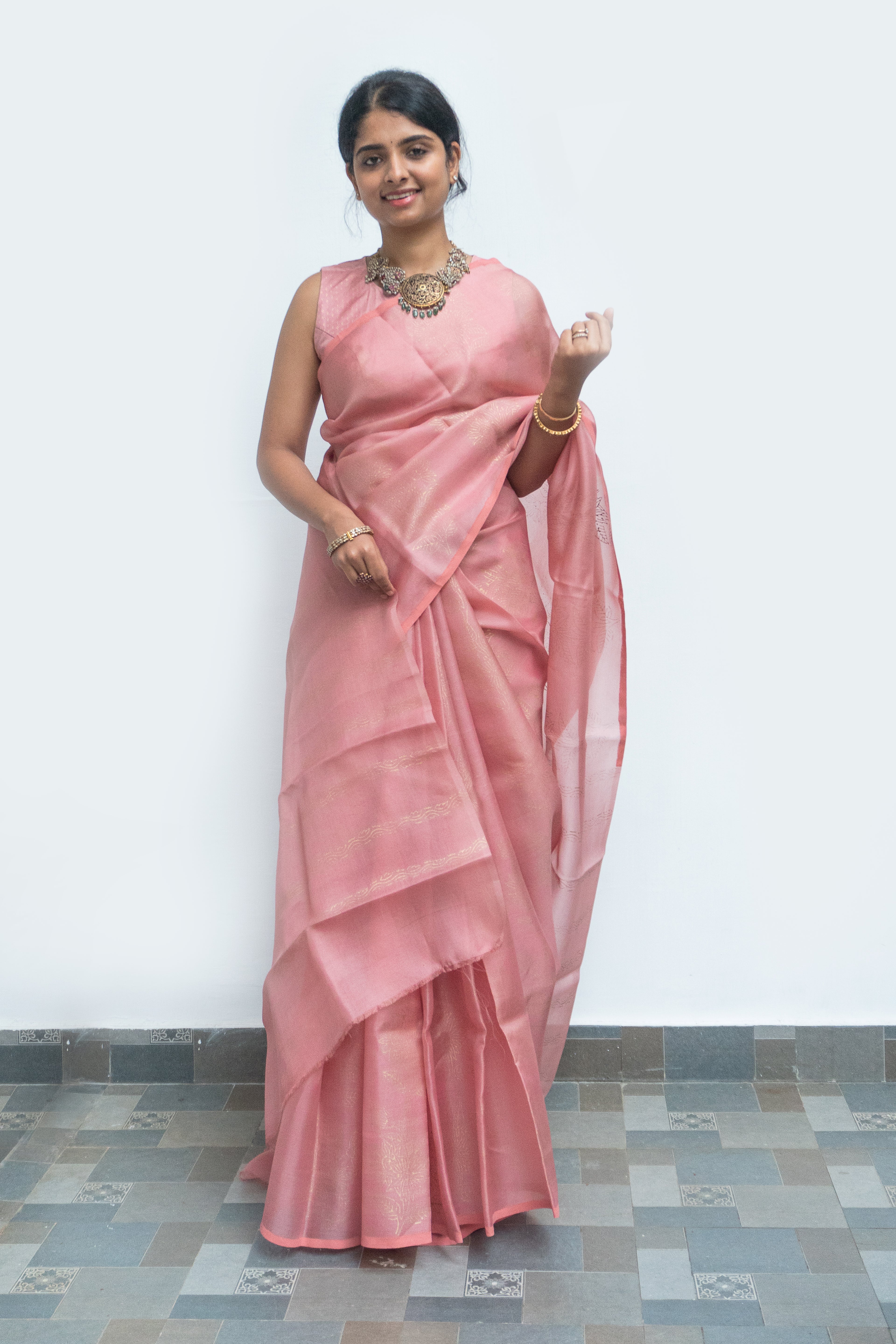 This pastel pink organza silk saree drapes fluidly, accentuated by a soft, delicate sheen that enhances its light and airy elegance. The body is adorned with gold hand block–printed motifs, adding artisanal charm and subtle richness to the translucent weave.