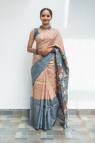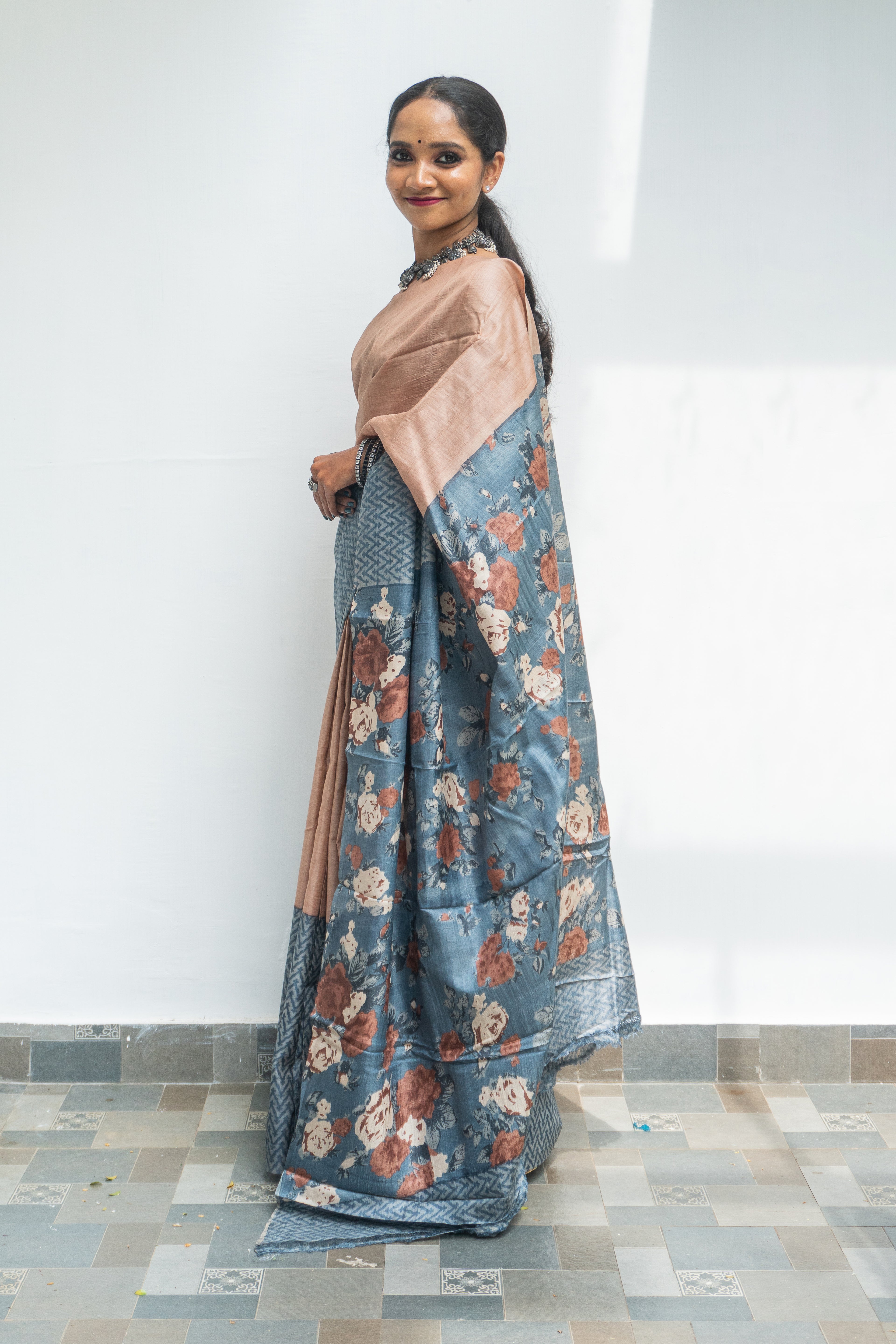 This graceful beige Tussar silk saree carries a soft undertone of pink, flowing into a long grey border featuring a striking zig-zag block print for a modern edge. The highlight of the saree is its pallu, adorned with worn floral print motifs that bring contrast, texture, and visual interest. Ideal for both daytime occasions and evening events, this saree captures the essence of understated elegance with contemporary charm.