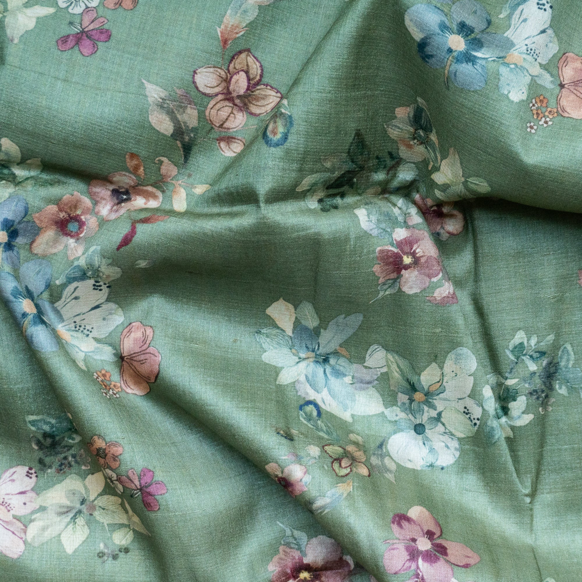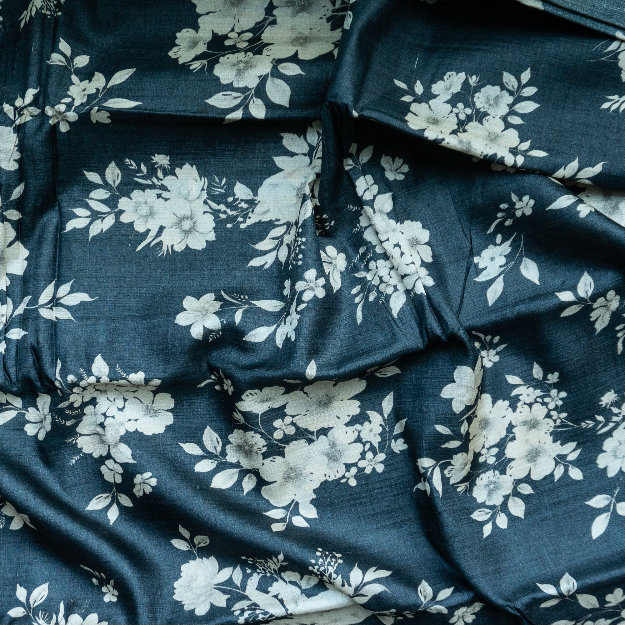 Ivory floral tussar silk is a luxurious fabric featuring delicate floral motifs printed into rich, textured silk. The soft ivory tone enhances the intricate floral patterns, creating a sophisticated, timeless appeal.