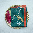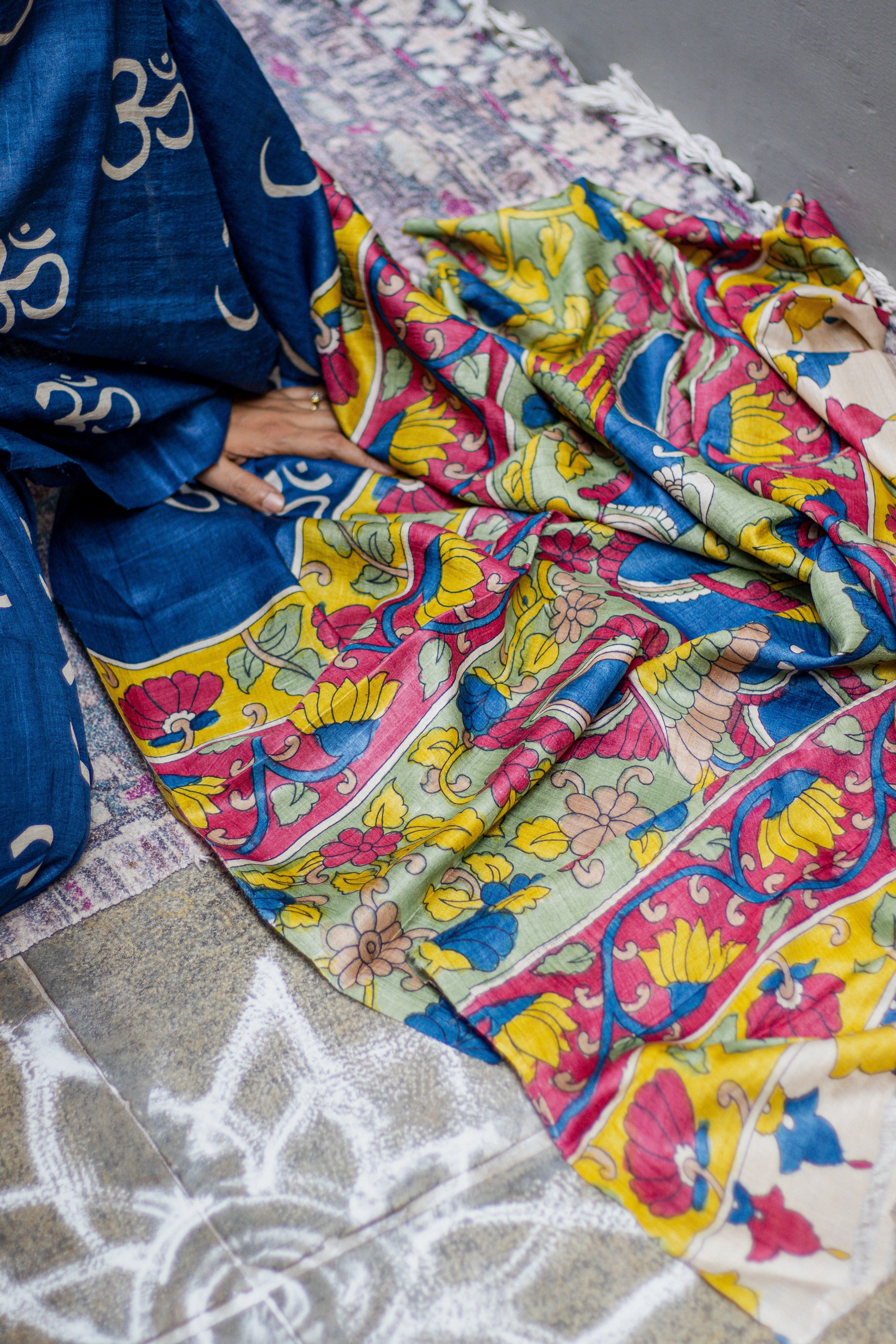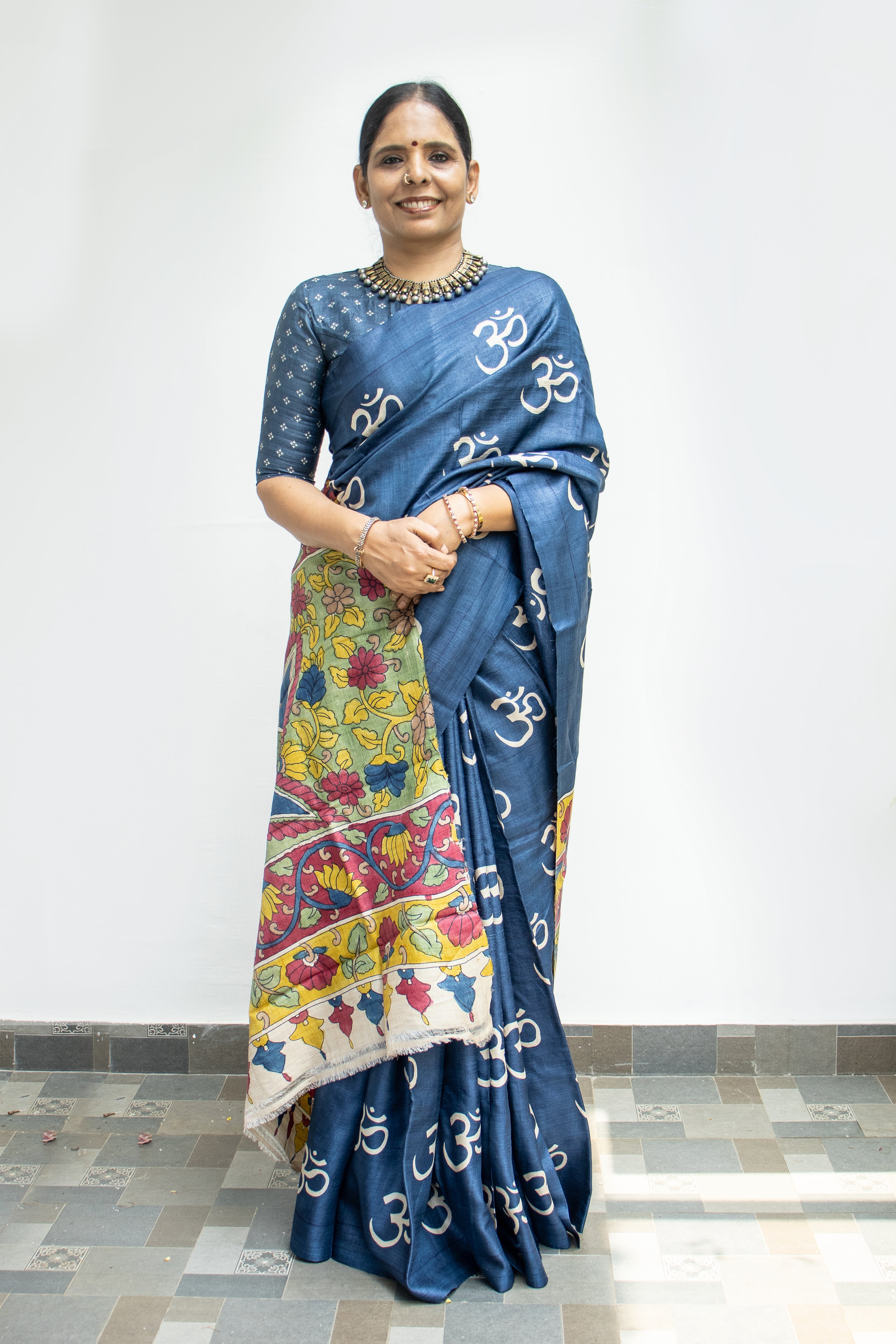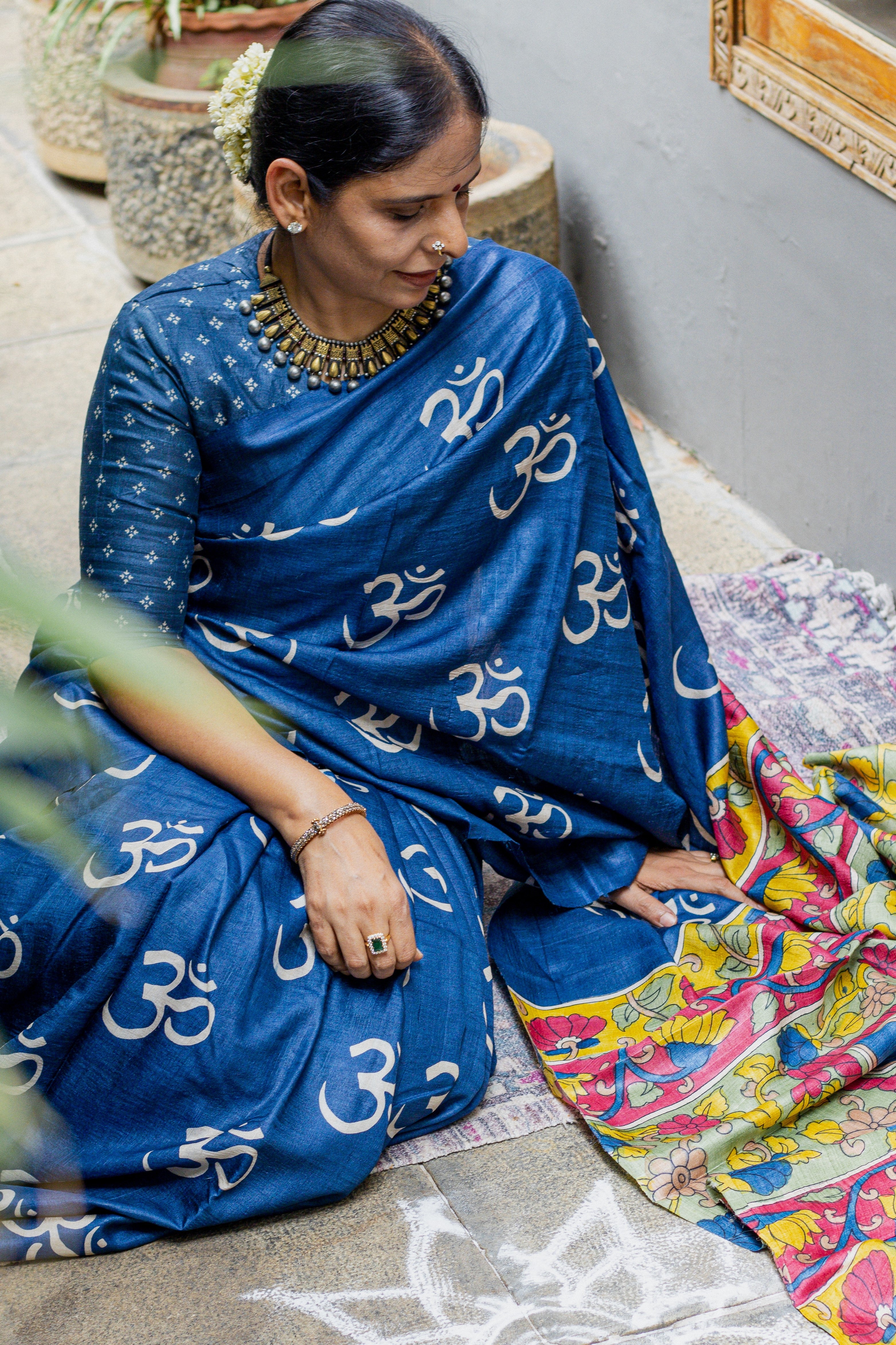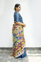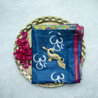 Indigo Tussar Silk Saree with Om Block Print & Kalamkari Pallu