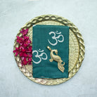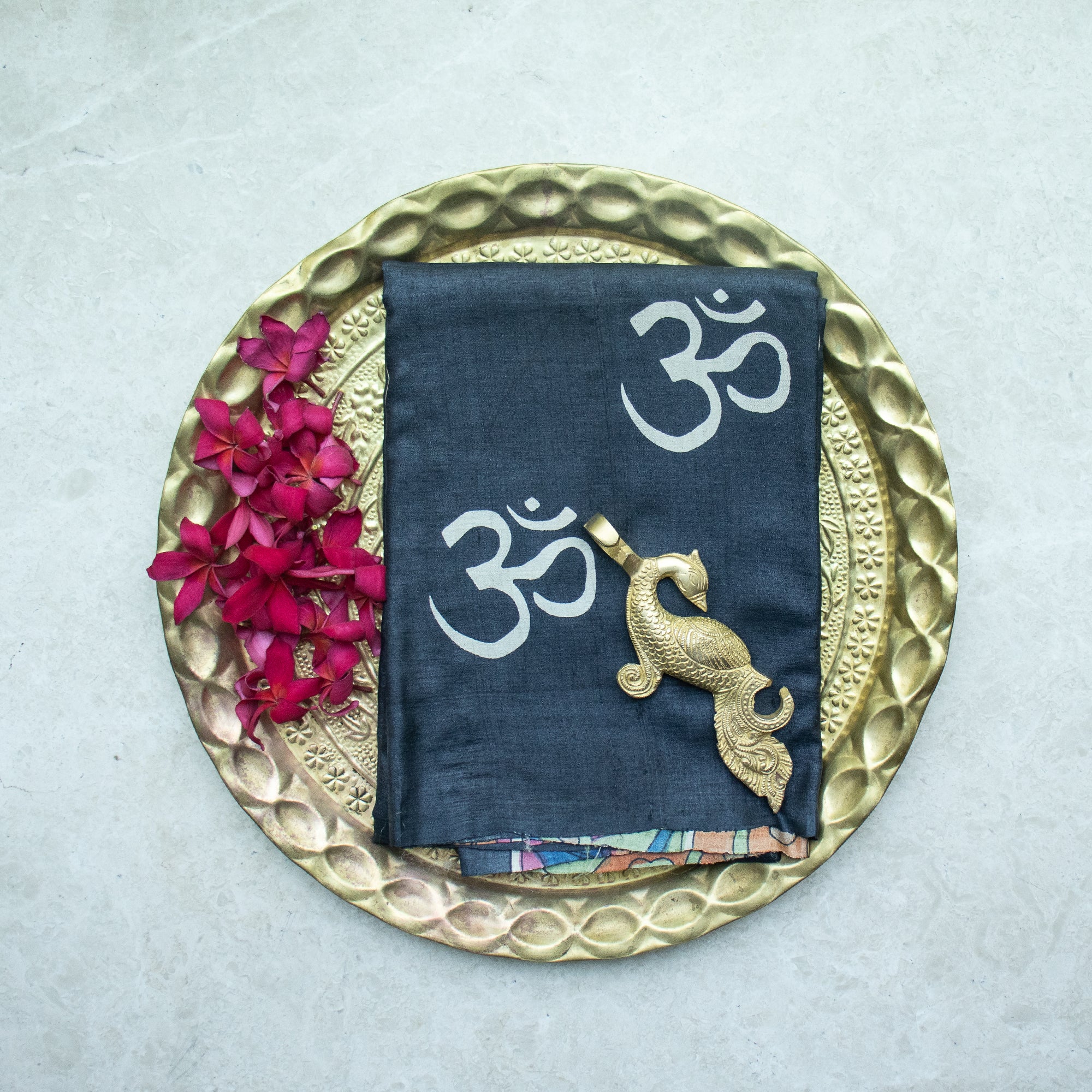 A bold expression of artisanal elegance, this indigo Tussar silk saree is crafted in richly textured silk, celebrated for its natural matte finish and earthy sophistication. The deep indigo body is adorned with hand block printed “Om” motifs, creating a serene, rhythmic pattern that adds both spiritual depth and visual interest.