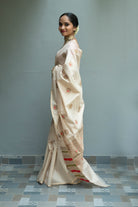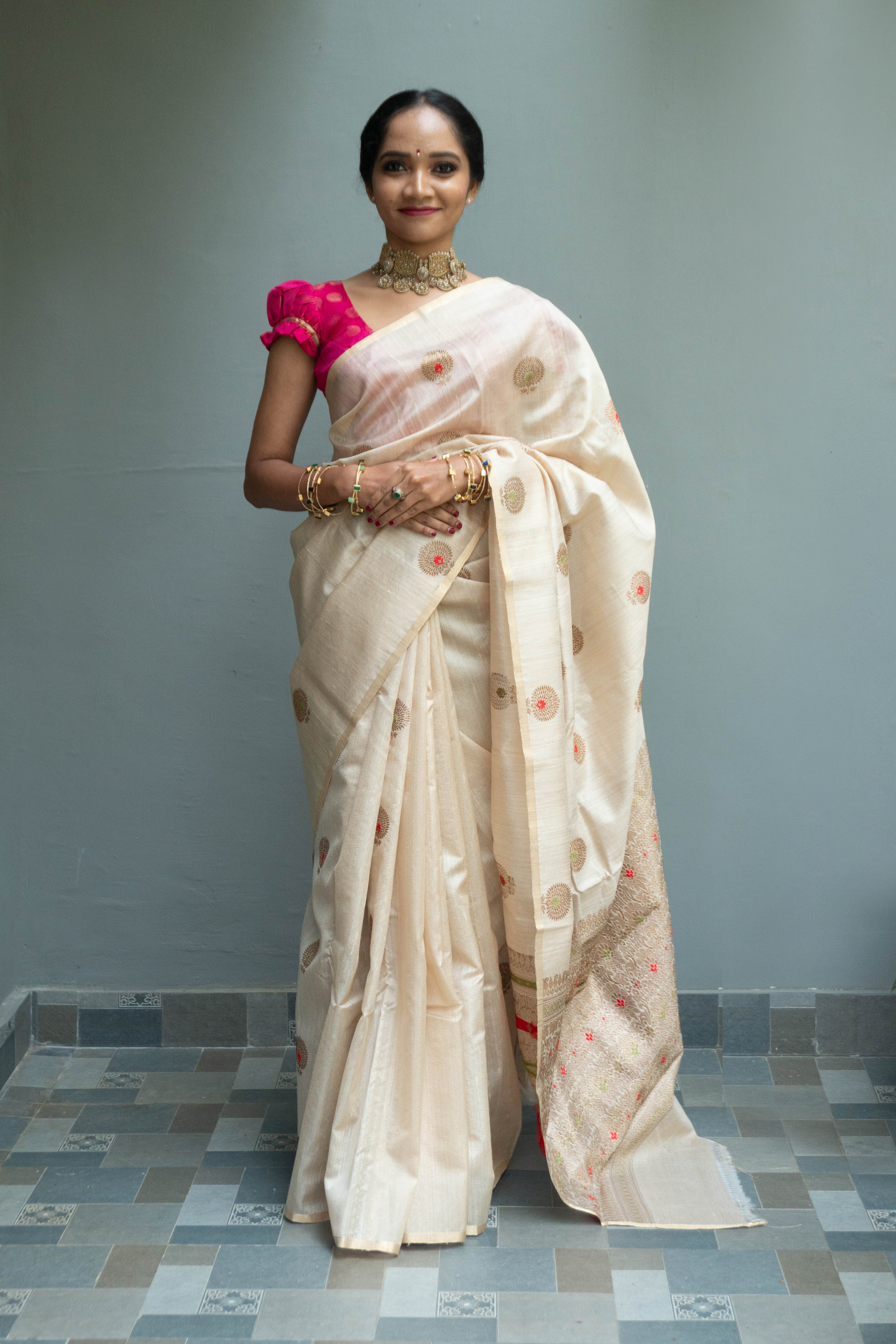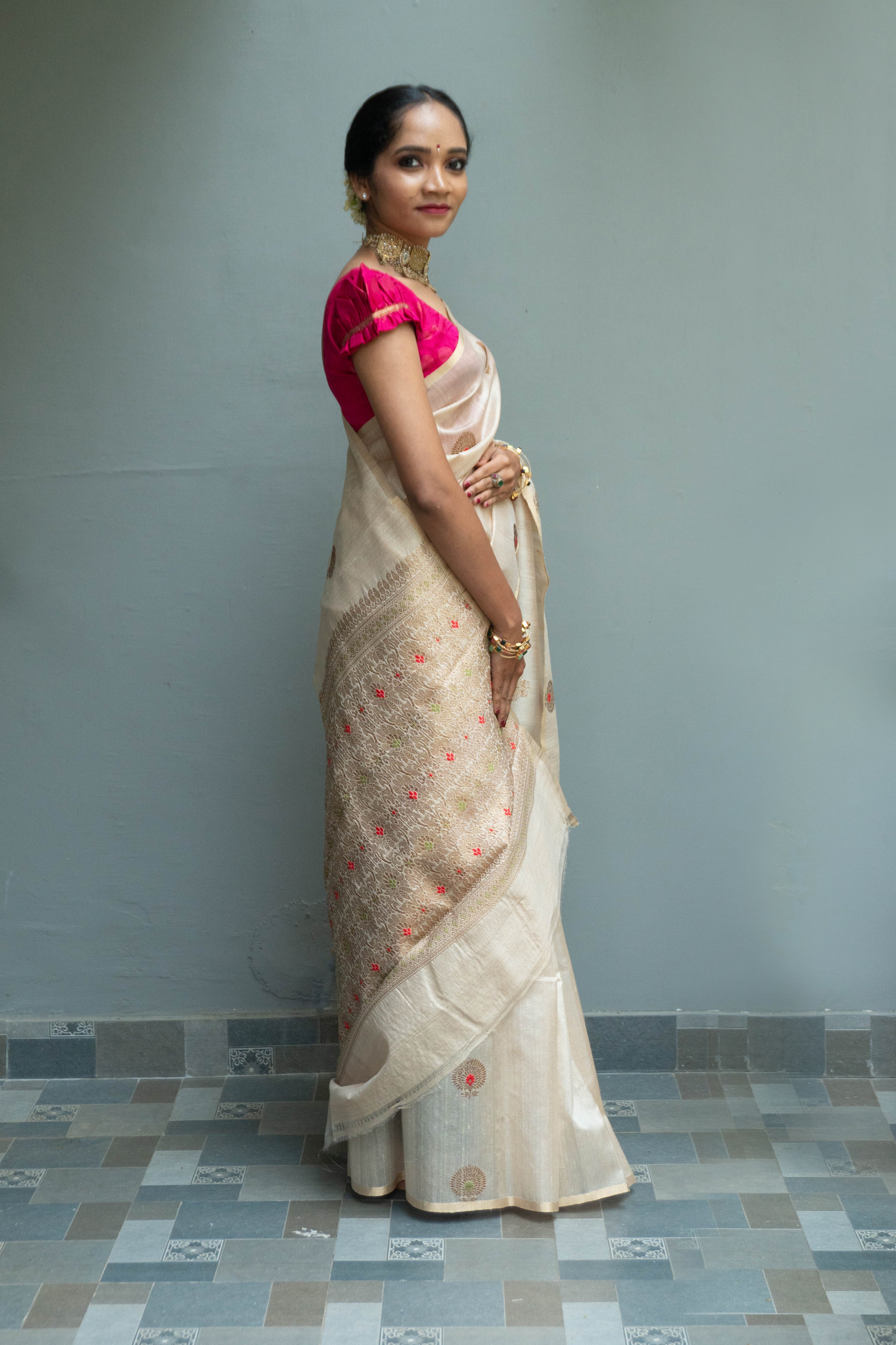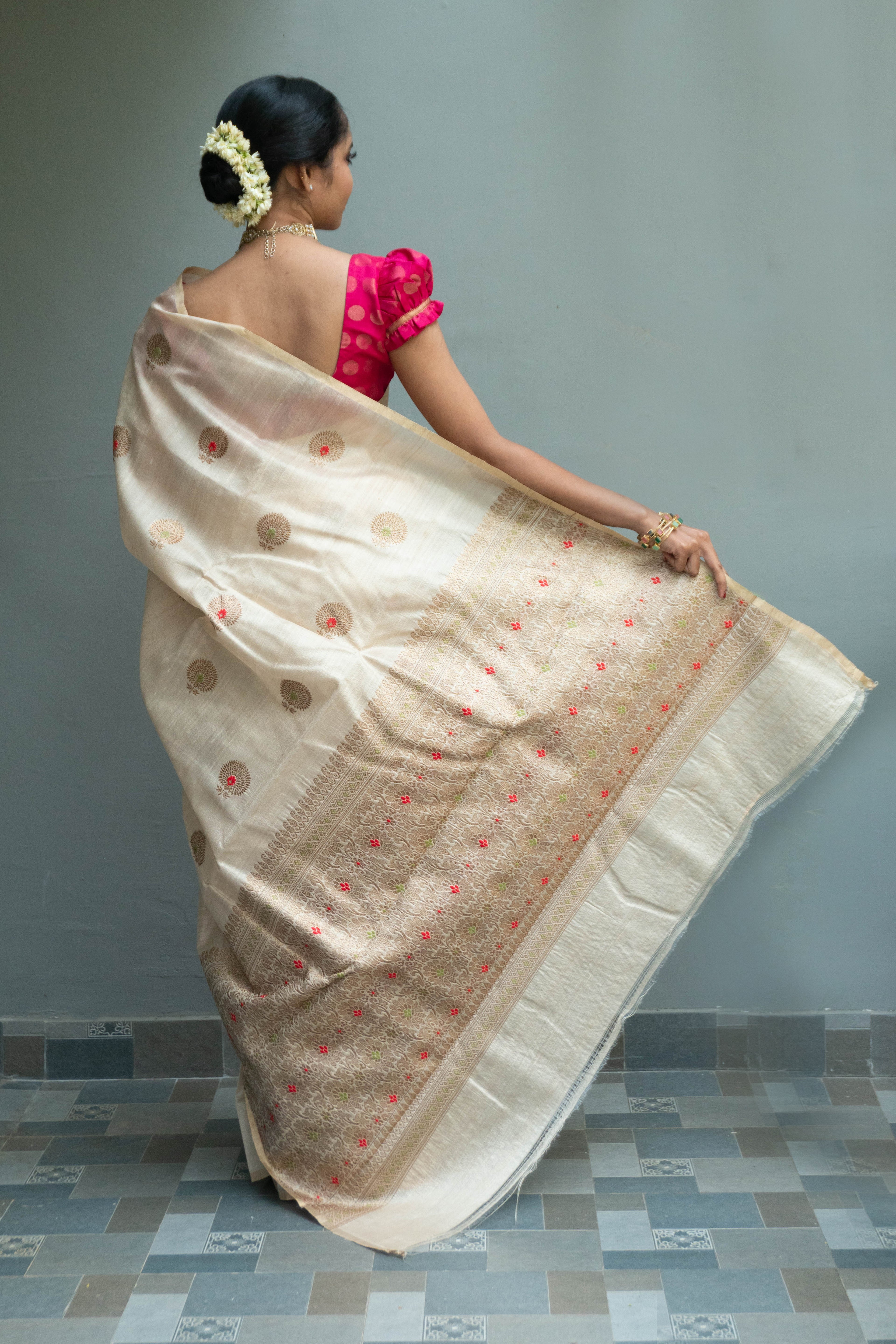 Banarasi Tussar silk saree in ivory shade with traditional handwoven gold zari buttis in the body. The pallu is intricately woven with floral designs and pops of colour in red and green .
