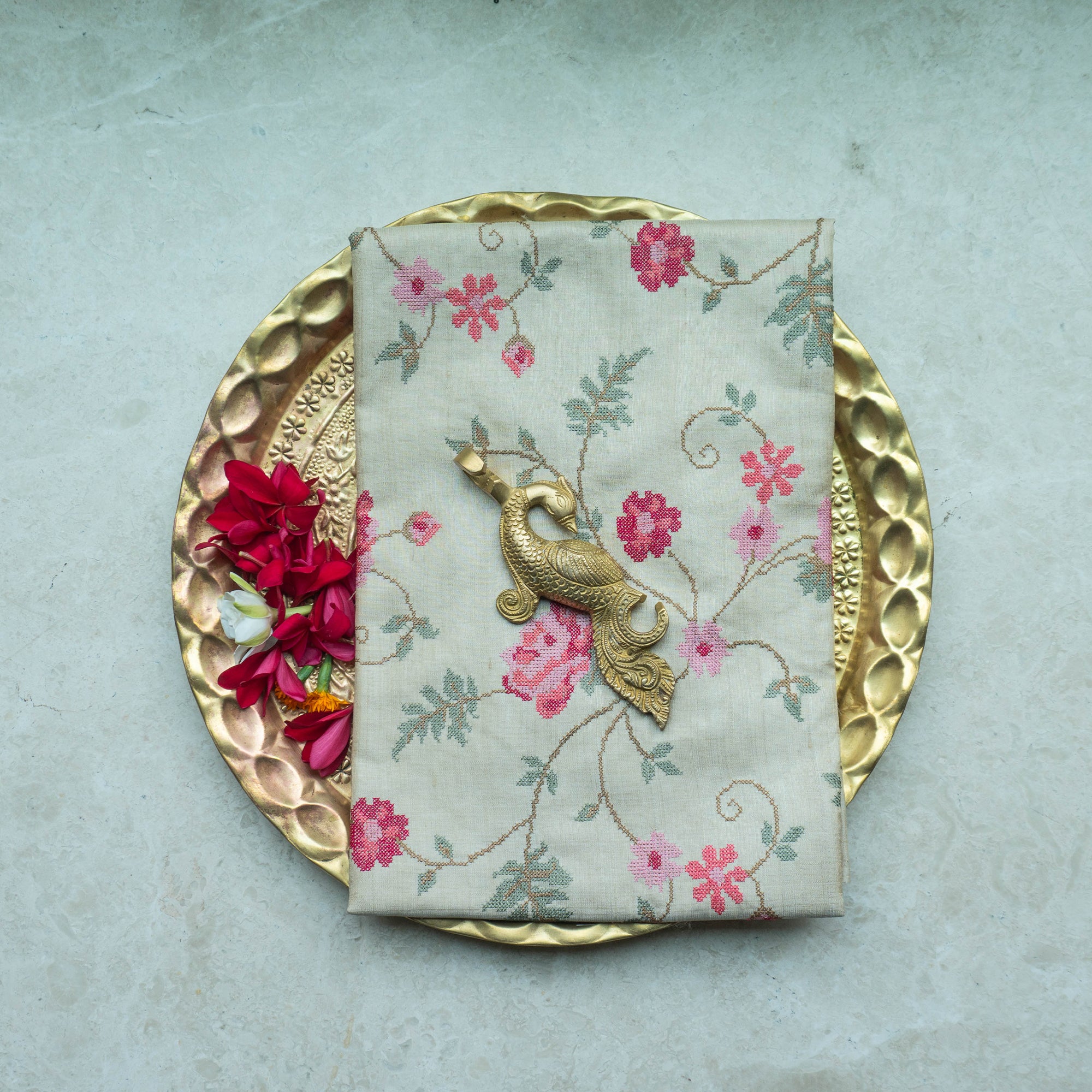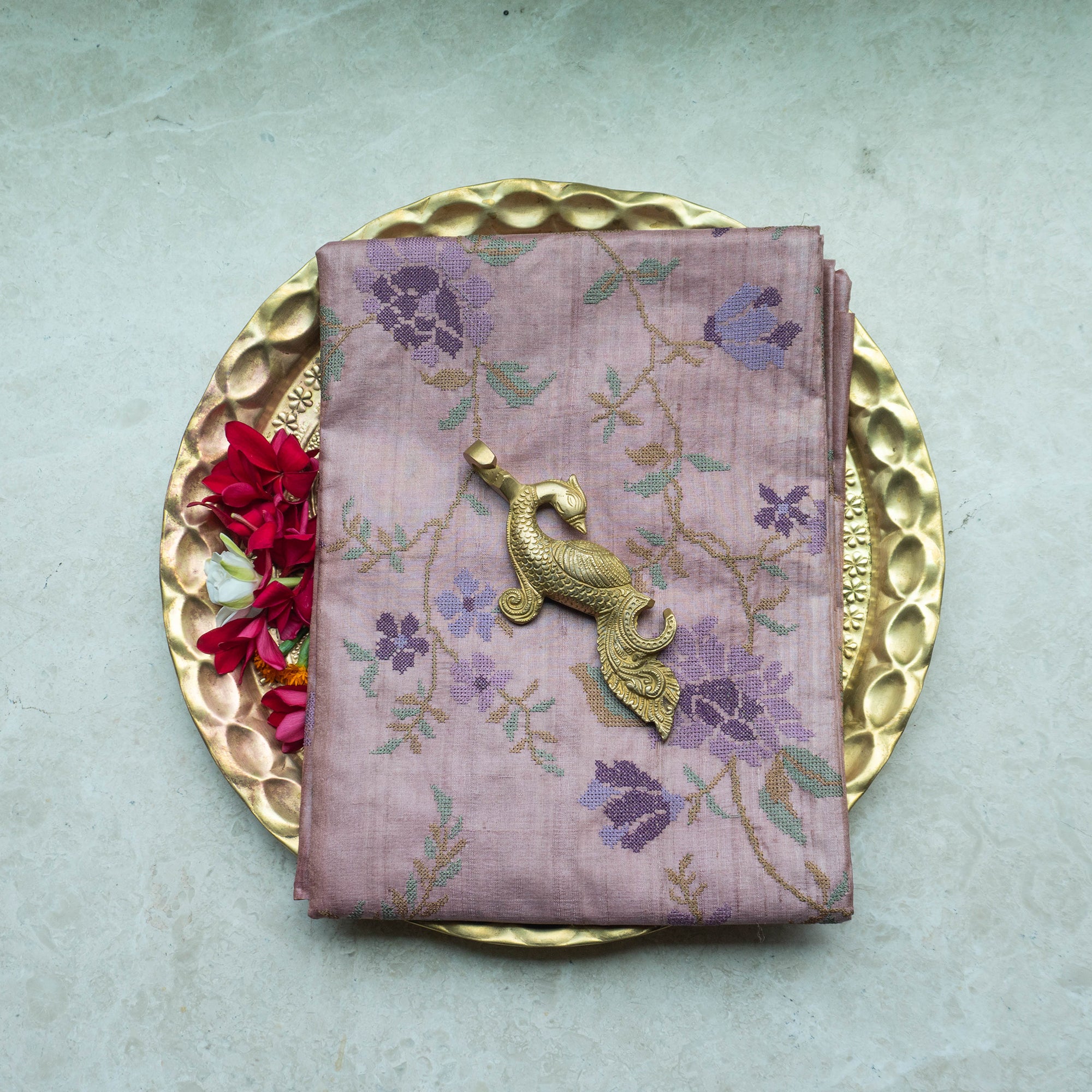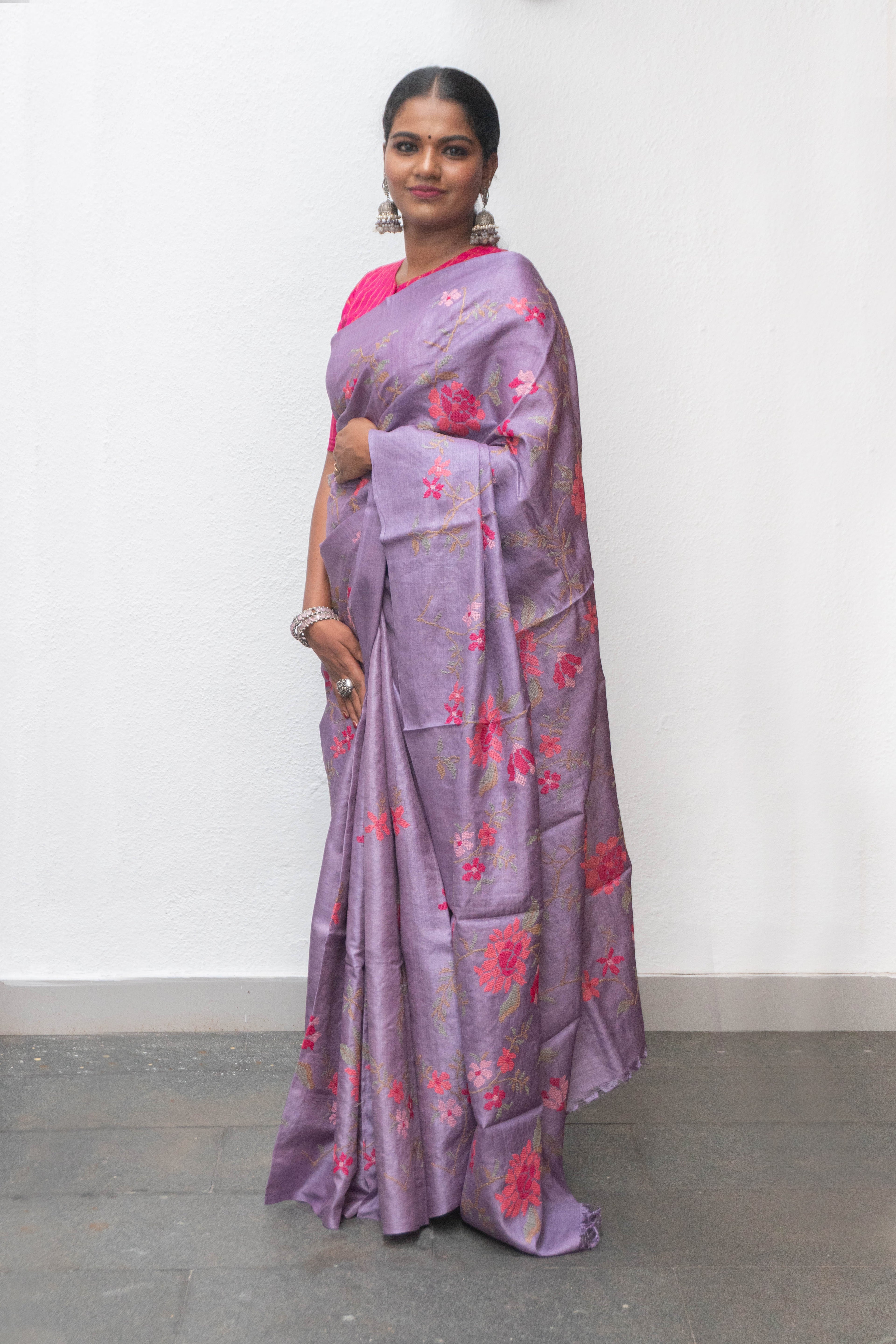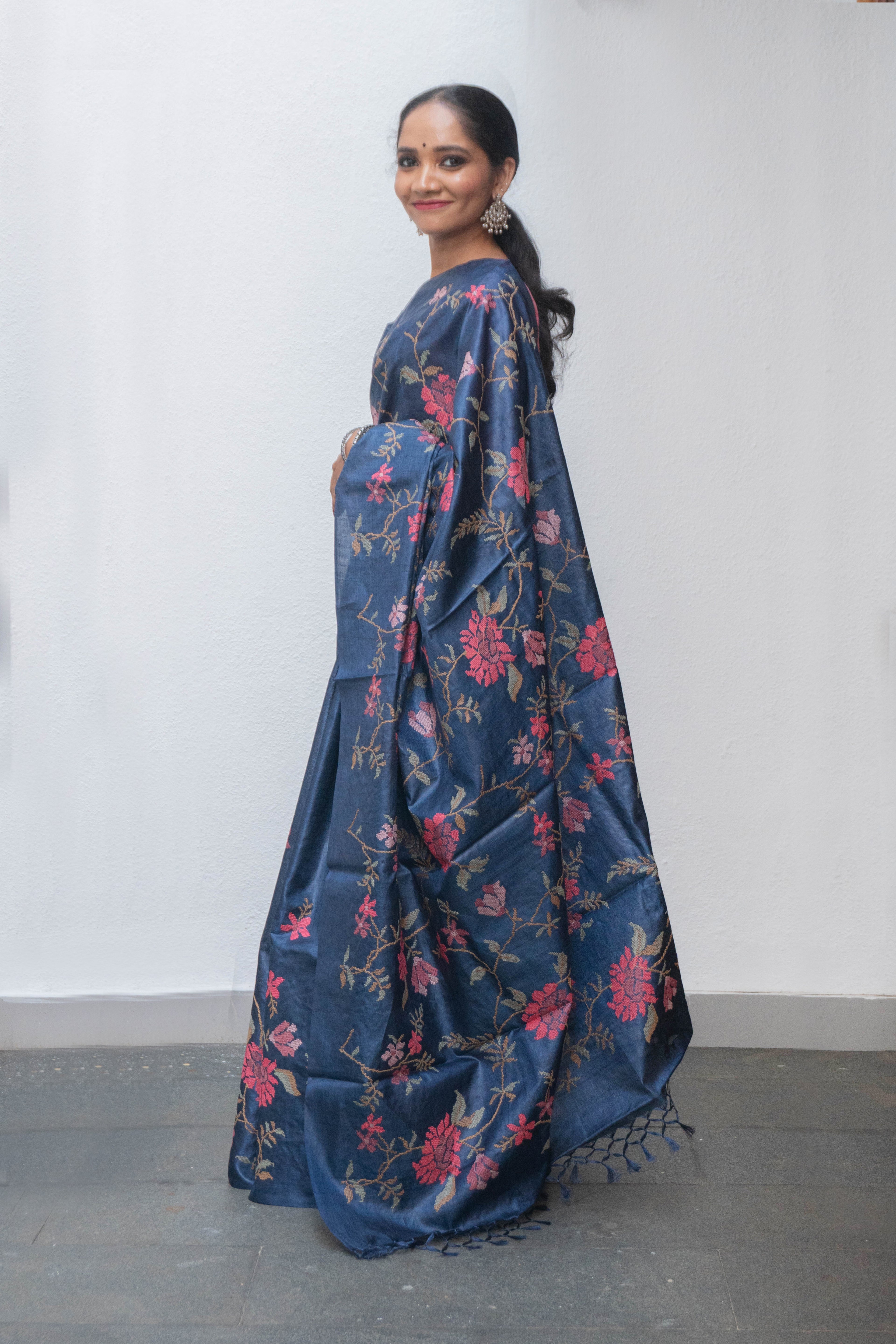 Pure Tussar silk sarees, which have been hand-spun using the finest of threads with vibrant floral cross-stitch embroidery all over the body. Turn heads with its eye-catching design.