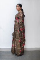 Chocolate Brown Cross-stitch Floral Embroidery Saree
