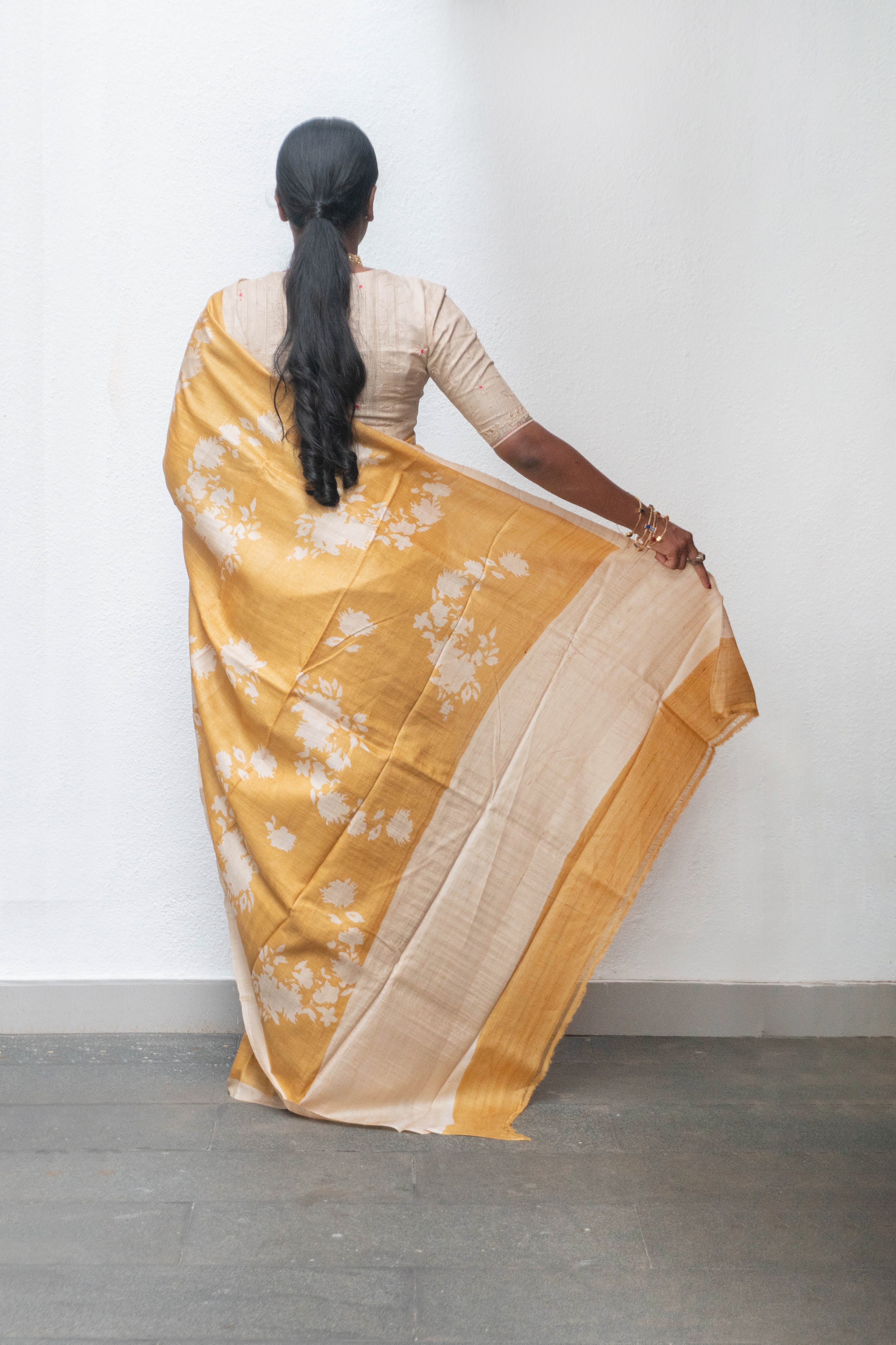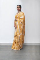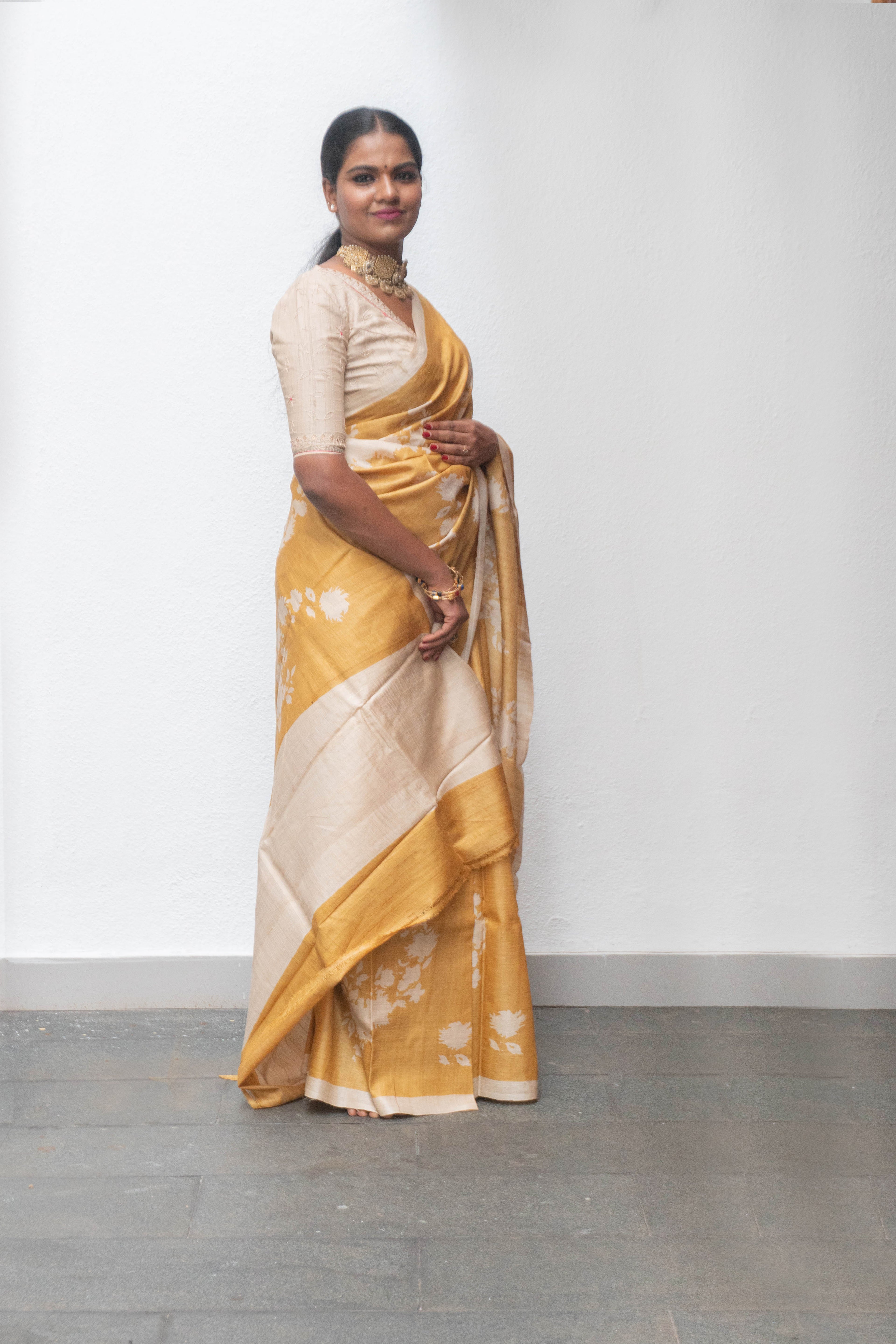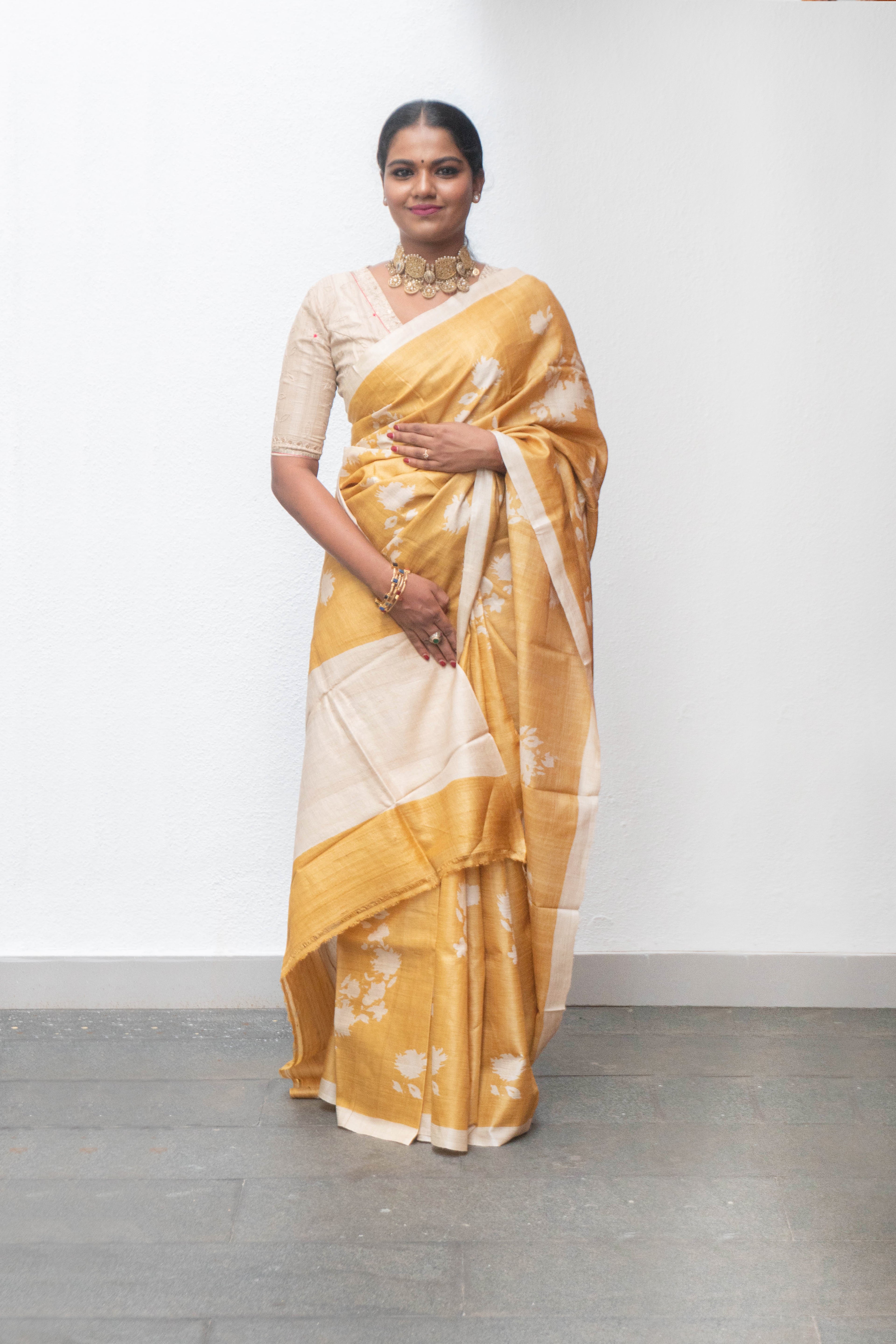 Wrap yourself in a Mustard Tussar silk saree with beige florals in the body. Experience the softness and quality of silk with this elegant piece.