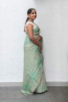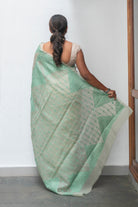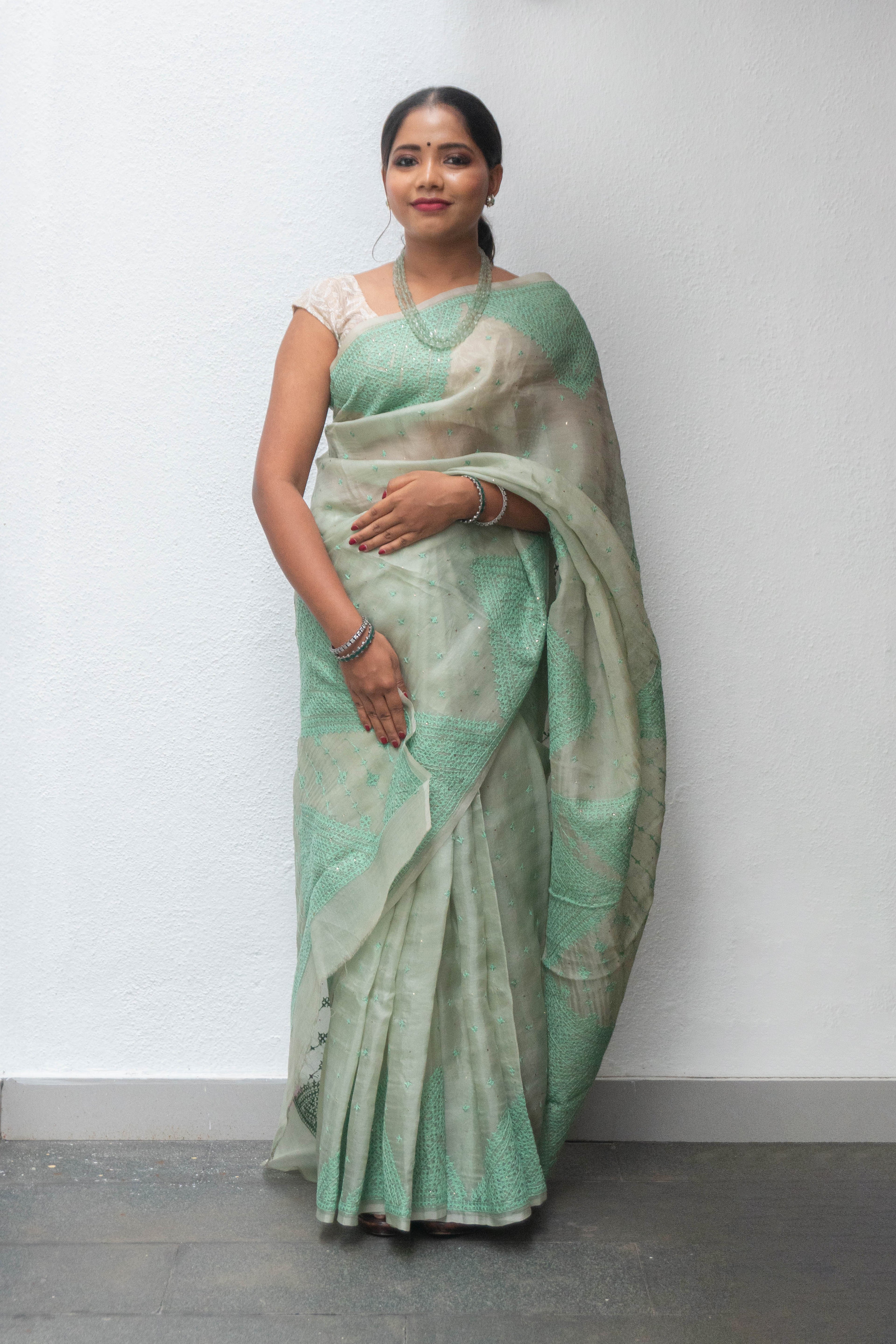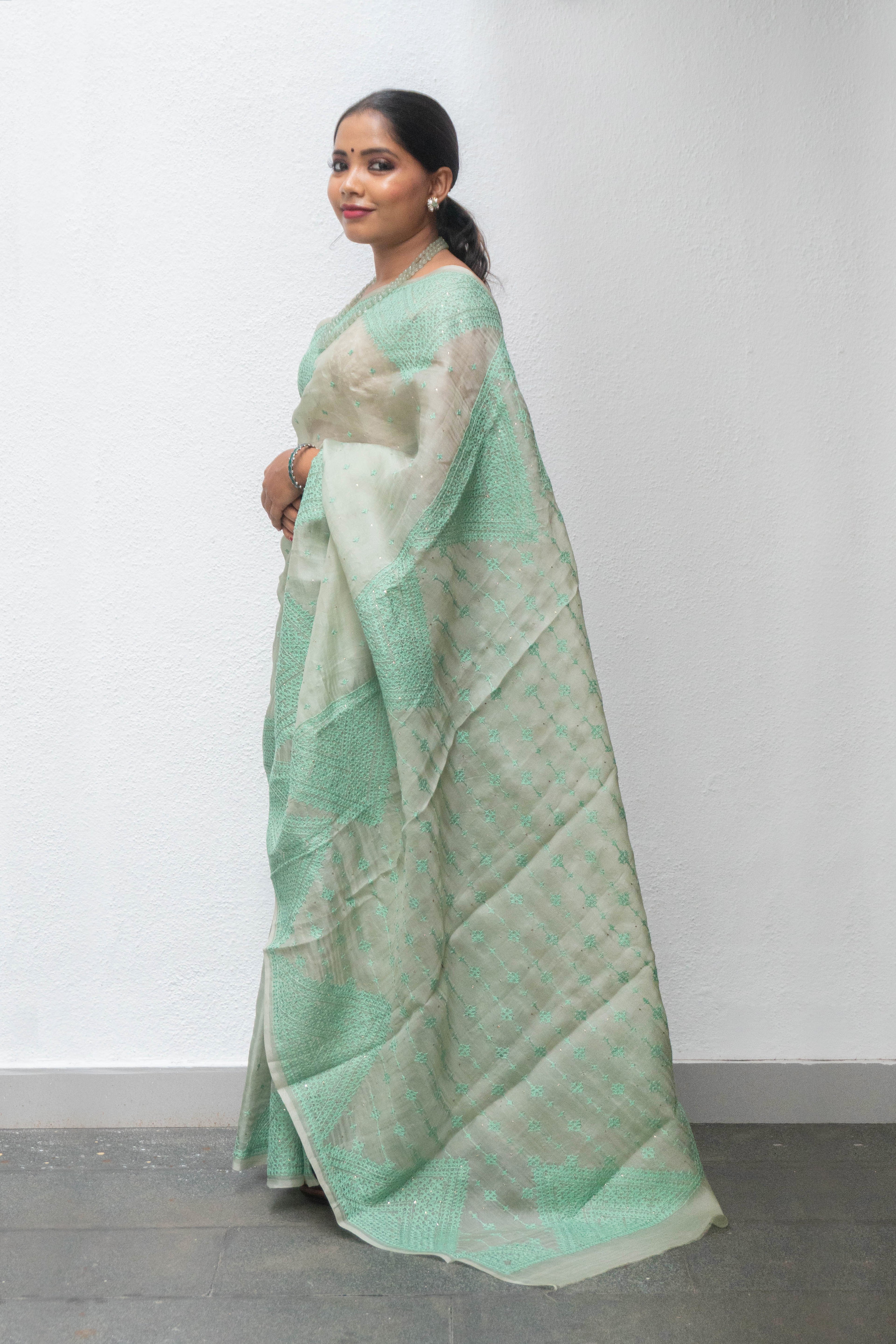 Handworked Kutch work embroidery on pastel Mint Green Organza silk saree. The body of the saree has small kutch work motifs which flows into an intricate temple kutch border.The embroidery has been done tone on tone and has been elevated using “Mukaish” work.