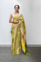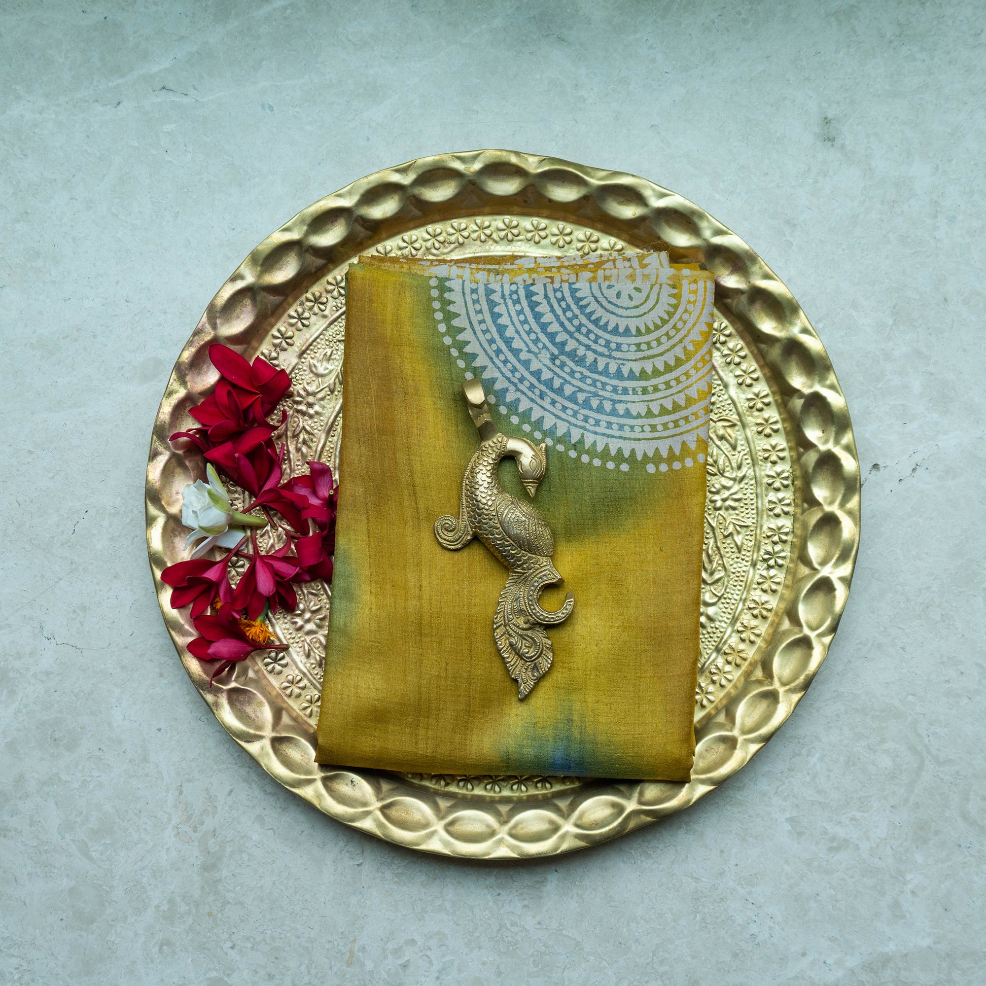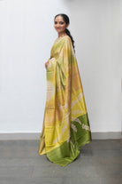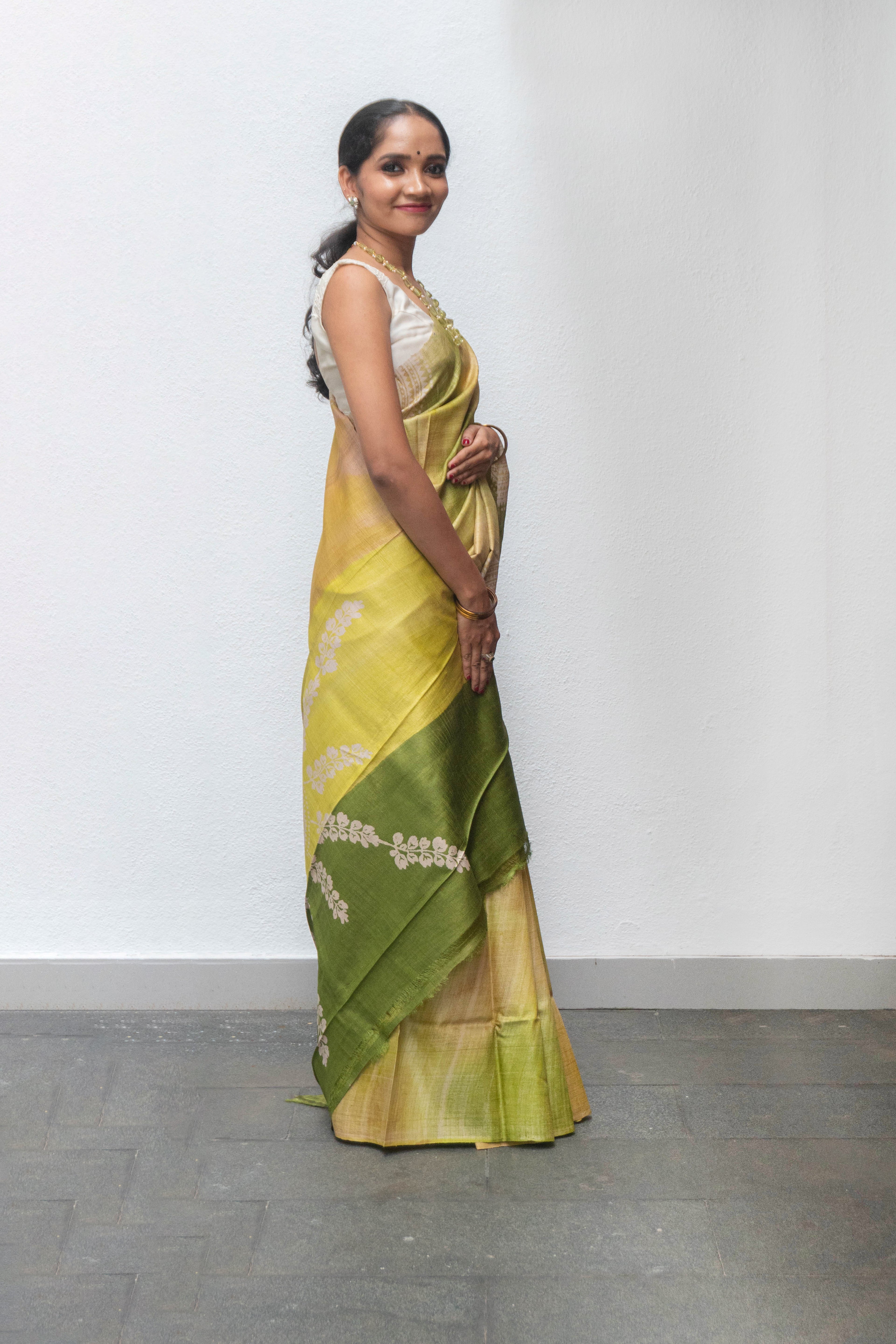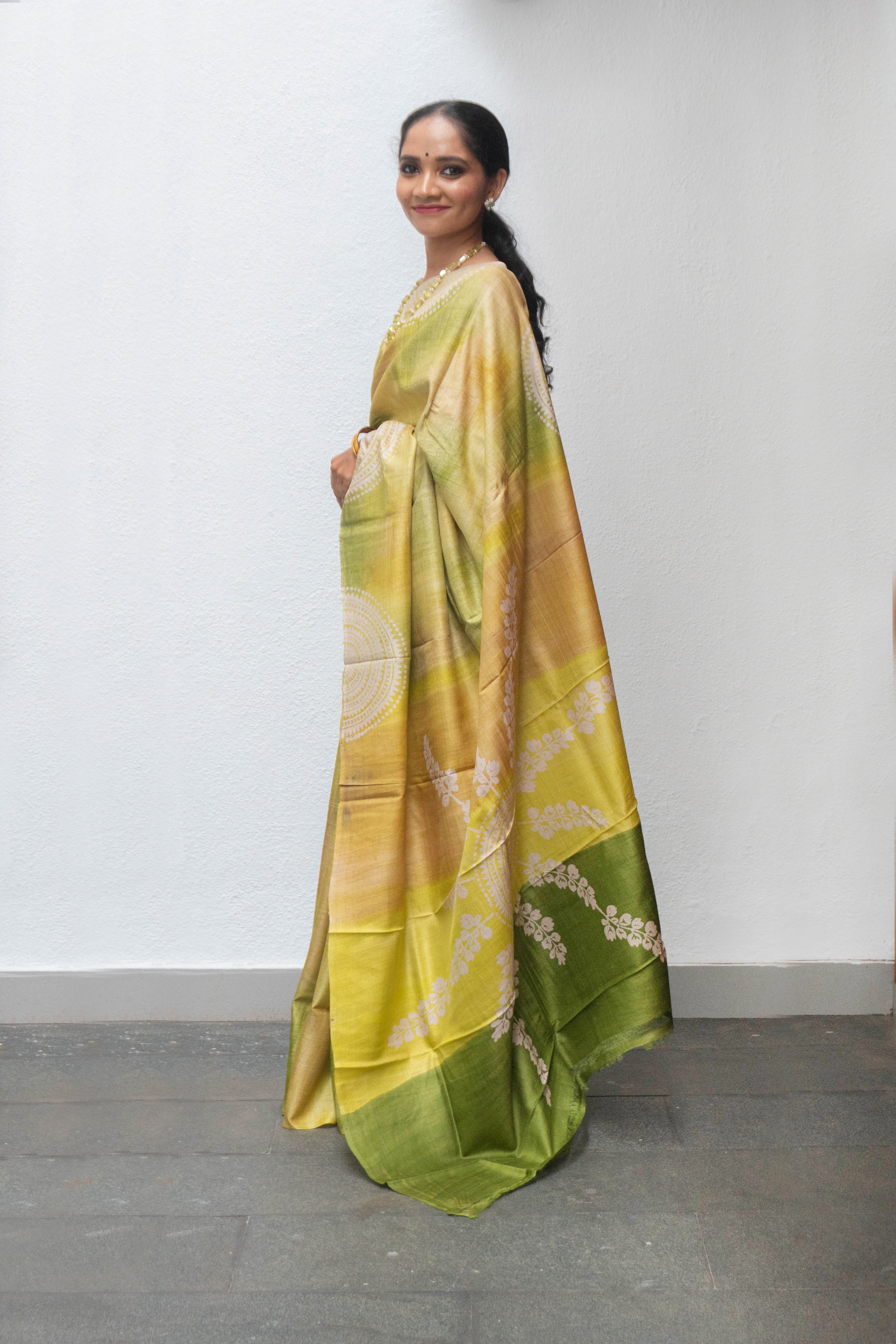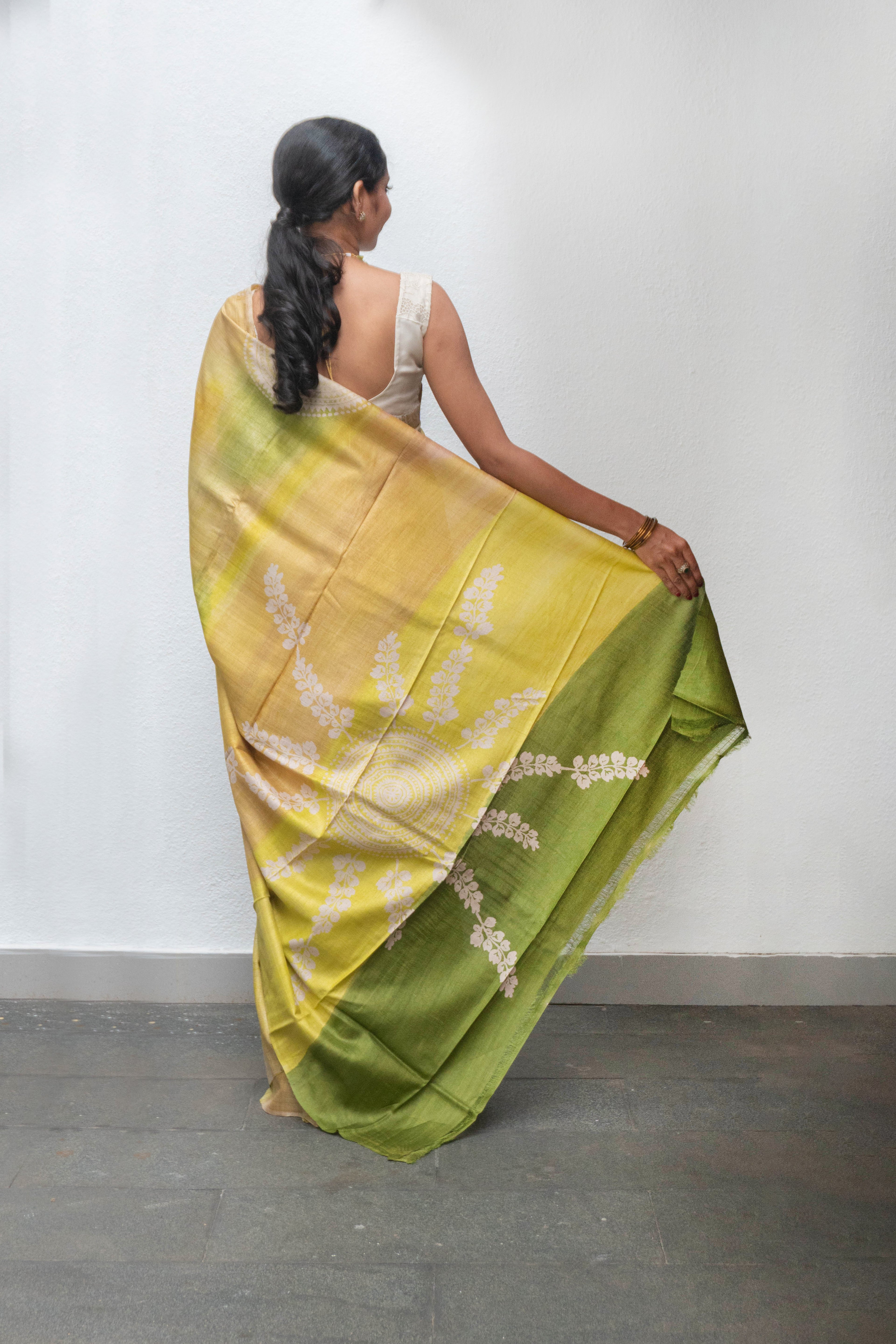 Shaded Tussar silk in hues of lime green, fenugreek mustard and yellow act as the canvas for the saree. The body of the saree has block printed motifs placed in different parts of the saree. Perfect for office wear.