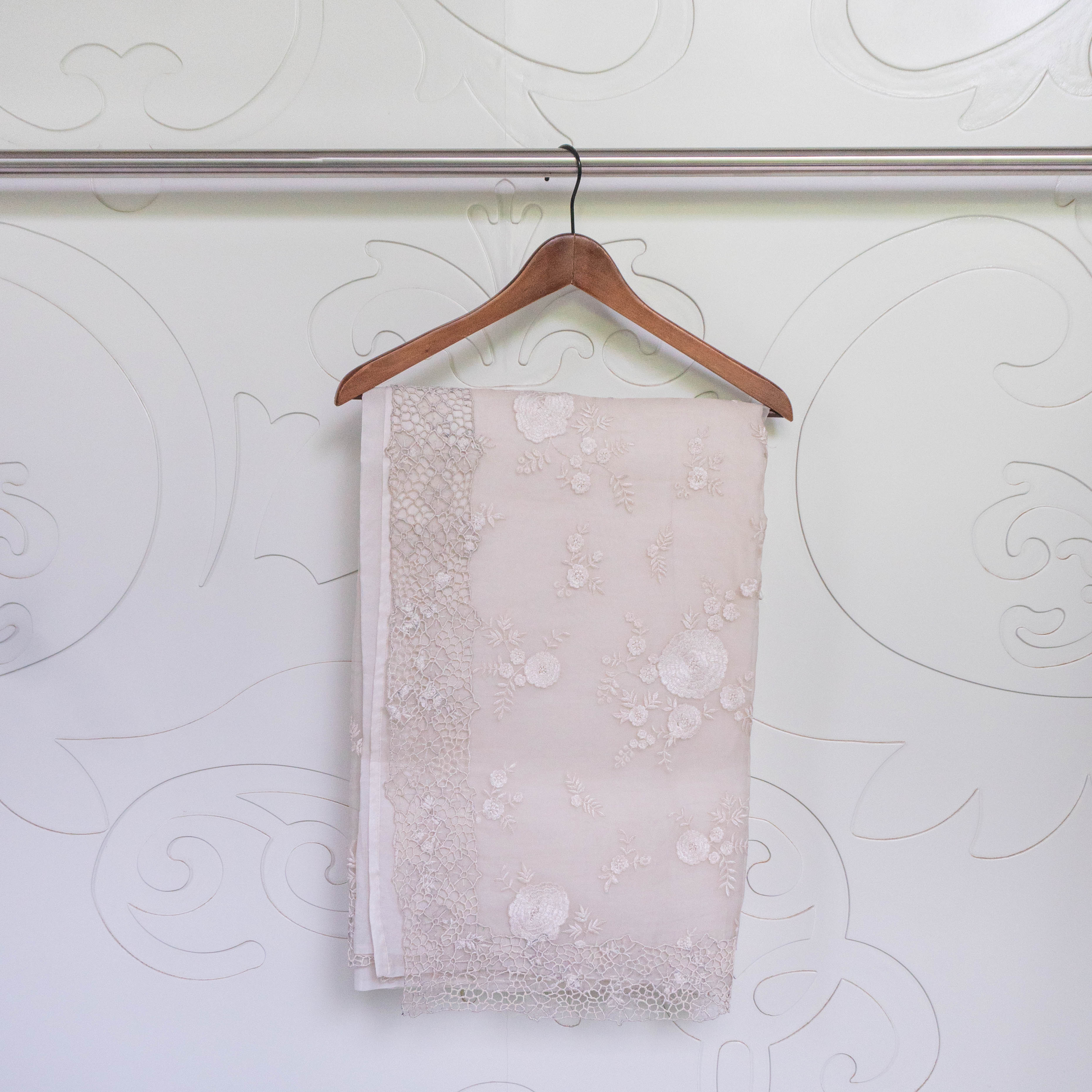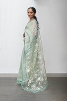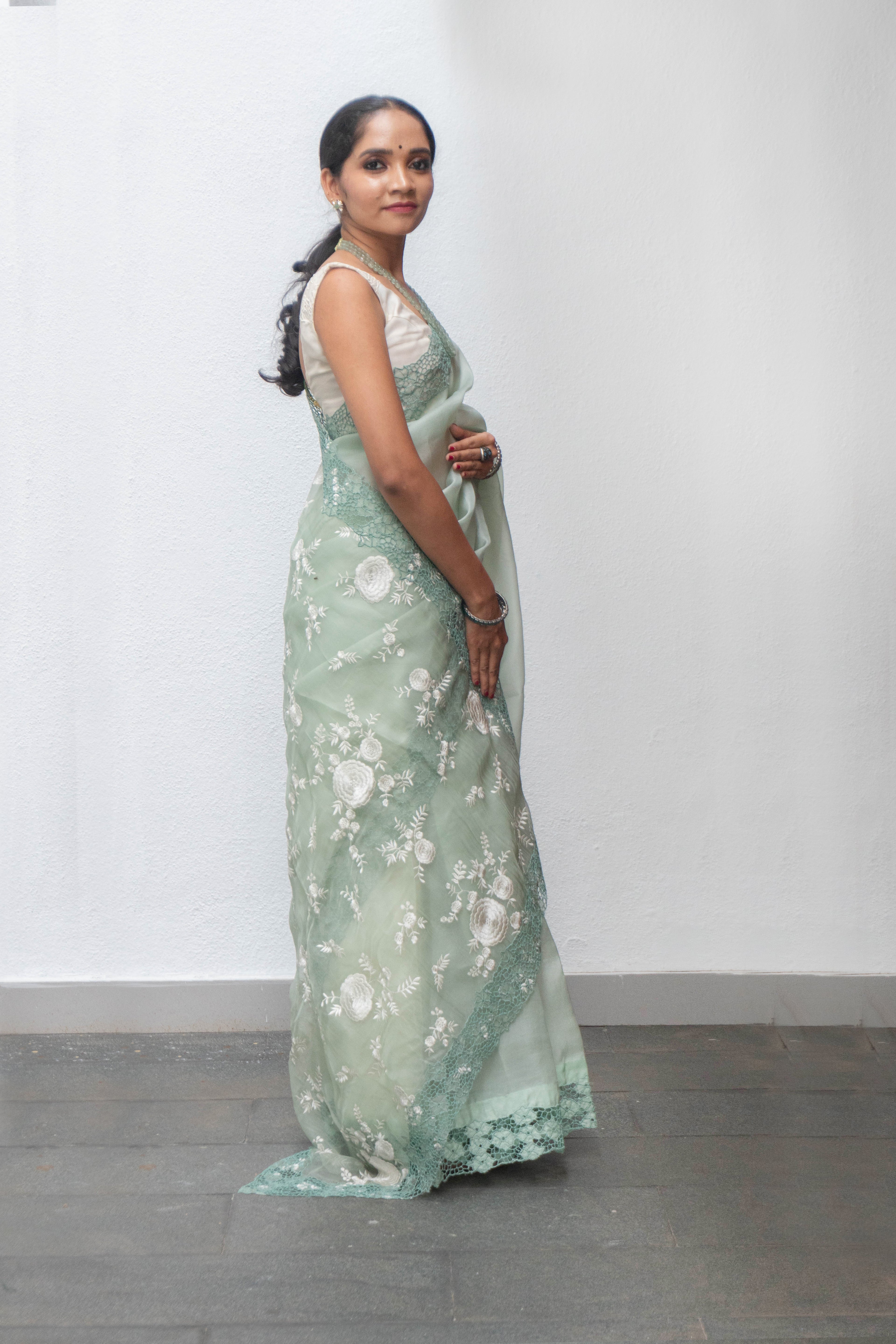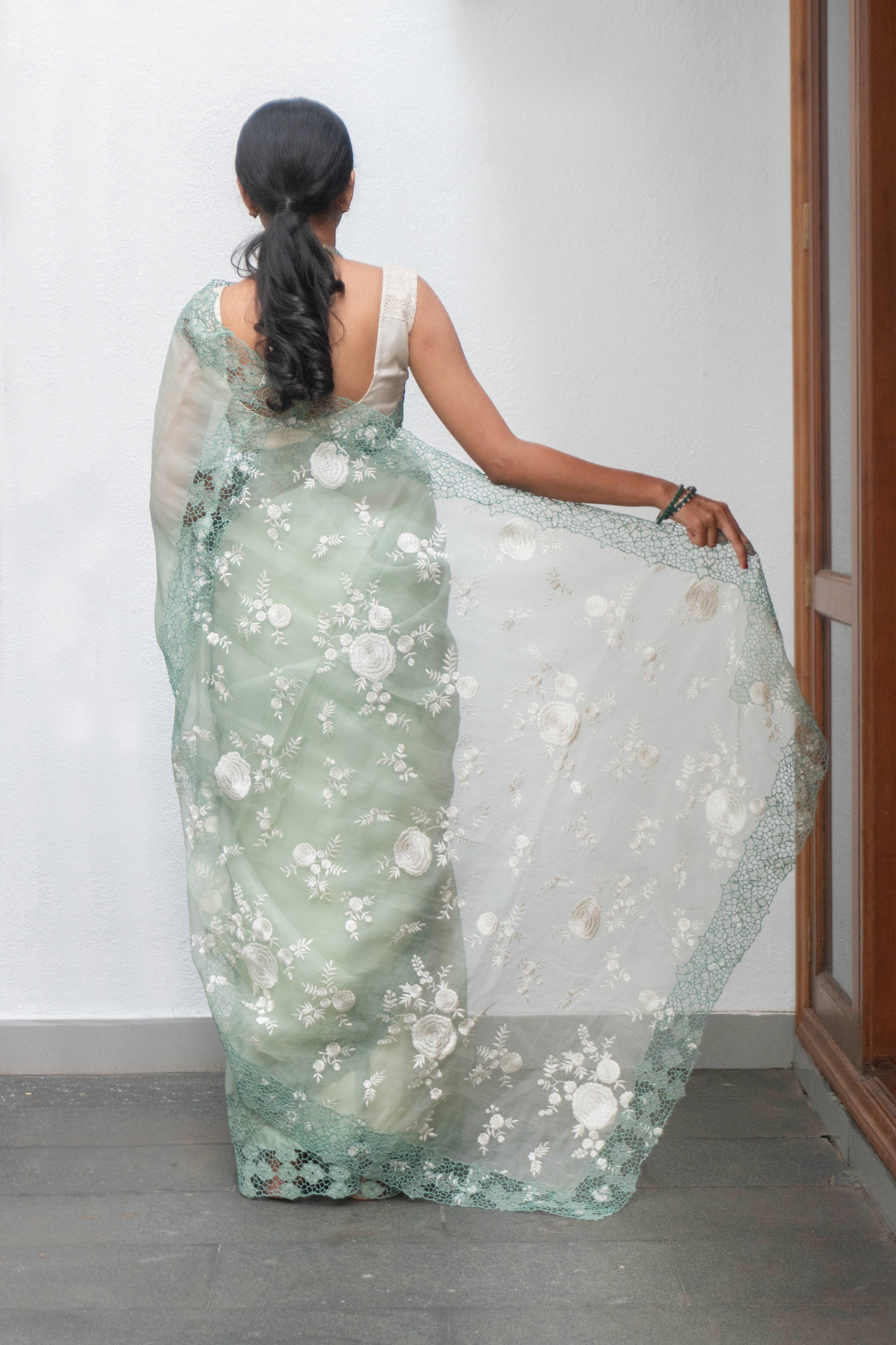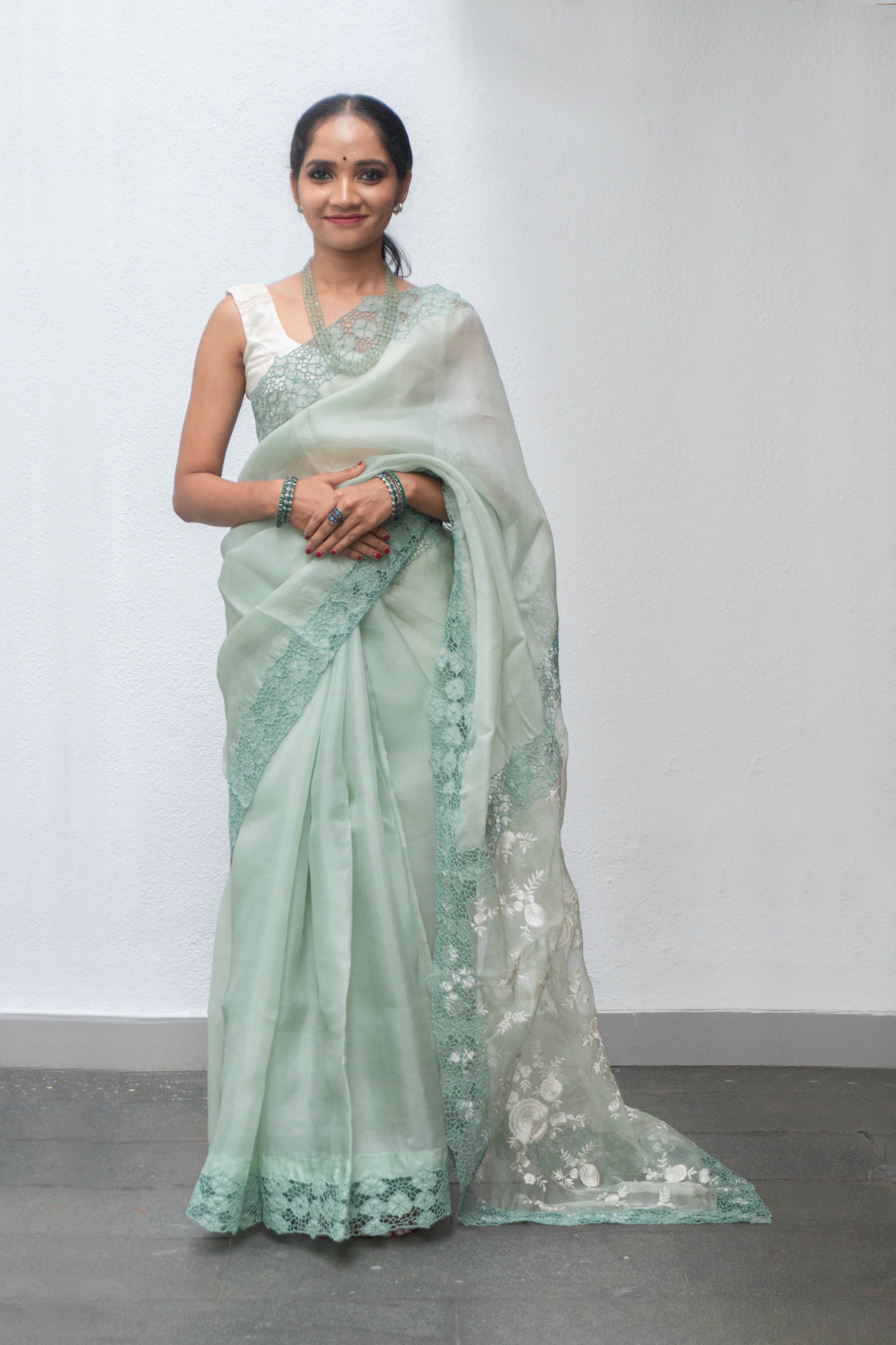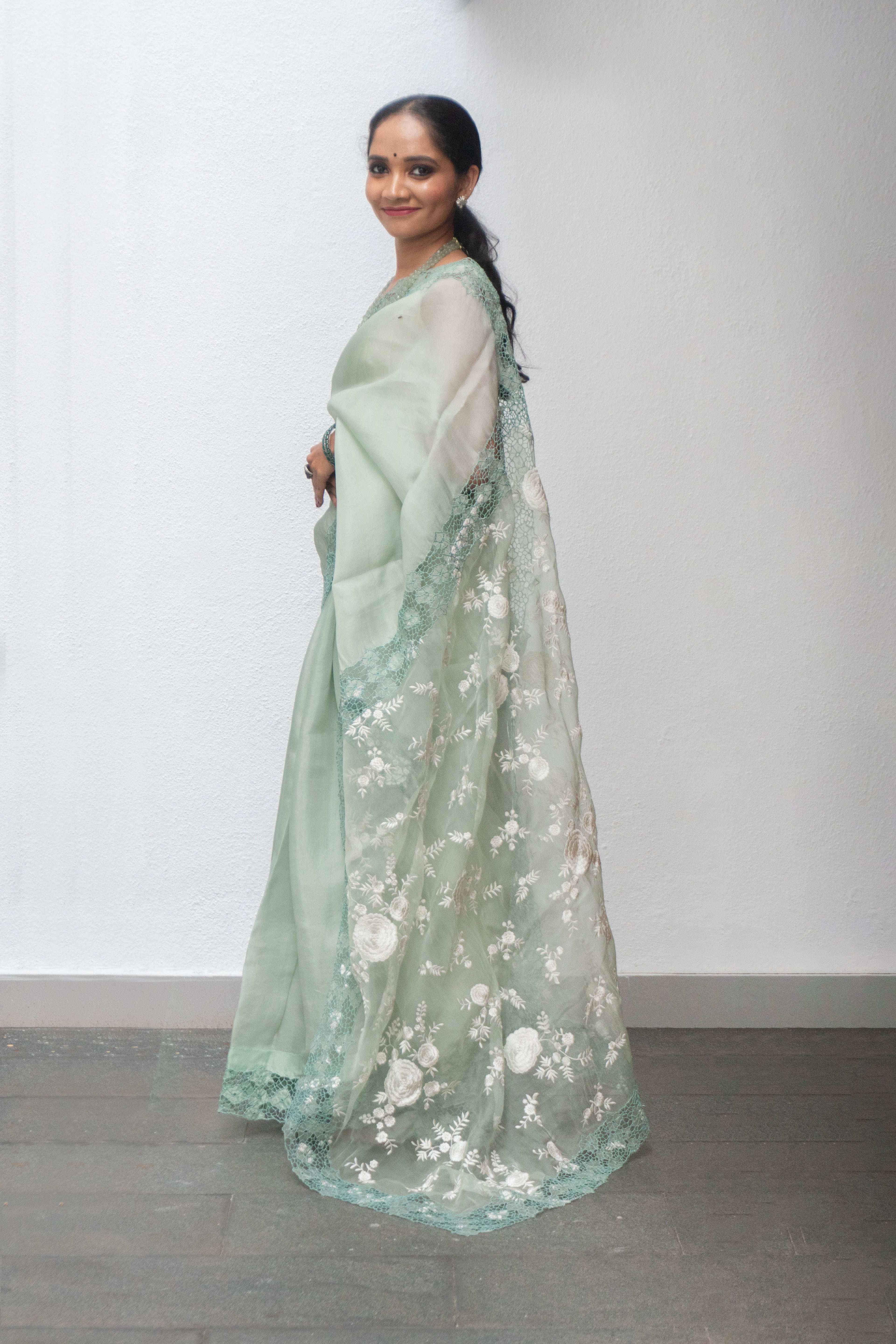 Our Organza silk saree is crafted in a soothing hue and elevated with cutwork embroidery in the border, and the pallu has floral embroidery. The saree can be an easy drape for summers.