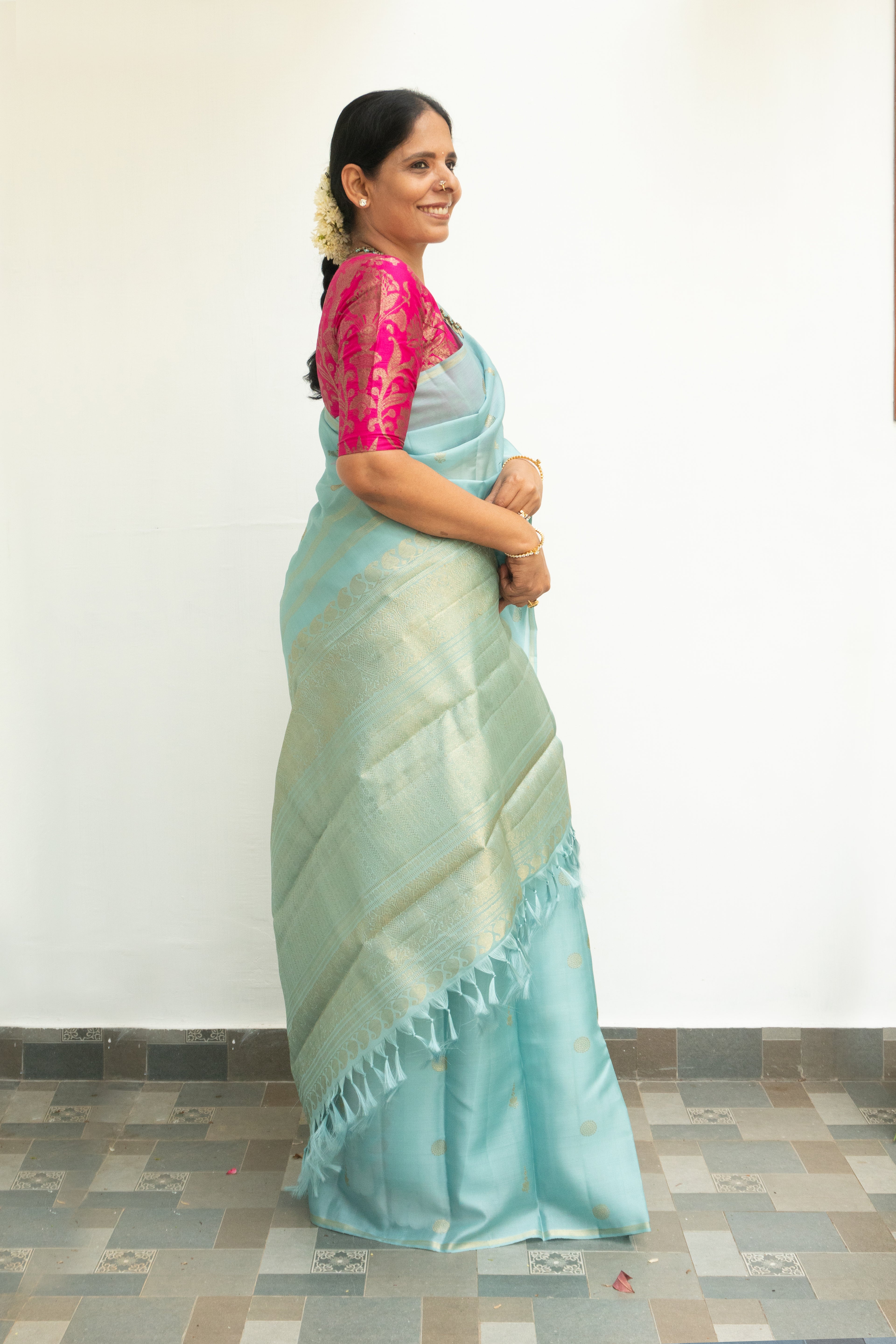 This monotone Kanchi organza silk saree is a vision of quiet luxury, blending elegance with heritage craftsmanship. The sheer, lightweight body is beautifully adorned with chakram and kuthuvilakku motifs woven in pure gold zari, reflecting tradition with subtle grandeur. Flowing seamlessly into a rich pallu intricately woven in gold zari, the saree carries a divine finish, making it an understated masterpiece. Perfect for festive occasions, weddings, and cultural celebrations, this saree embodies the timeless artistry of Kanchipuram weaving with a contemporary organza touch.