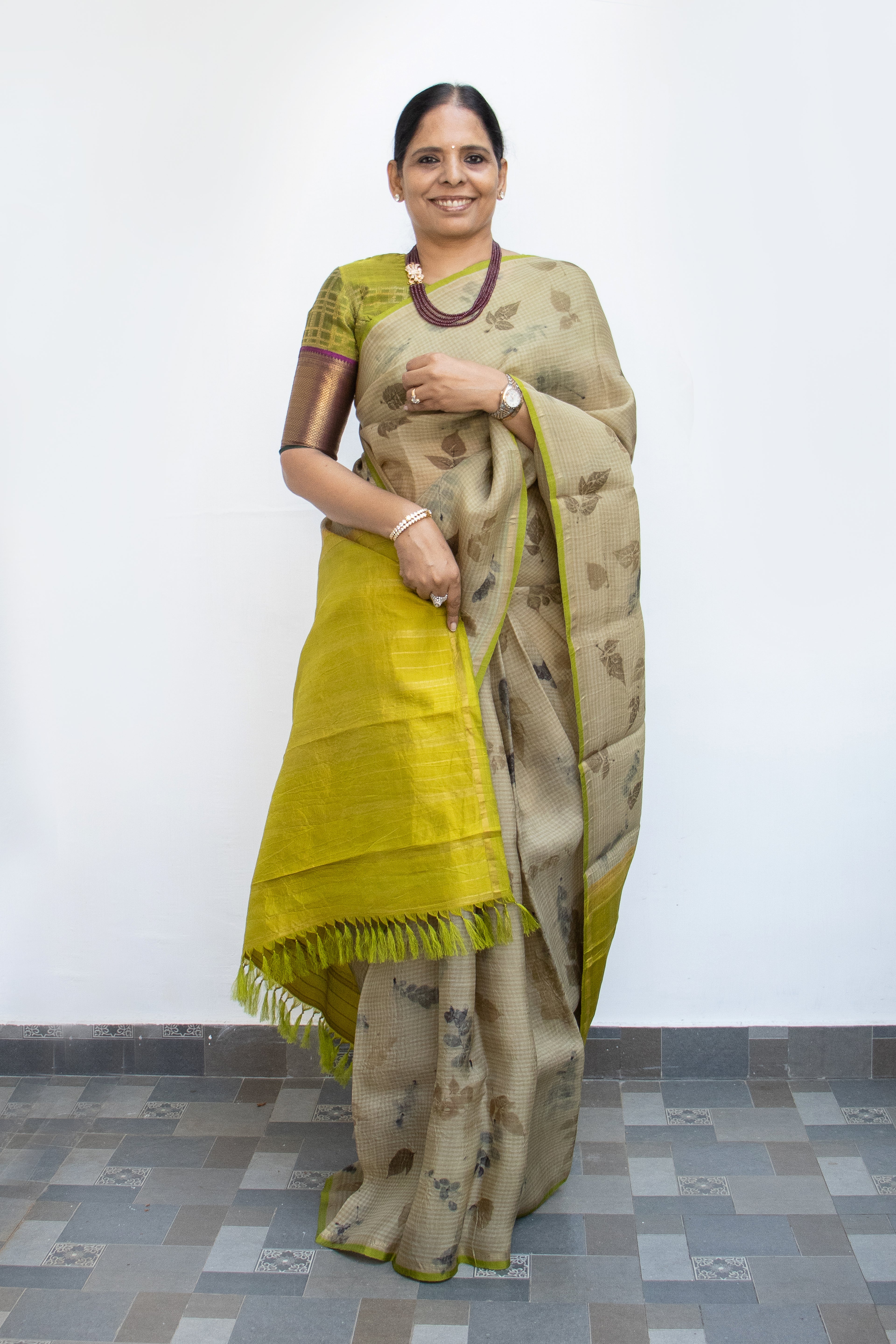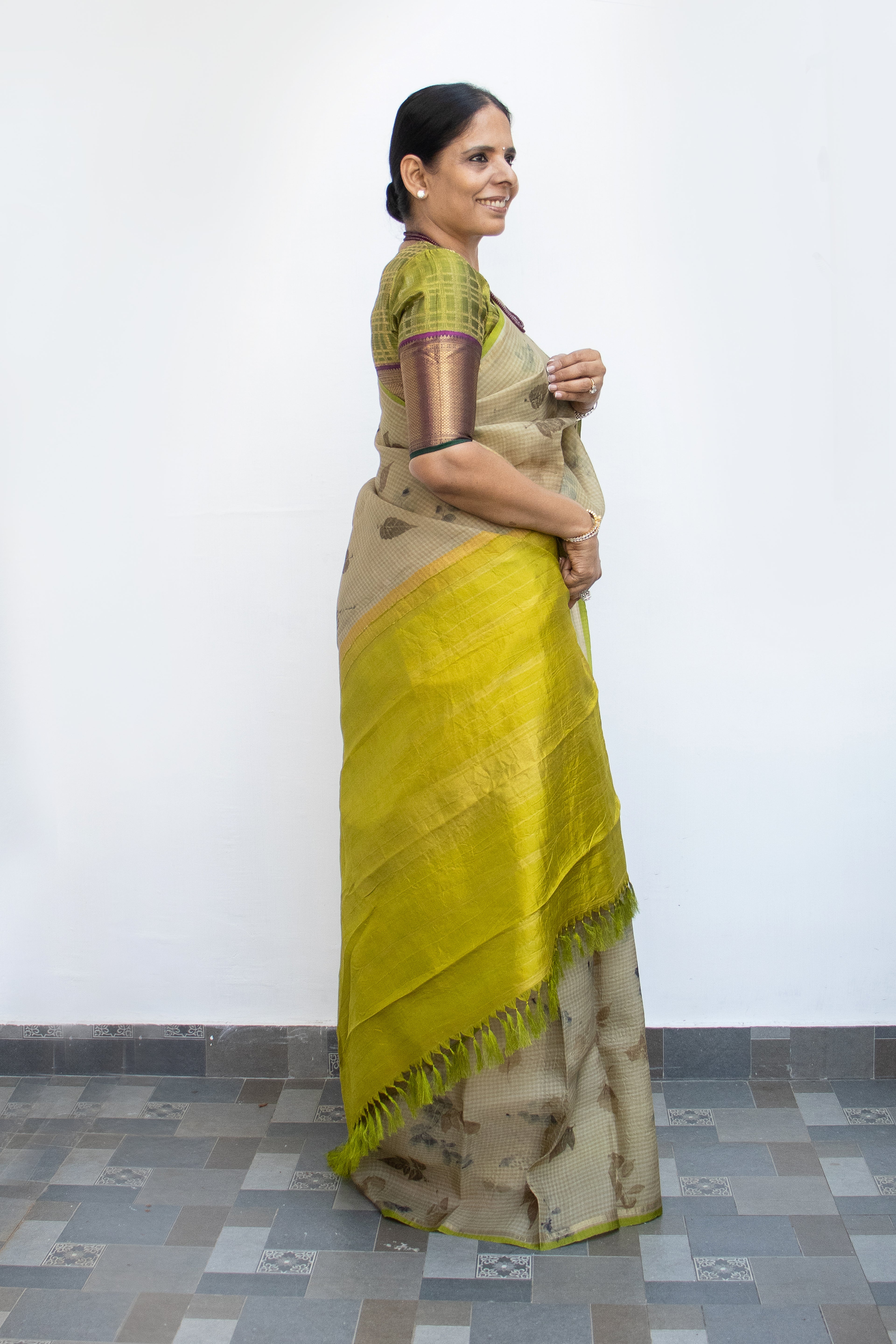 Rooted in classic craftsmanship with a contemporary expression, this fine Kanchi organza silk saree is woven with subtle micro checks across the body and adorned with delicate eco-printed motifs. The design flows seamlessly into a luminous neon green pallu, creating a striking yet refined contrast.