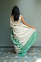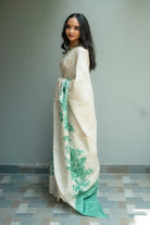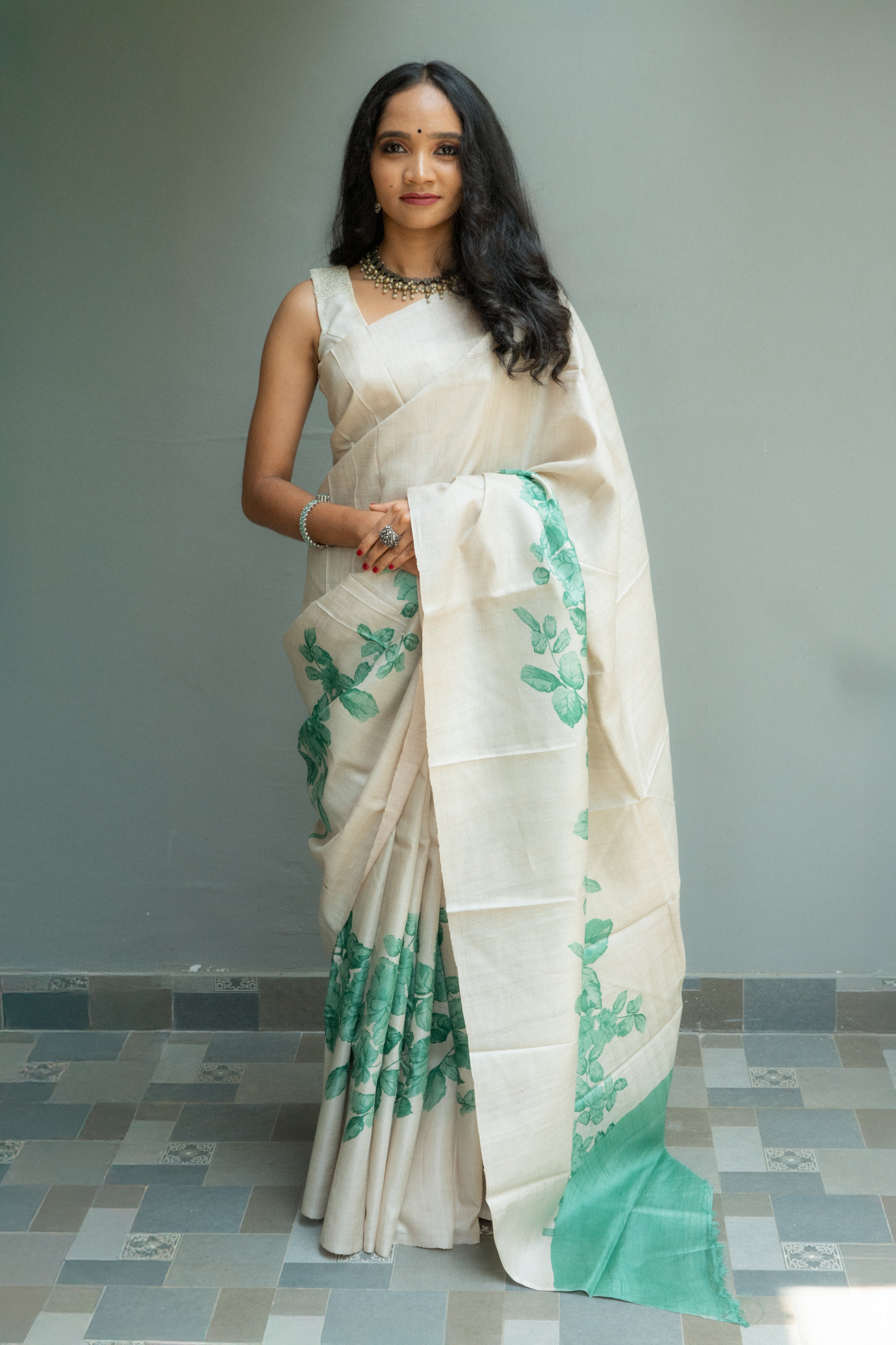 Ivory Tussar silk sarees handcrafted using the finest of threads. The beauty of the saree is further elevated with mint green florals. The pallu and blouse mirror the same shade as the florals.