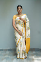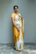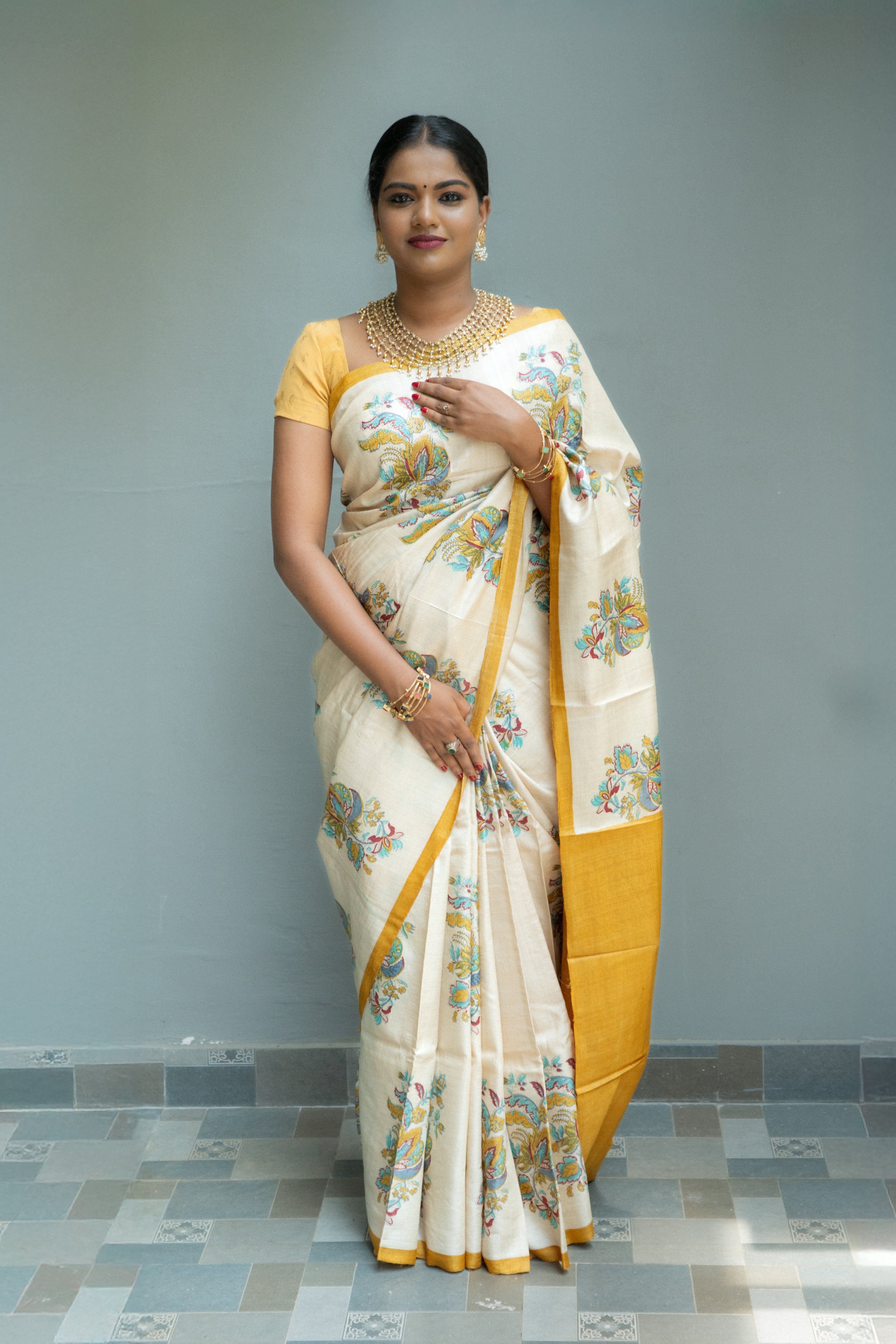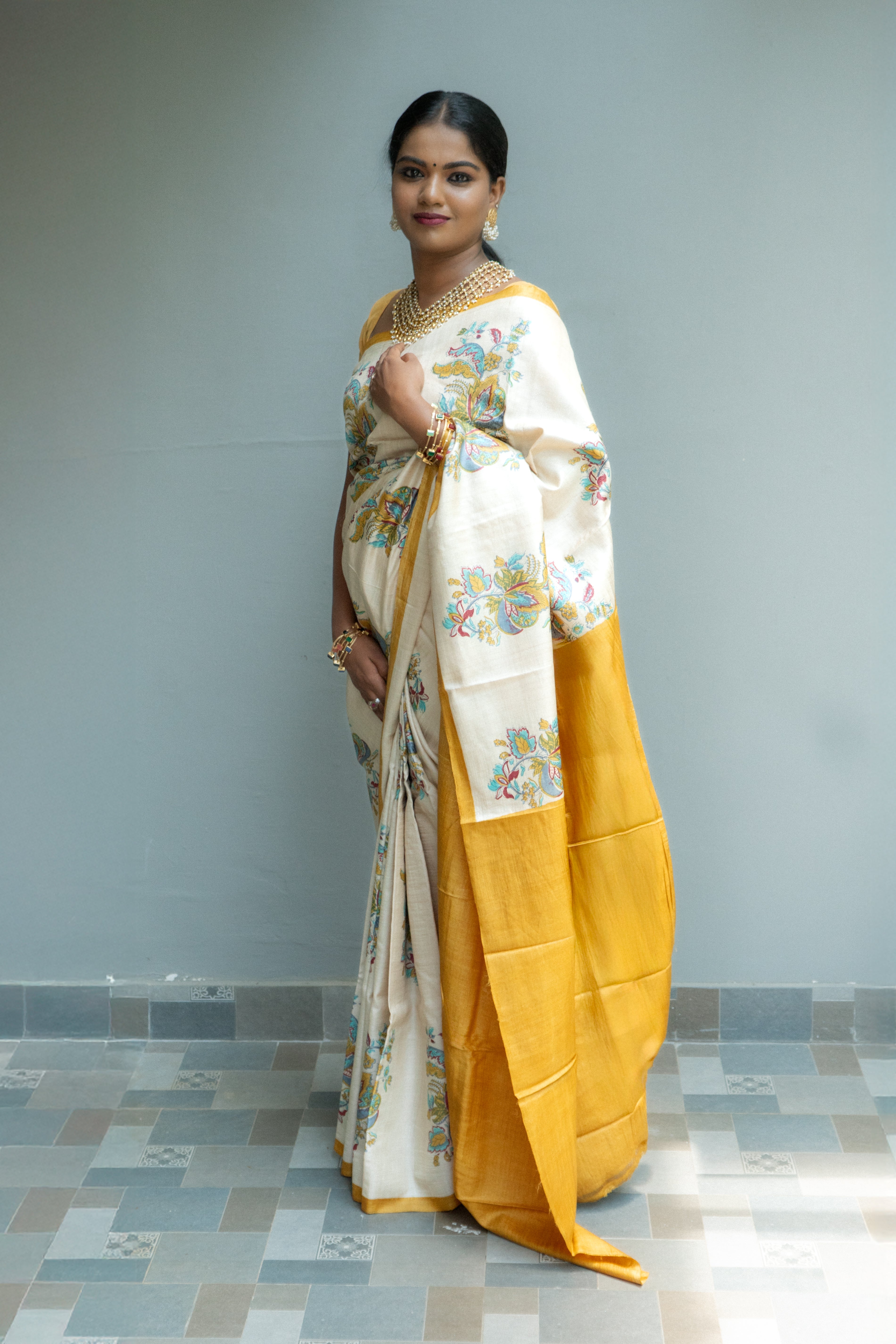 Off White Tussar silk saree with hand-block printed motifs in the body. If you look closely at the motifs, there has been multiple colours used.