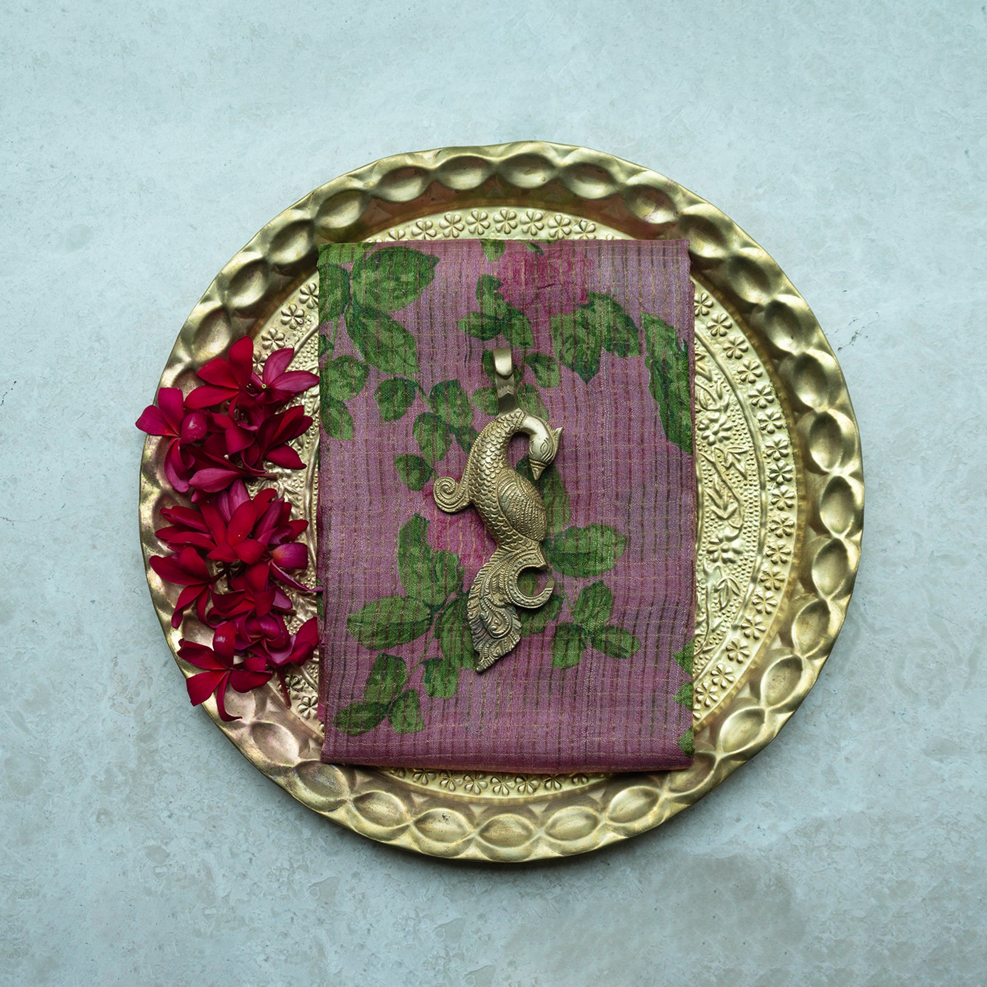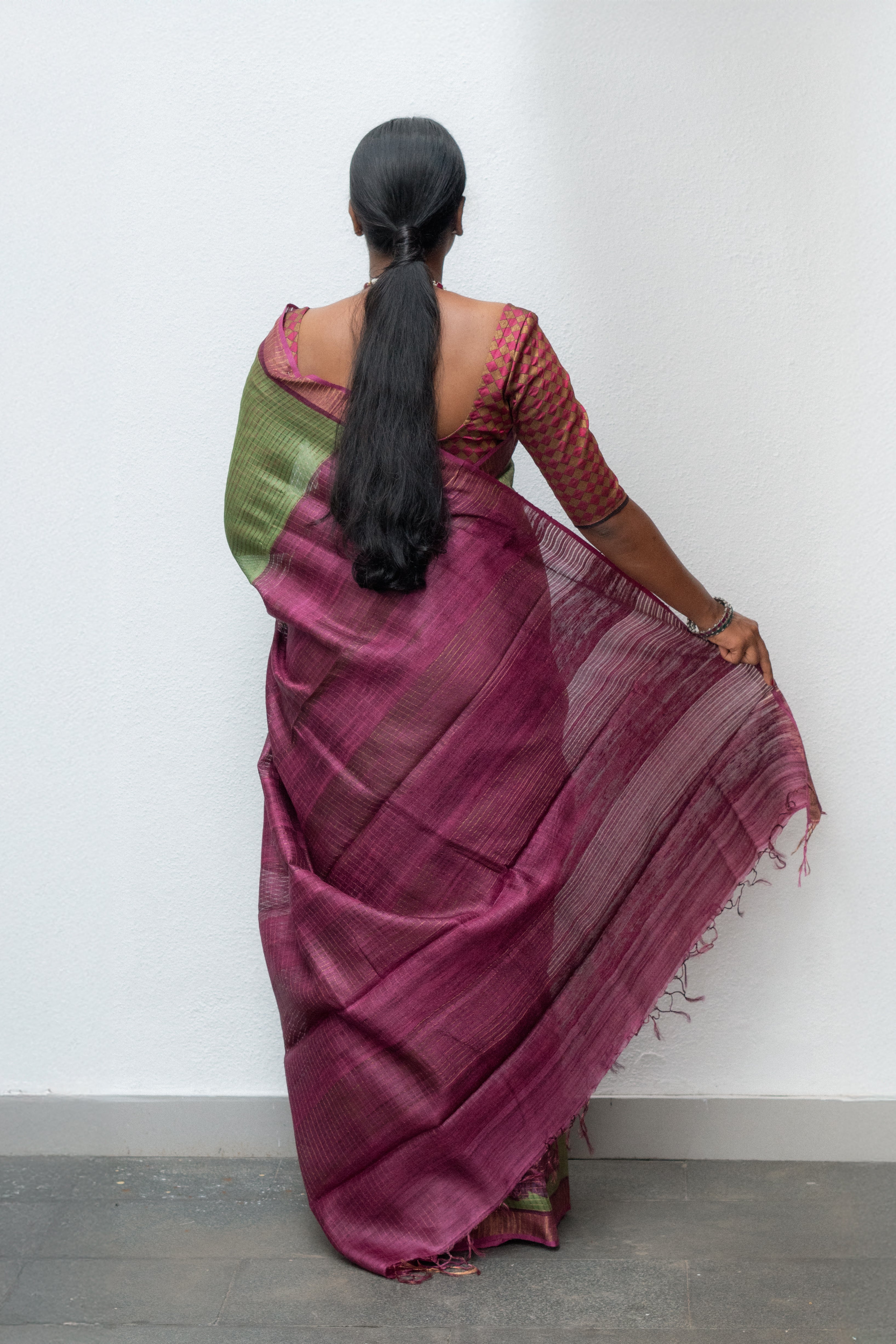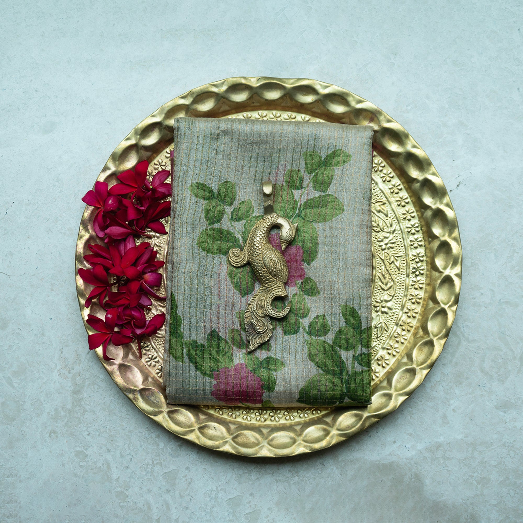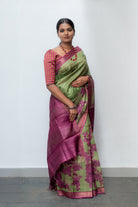 Olive Green Tussar silk saree with golden zari checks all over the body. The saree has purple florals rising from the base.