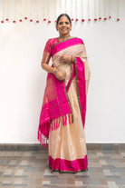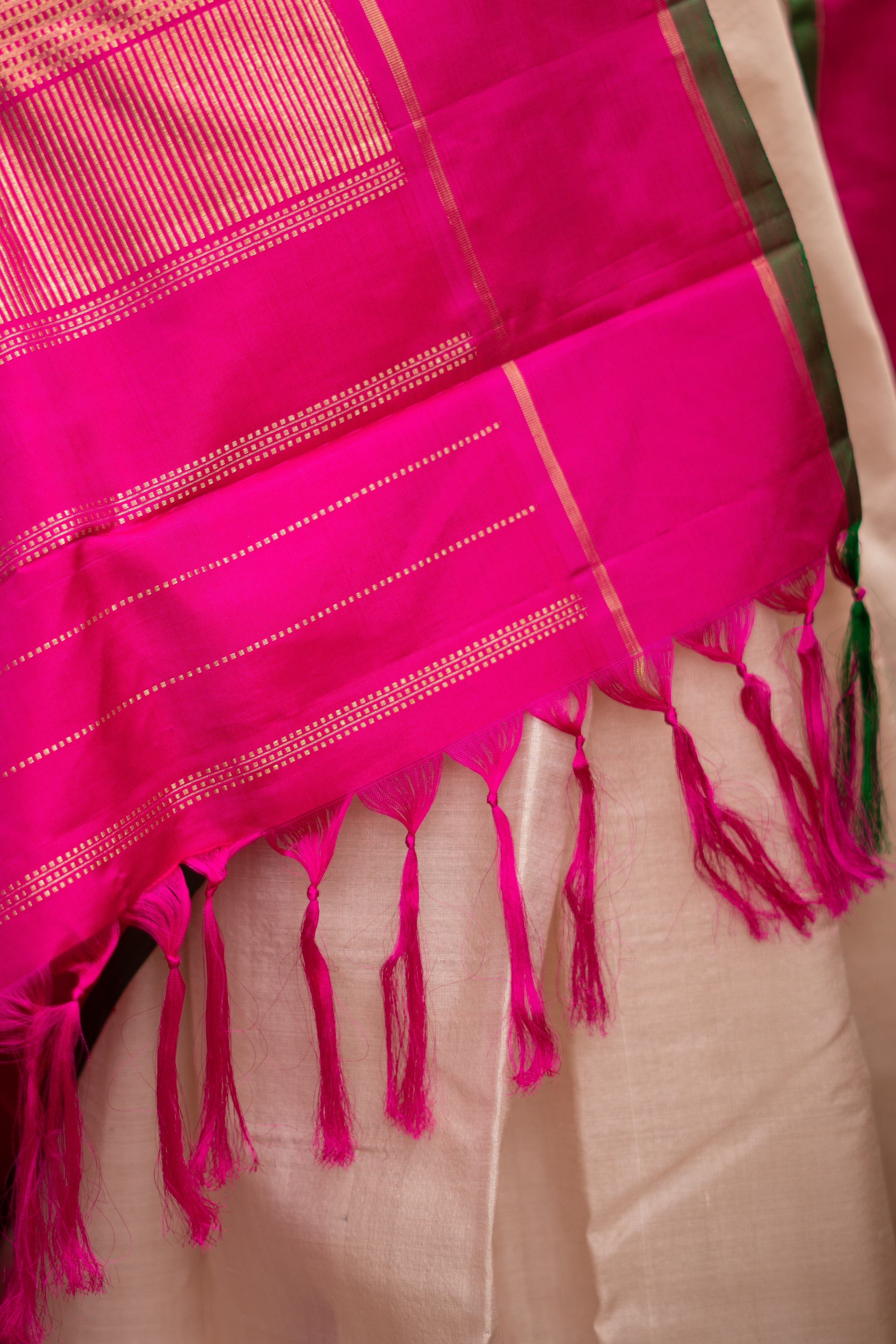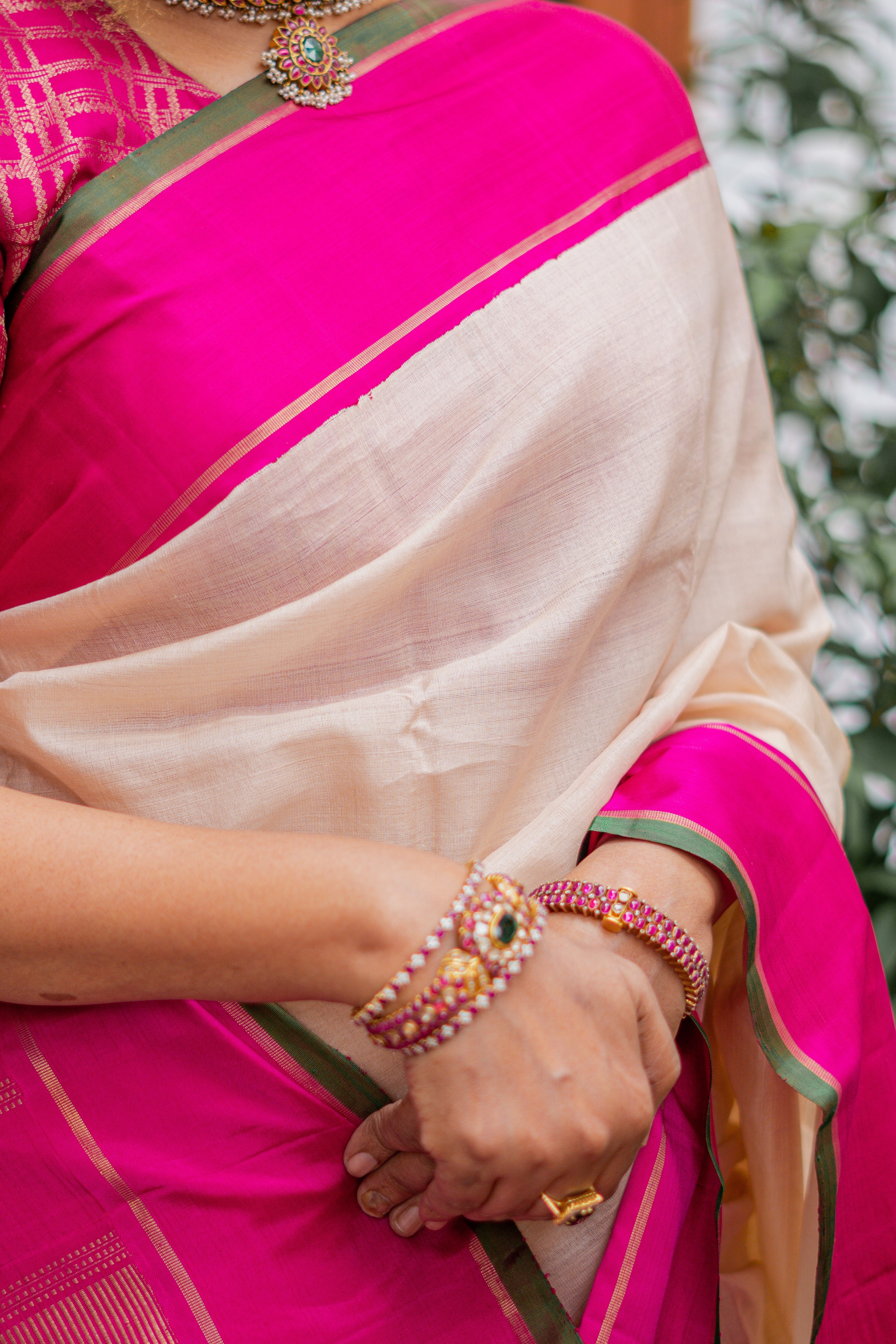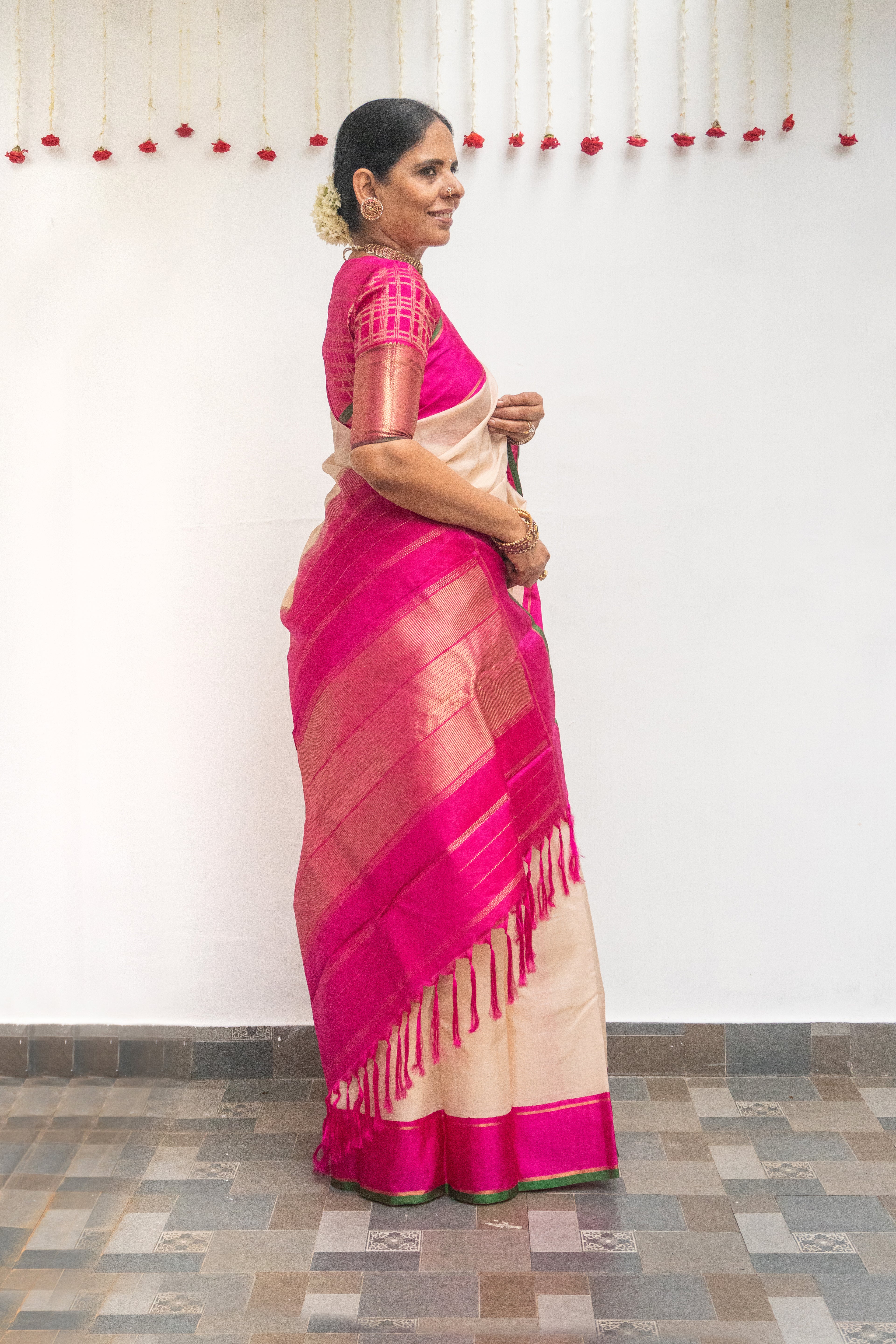 This exquisite ivory Kanchi organza silk saree exudes a soft, ethereal charm. Its lightweight fabric offers a fluid drape that moves gracefully with every step. A striking Rani pink korvai border adds a bold touch of tradition, while the green selvedge brings an unexpected pop of colour. Perfect for weddings, festive occasions, and elegant gatherings.