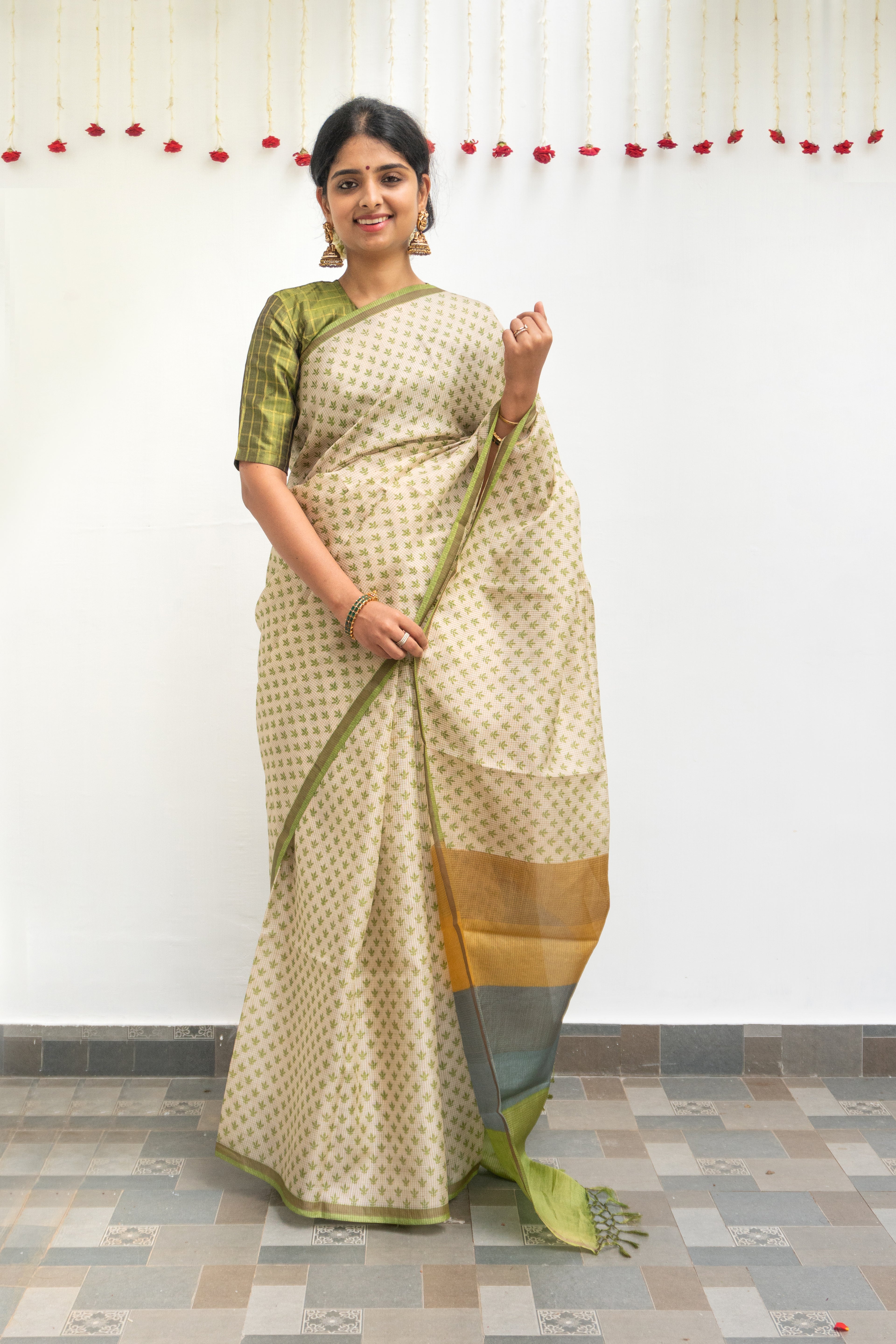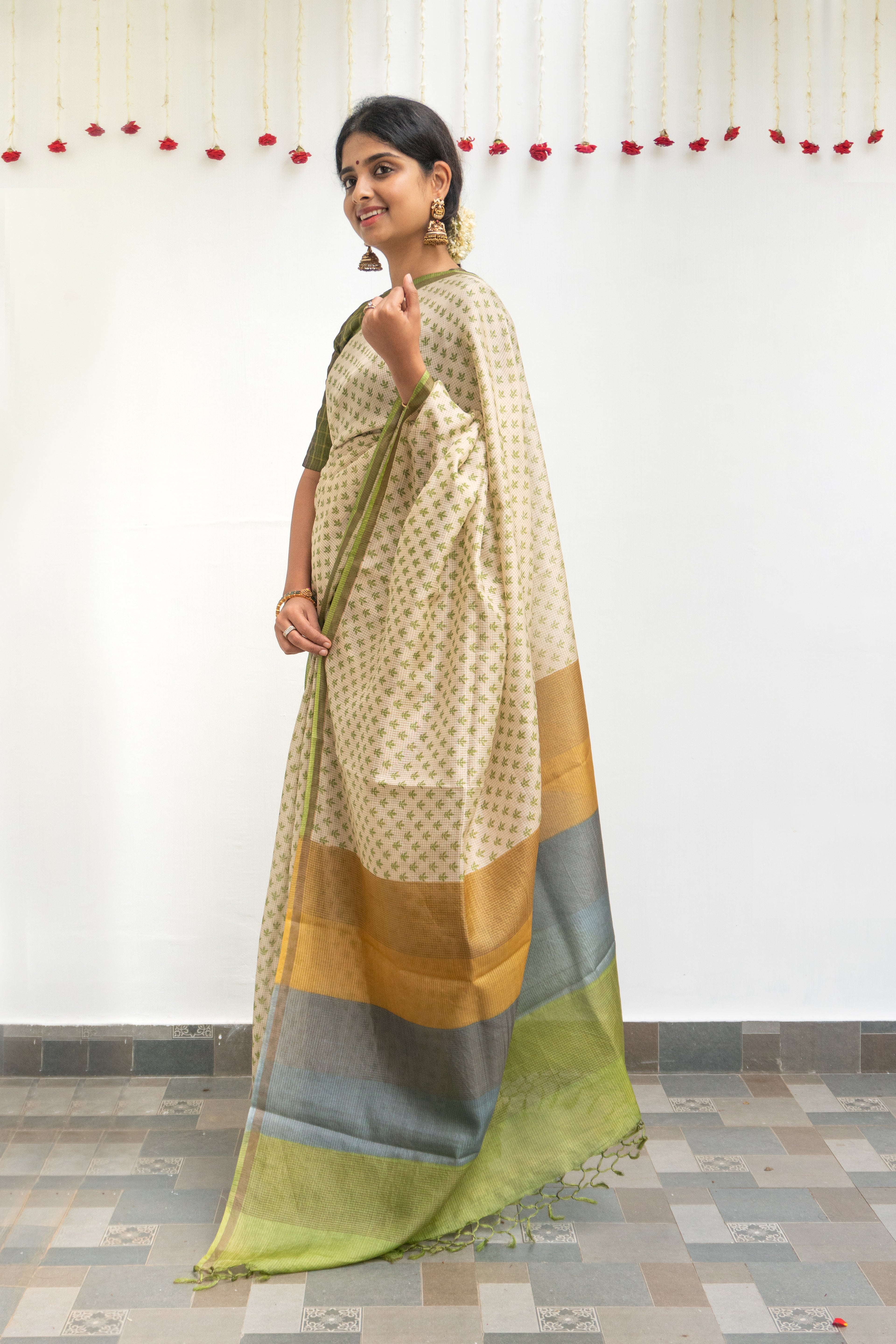 This graceful tussar silk saree features fine gold zari checks woven across the body, complemented by subtle hand block printed motifs. A vibrant multicolour pallu adds a bold contrast, making it the perfect blend of tradition and modern charm. Ideal for festive occasions, weddings, and elegant gatherings.