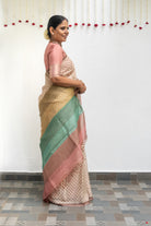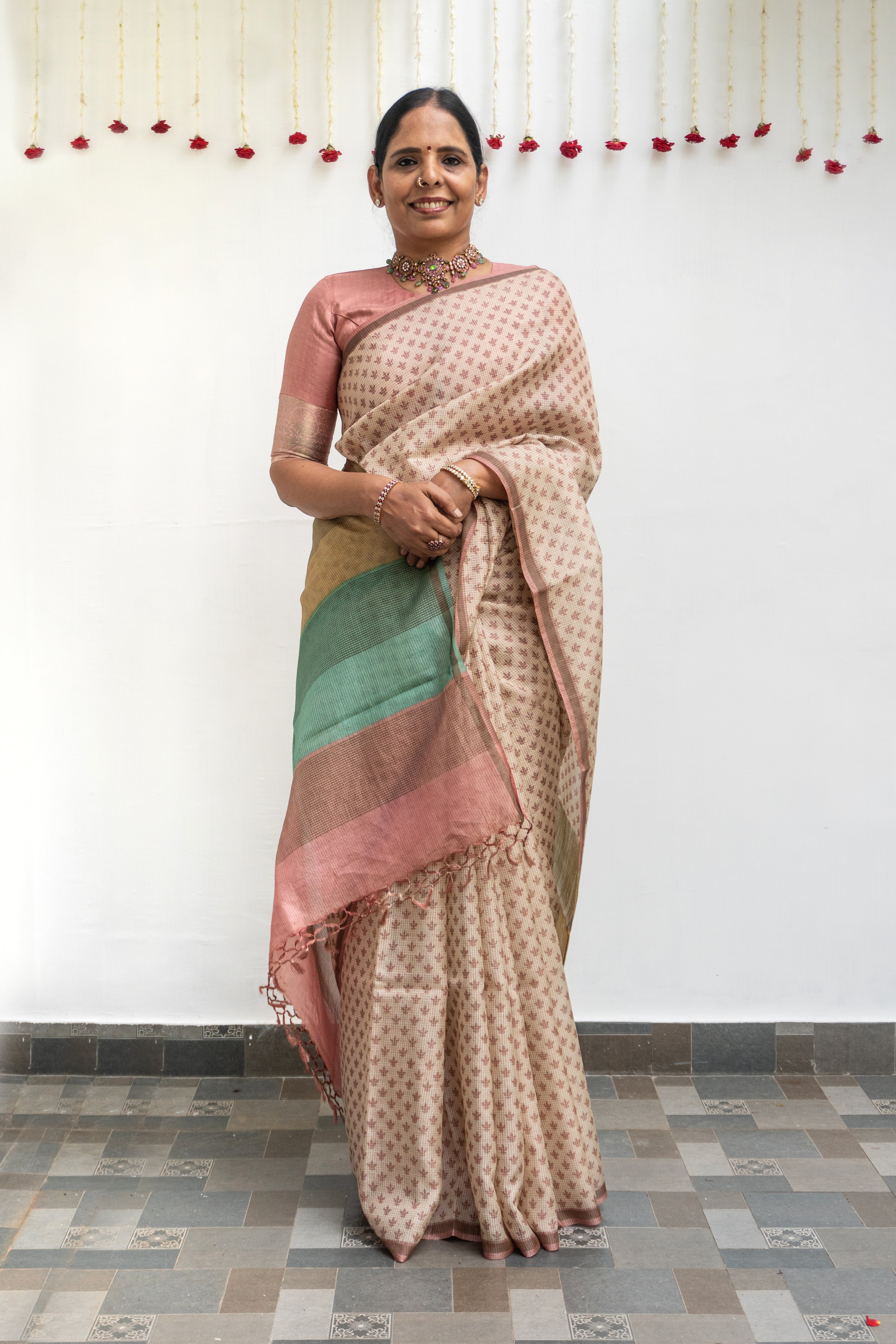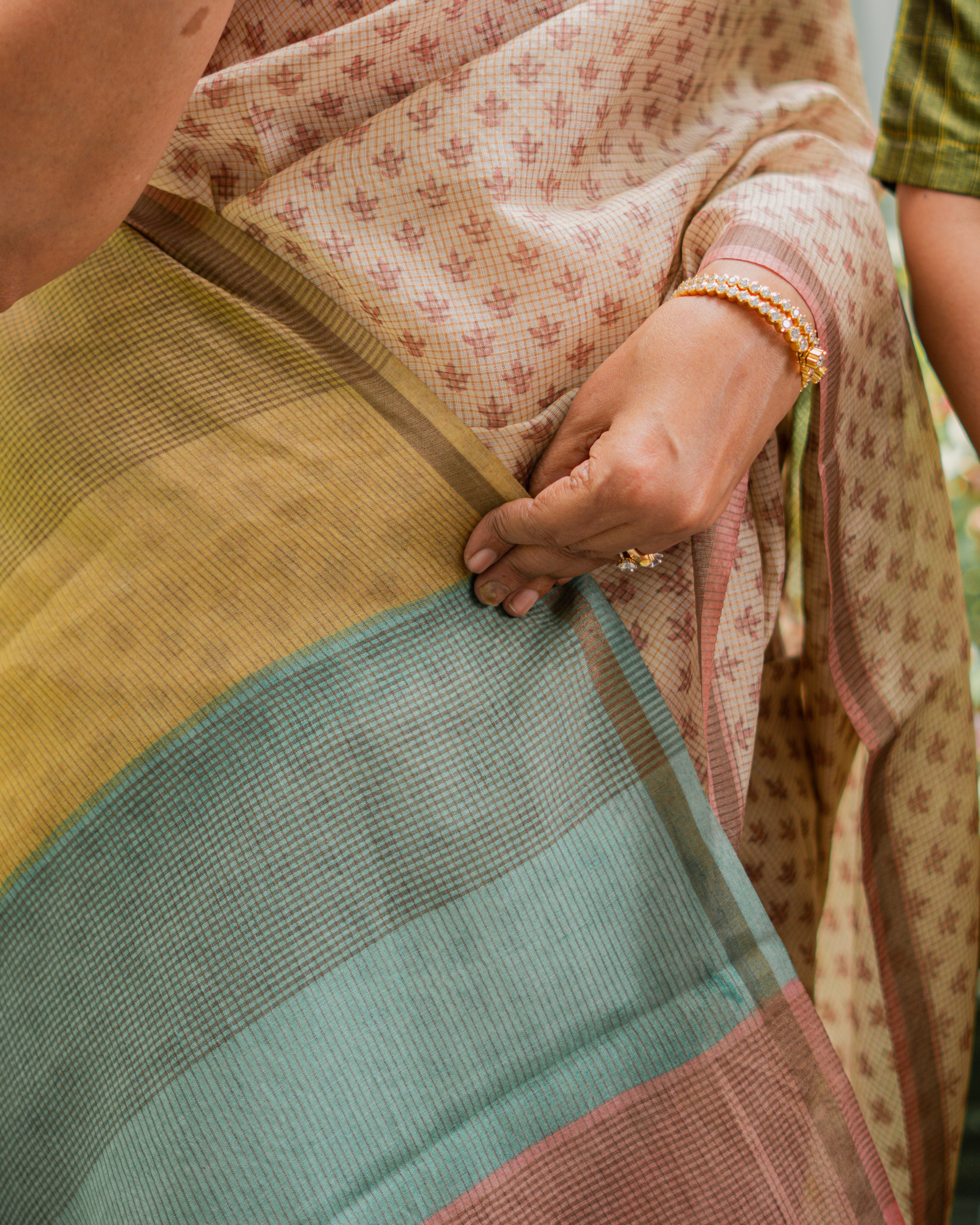This graceful tussar silk saree features fine gold zari checks woven across the body, complemented by subtle hand block printed motifs. A vibrant multicolour pallu adds a bold contrast, making it the perfect blend of tradition and modern charm. Ideal for festive occasions, weddings, and elegant gatherings.