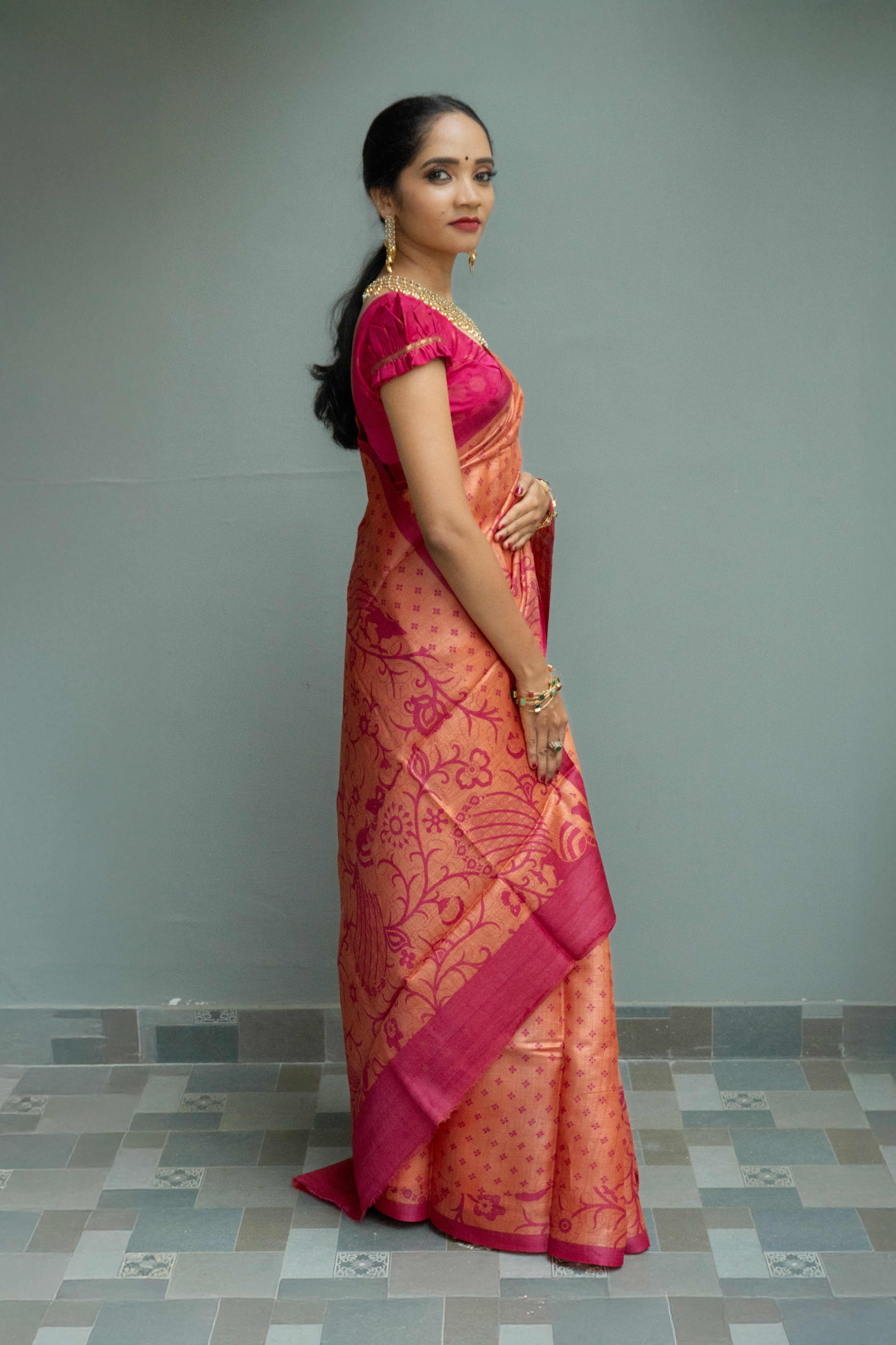 The blouse of the saree is orange with red geometric prints.