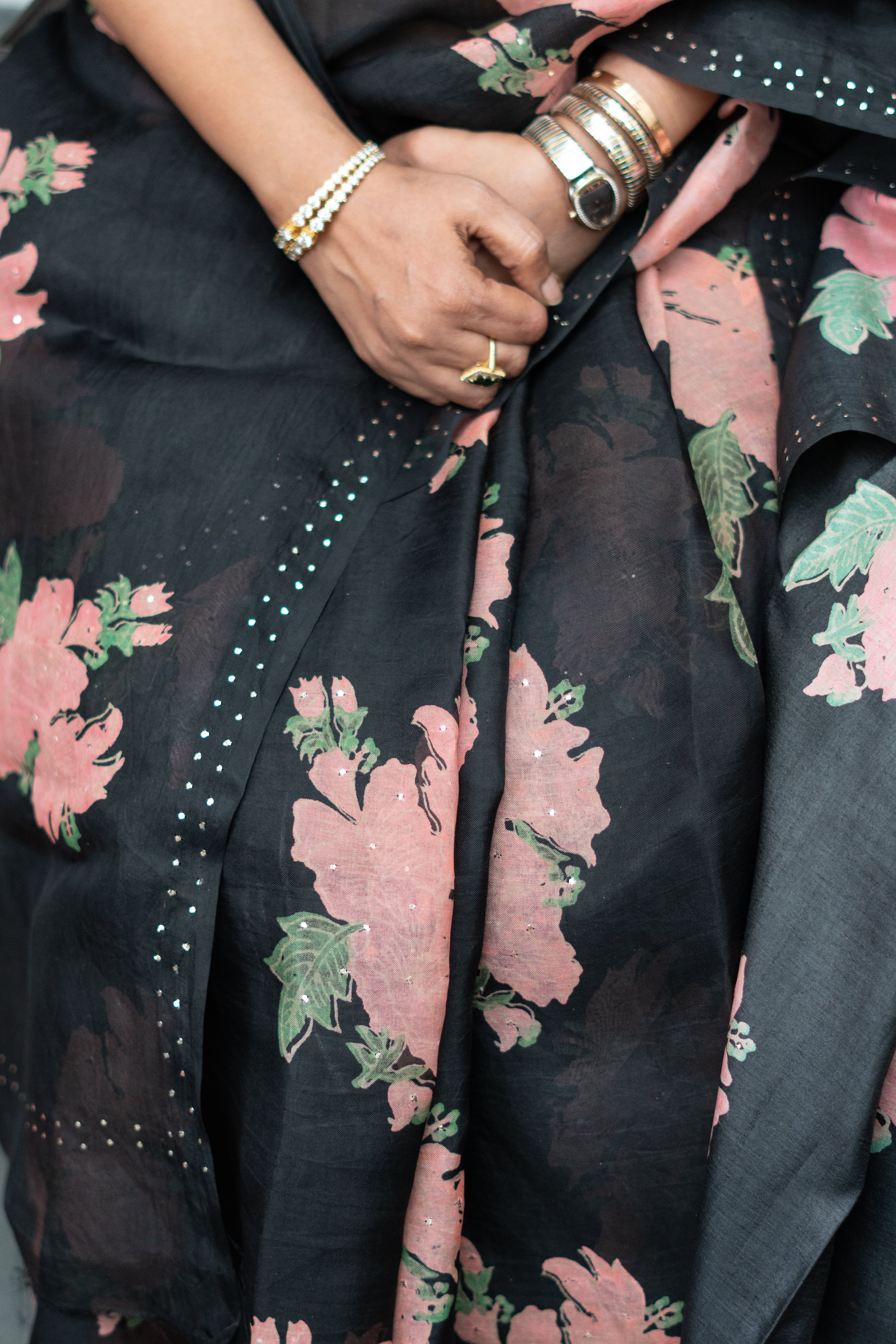 Jet Black Organza Silk Saree with Hibiscus Hand Block Print and Badla Work