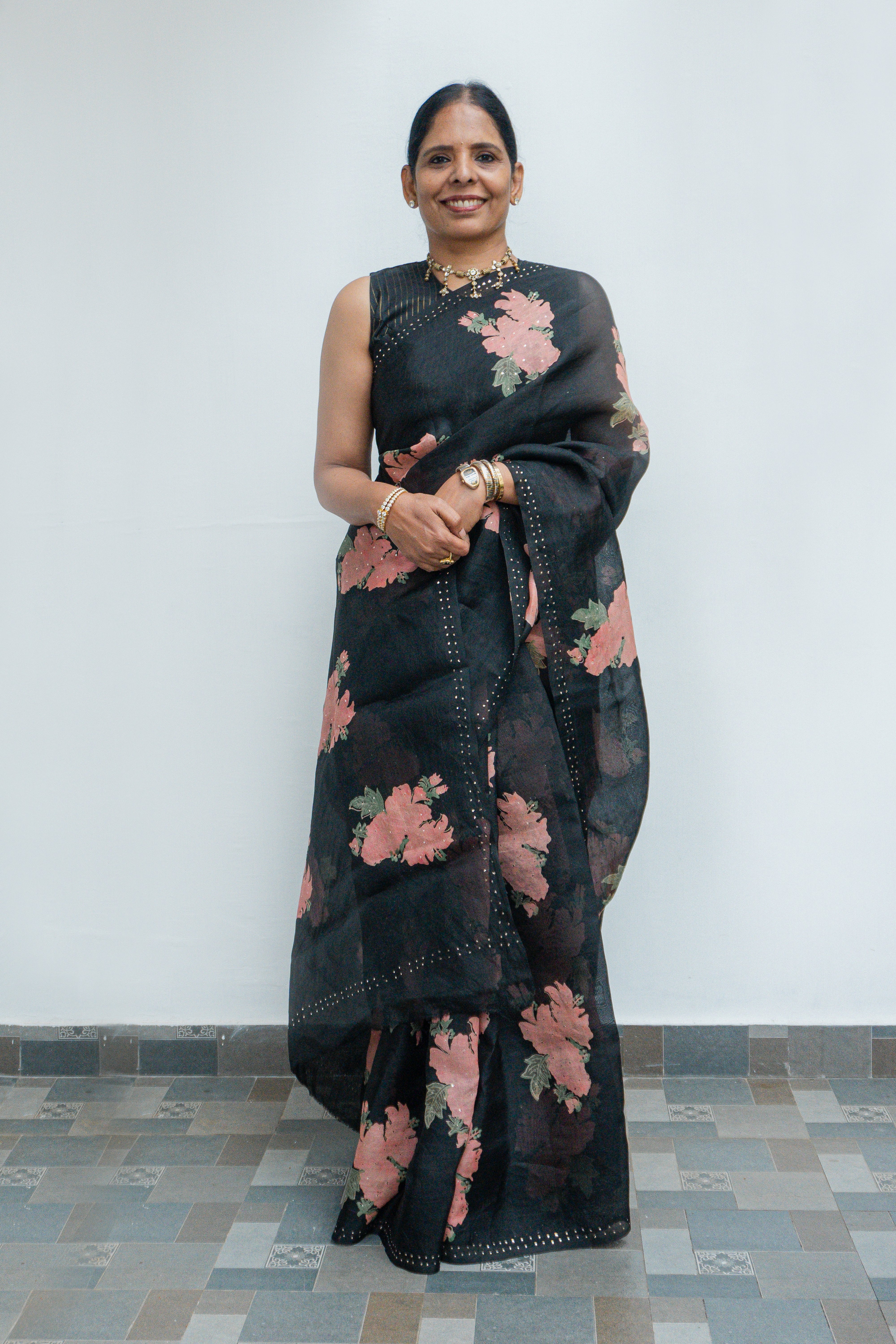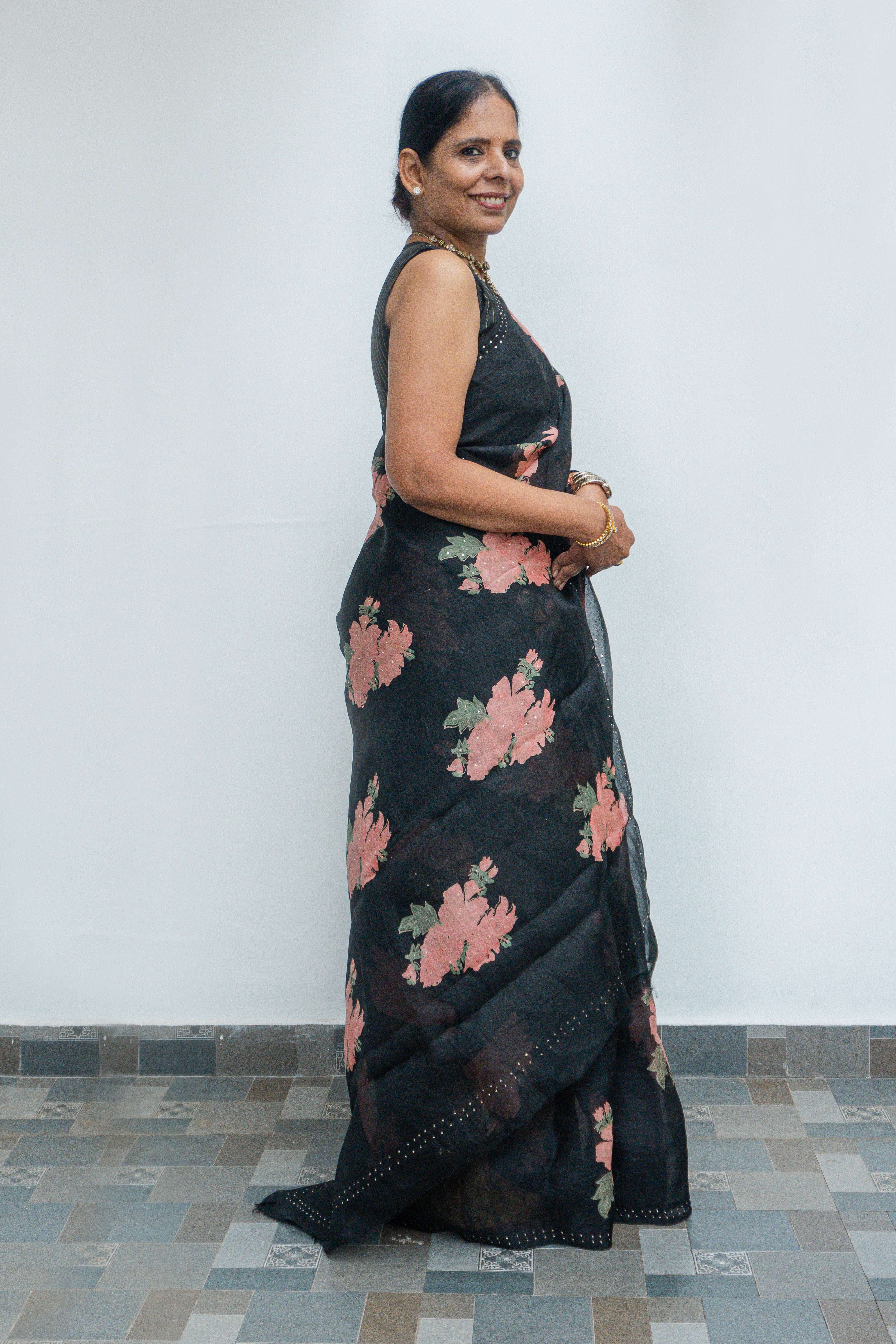 This jet black organza silk saree is distinguished by hibiscus flower hand block prints that bloom vividly across the body, creating a striking contrast against the deep black base.