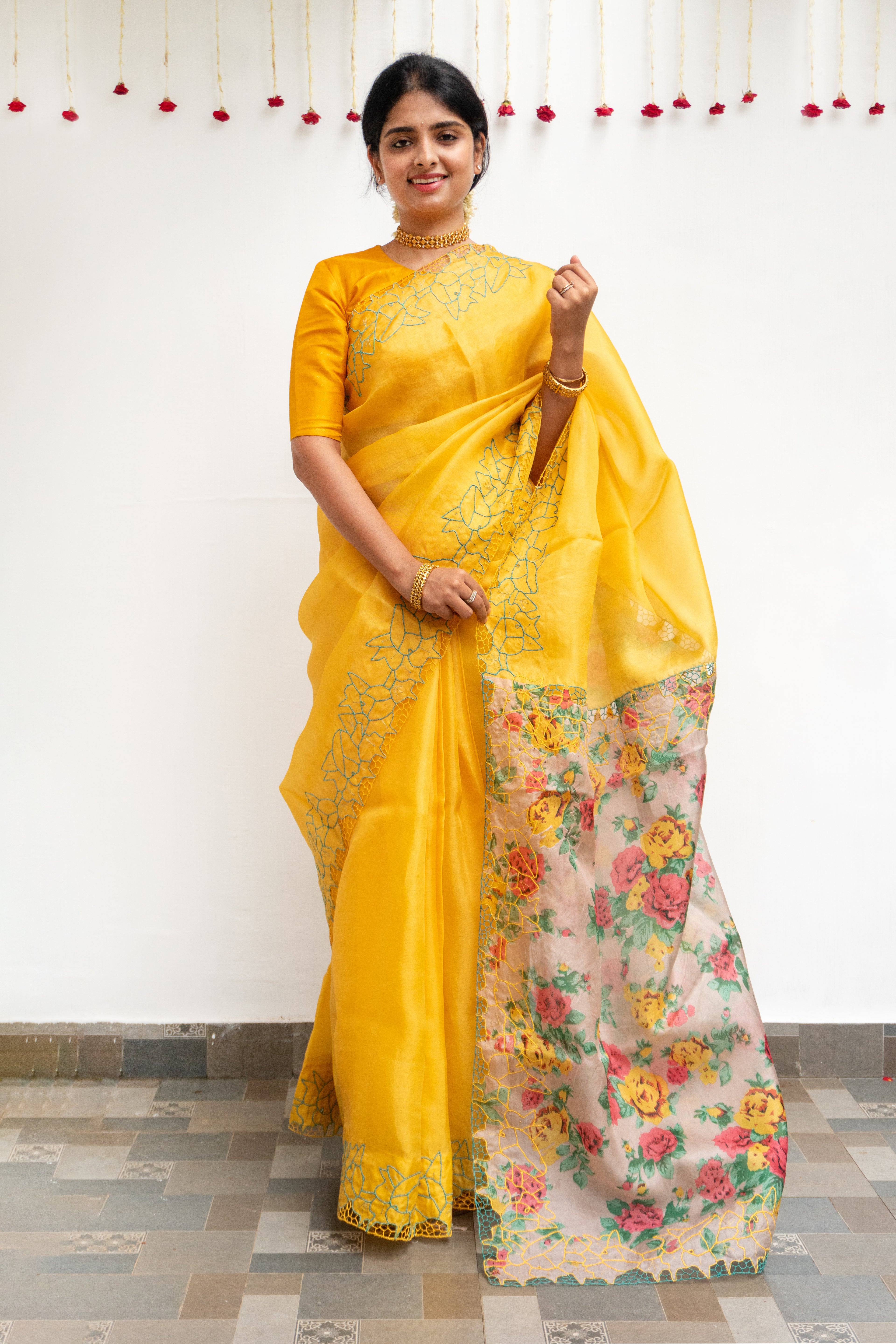 Ethereal Organza silk saree, designed to turn heads with it’s delicate charm. The saree features a beautifully crafted hand Cutwork border which elevates the look of the saree.