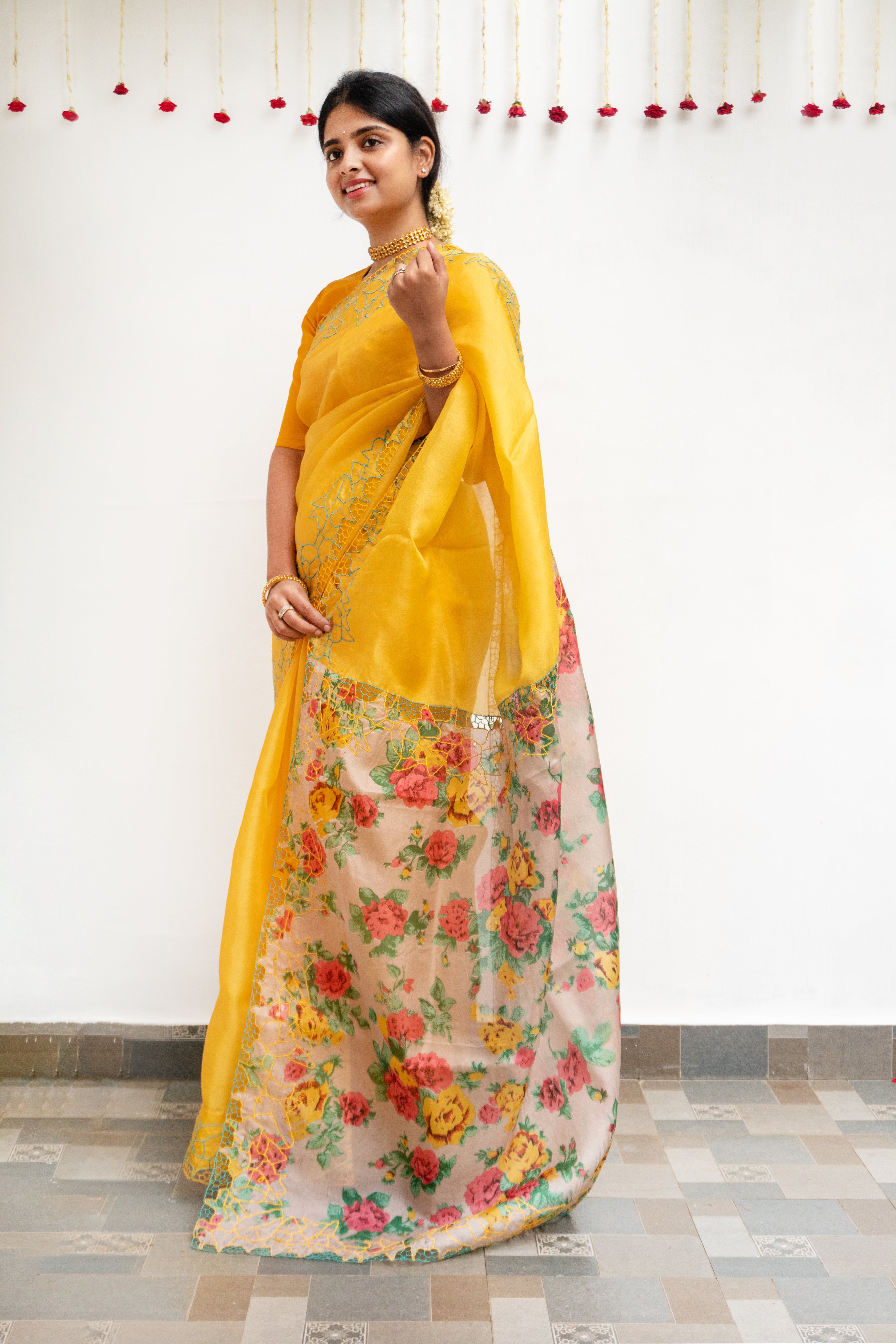 The highlight of the piece, is the stunning floral pallu and blouse which makes the saree unique. Prefect for festive moments and intimate celebrations.