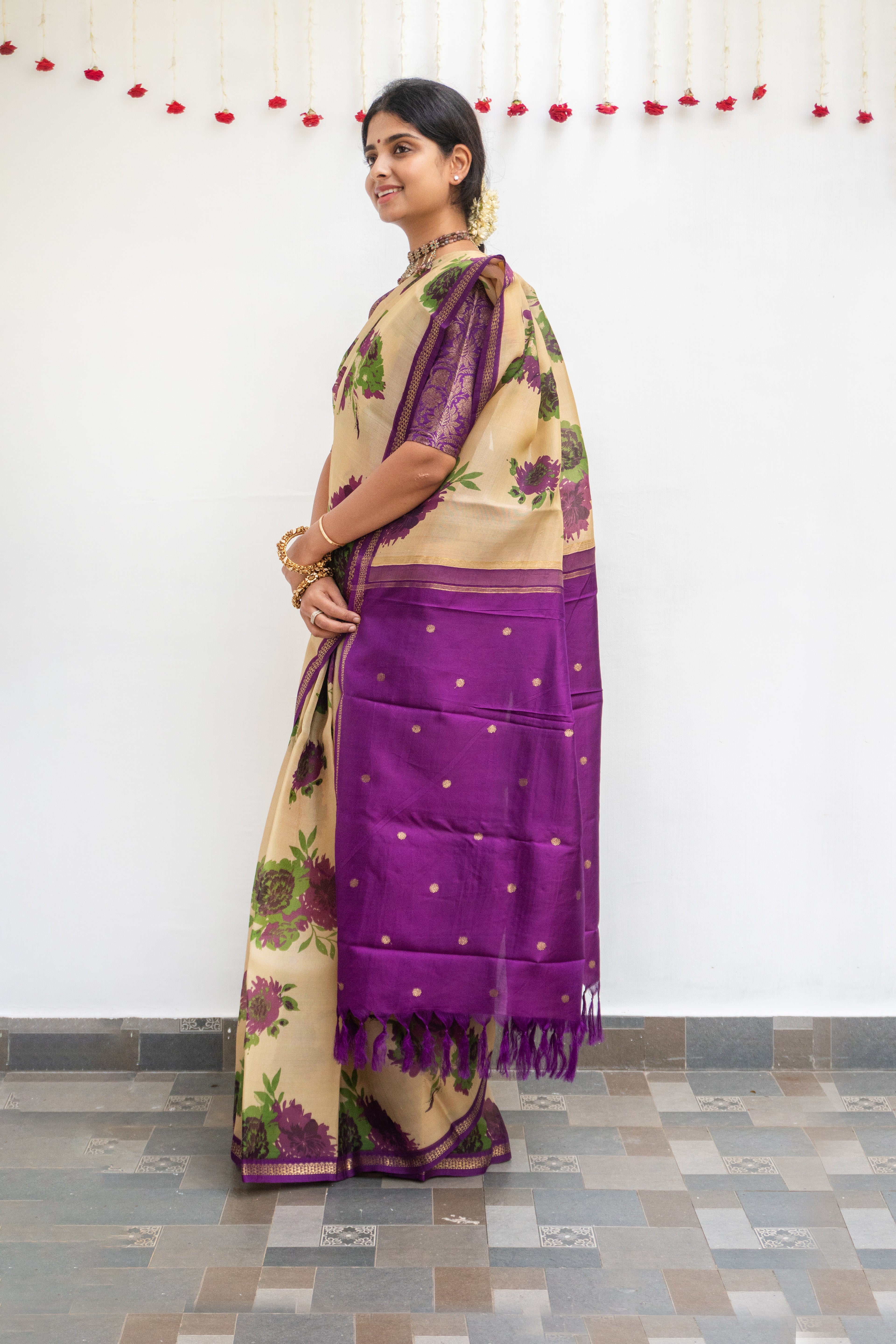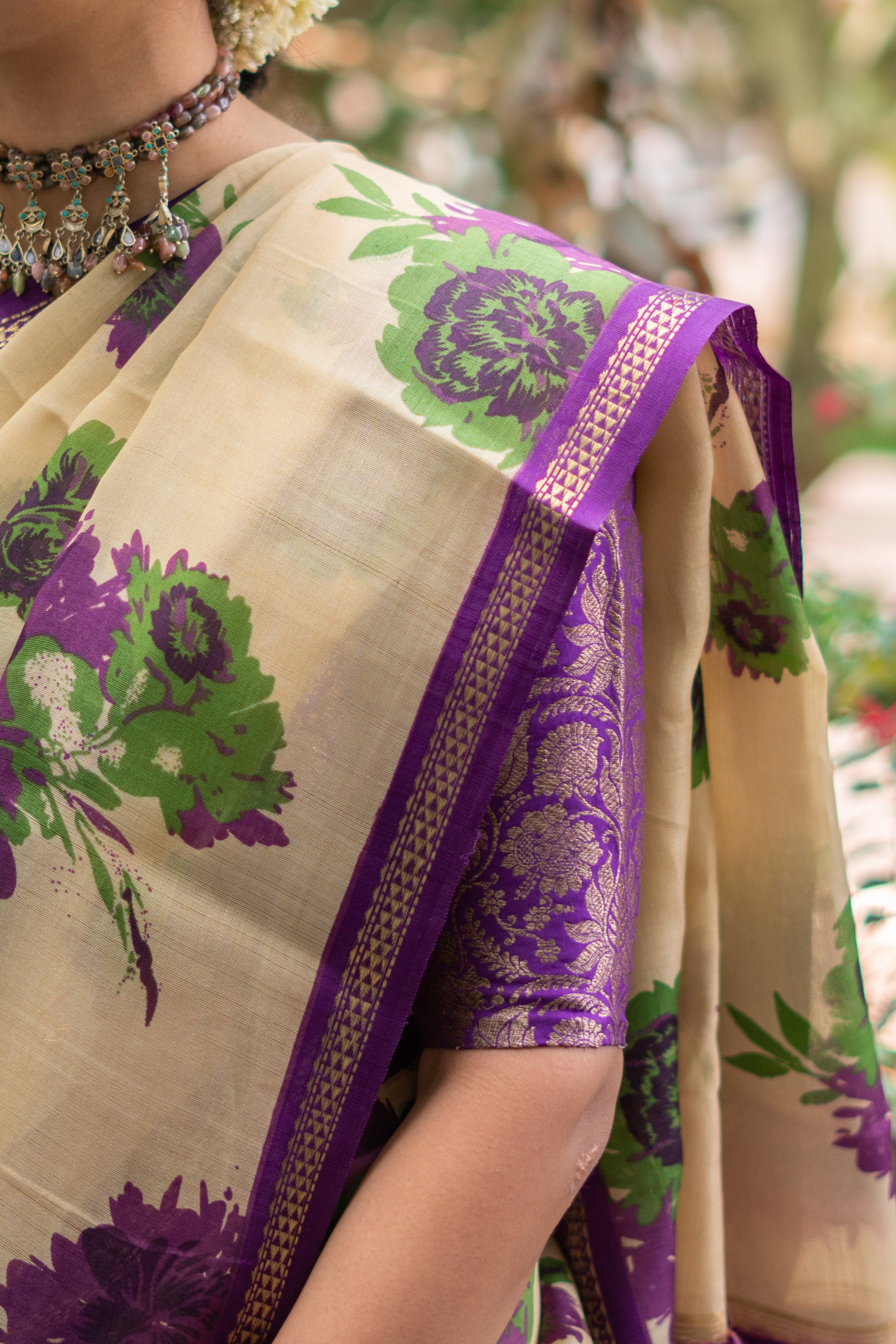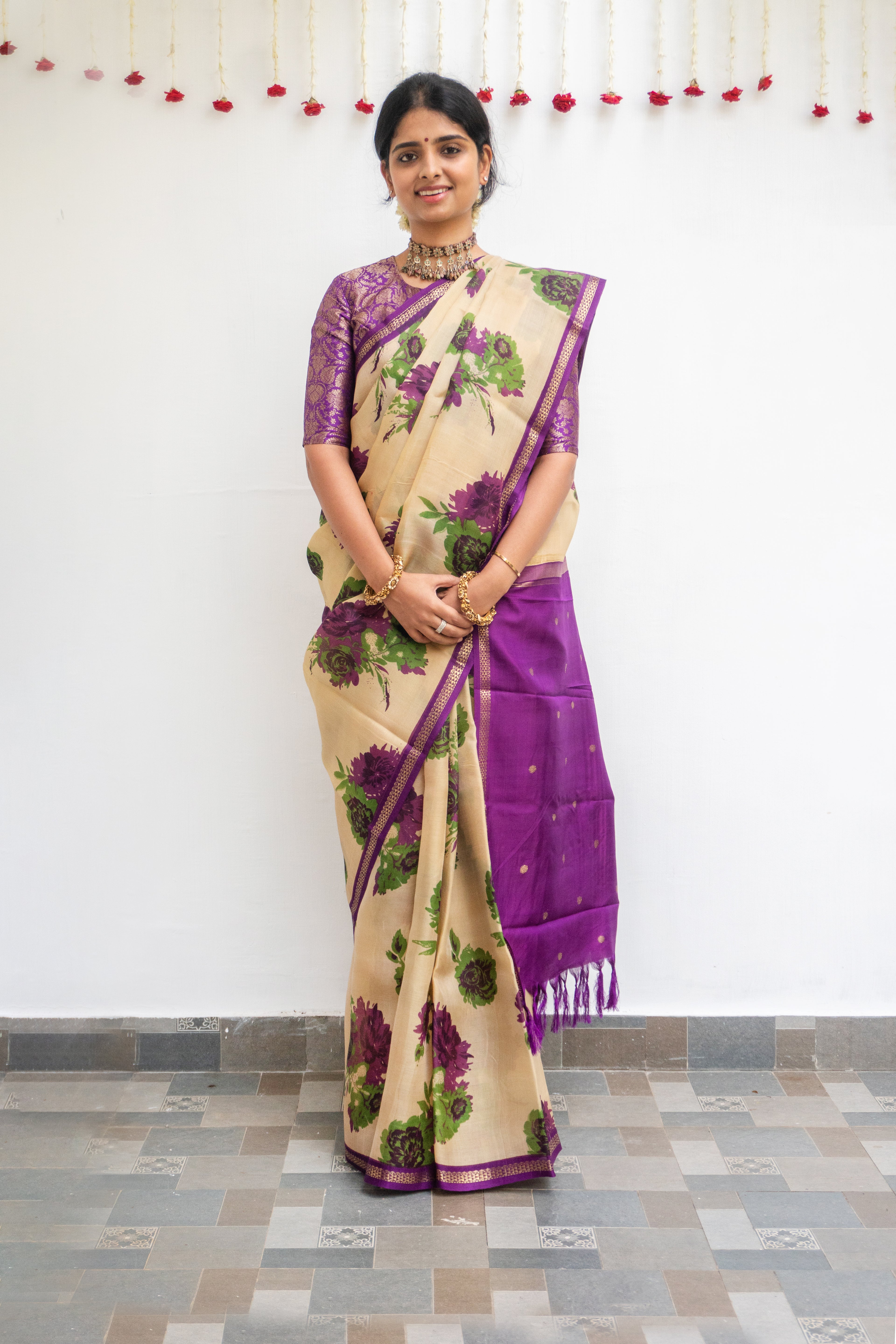 Elegant Kanji Organza sarees, featuring bold florals, a rich woven pallu, and blouse adorned with zari buttis.
