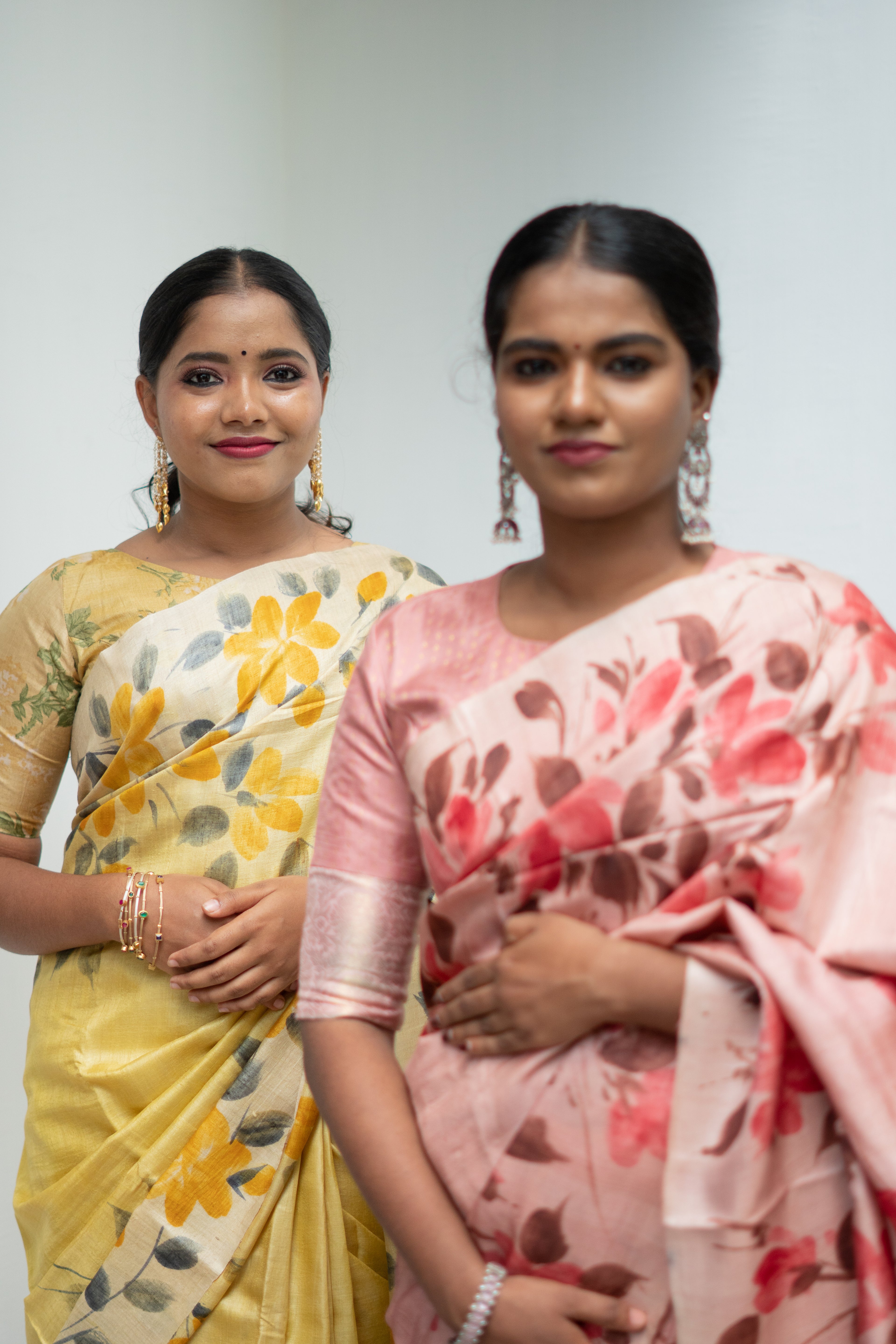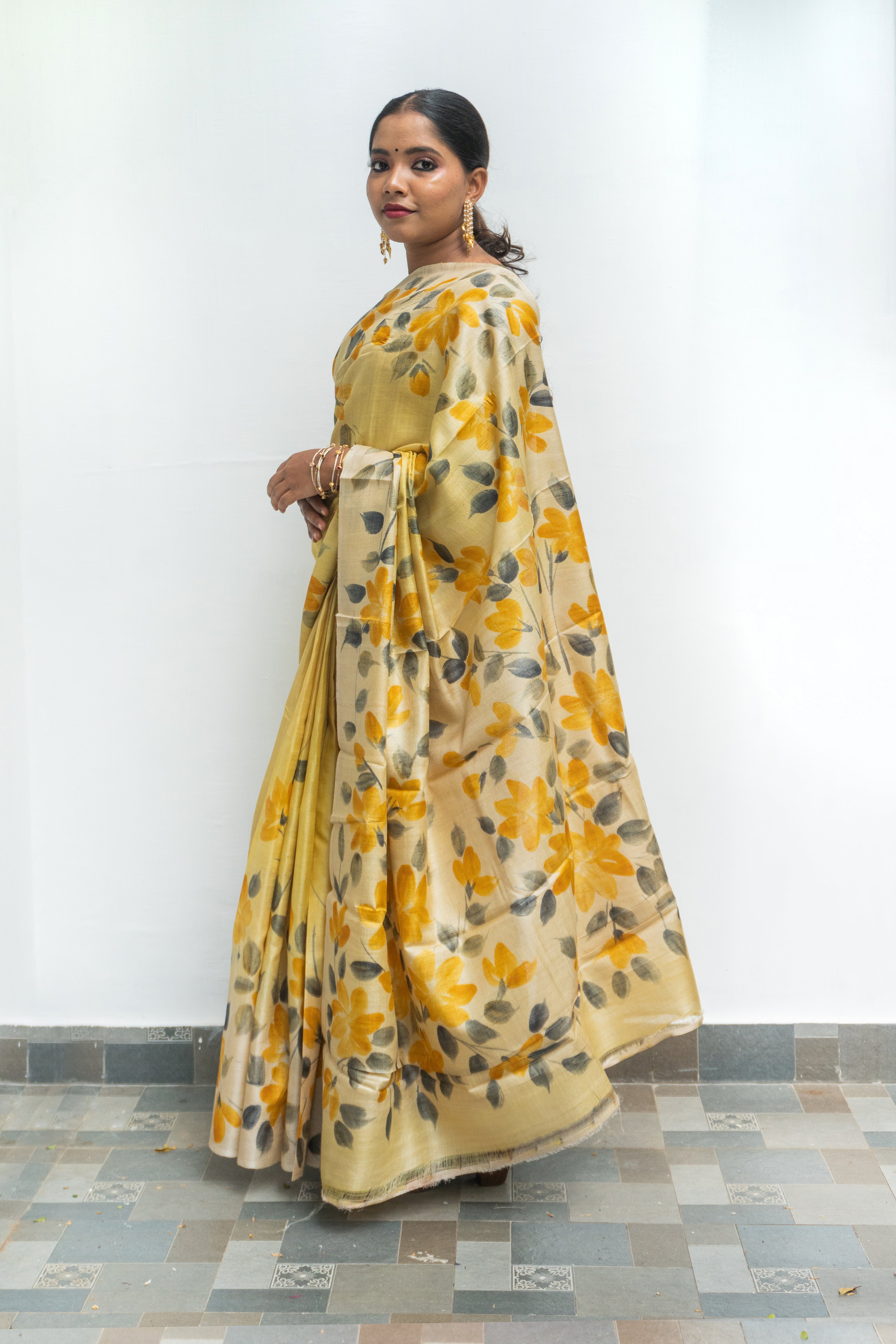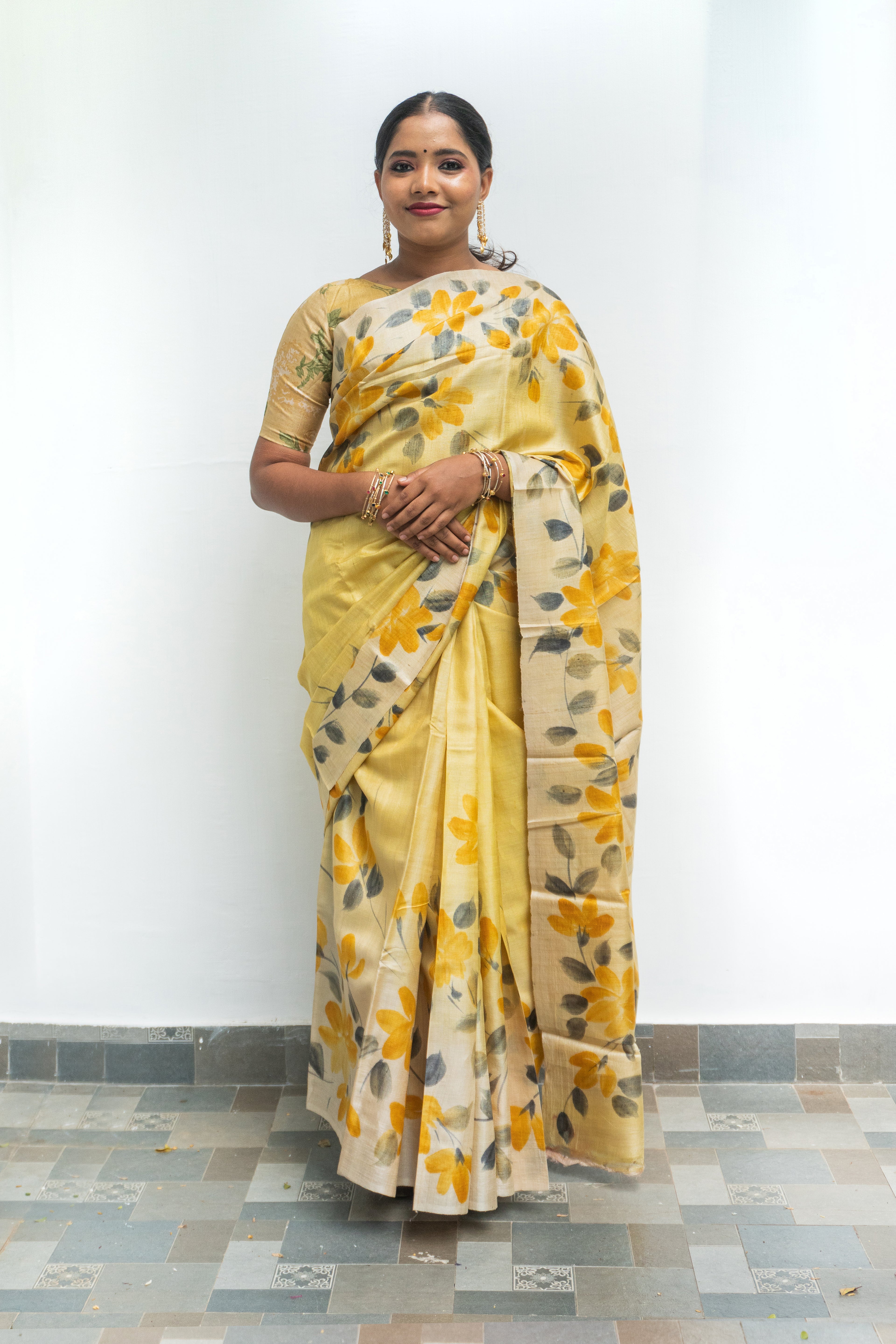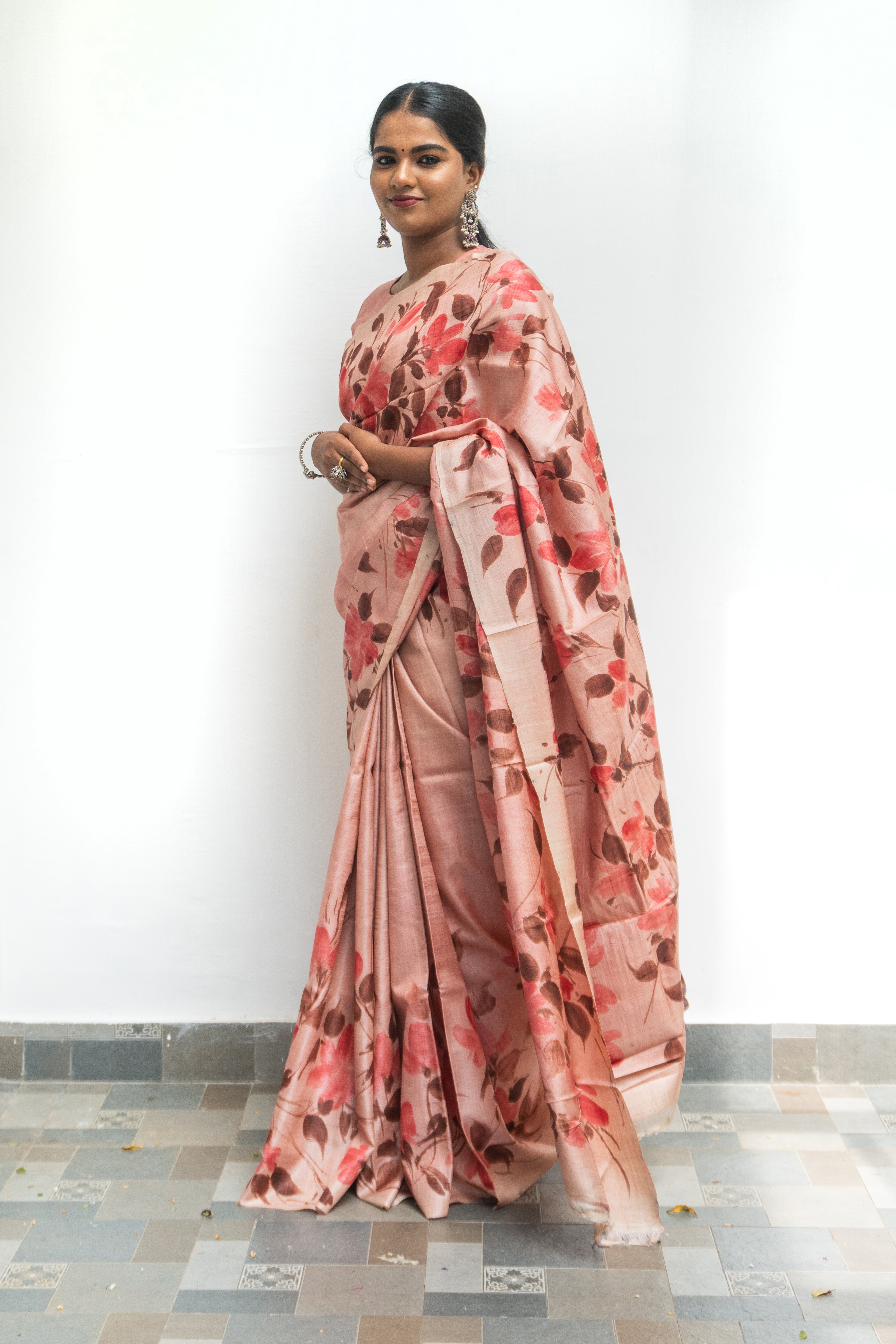 Pastel Tussar Silk Saree with Hand-Painted Floral Motifs