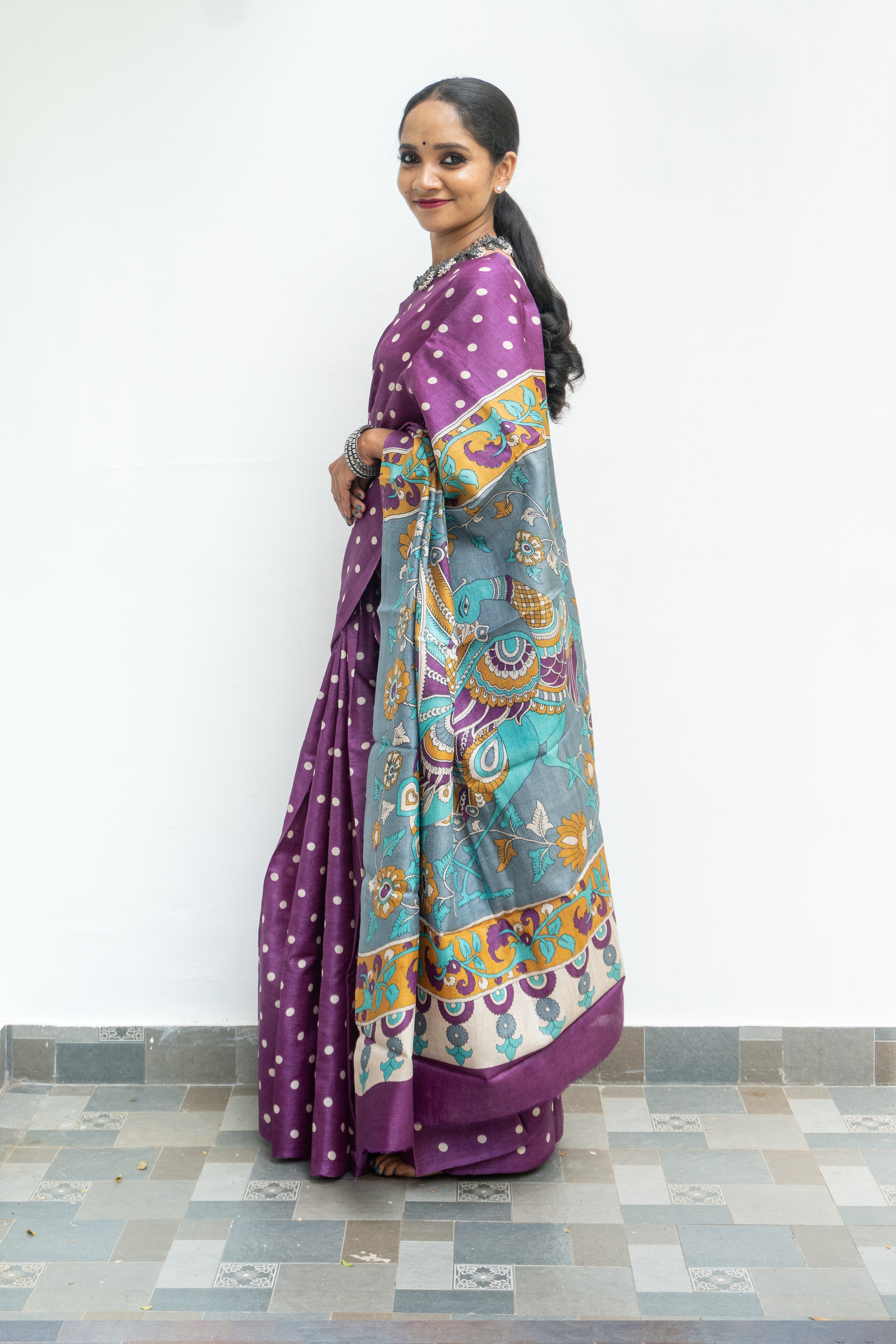 Purple Tussar Silk Saree with Polka Dots & Kalamkari Printed Pallu