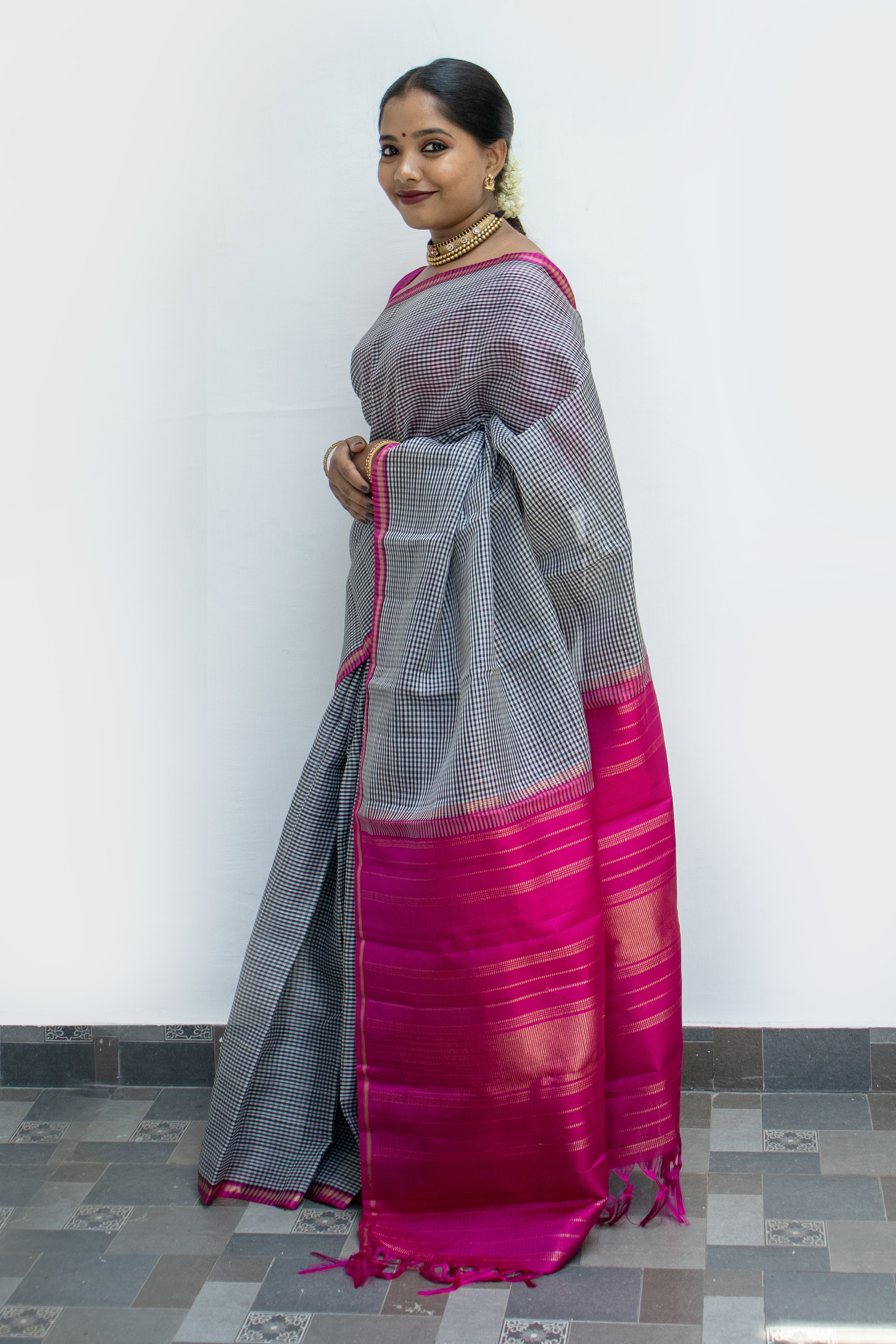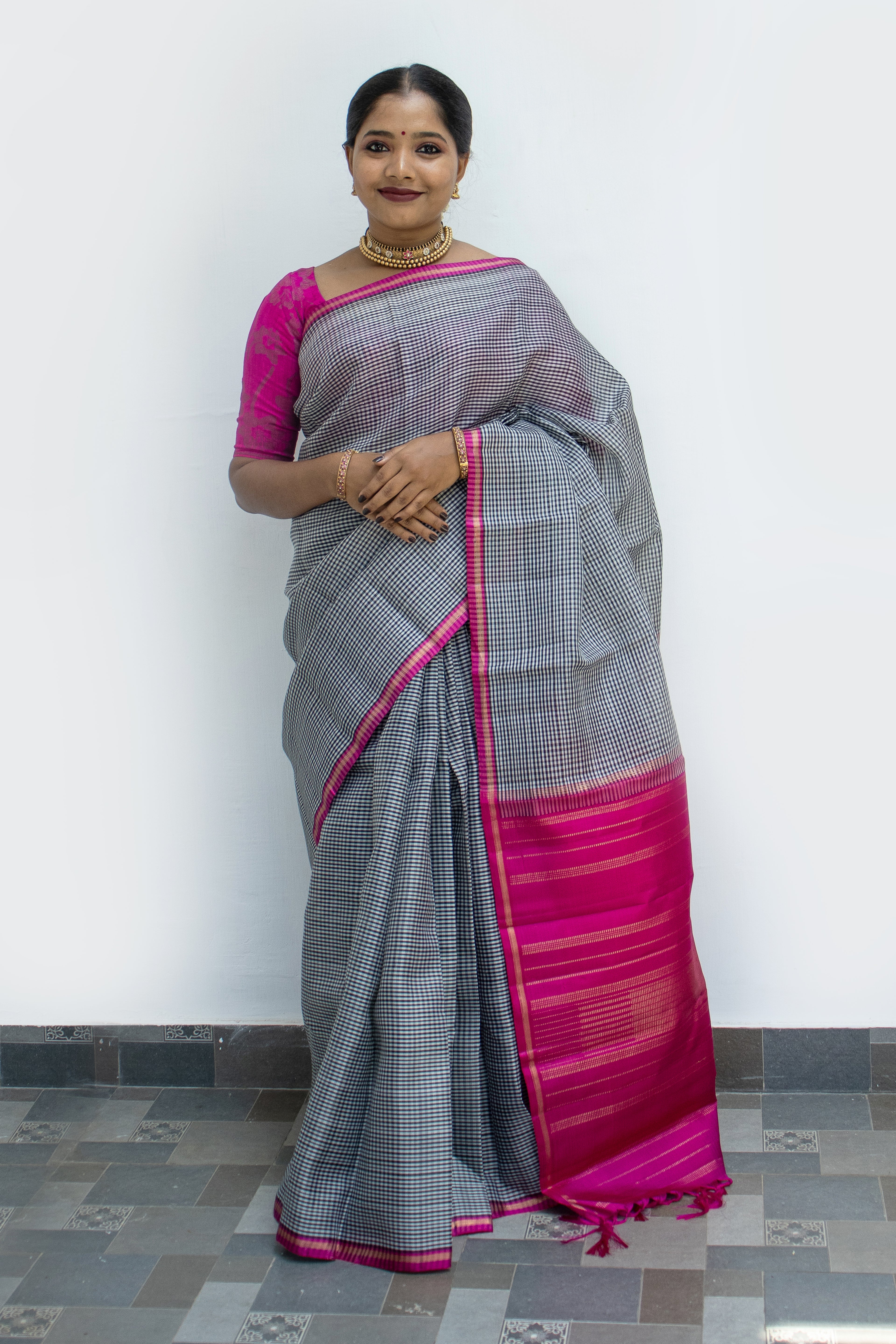 Kanchi Organza Silk Saree with Micro Checks & Gold Zari Seer Pallu