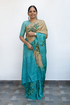 A graceful beige - turquoise blue shaded tussar silk saree featuring bold floral block prints that create a striking visual appeal. The design is further elevated with delicate badla work, adding a subtle shimmer and artisanal elegance to this timeless drape.