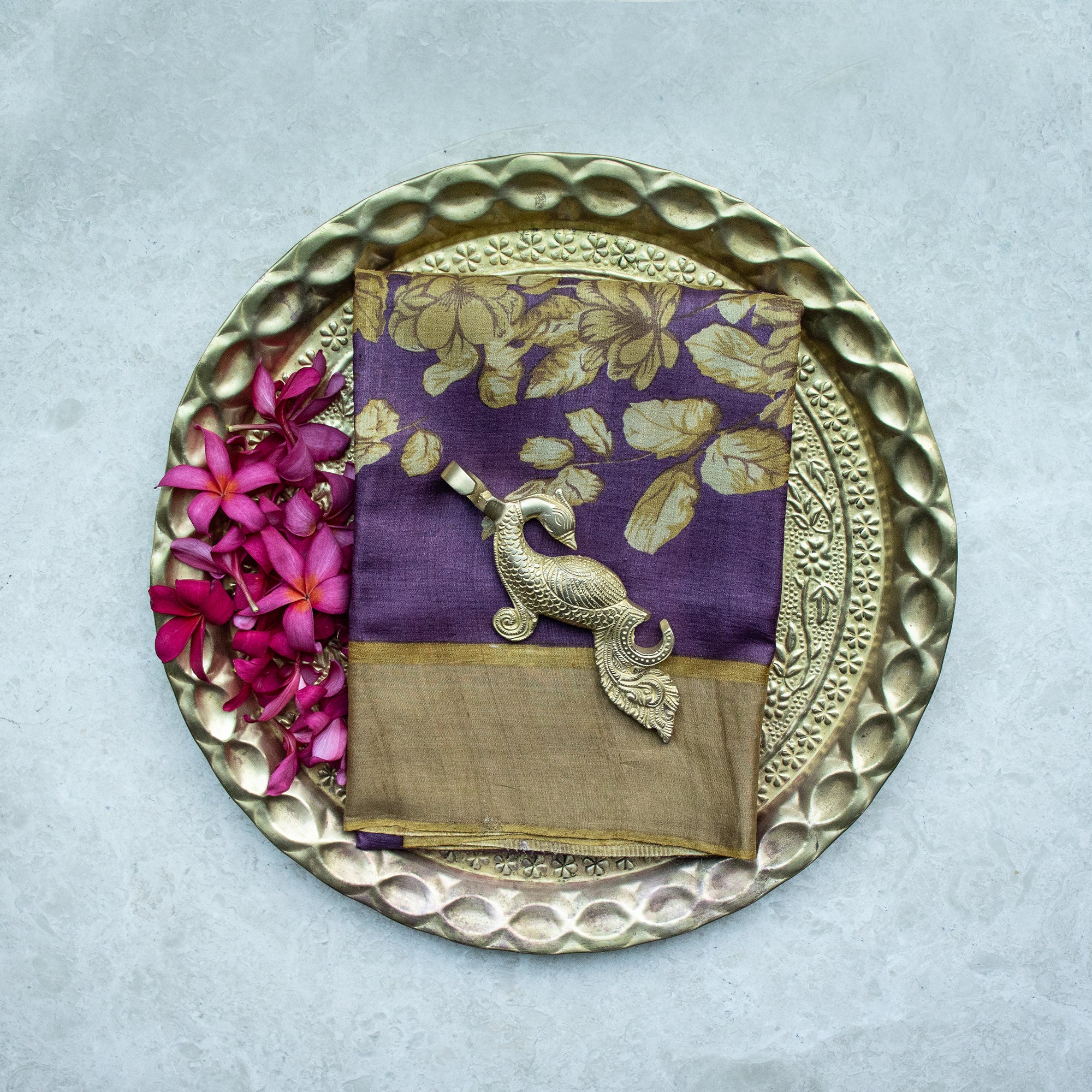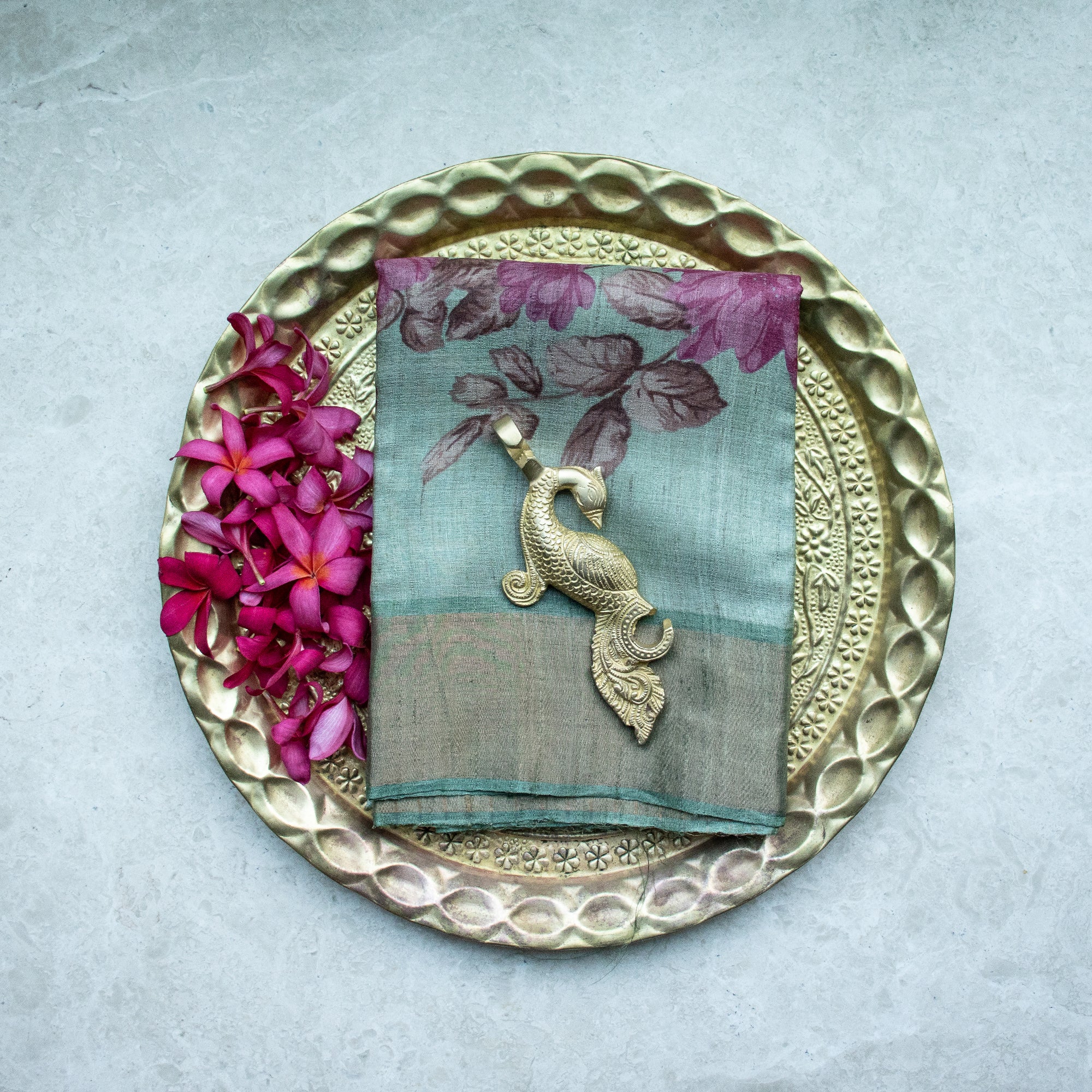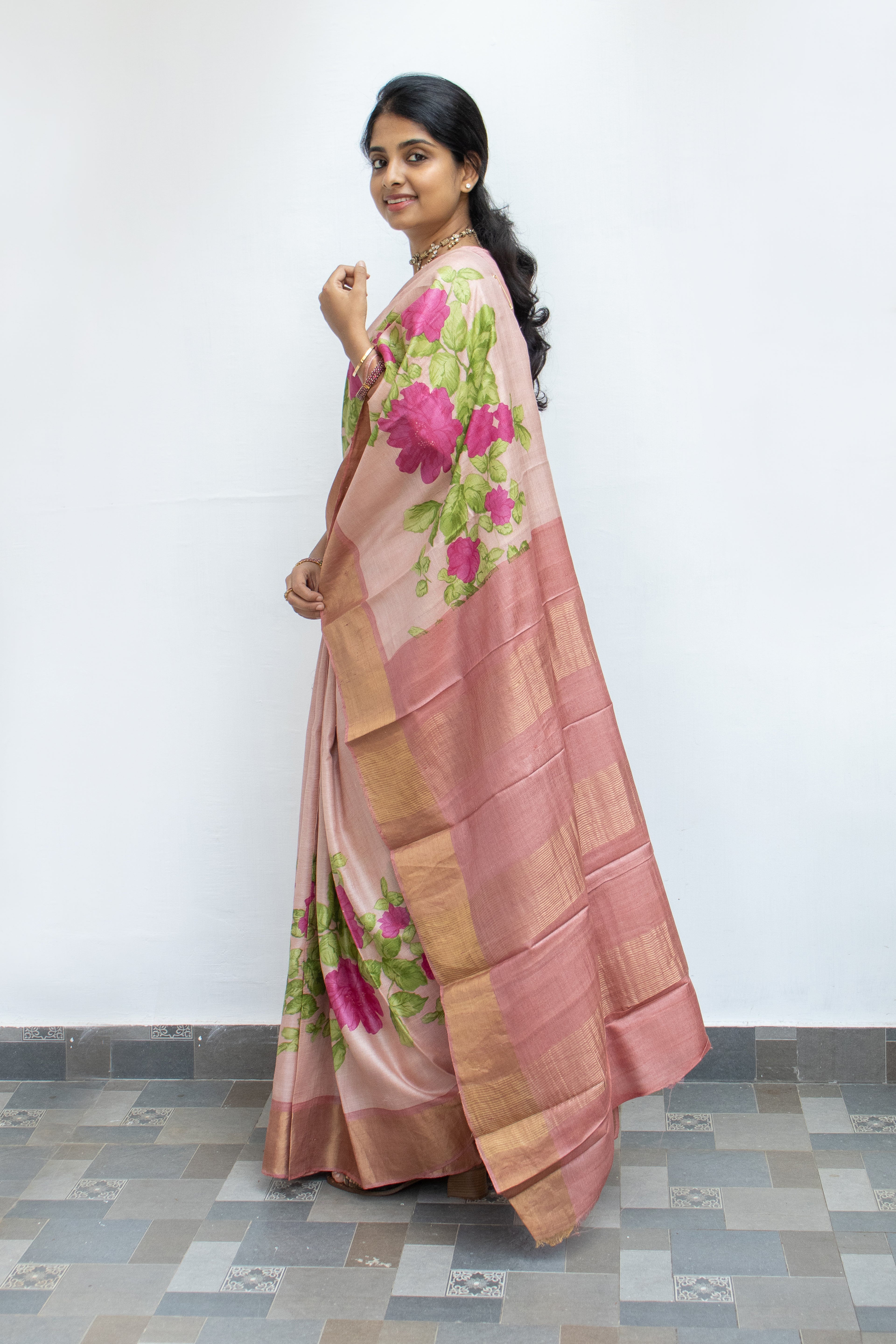 A soft pastel pink tussar silk saree adorned with delicate hand block printed florals, exuding understated elegance. The saree is finished with a tissue border.