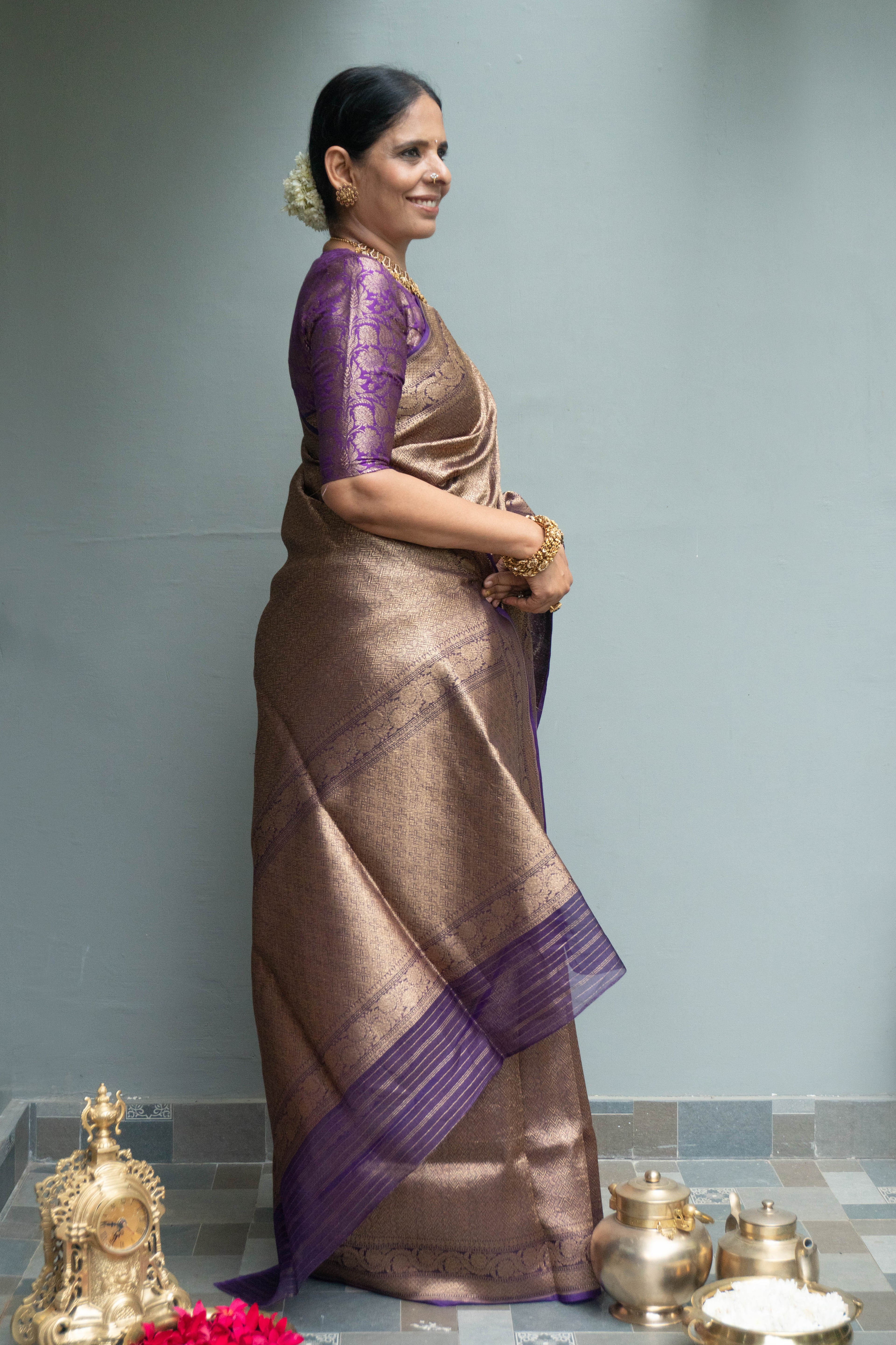Striking Violet Orgnaza-Banarasi silk saree with intricate gold zari weaving all over the body. The blouse mirrors the same shade as the body with gold stripes. Experience the richness of Banarasi silk in this gorgeous piece.
