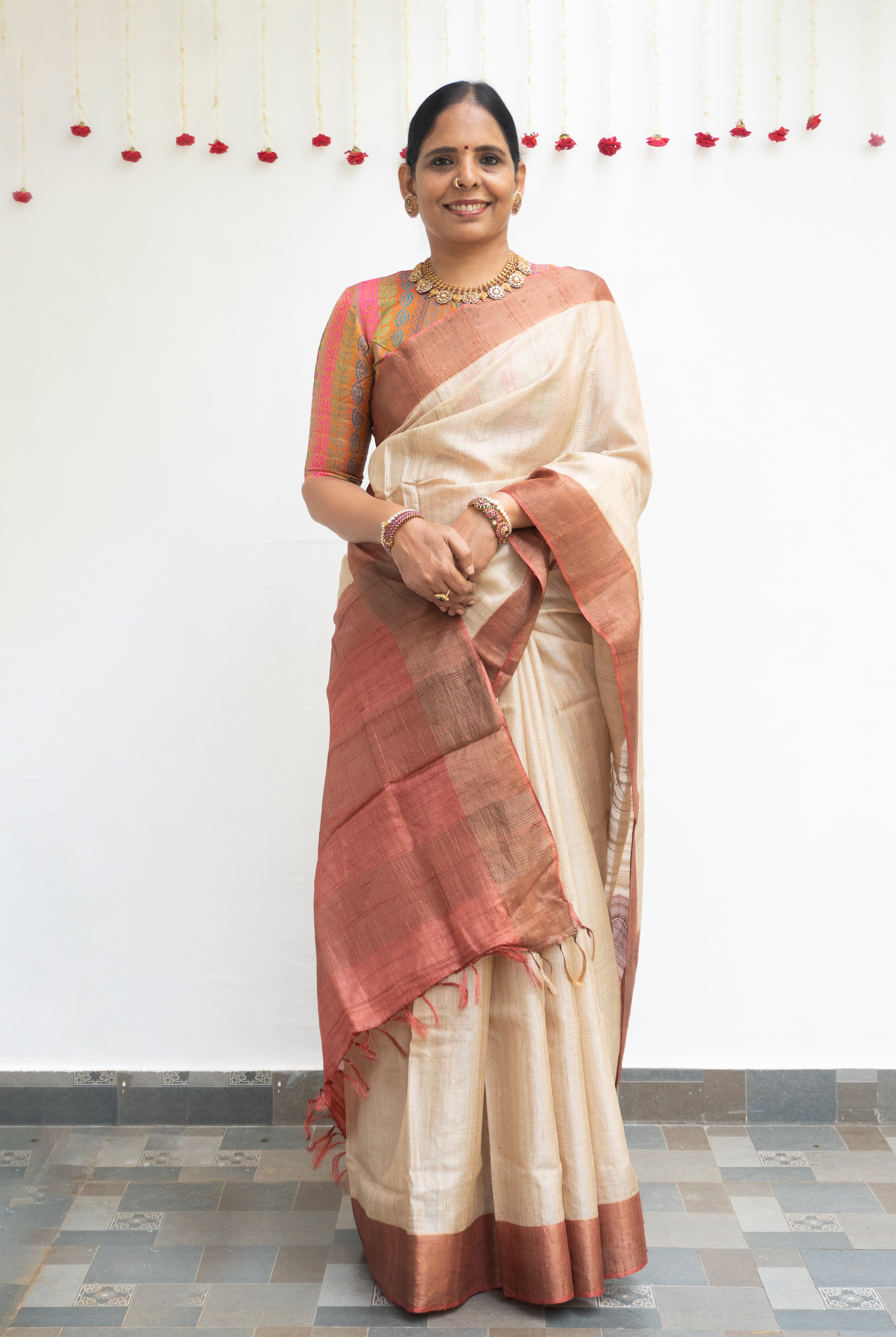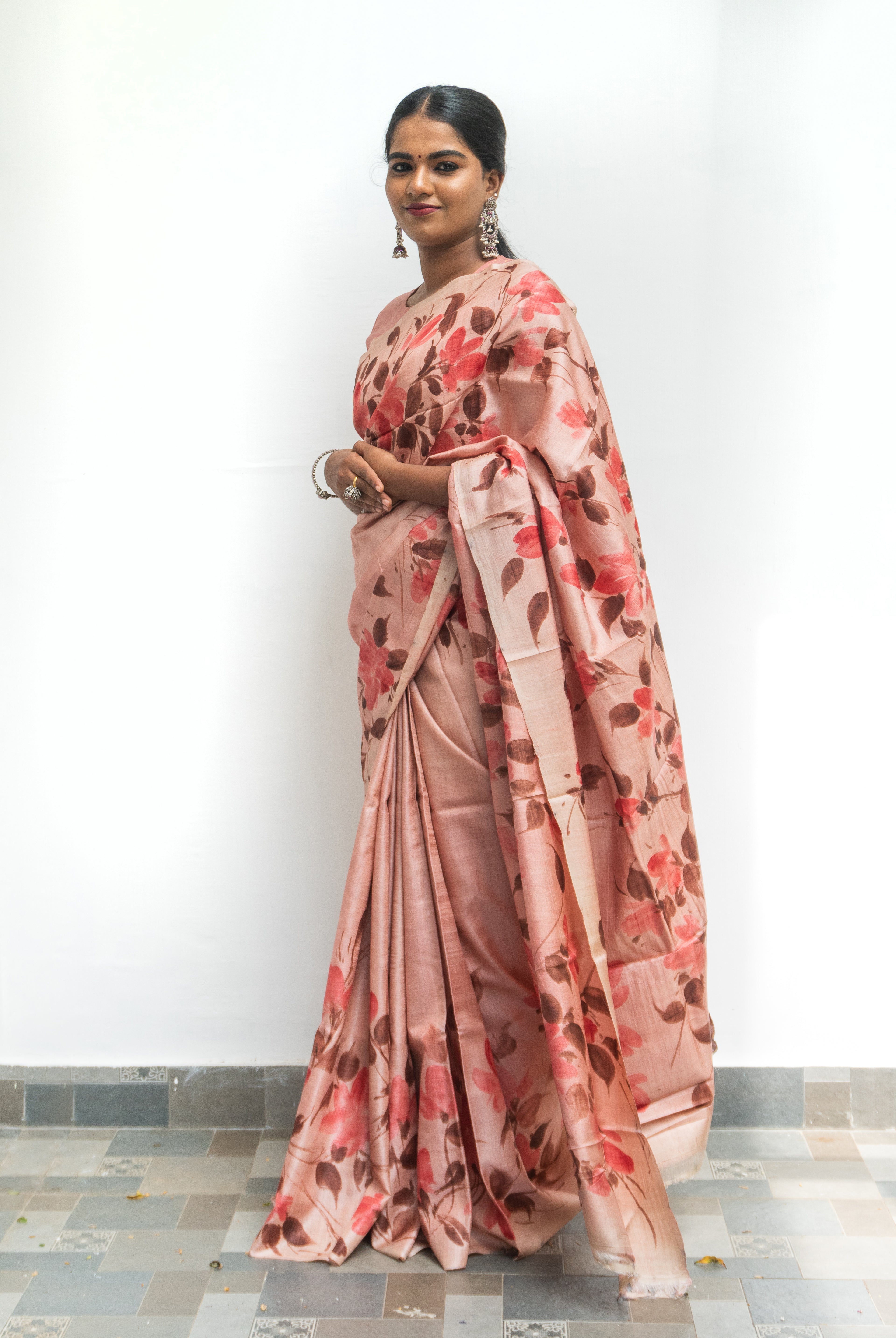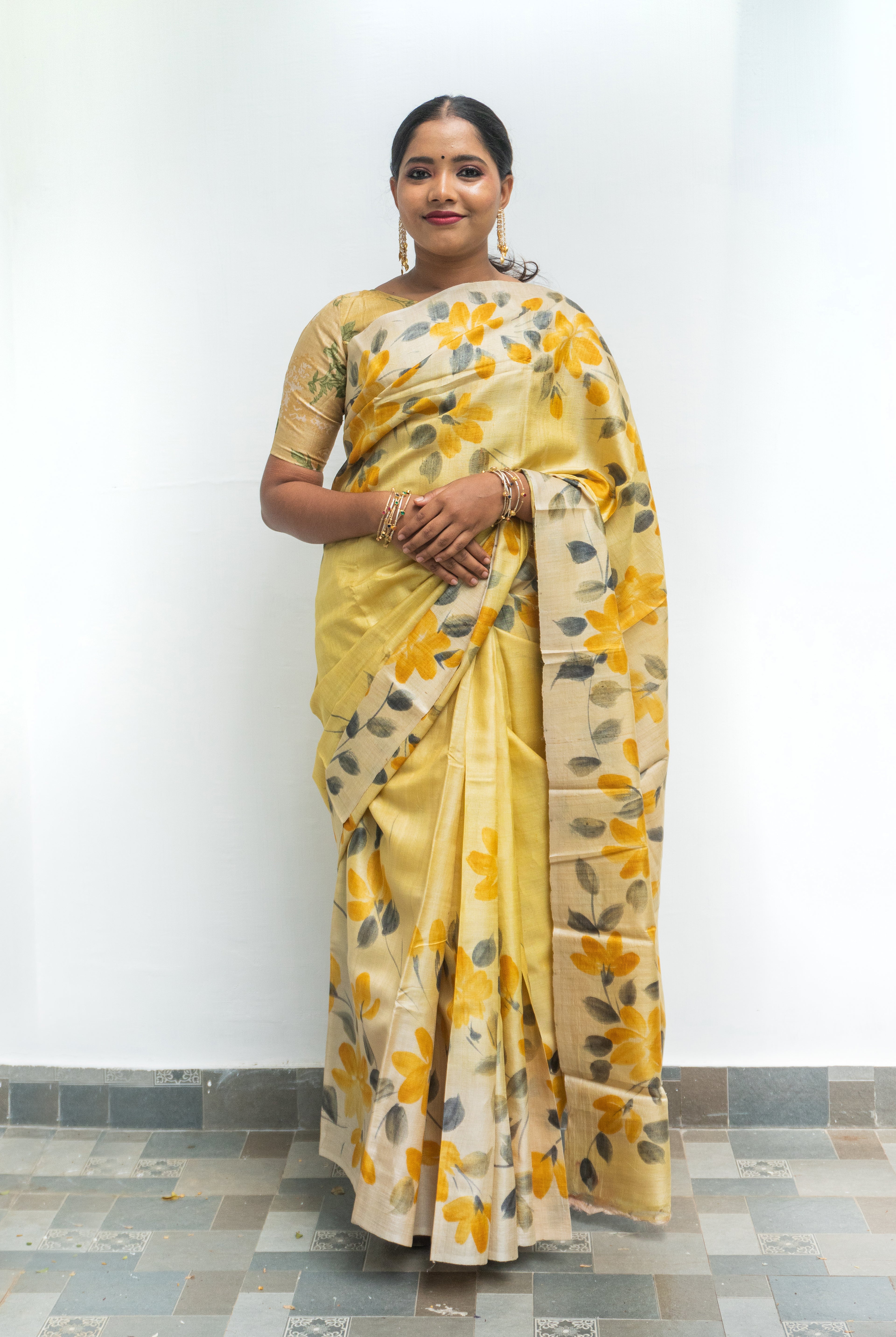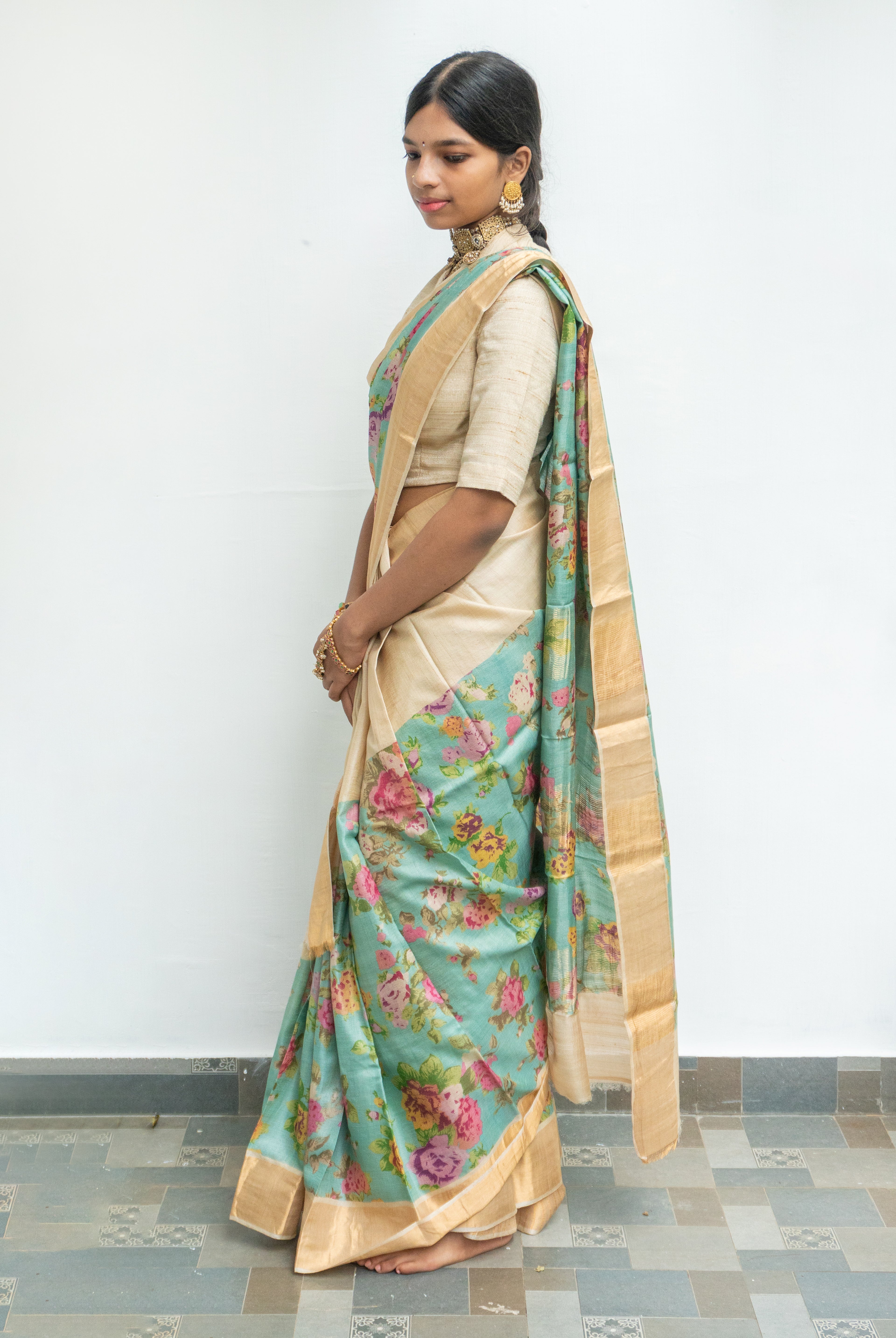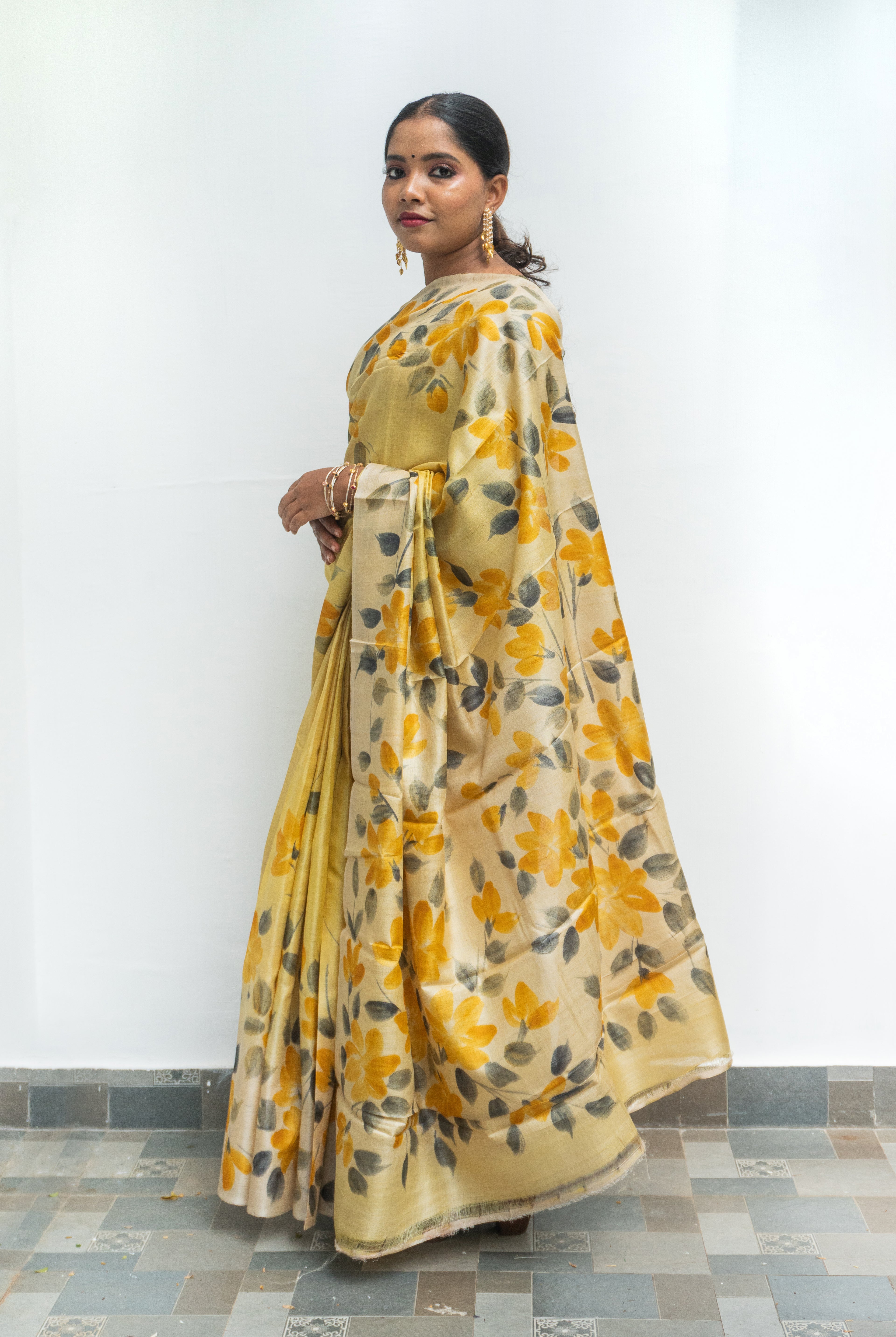 Perfect for festive occasions, weddings, and cultural celebrations, this floral tussar silk saree pairs effortlessly with traditional or contemporary blouses.