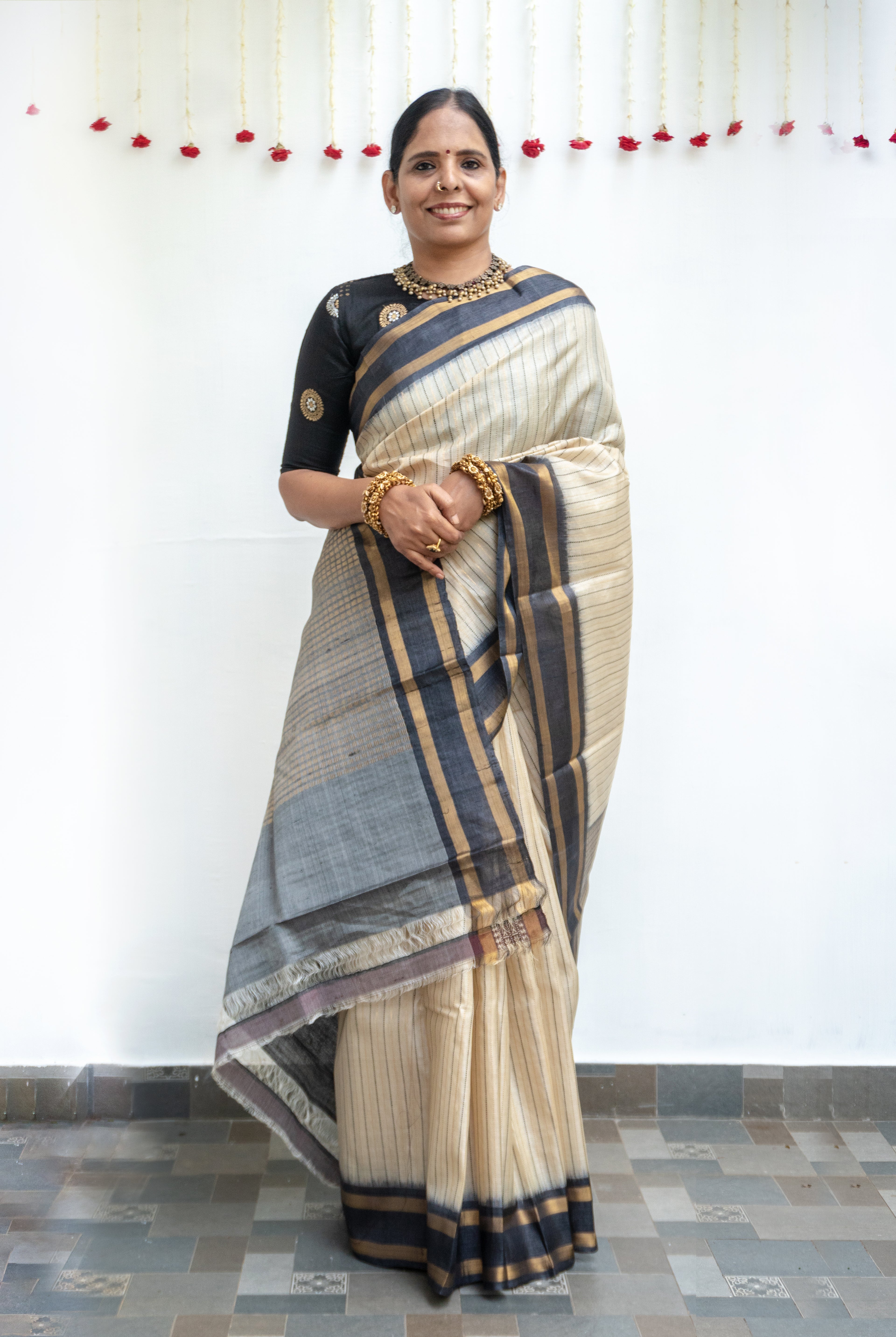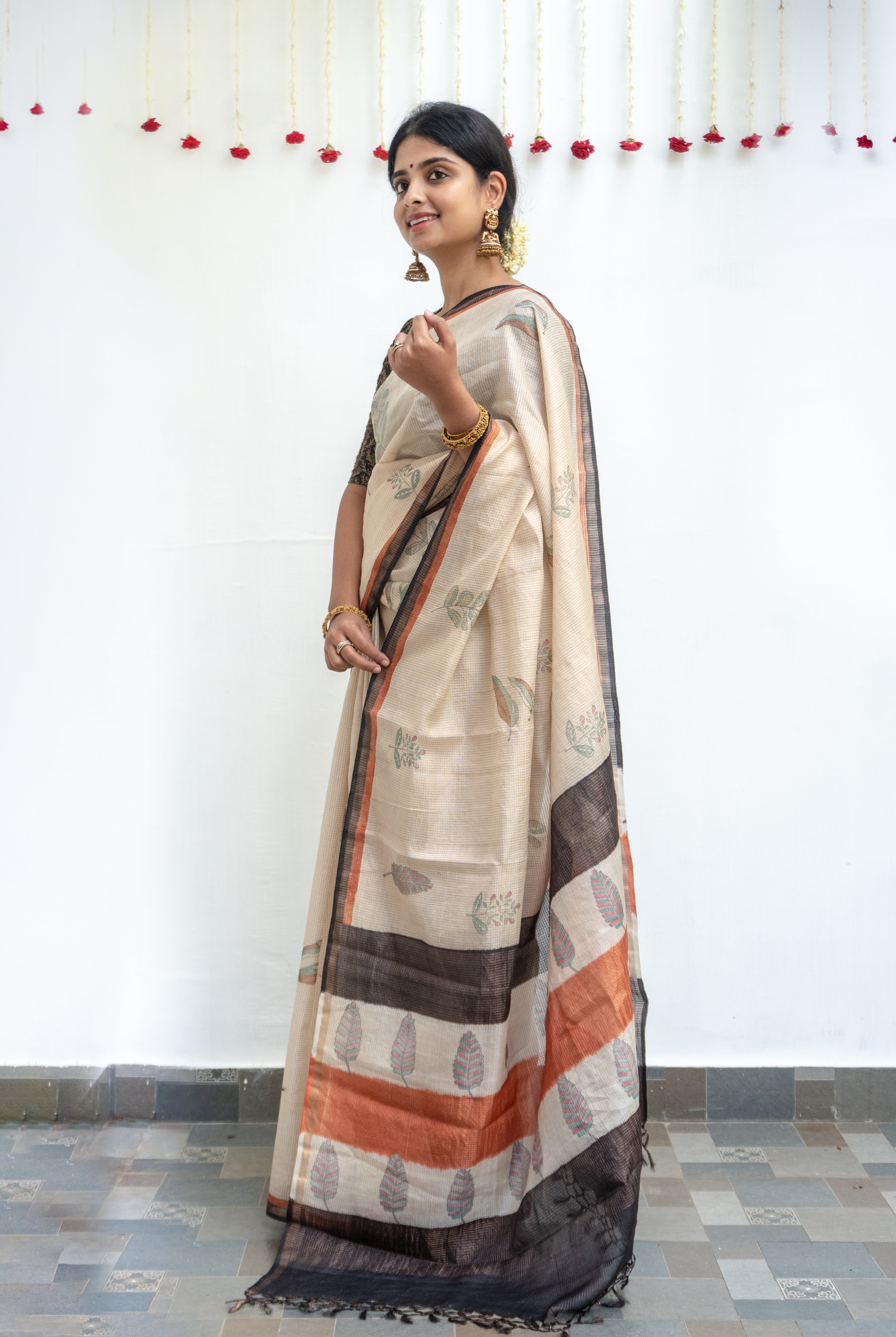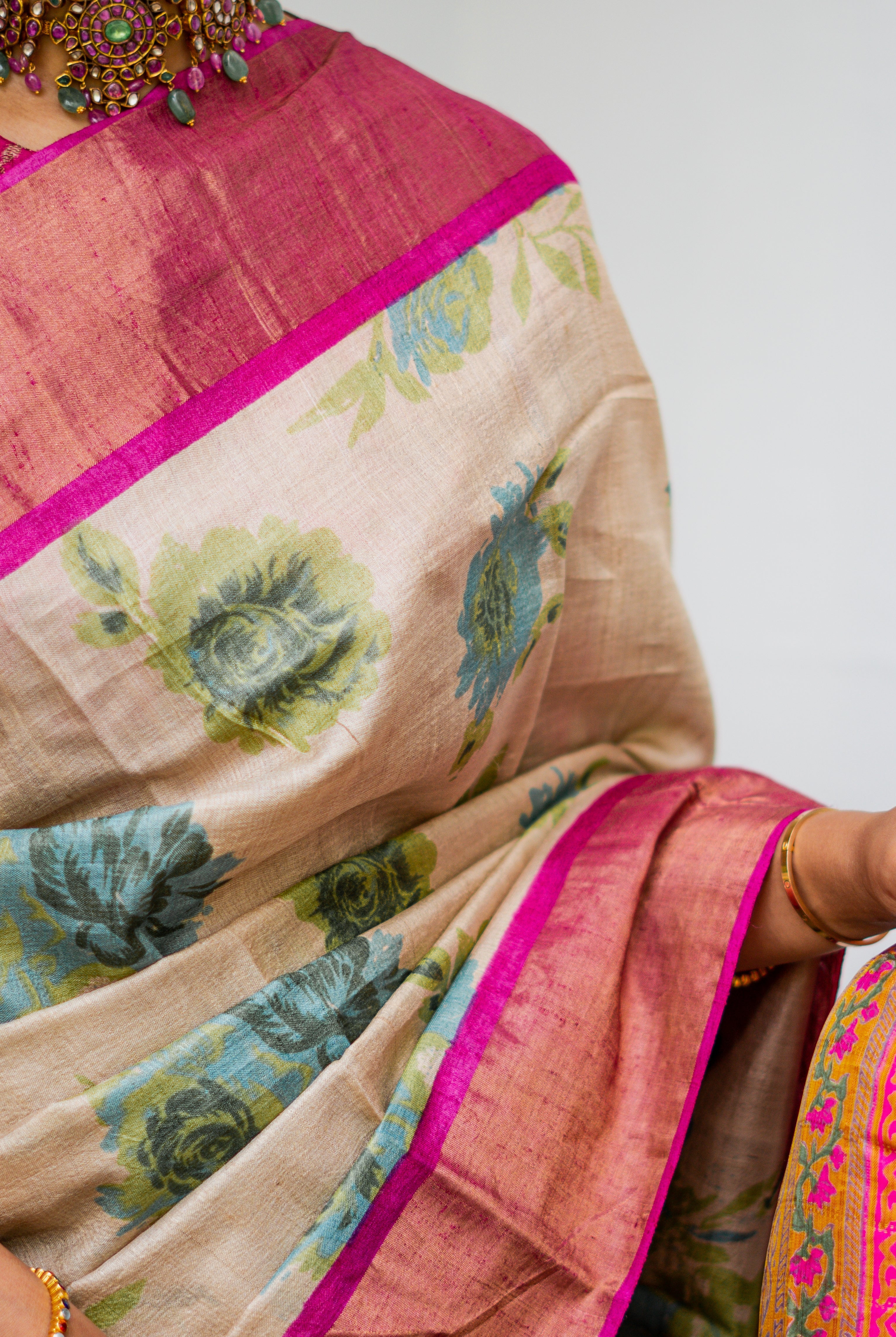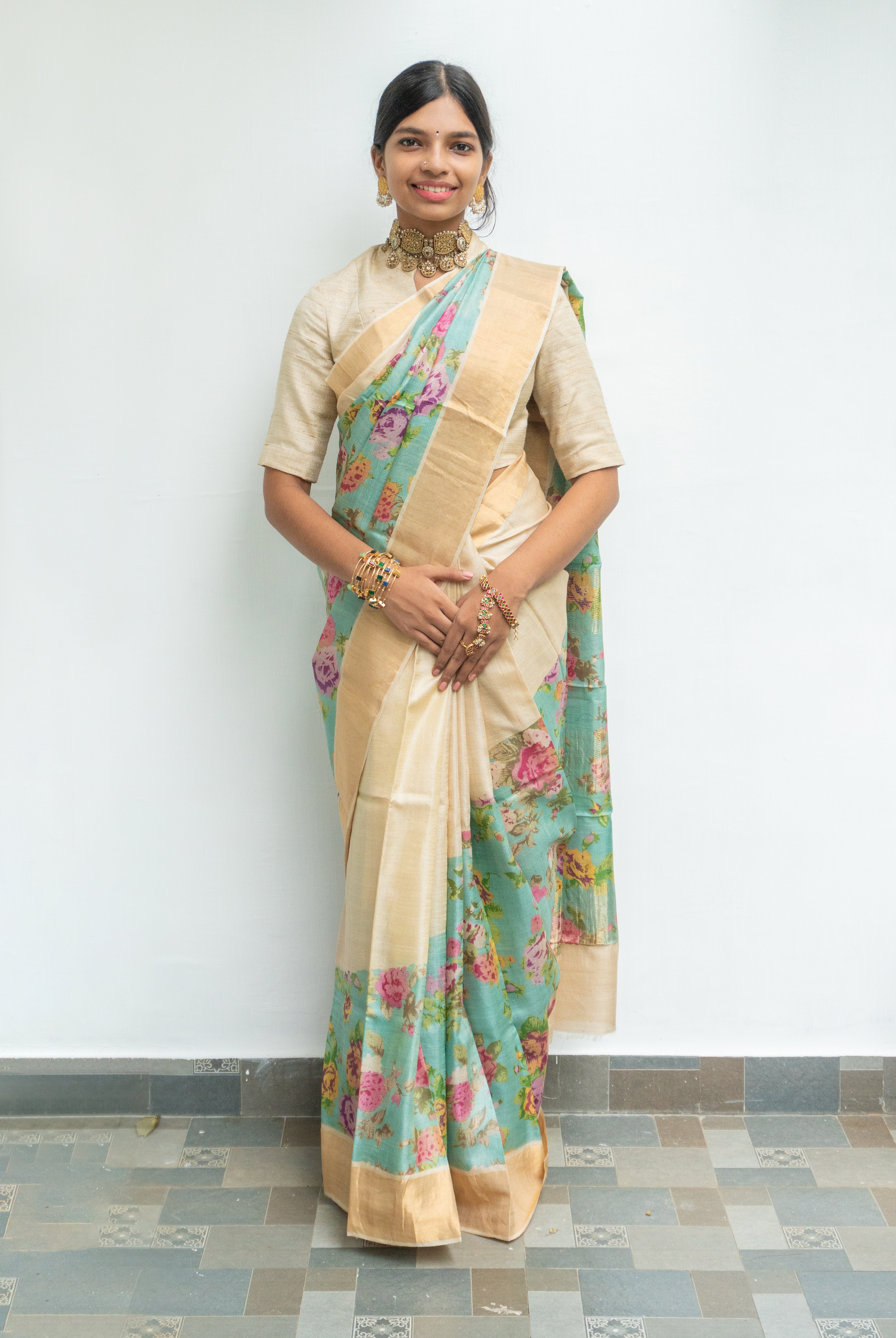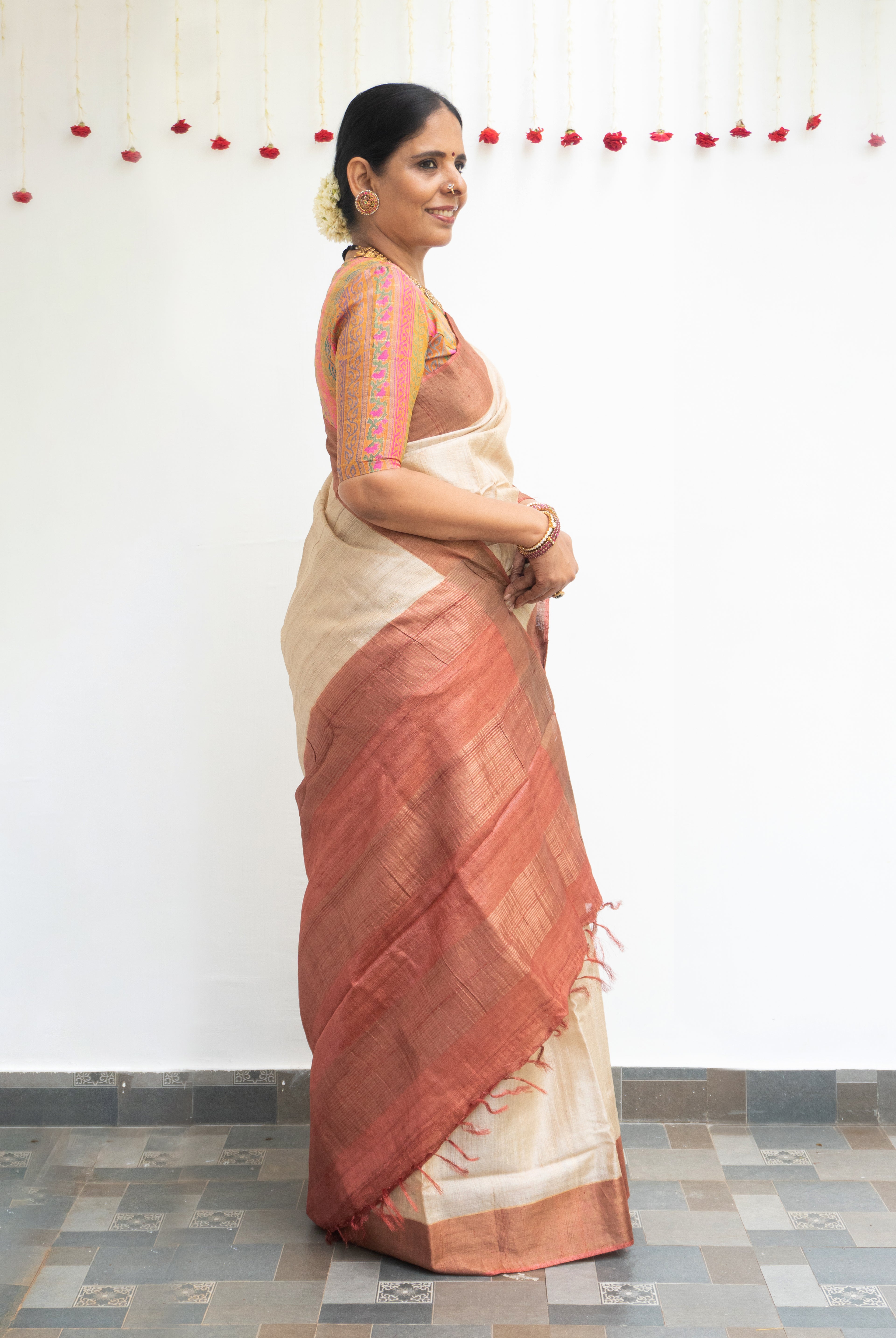 Perfect for festive occasions, weddings, and cultural celebrations, this floral tussar silk saree pairs effortlessly with traditional or contemporary blouses.