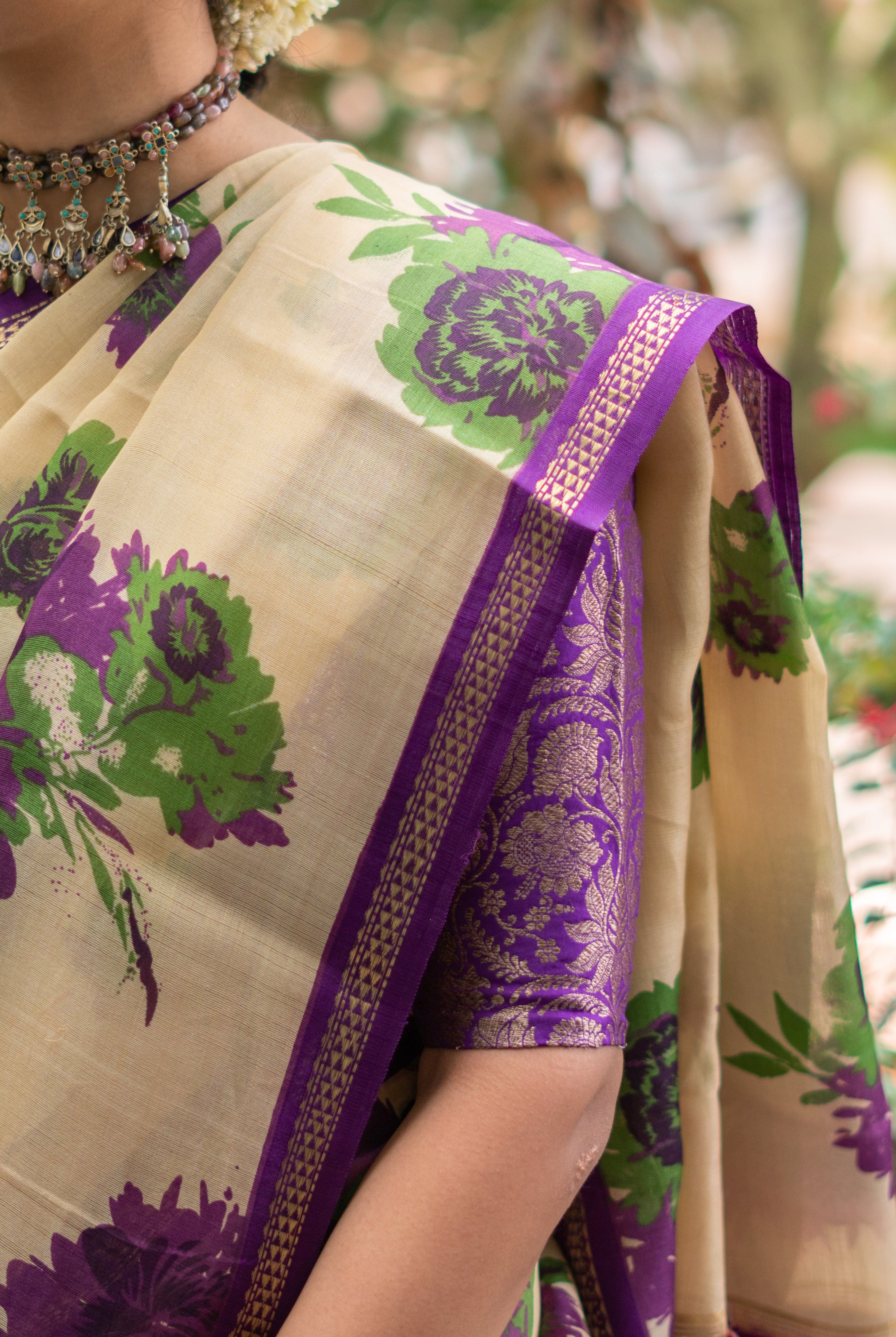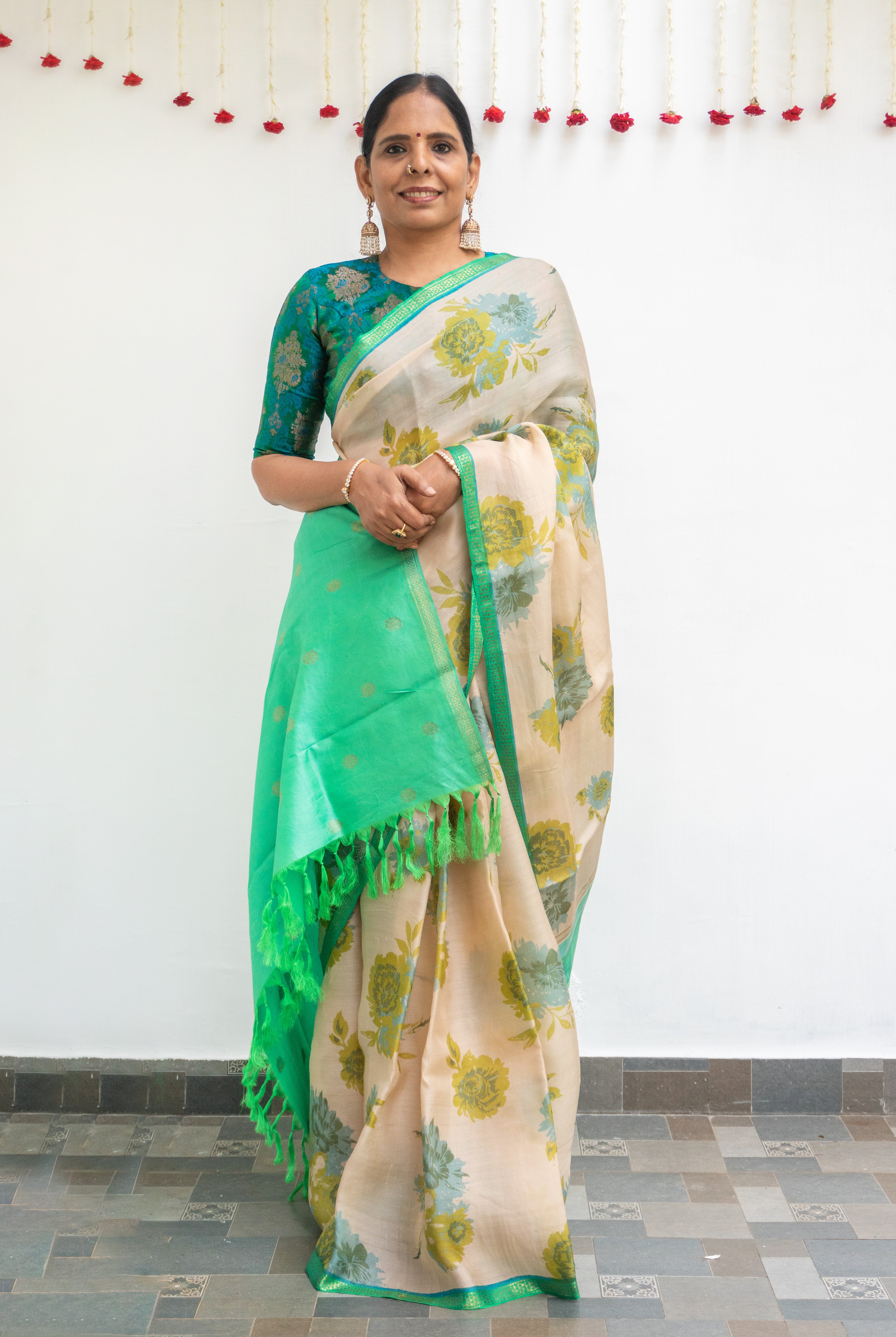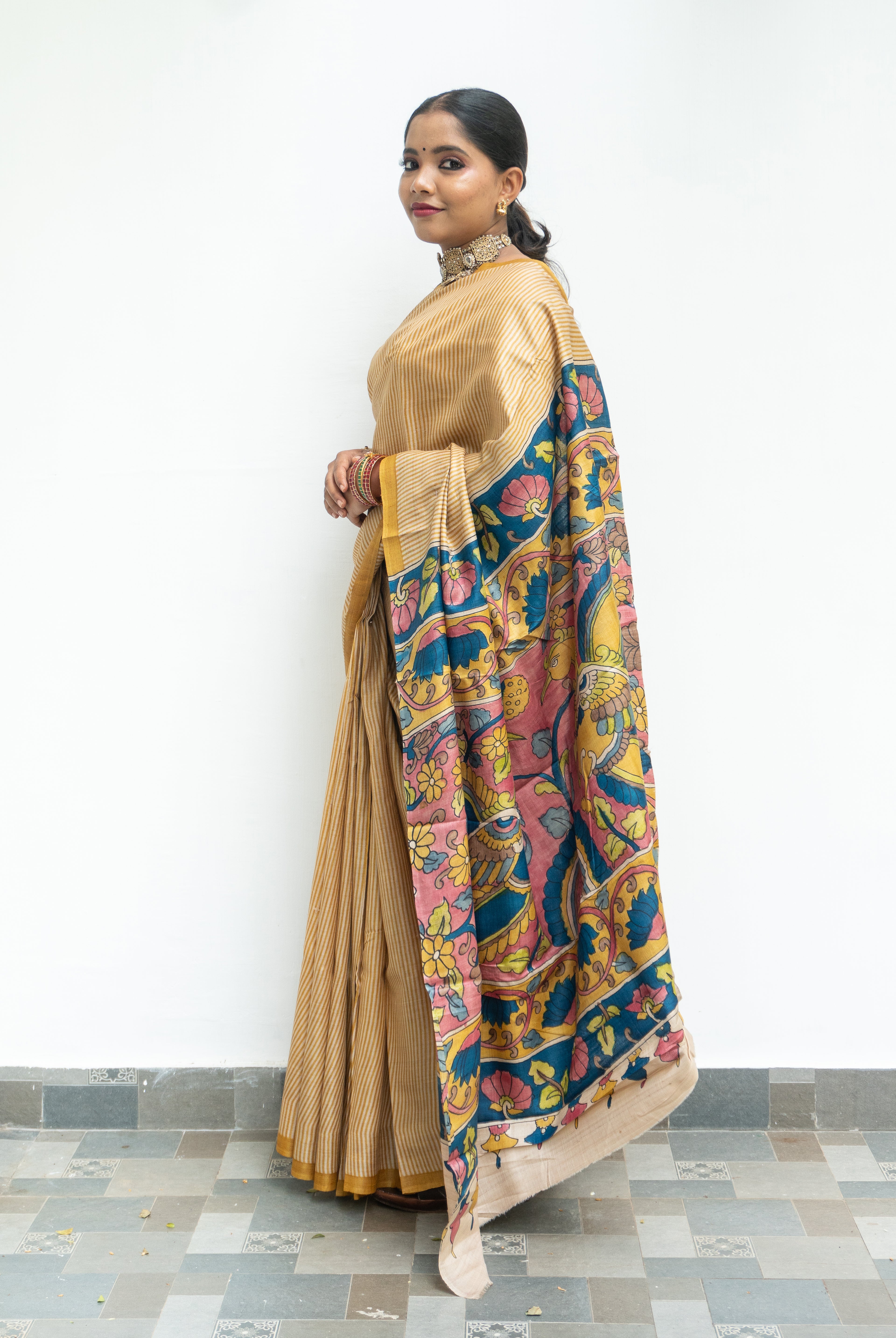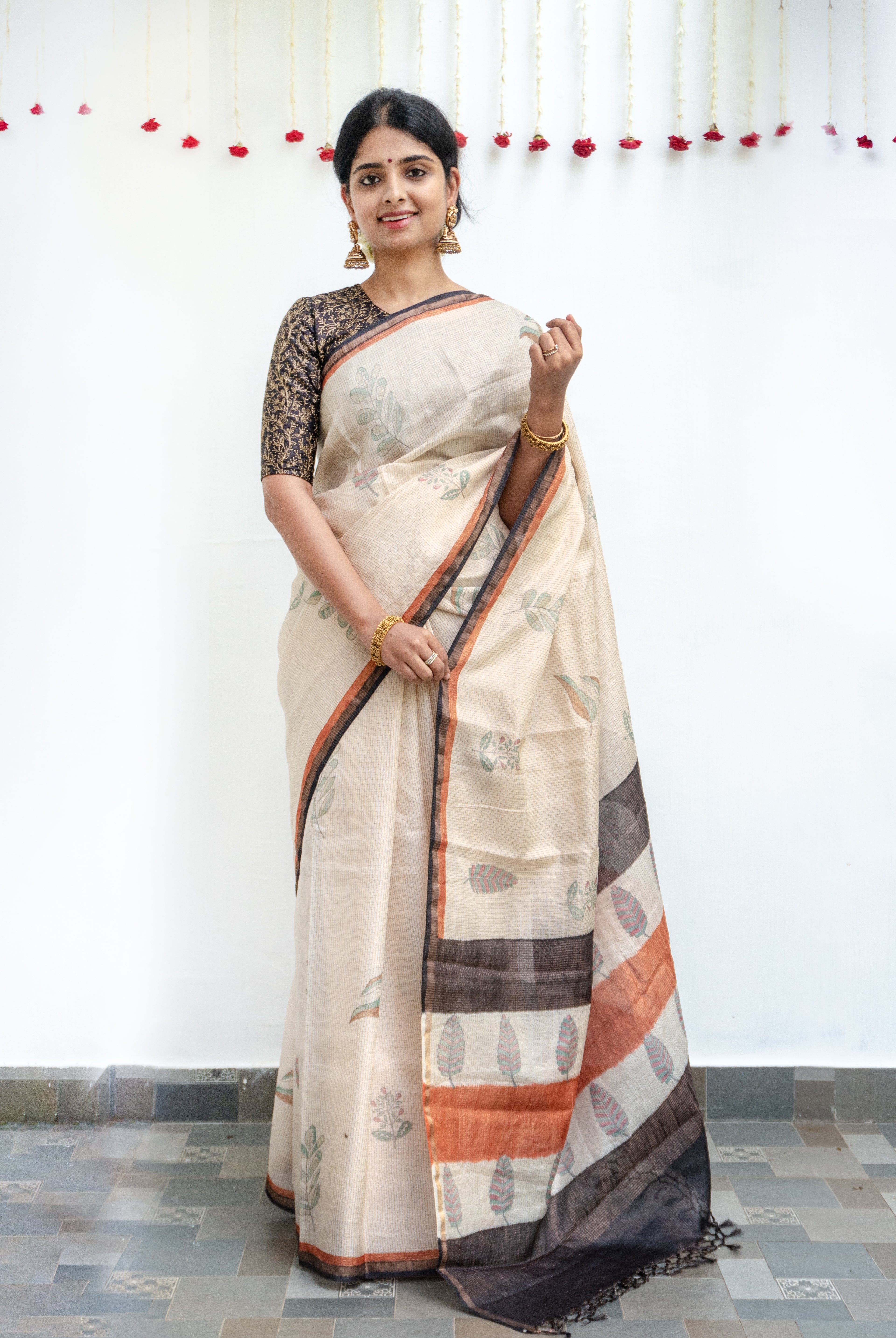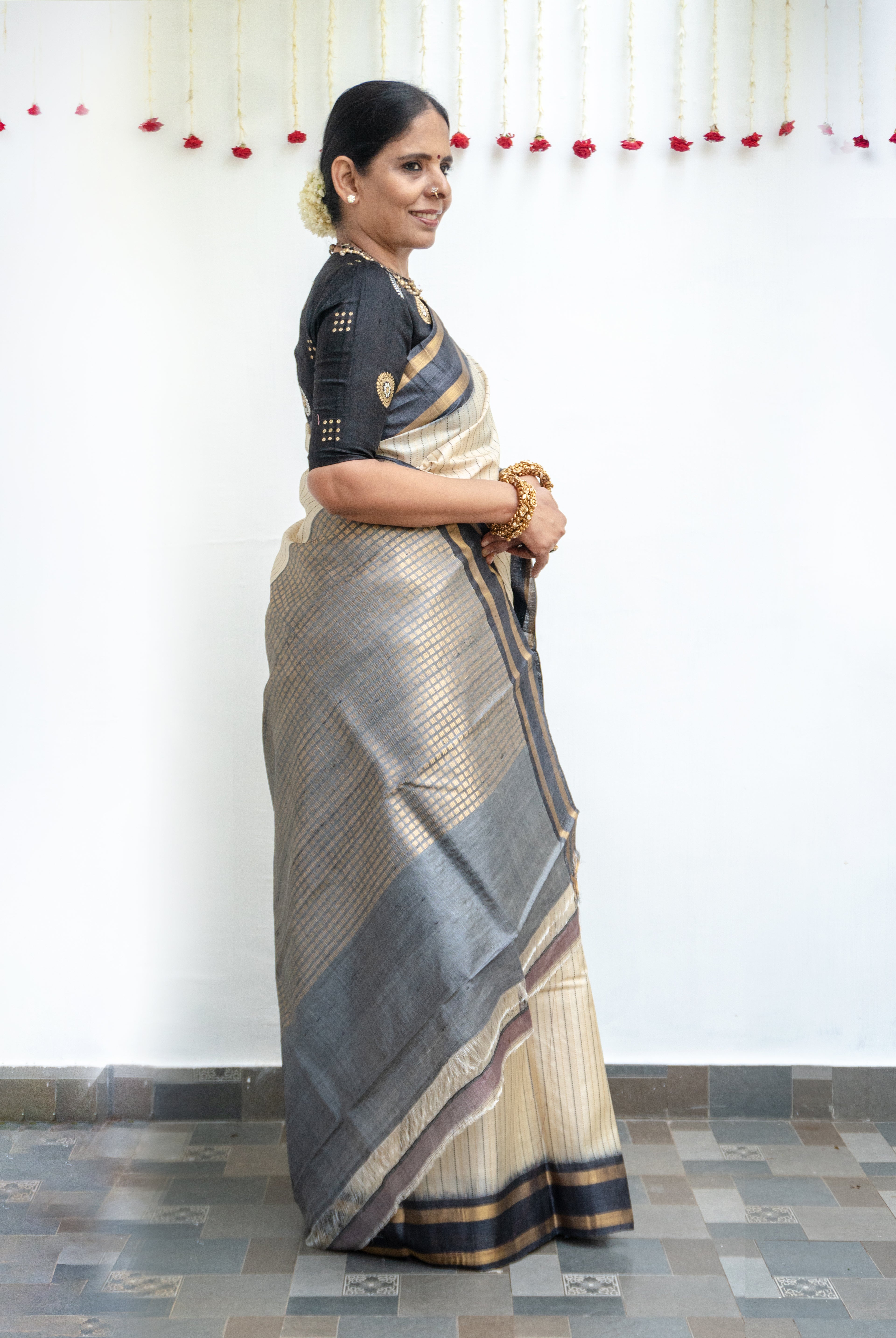 Perfect for festive occasions, weddings, and cultural celebrations, this floral tussar silk saree pairs effortlessly with traditional or contemporary blouses.