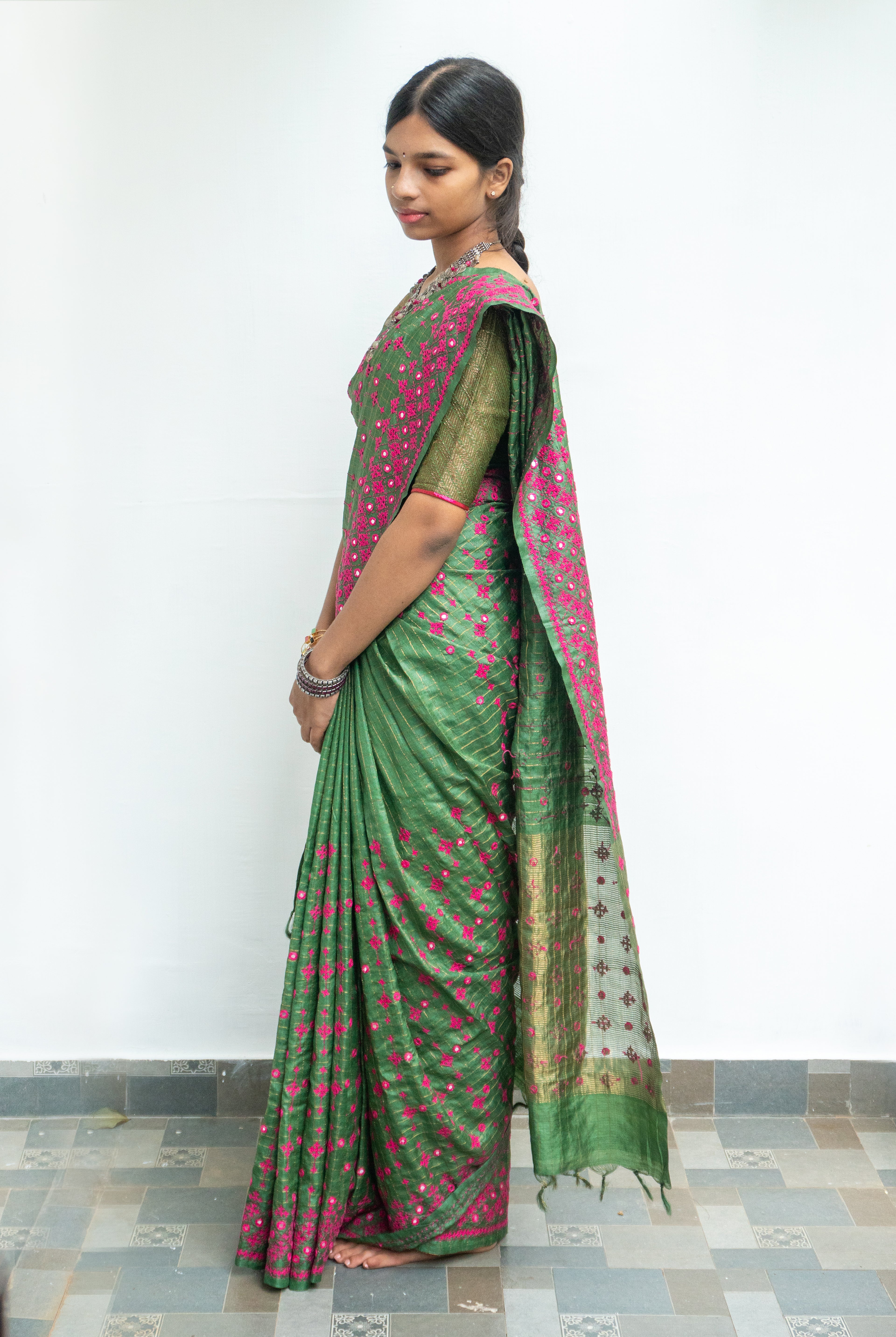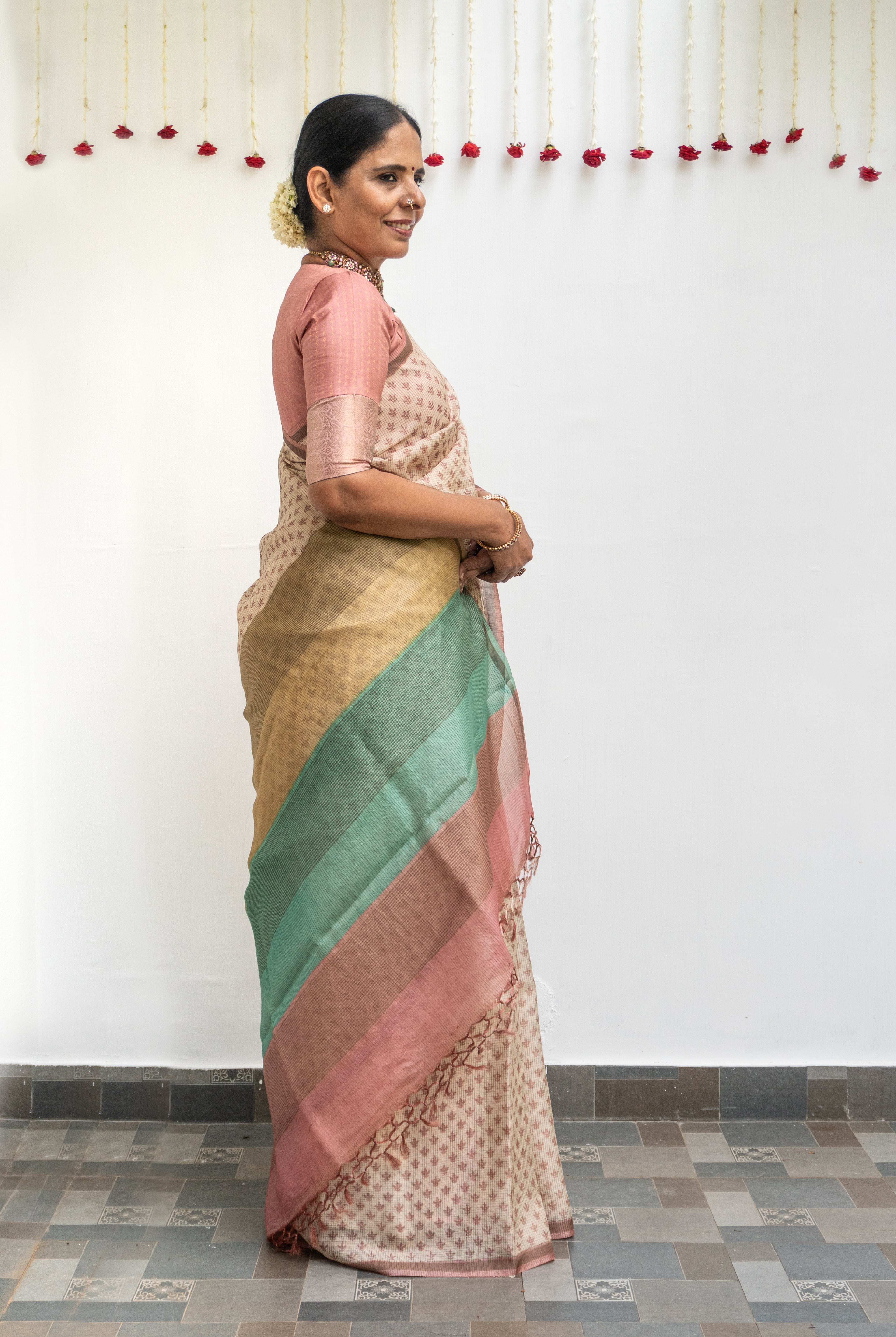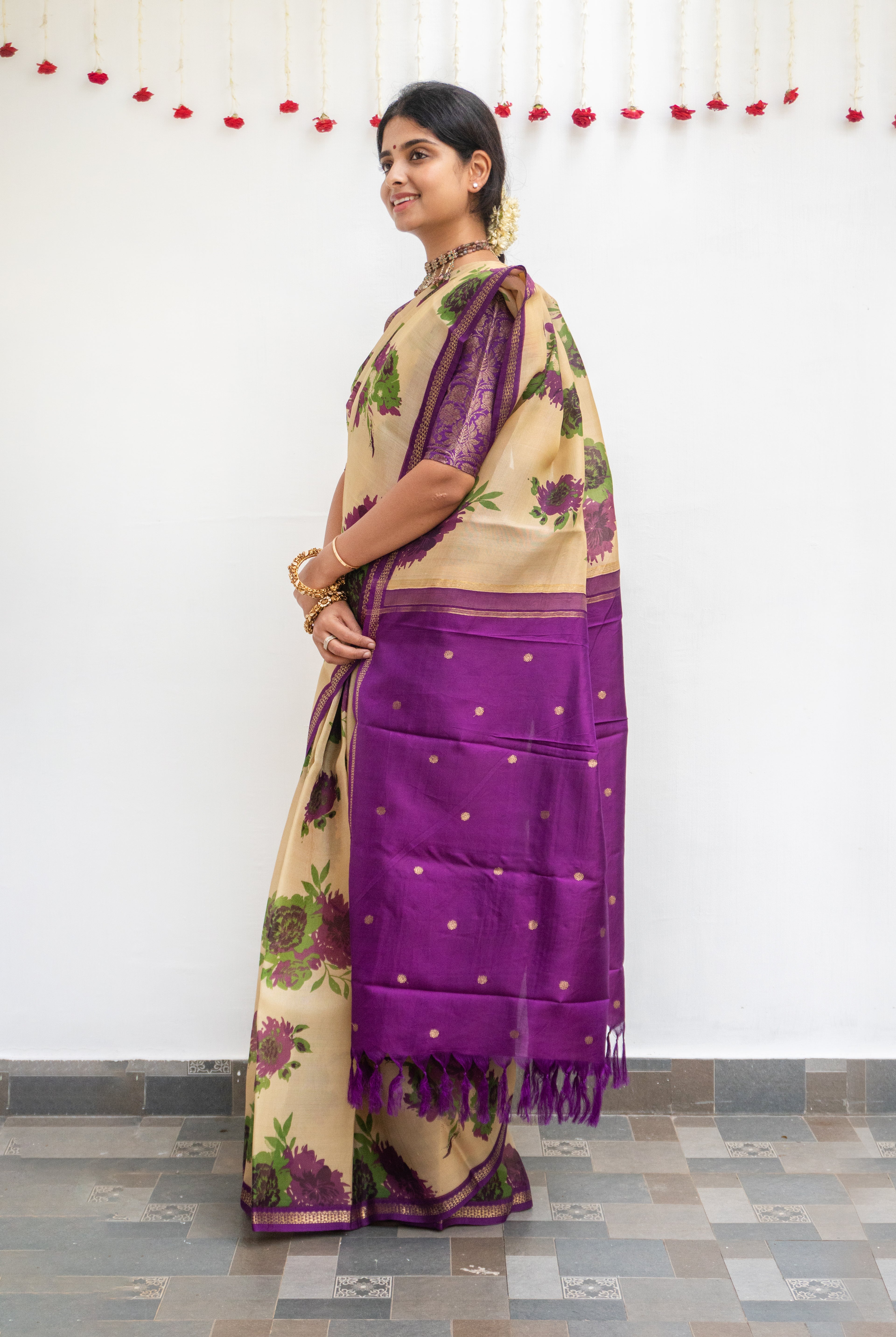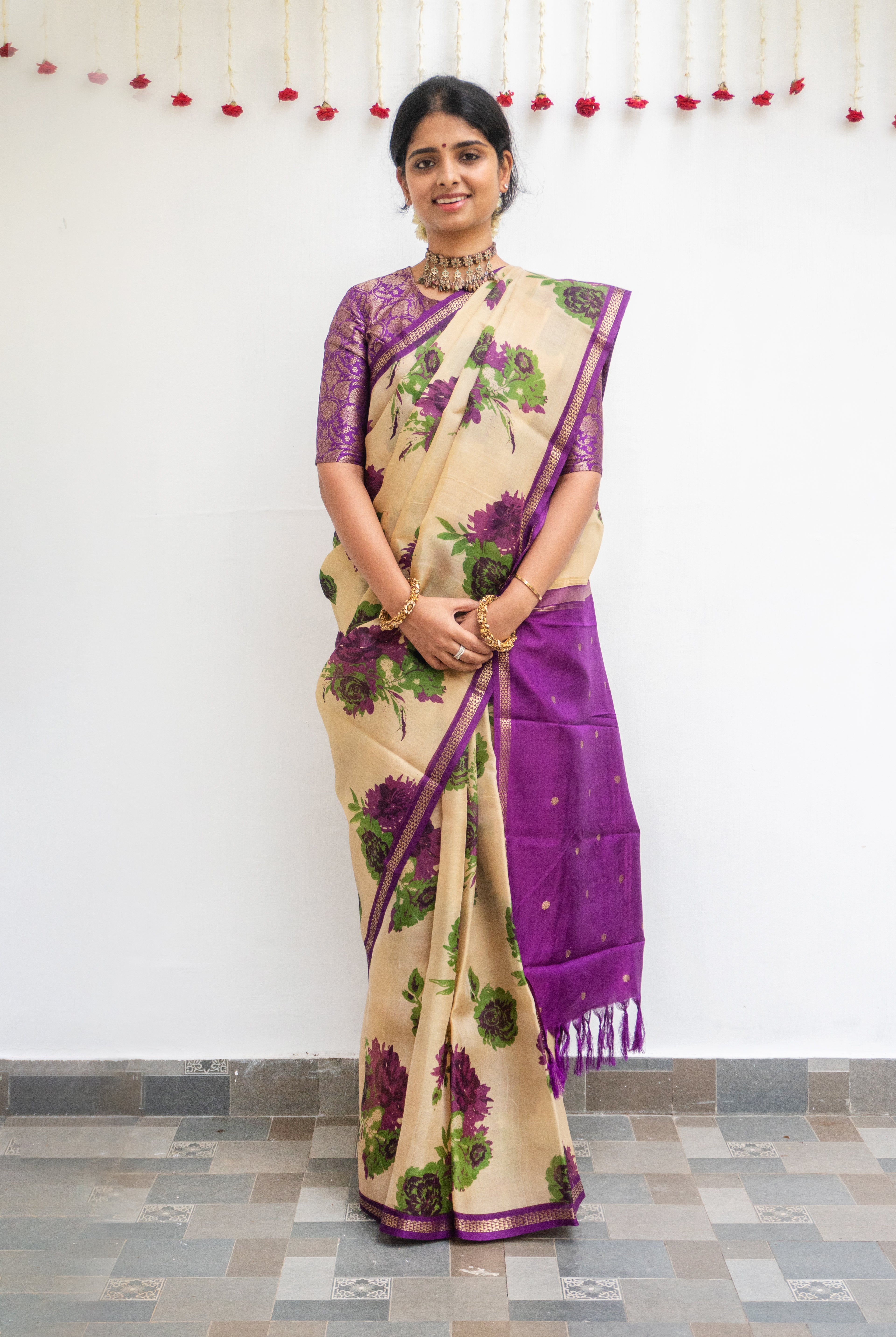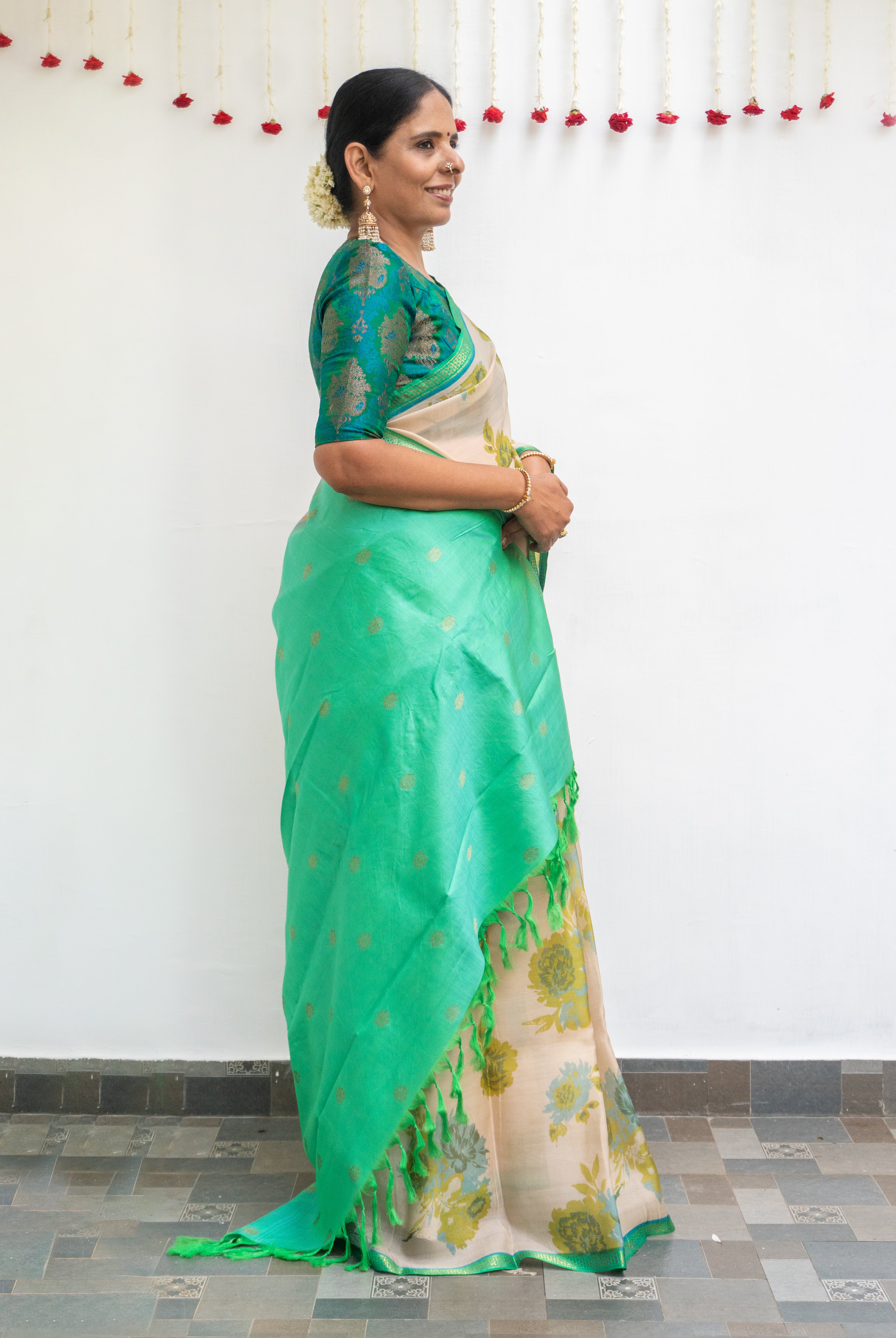 Perfect for festive occasions, weddings, and cultural celebrations, this floral tussar silk saree pairs effortlessly with traditional or contemporary blouses.