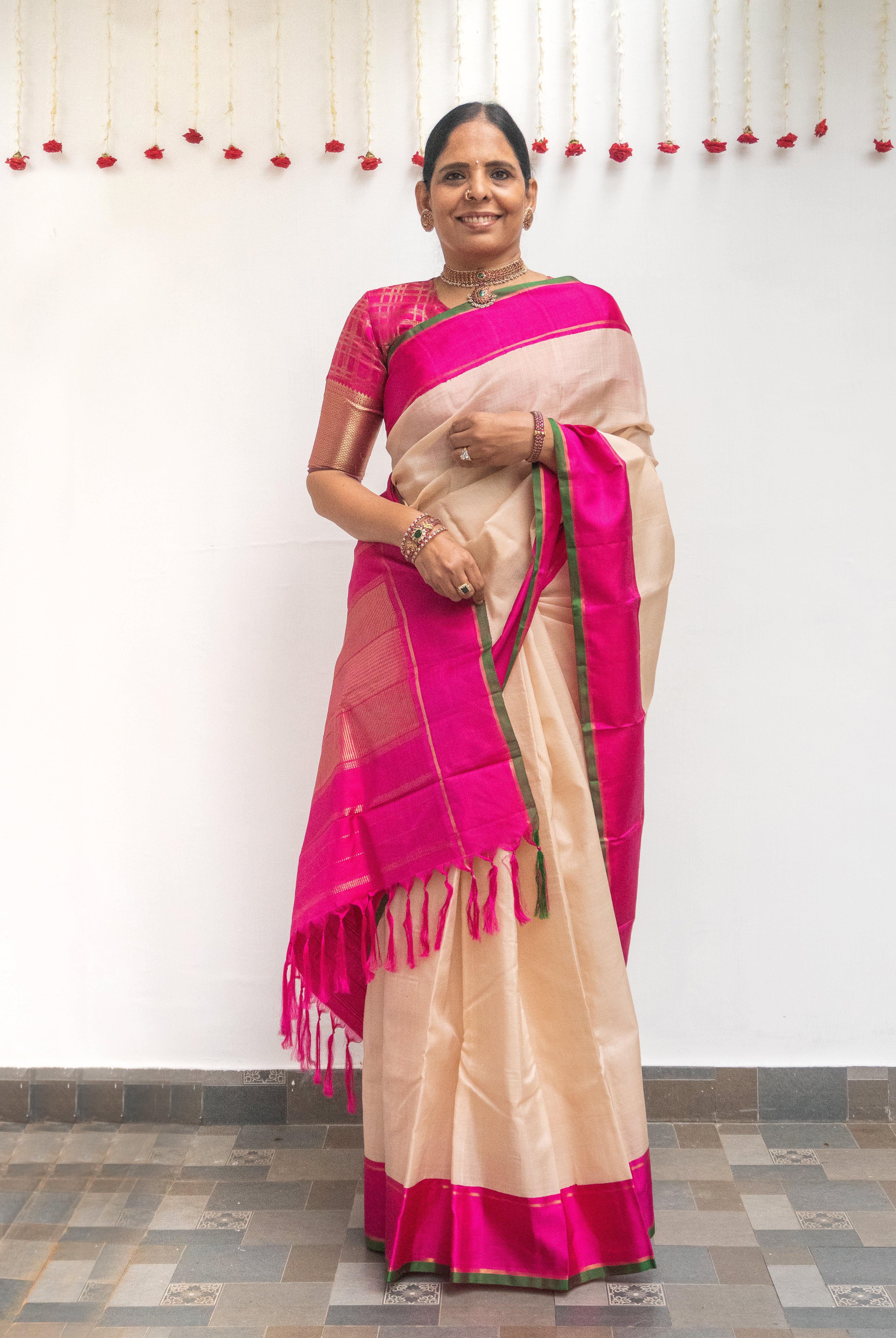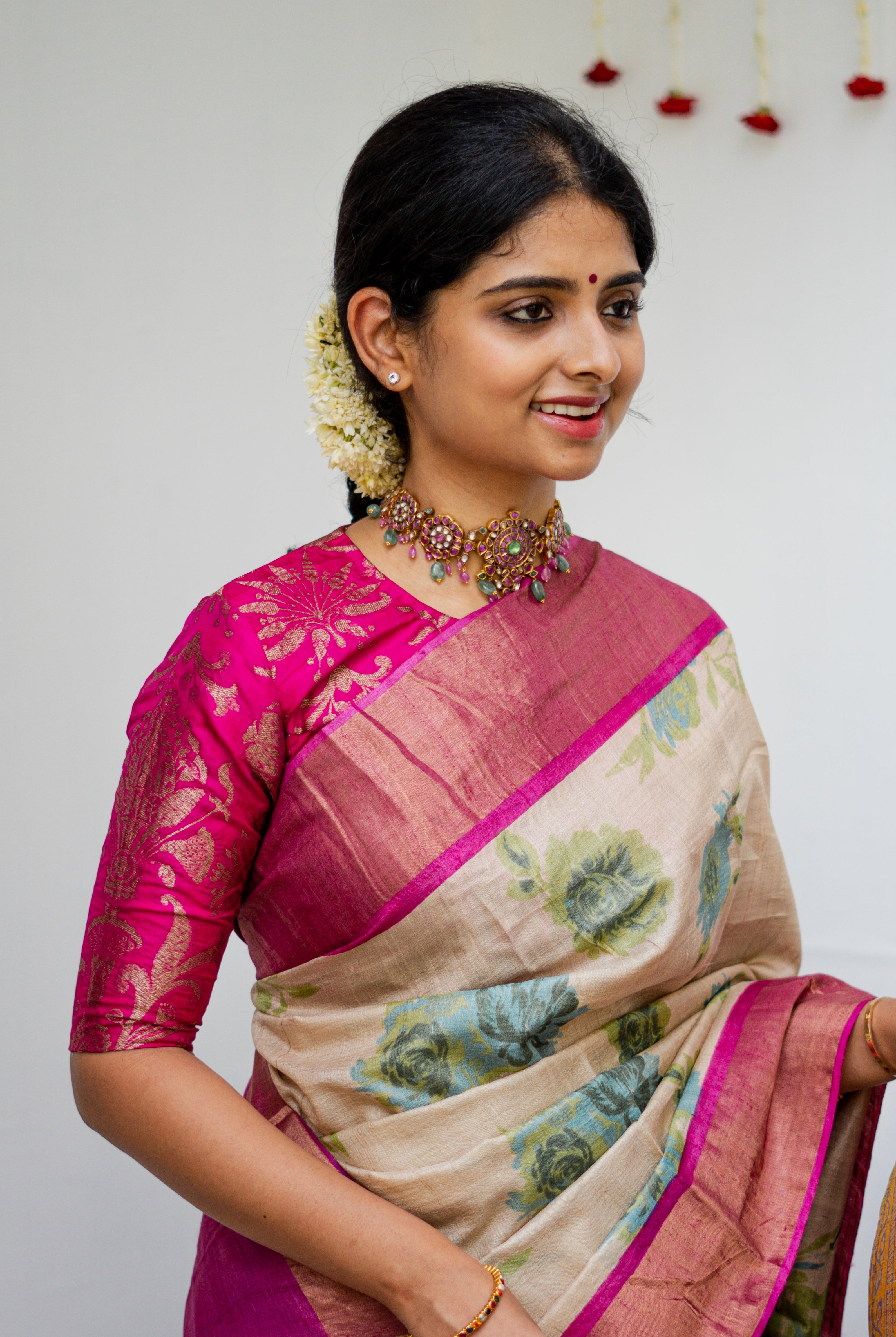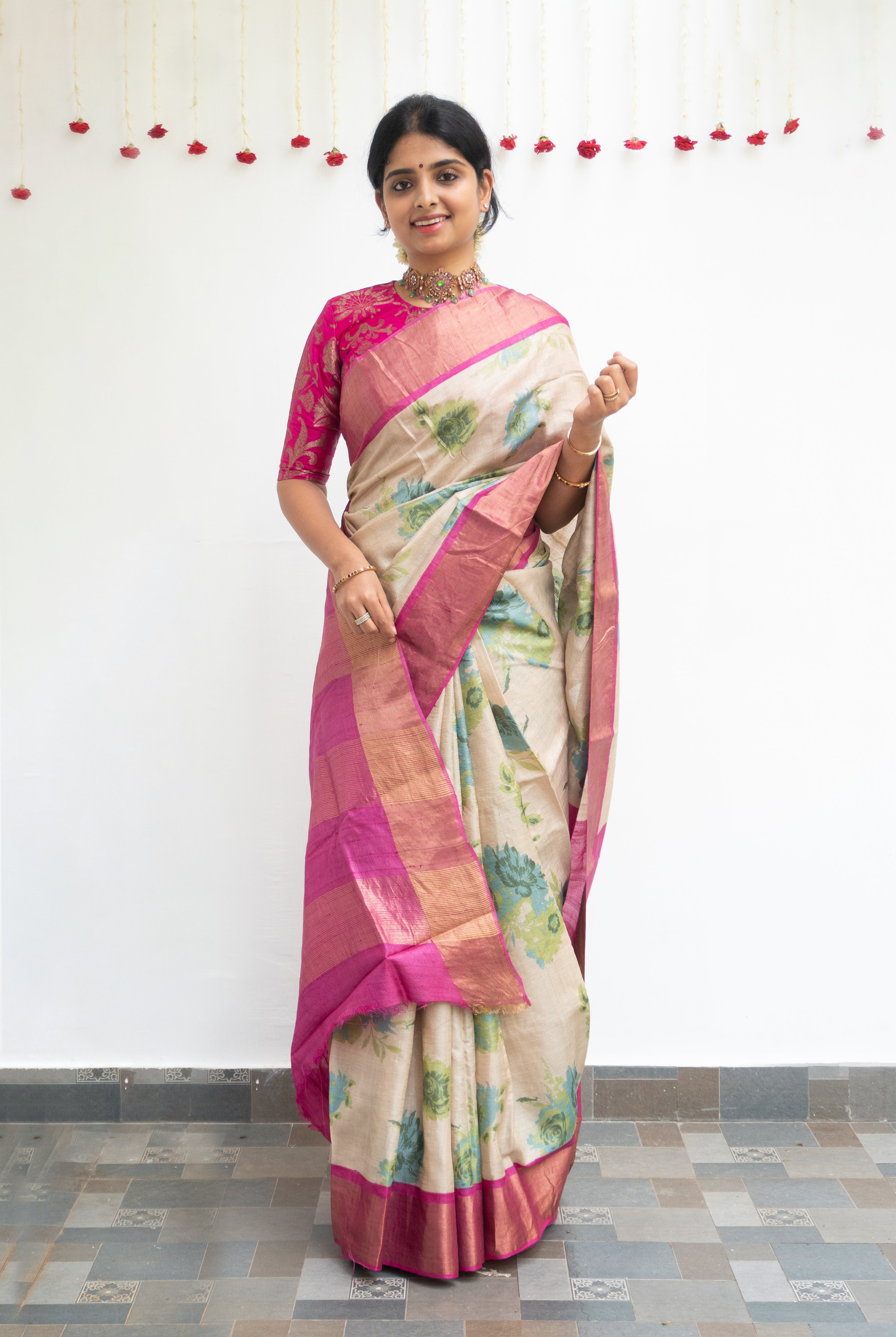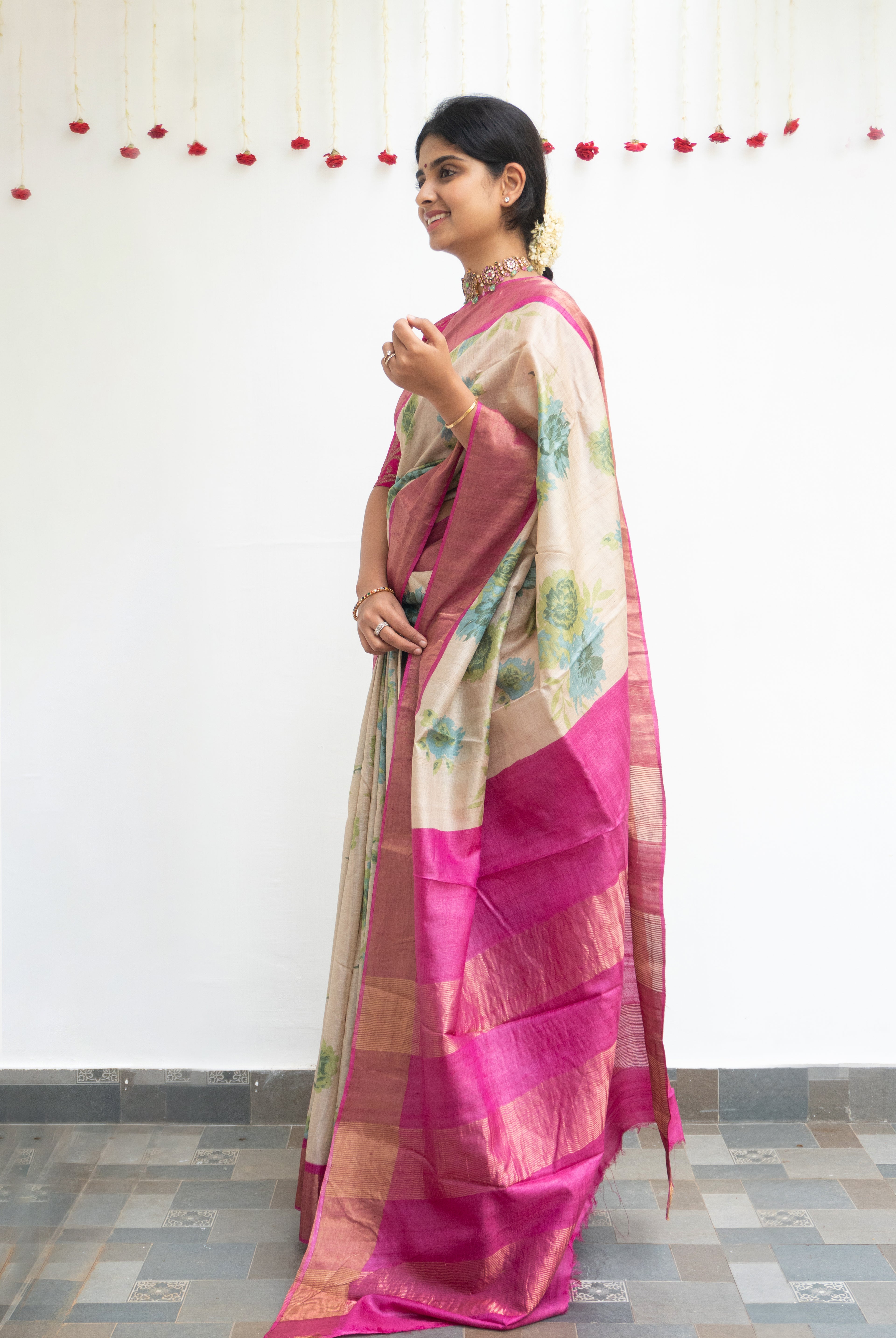 Cream Tussar silk saree, beautifully adorned with delicate floral motifs across the body. The striking Rani pink tissue border adds a regal charm, enhancing the saree with a touch of shimmer and elegance.