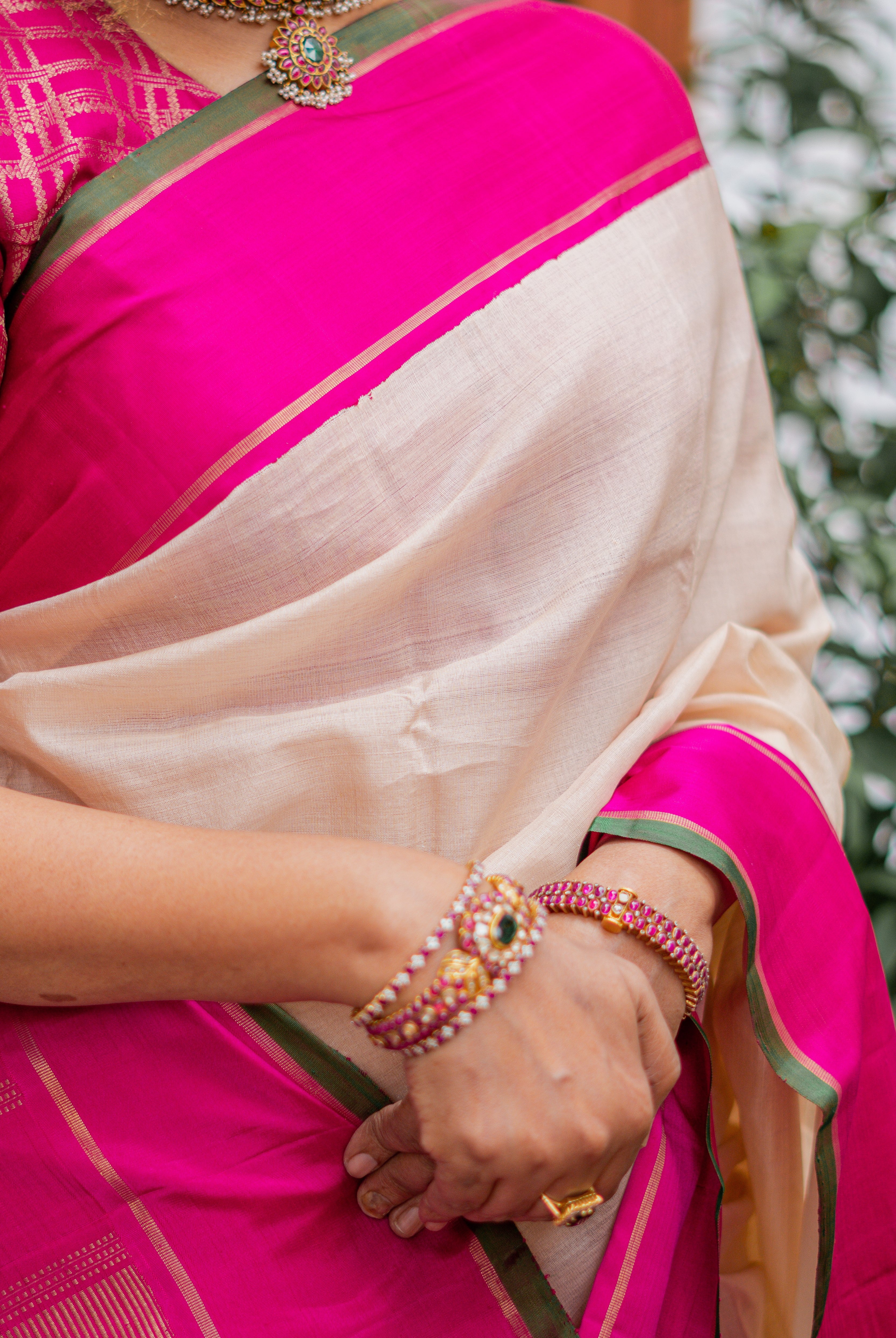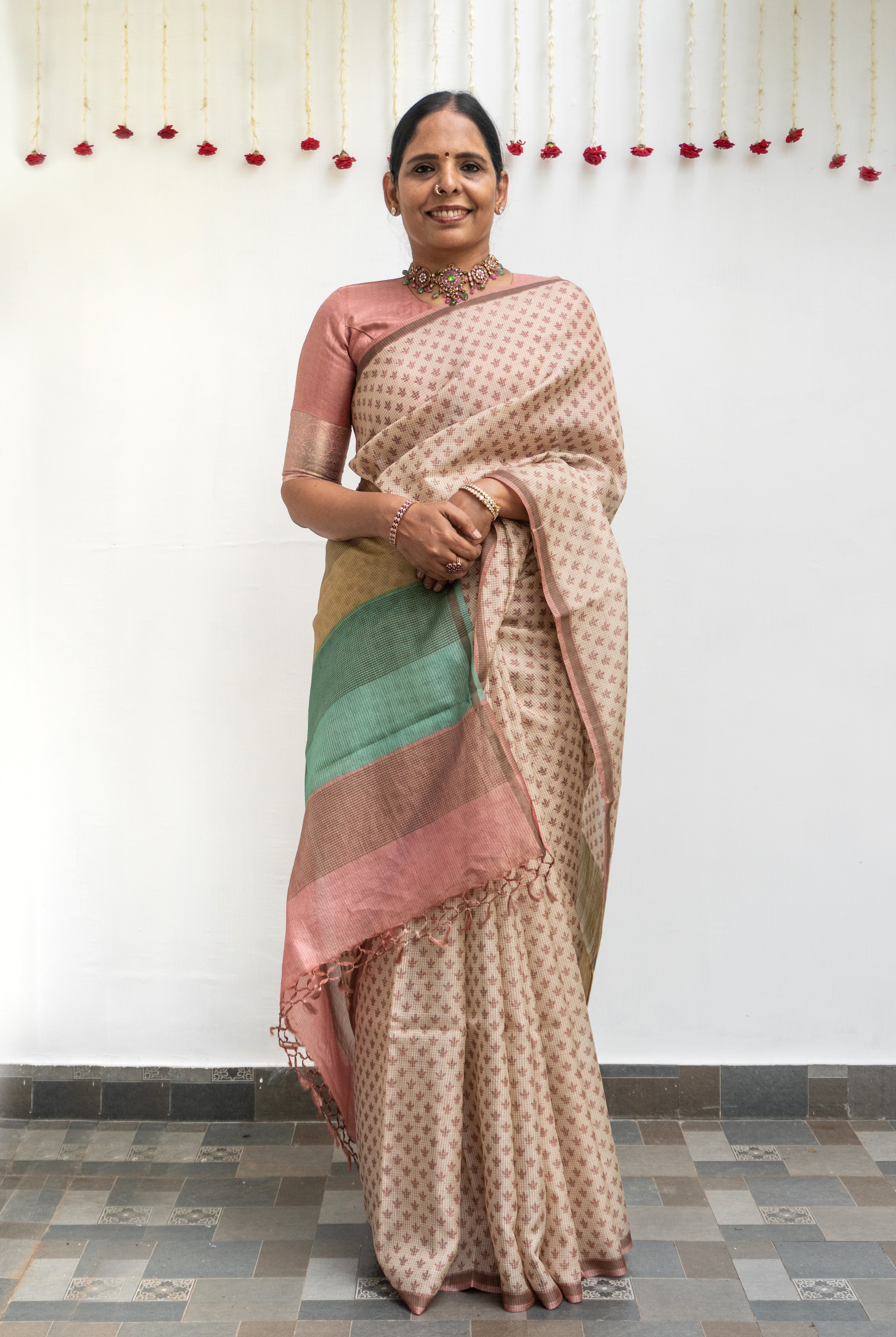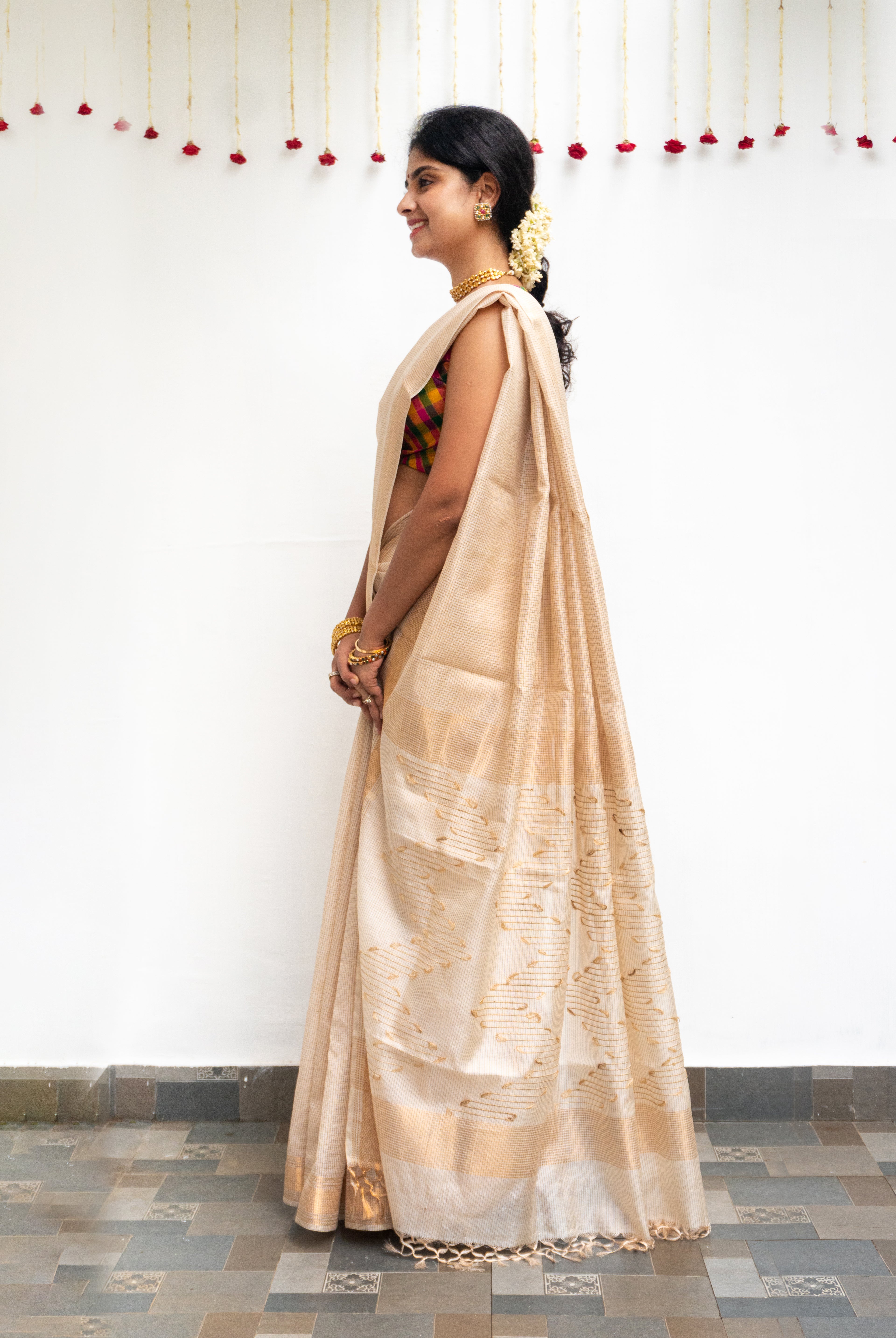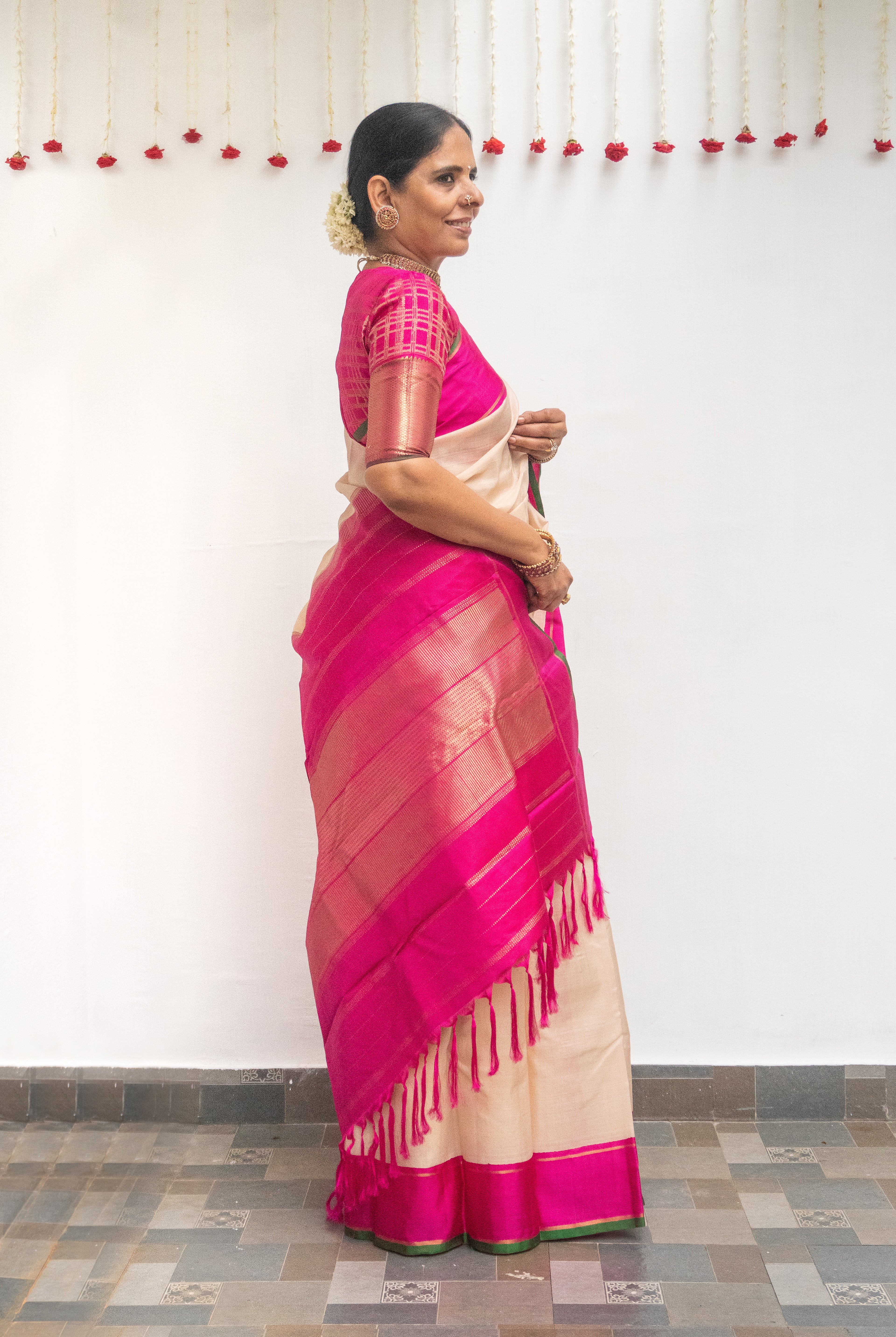 Cream Tussar silk saree, beautifully adorned with delicate floral motifs across the body. The striking Rani pink tissue border adds a regal charm, enhancing the saree with a touch of shimmer and elegance.