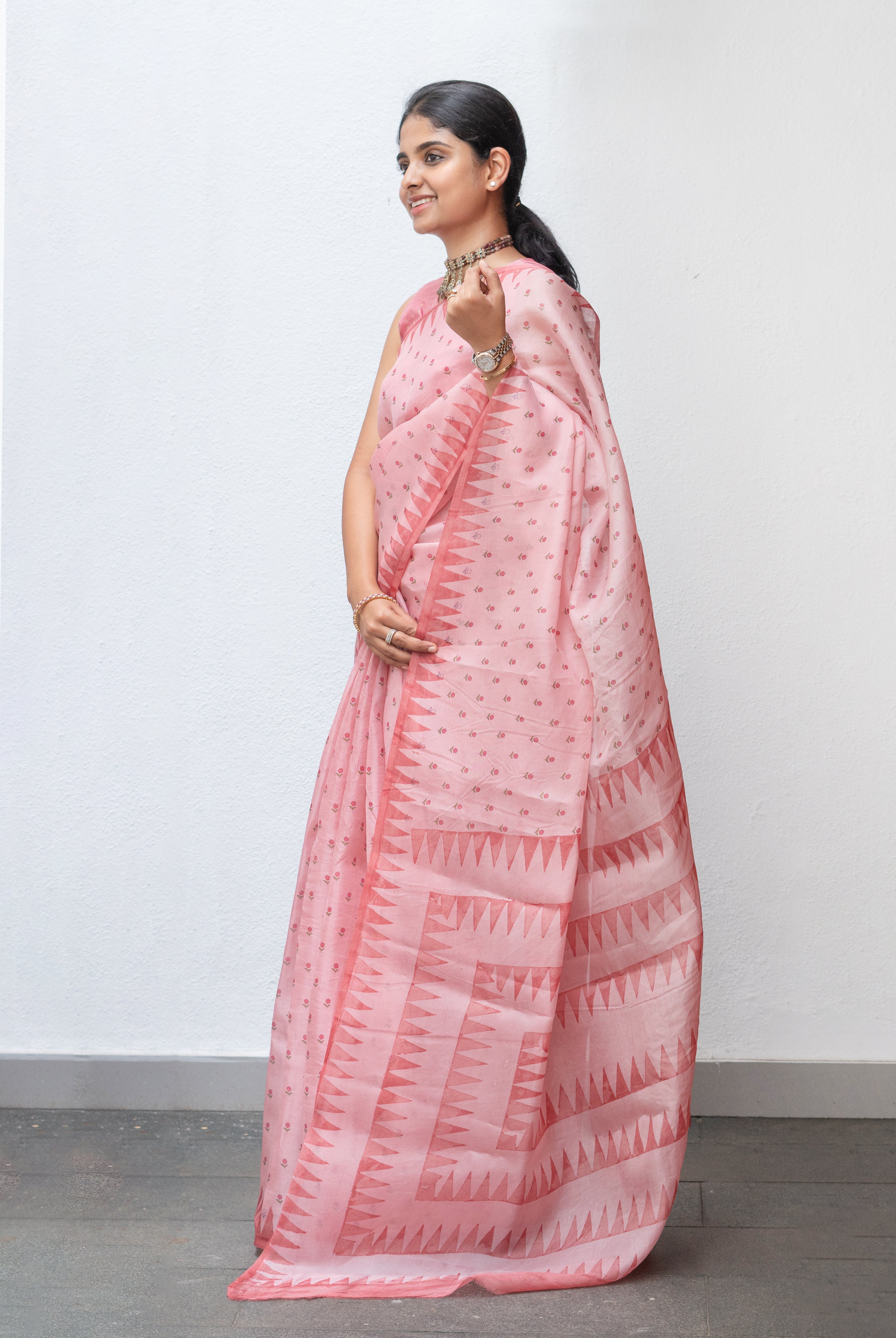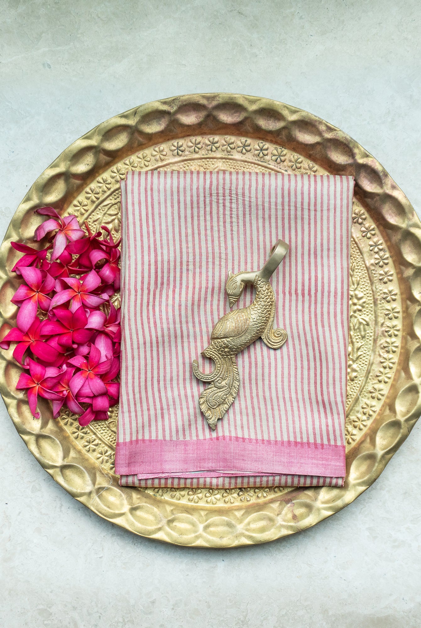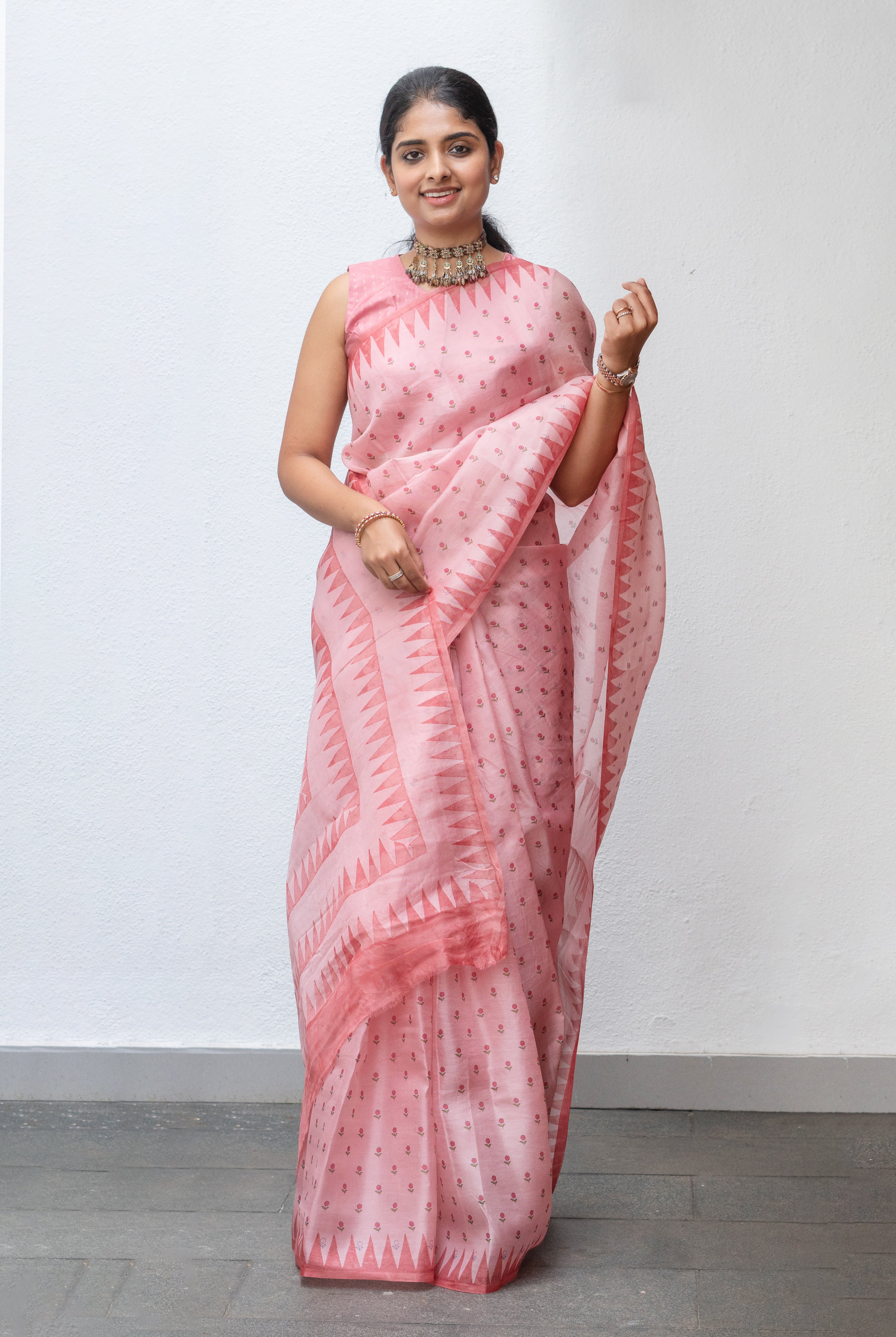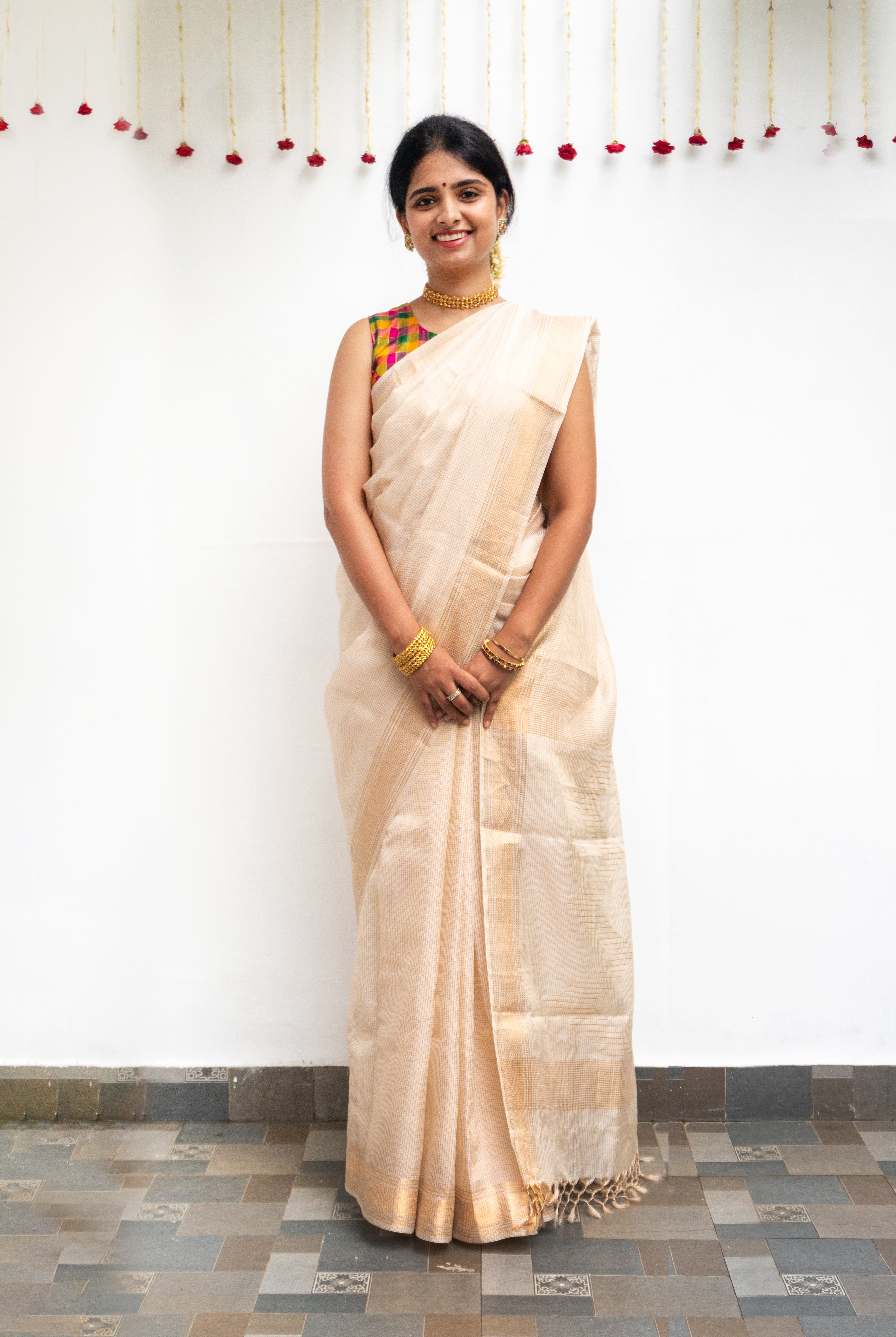 Cream Tussar silk saree, beautifully adorned with delicate floral motifs across the body. The striking Rani pink tissue border adds a regal charm, enhancing the saree with a touch of shimmer and elegance.