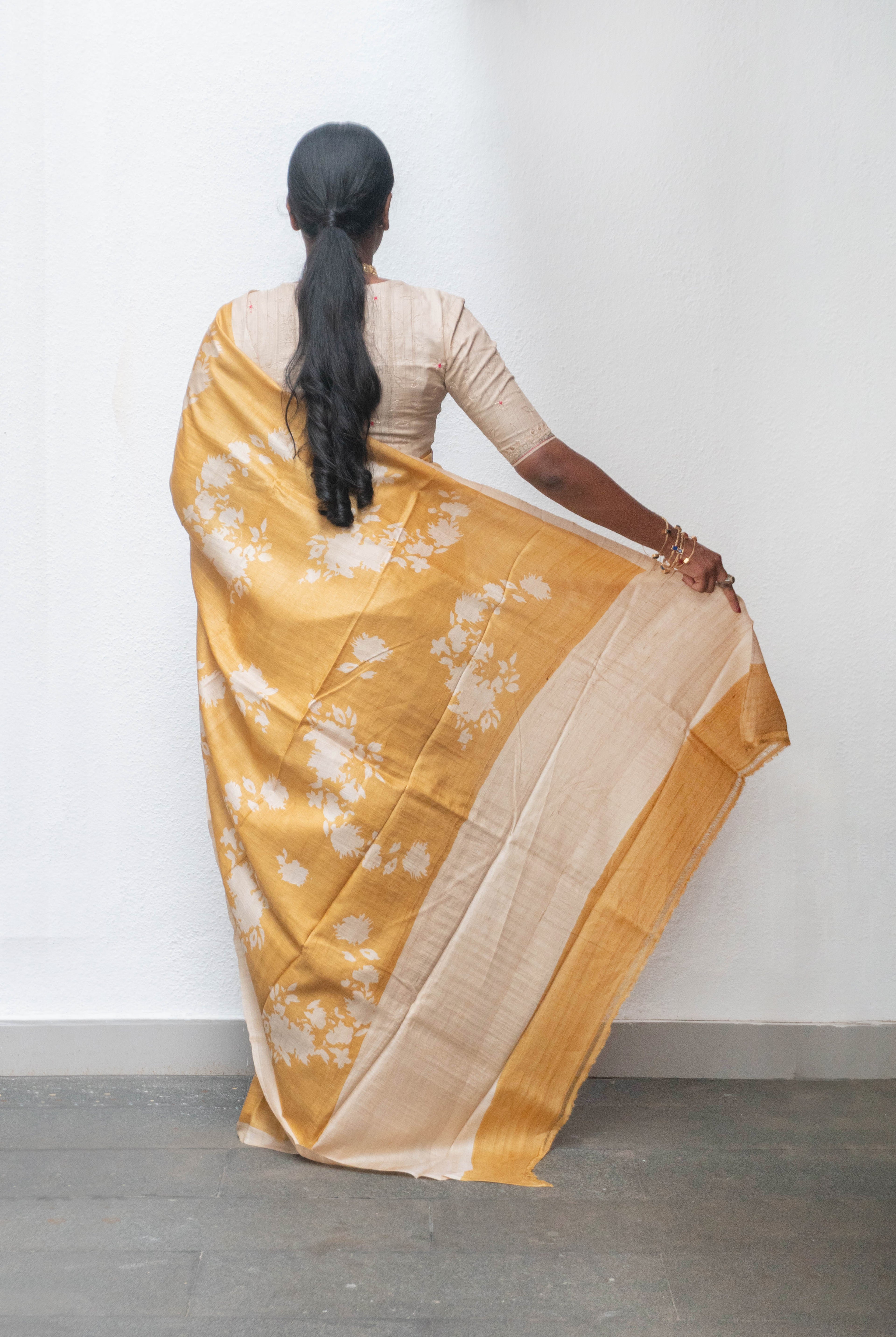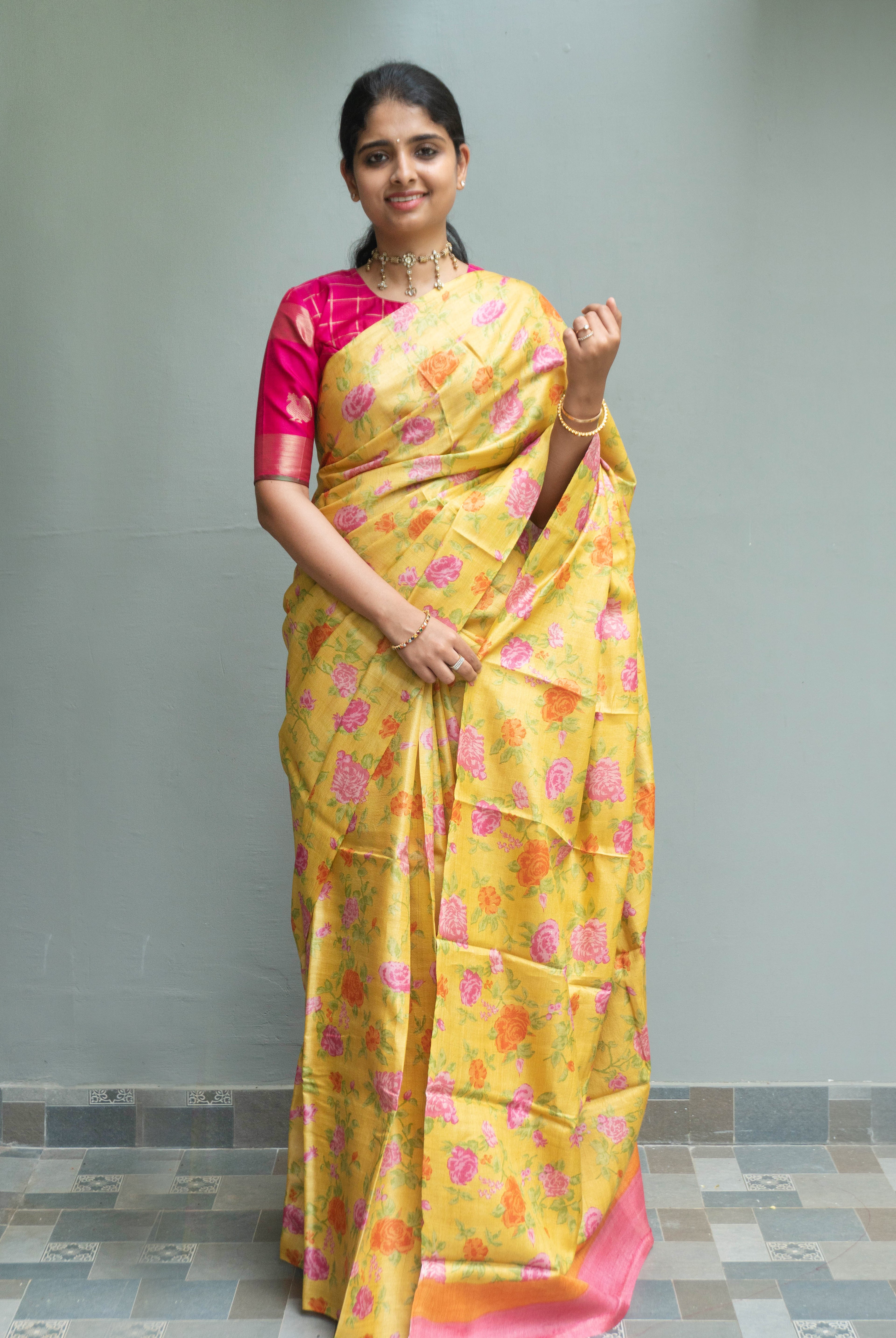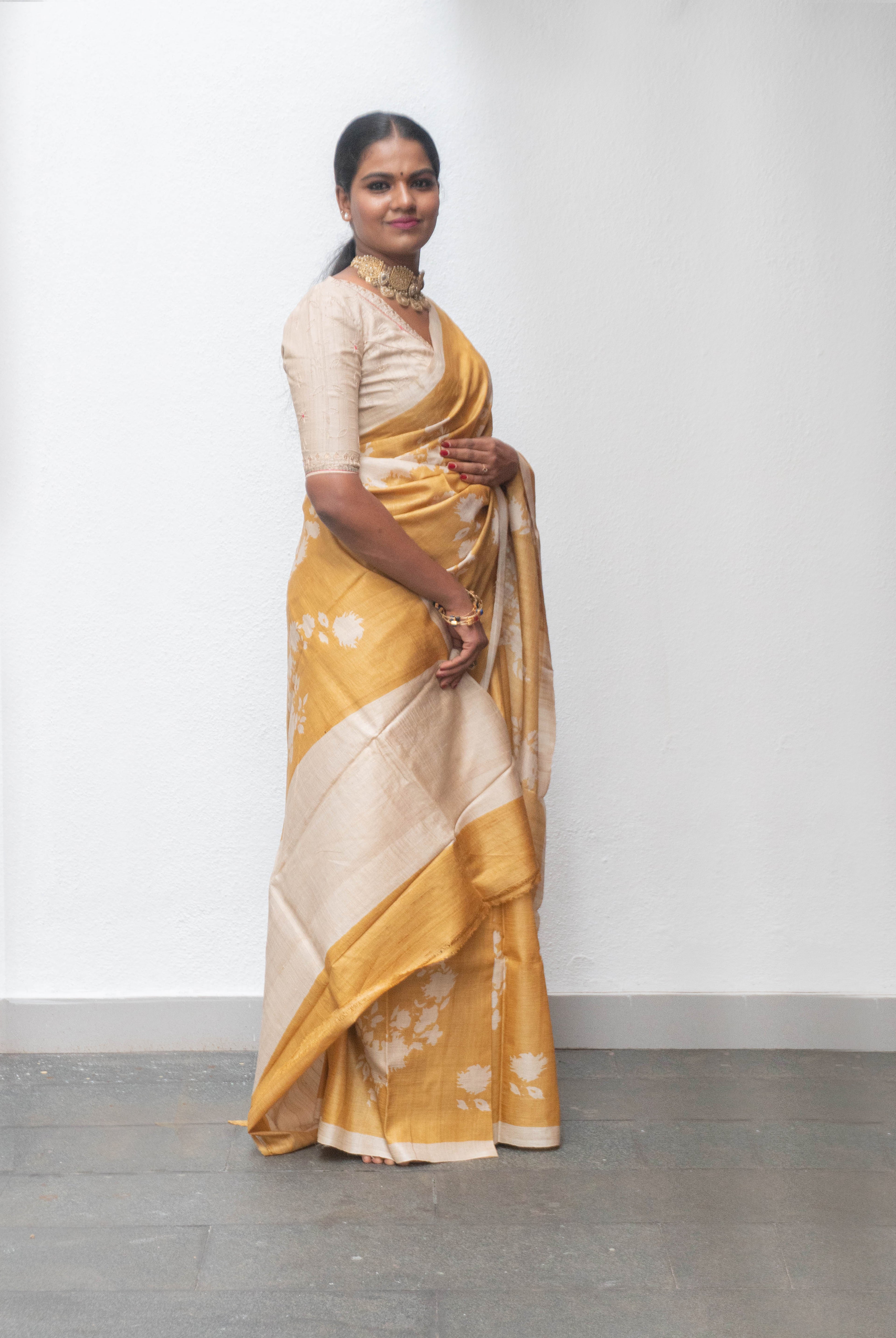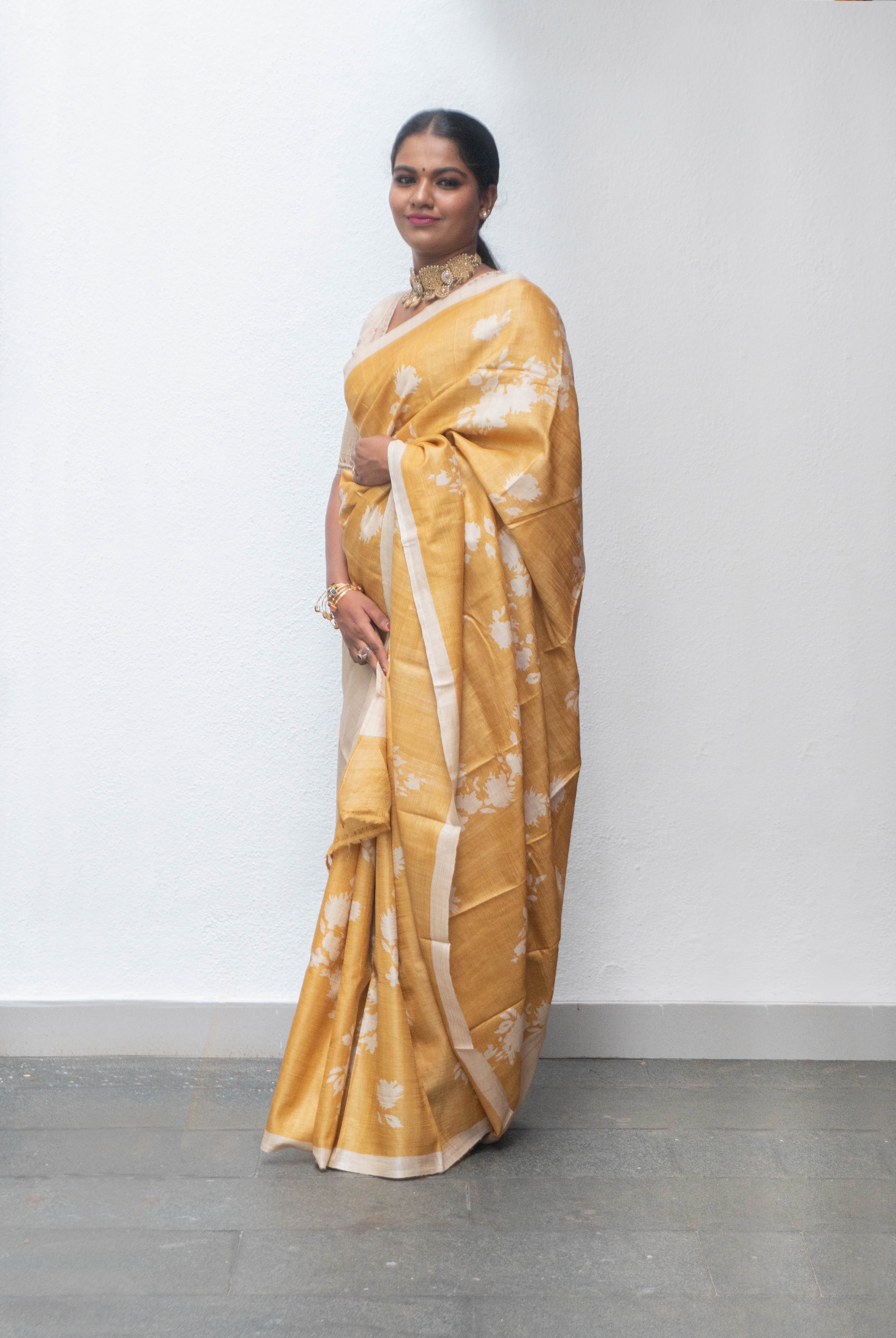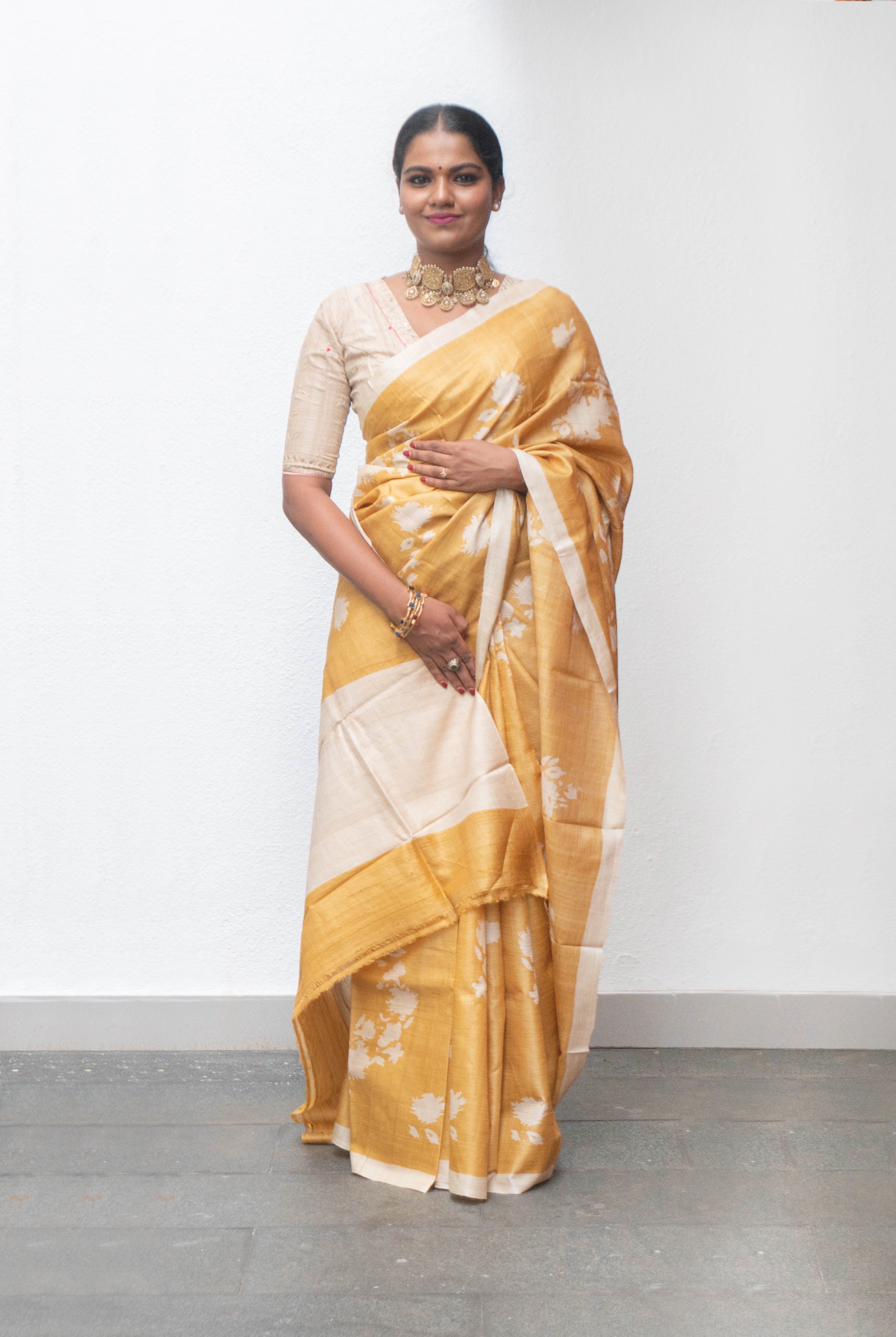 Perfect for festive occasions, weddings, and cultural celebrations, this floral tussar silk saree pairs effortlessly with traditional or contemporary blouses.