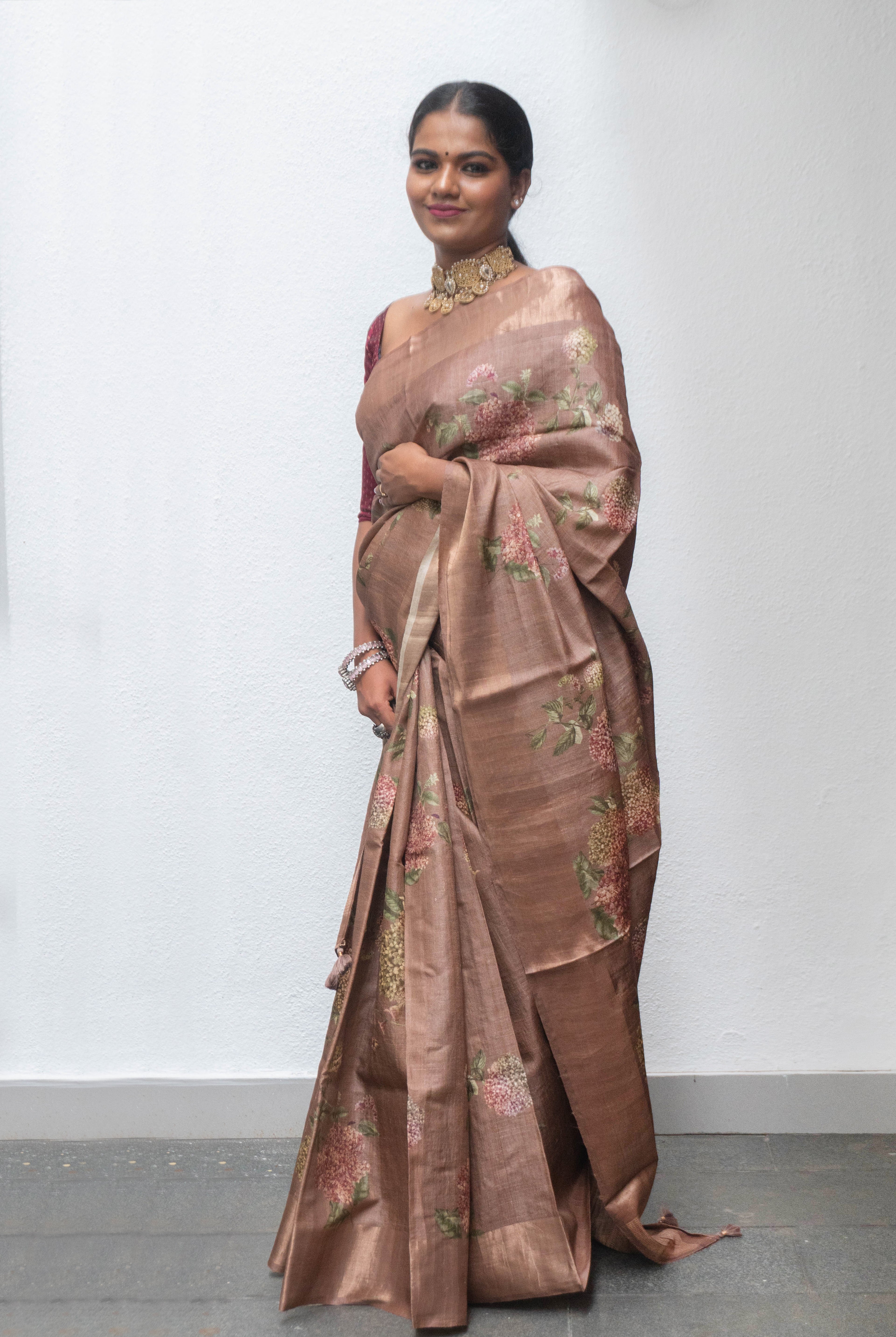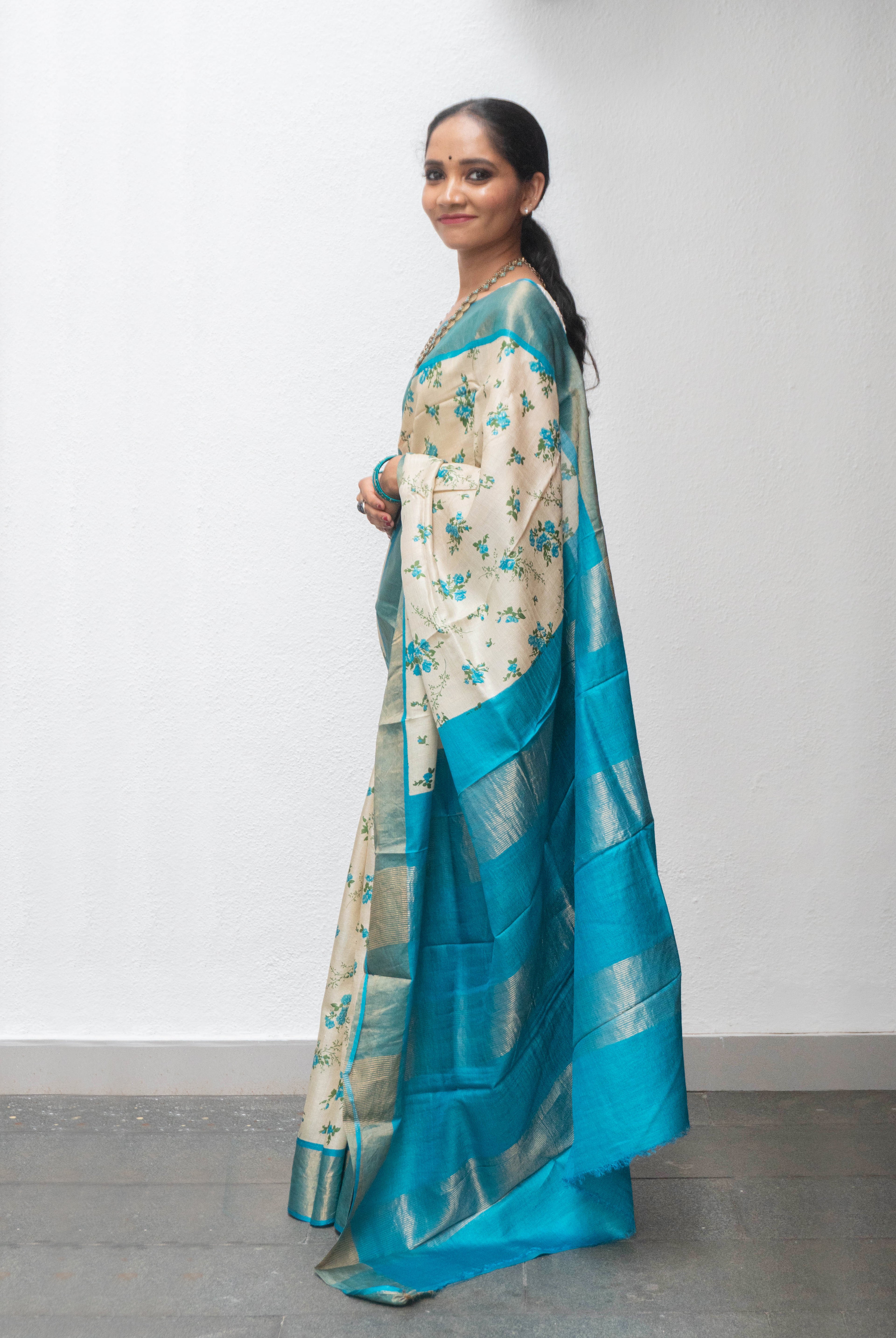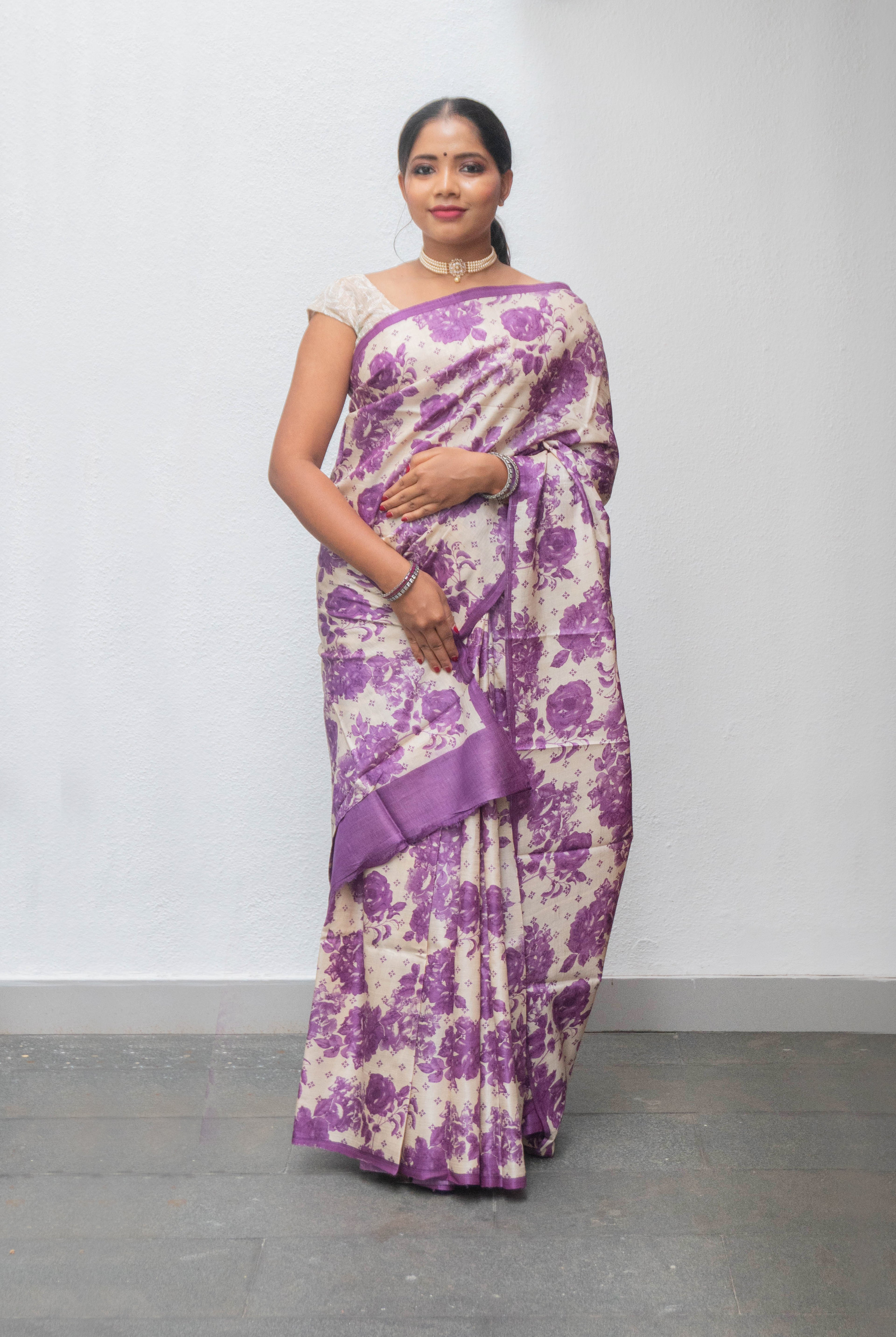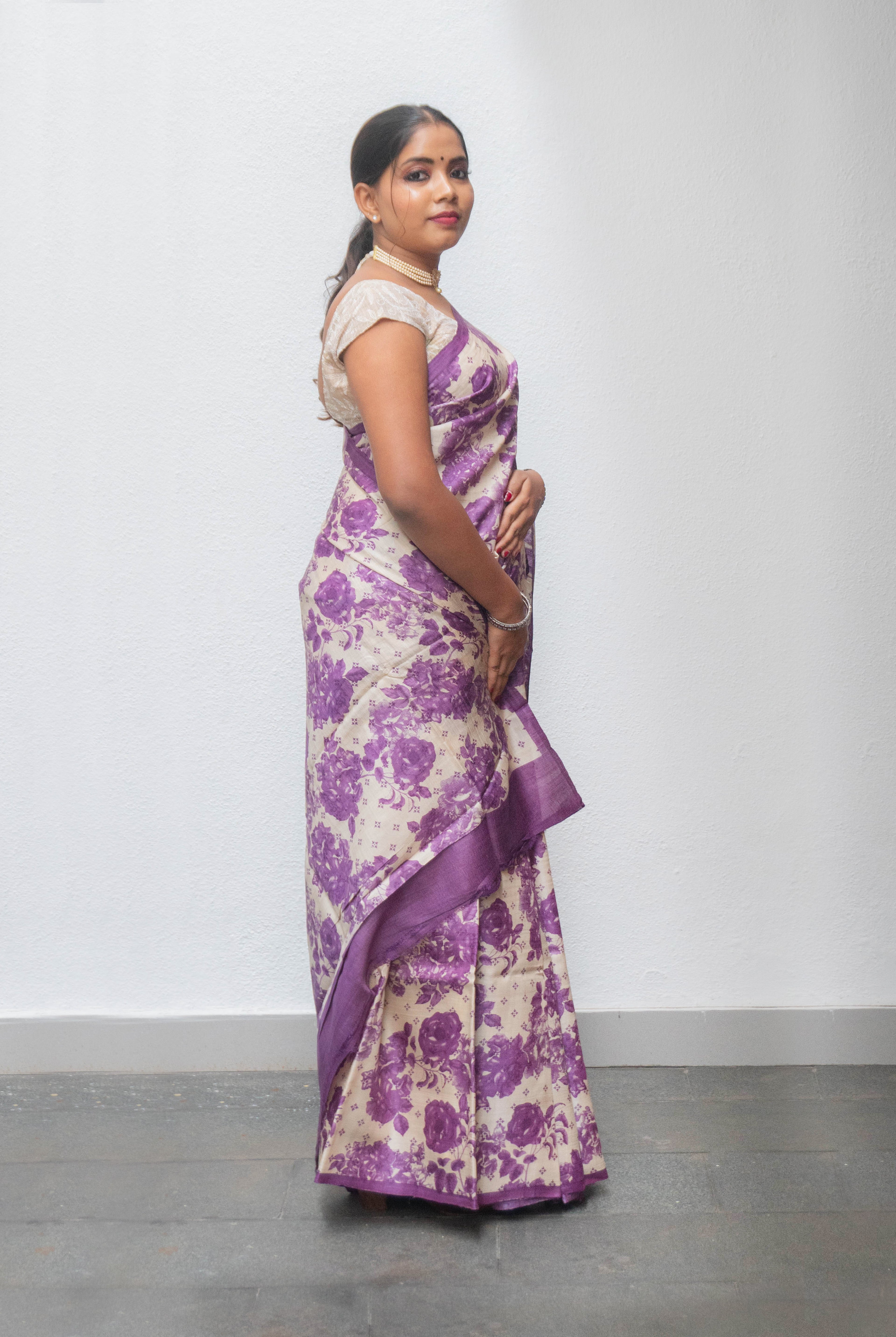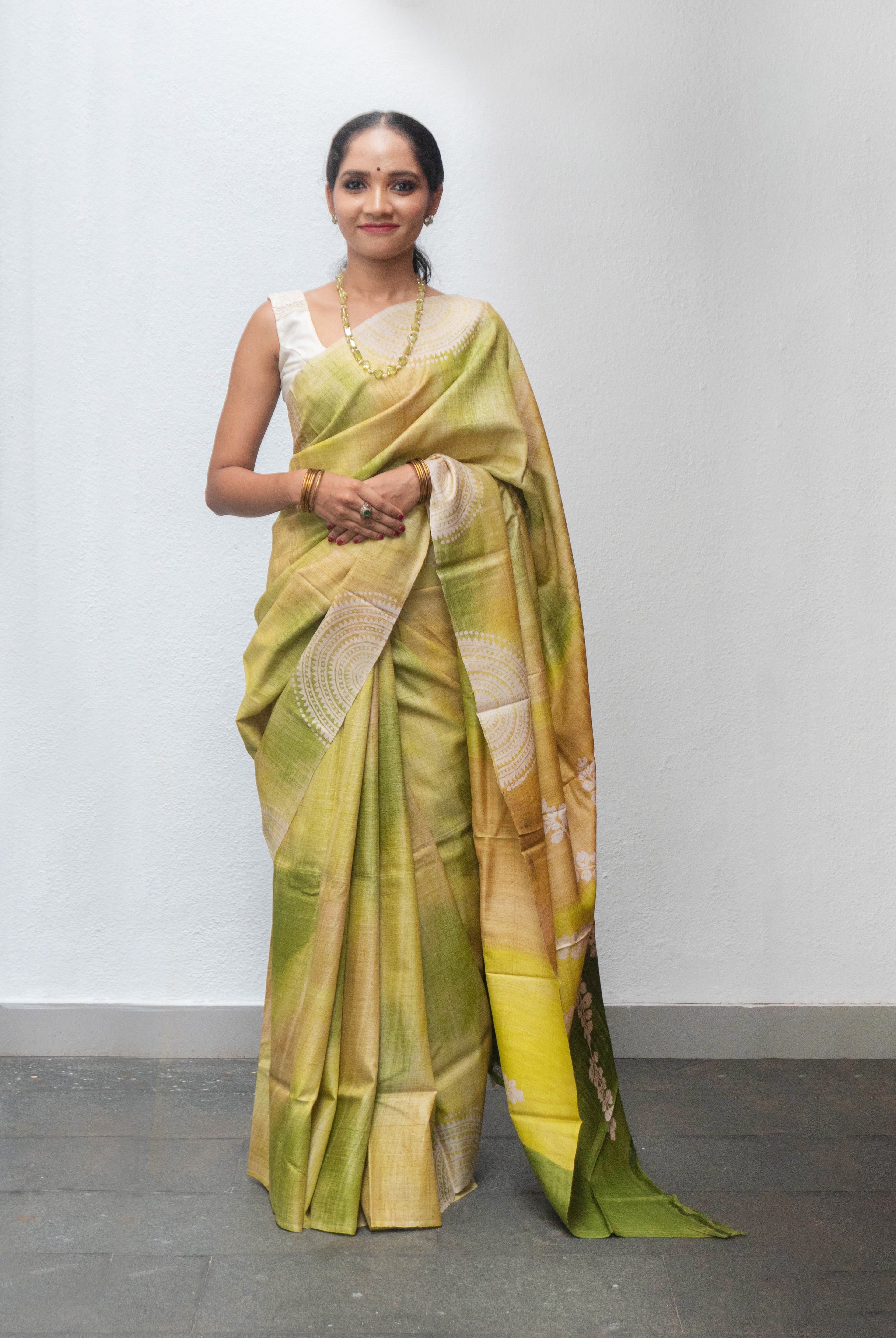 Perfect for festive occasions, weddings, and cultural celebrations, this floral tussar silk saree pairs effortlessly with traditional or contemporary blouses.