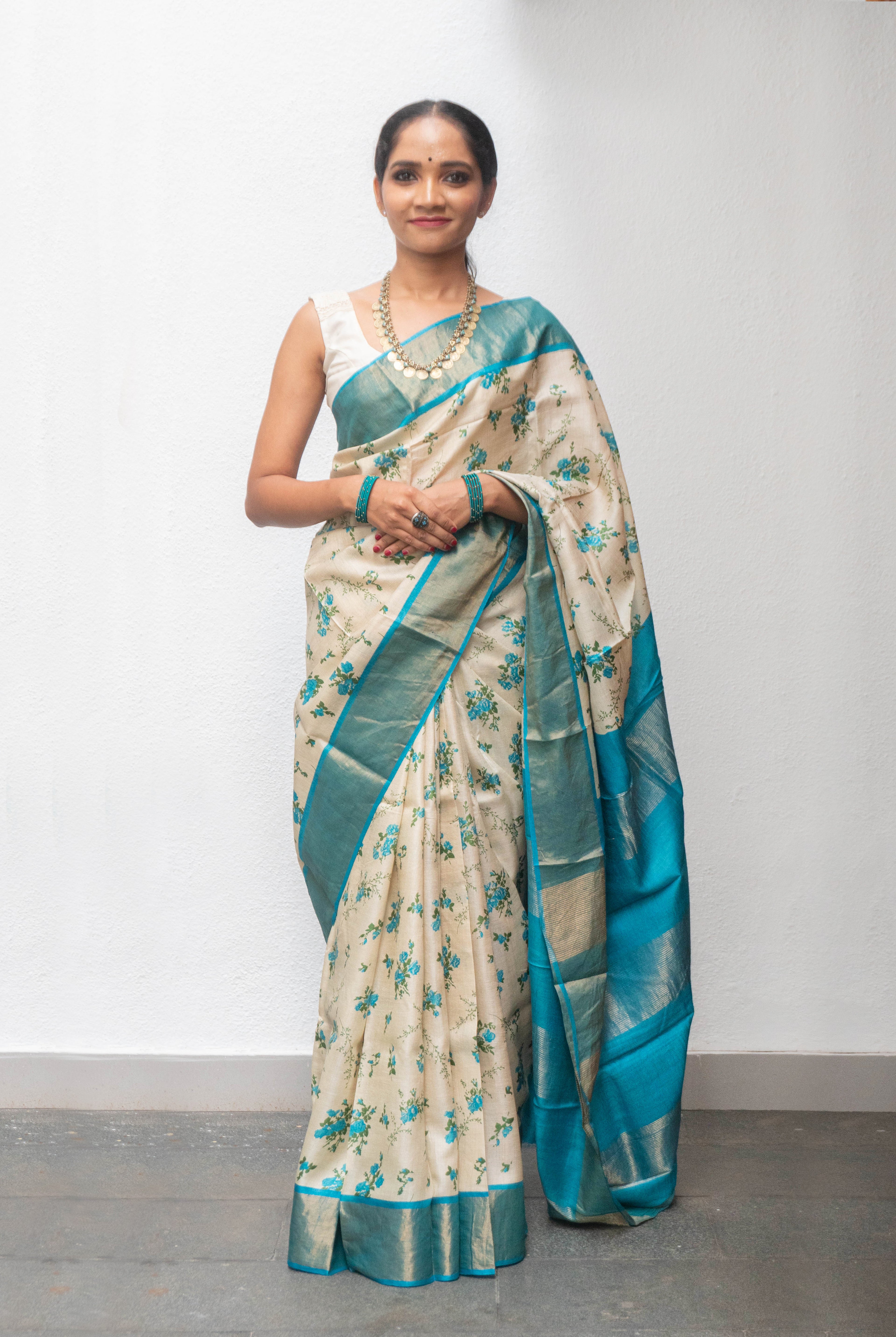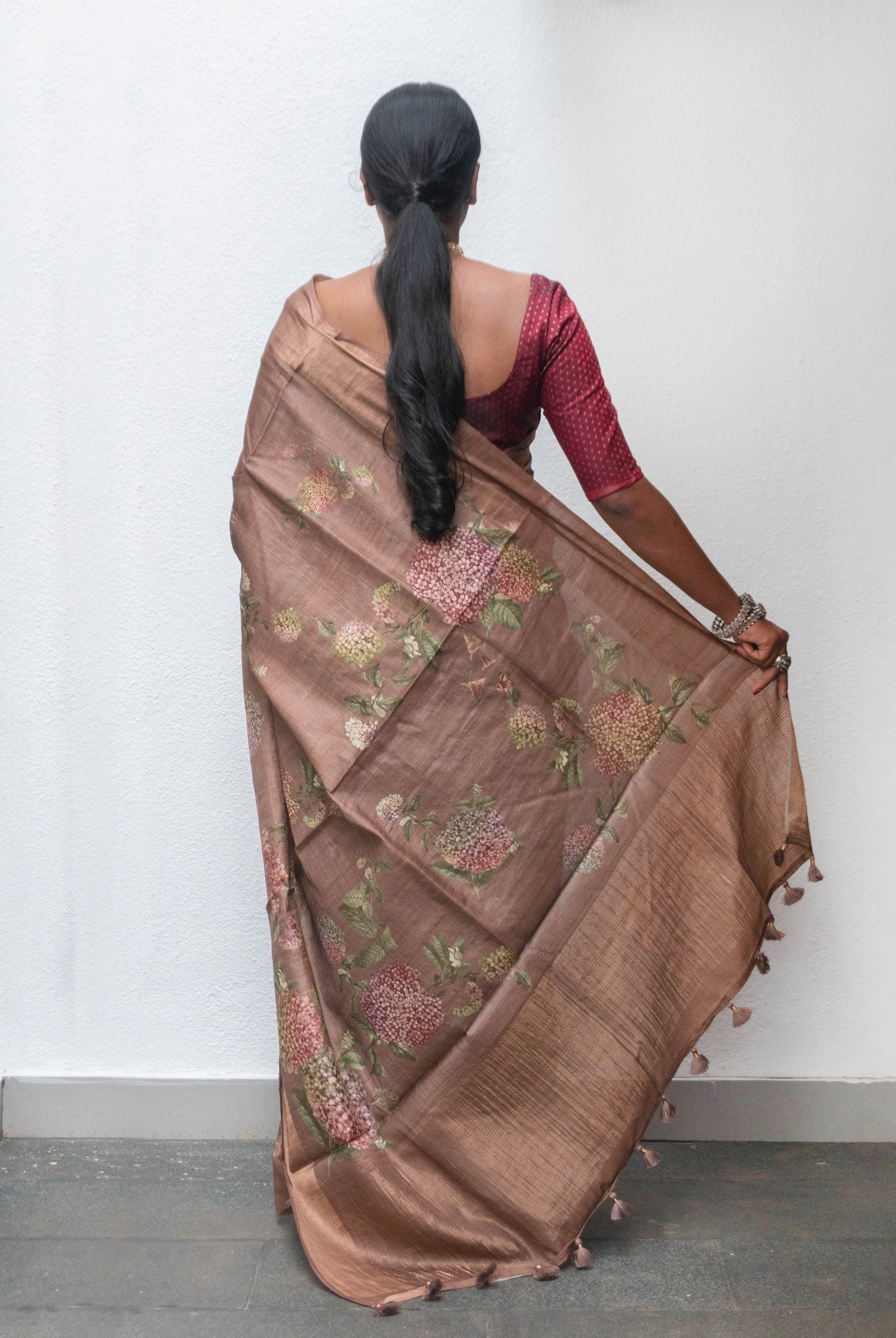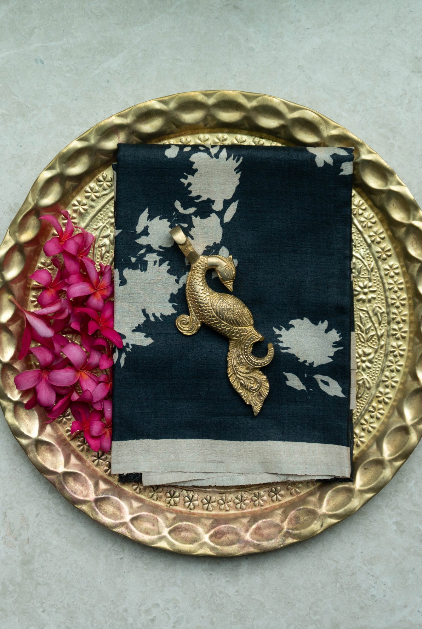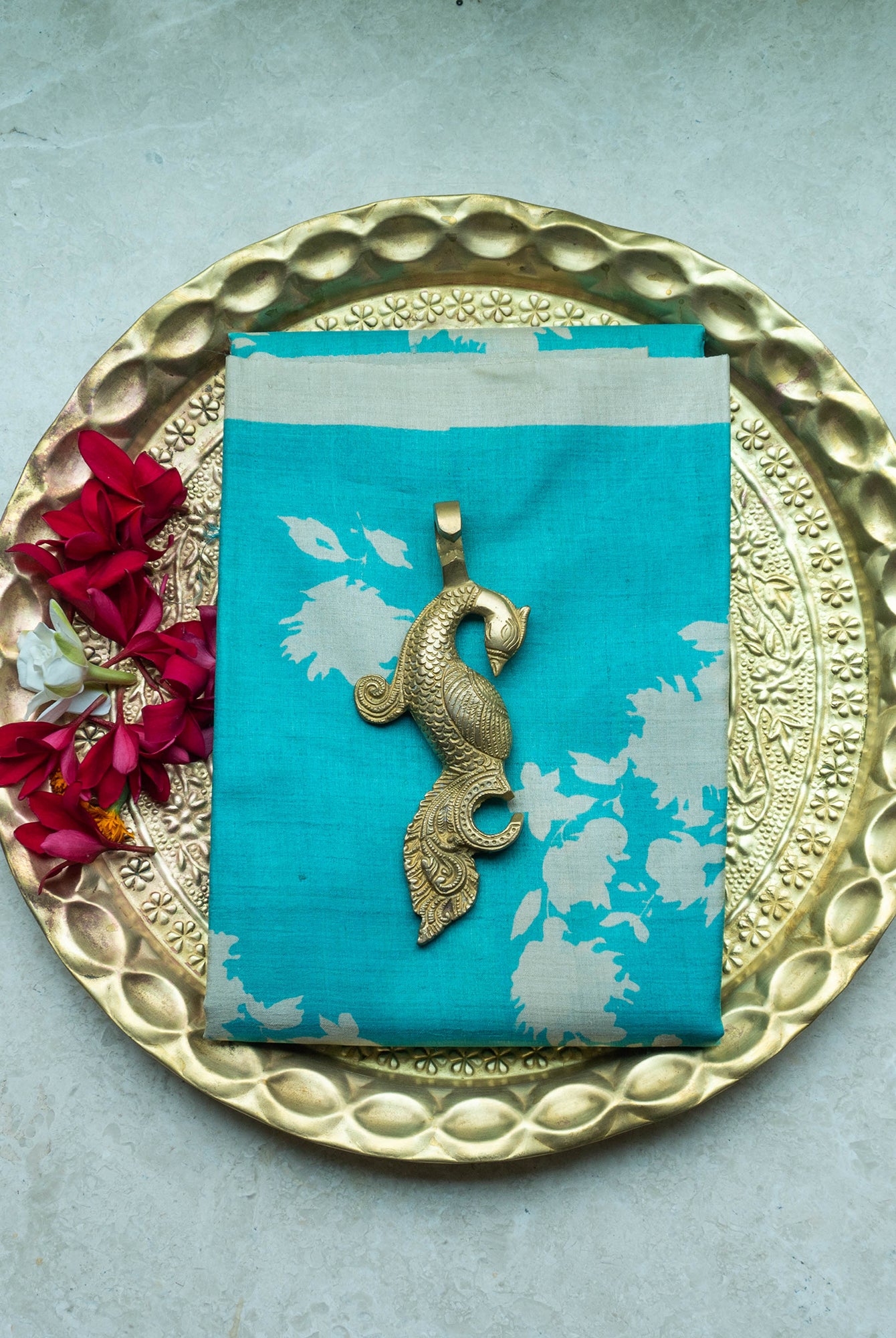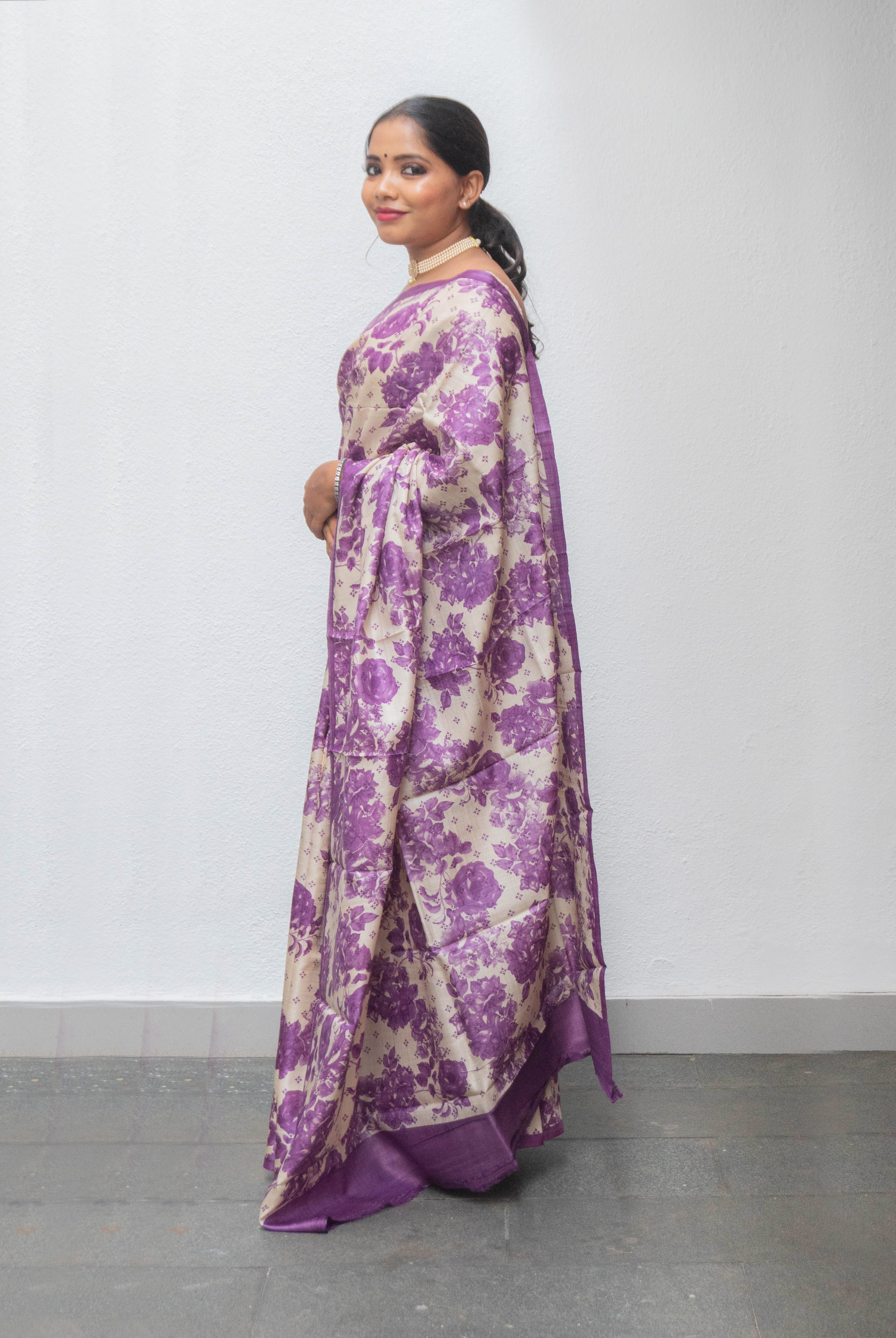Perfect for festive occasions, weddings, and cultural celebrations, this floral tussar silk saree pairs effortlessly with traditional or contemporary blouses.