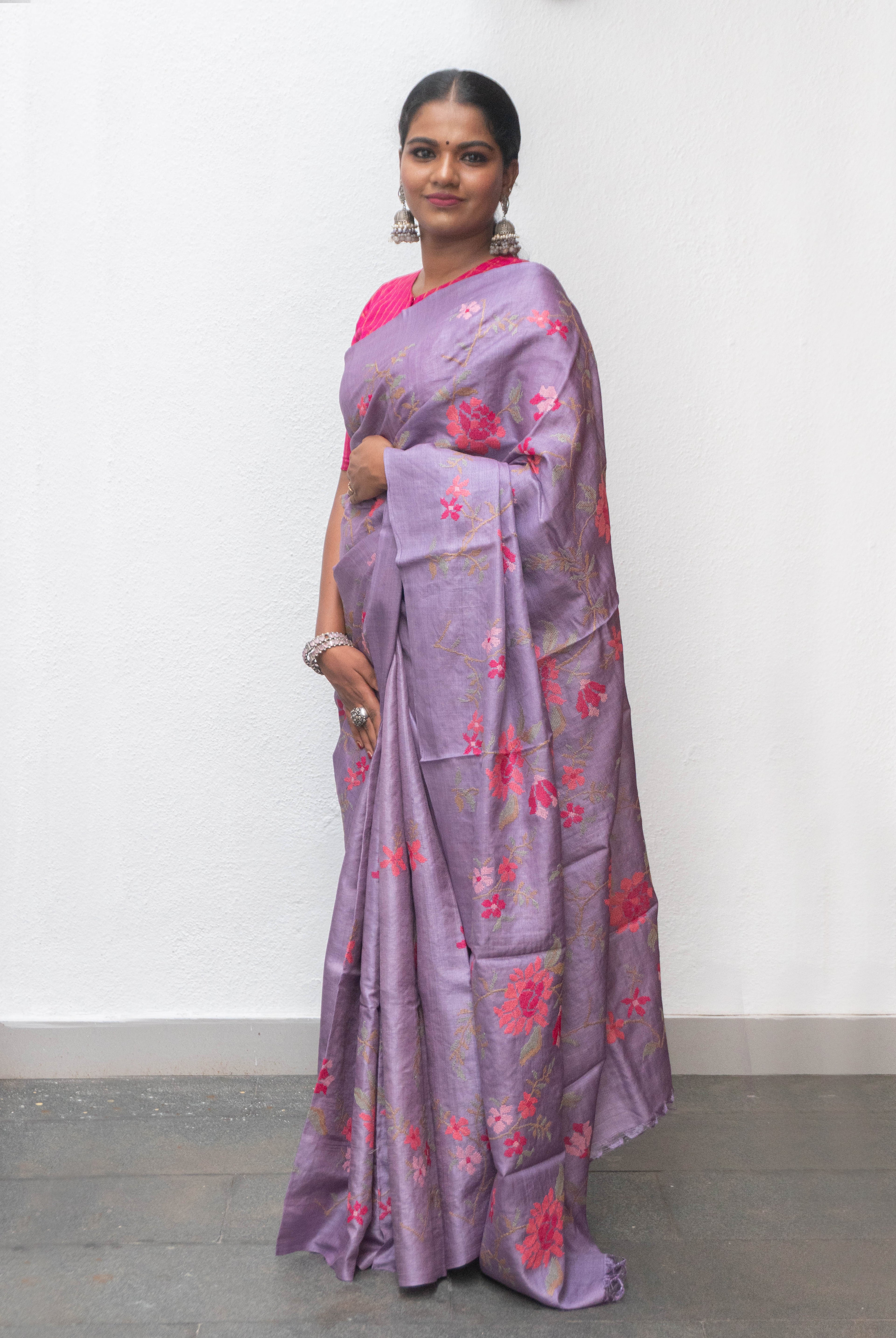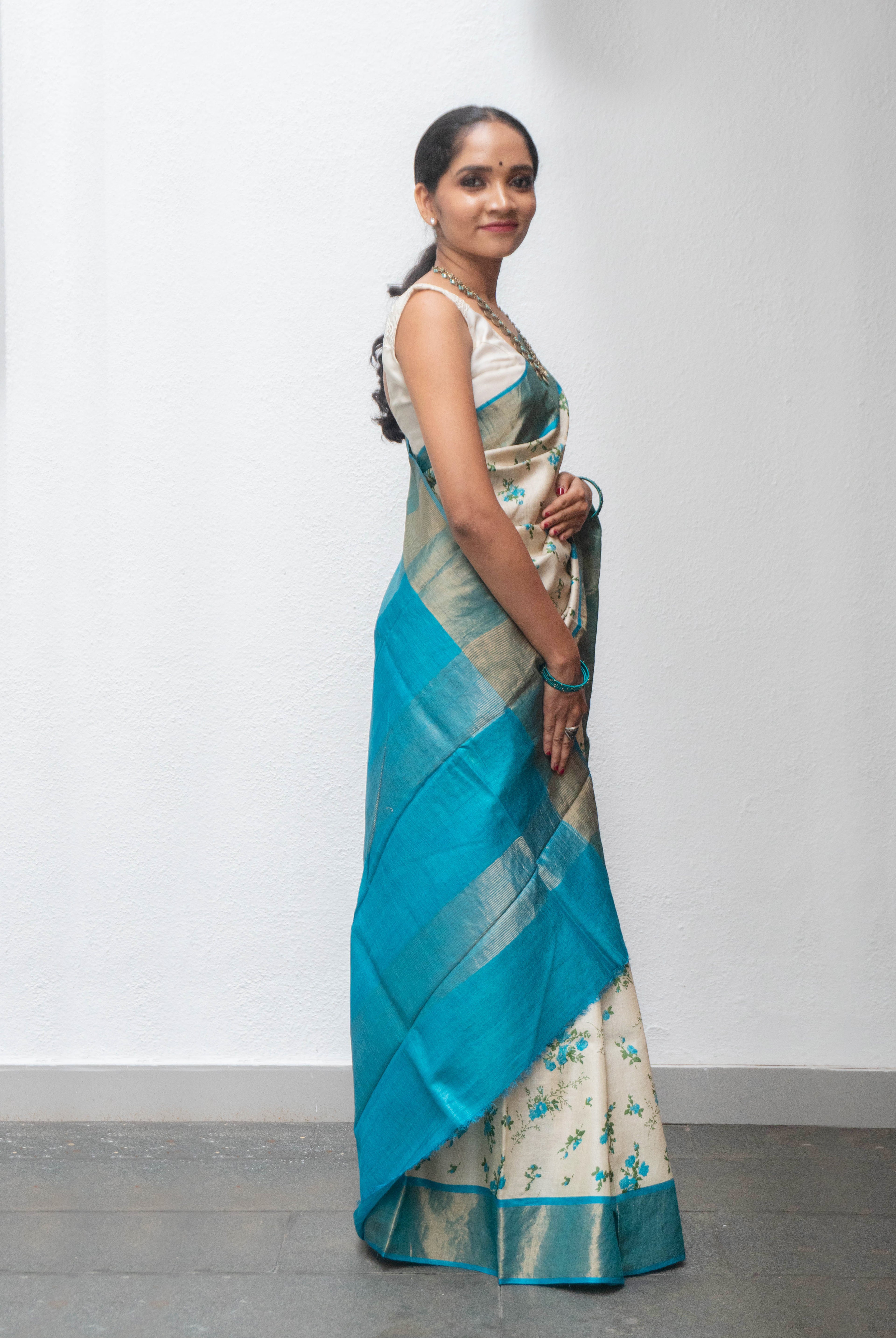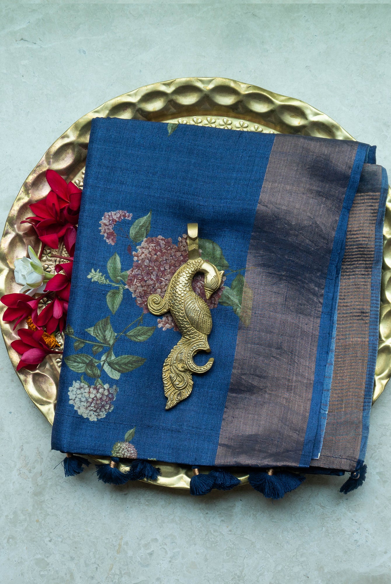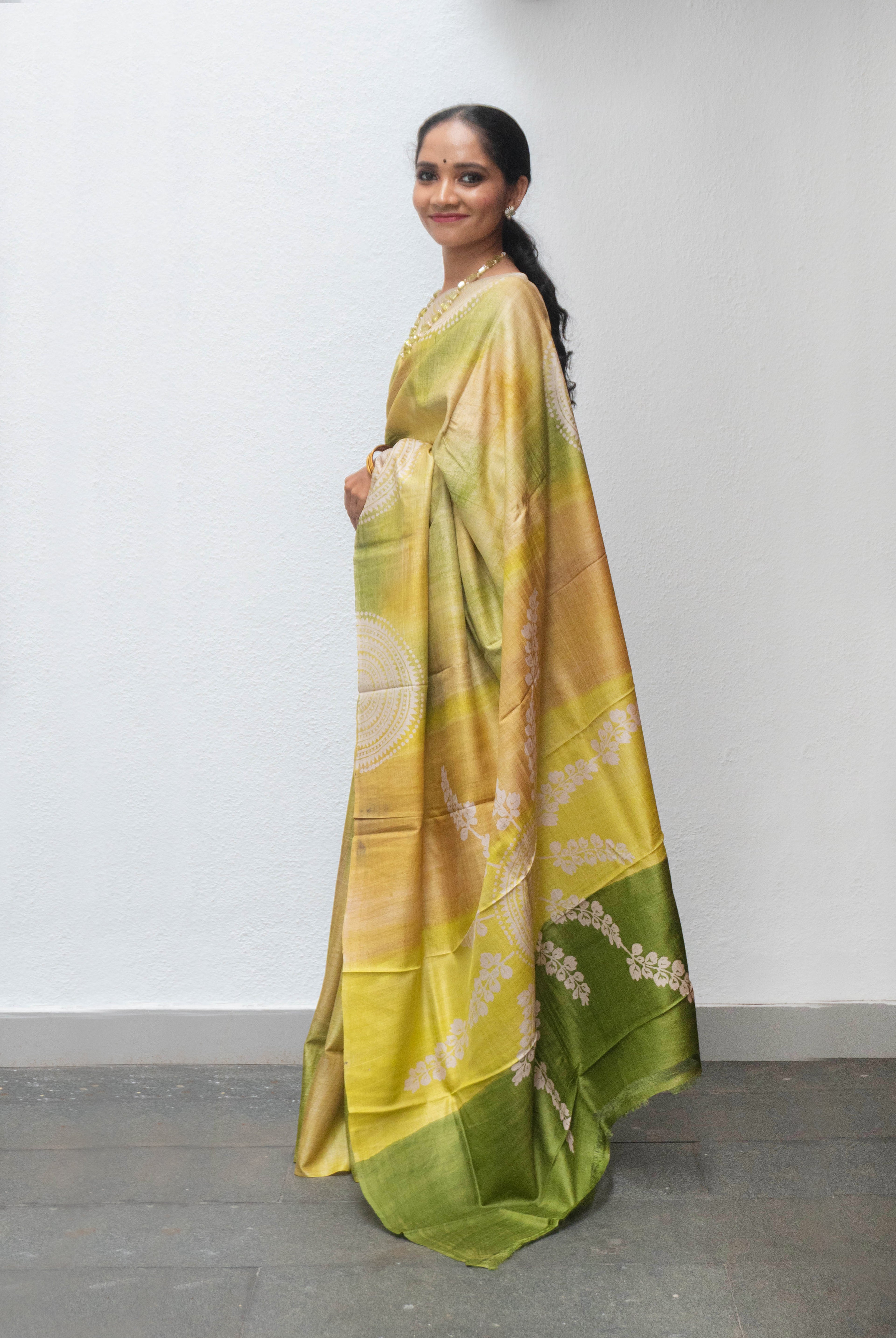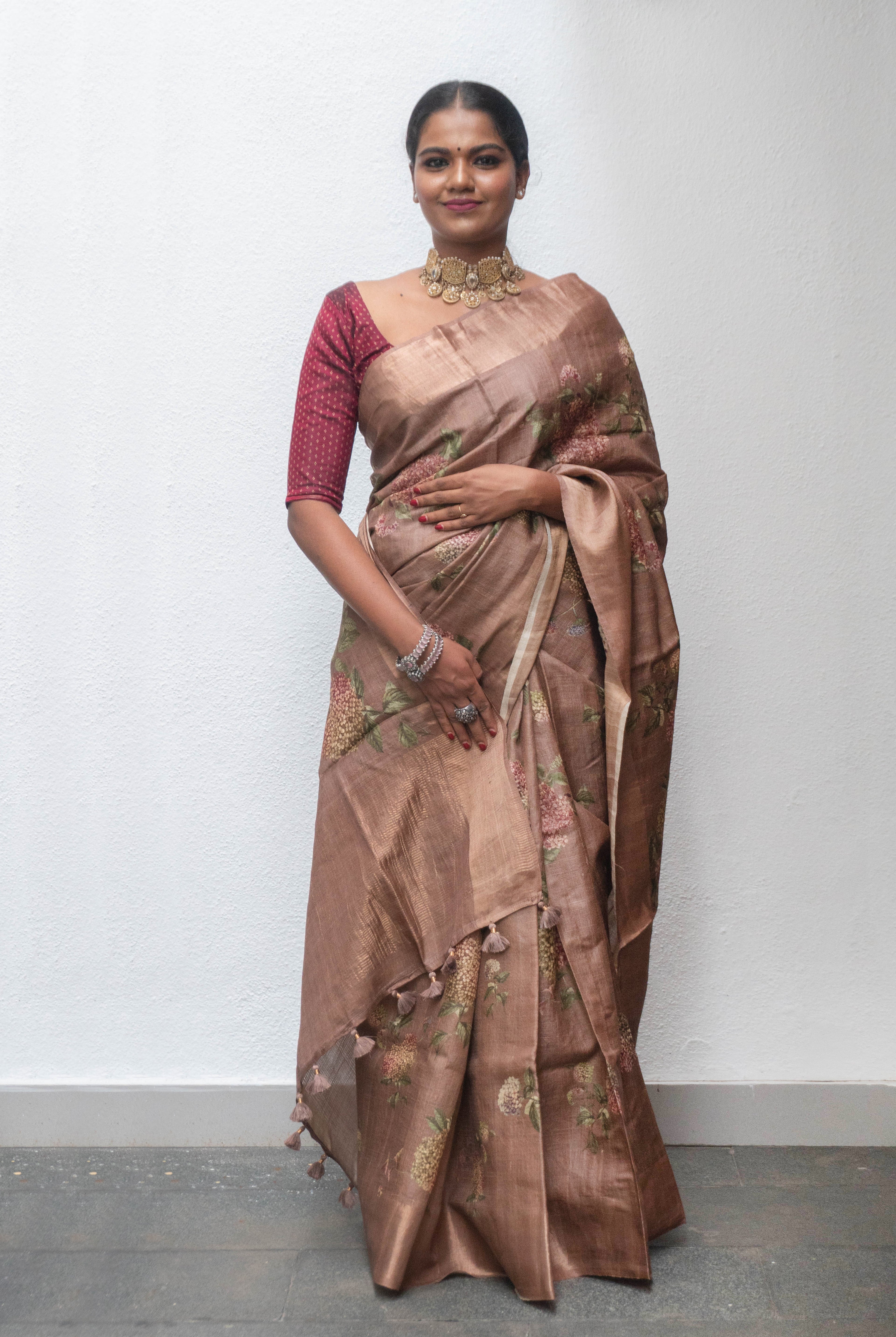 Perfect for festive occasions, weddings, and cultural celebrations, this floral tussar silk saree pairs effortlessly with traditional or contemporary blouses.