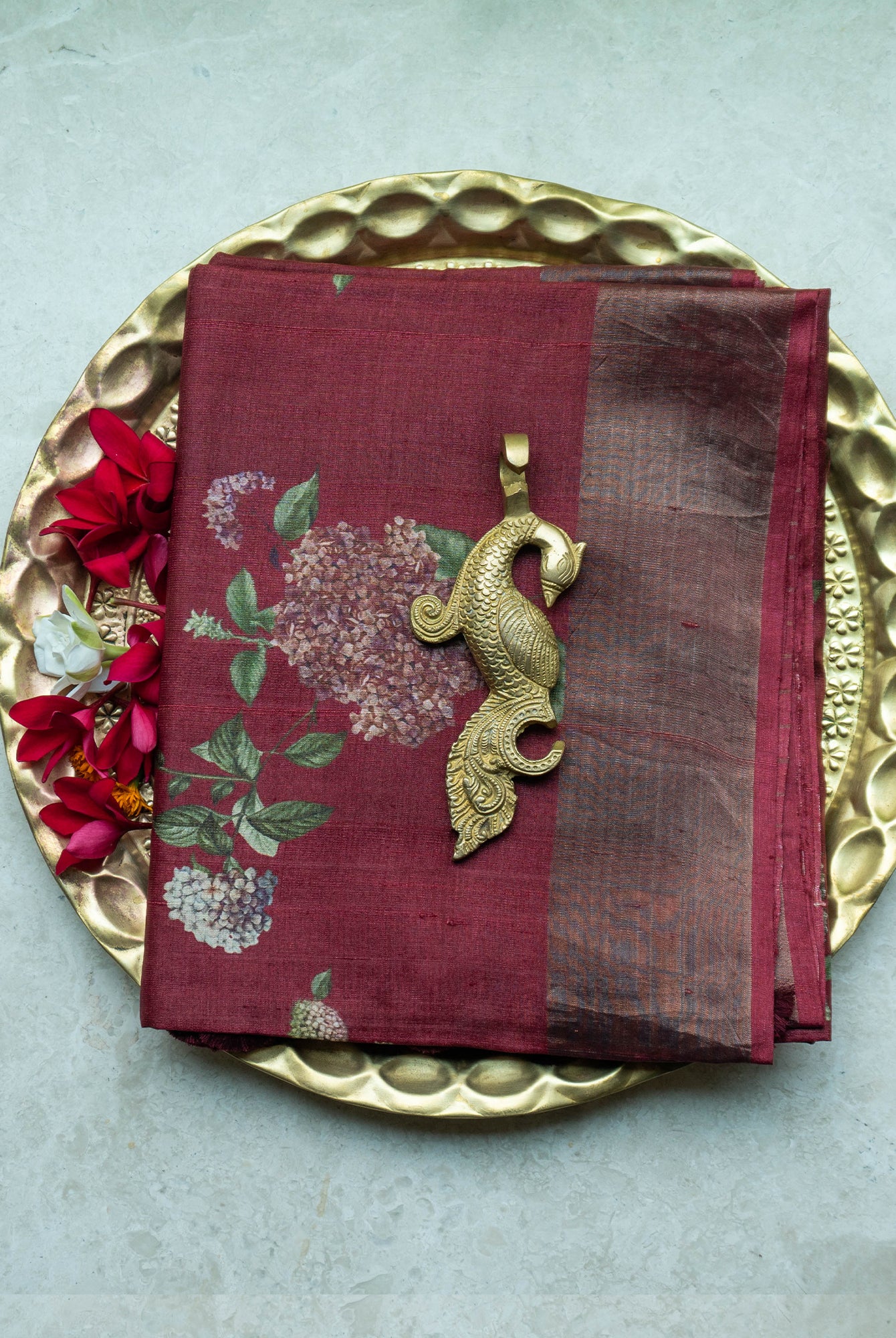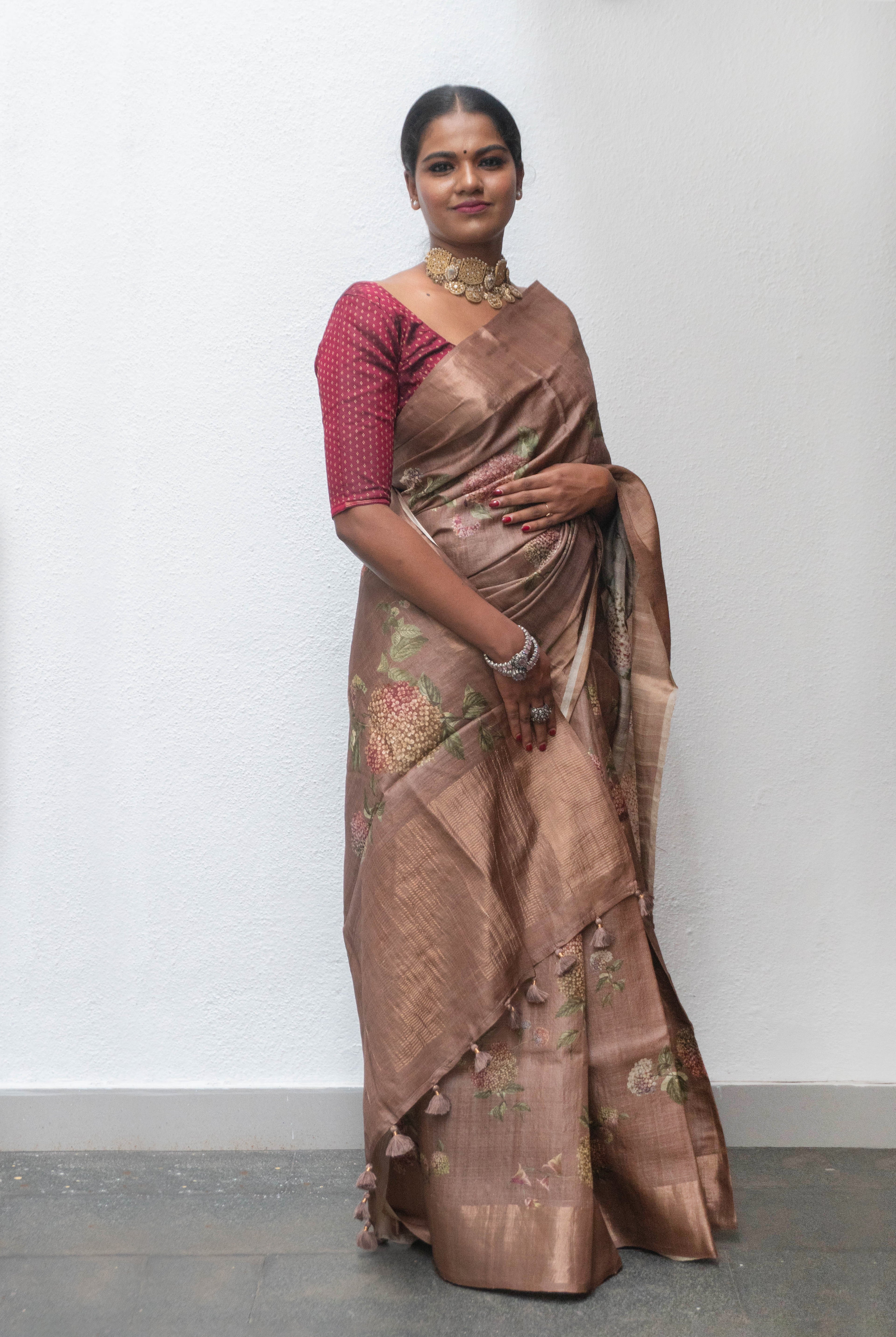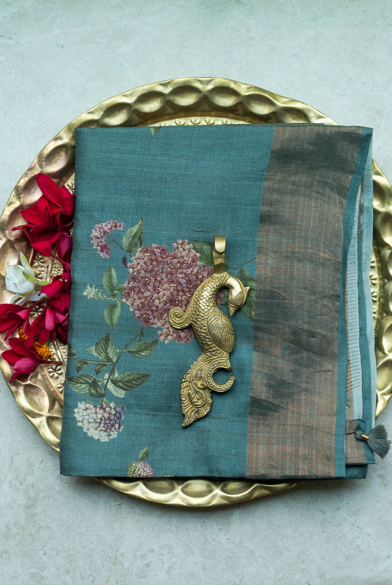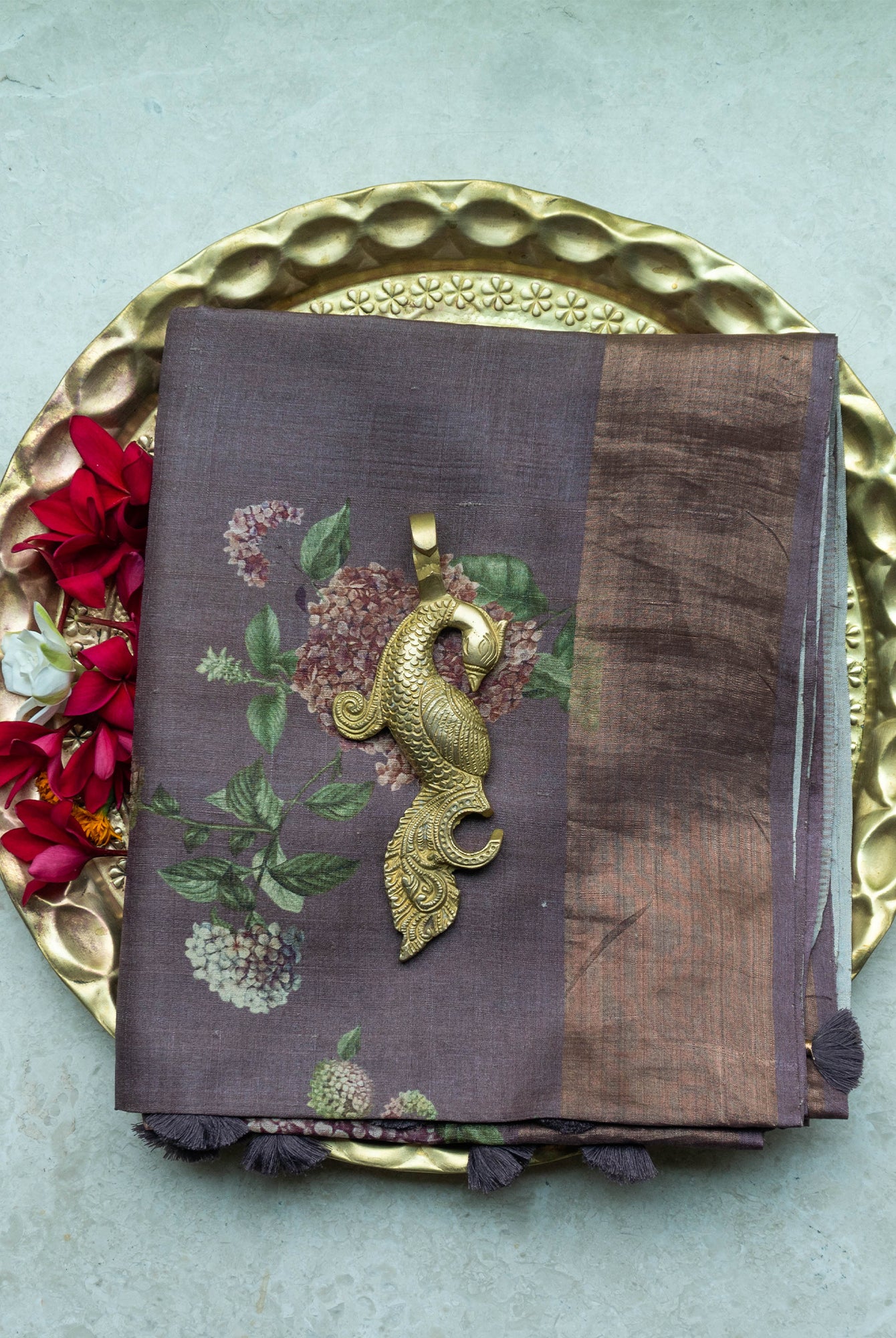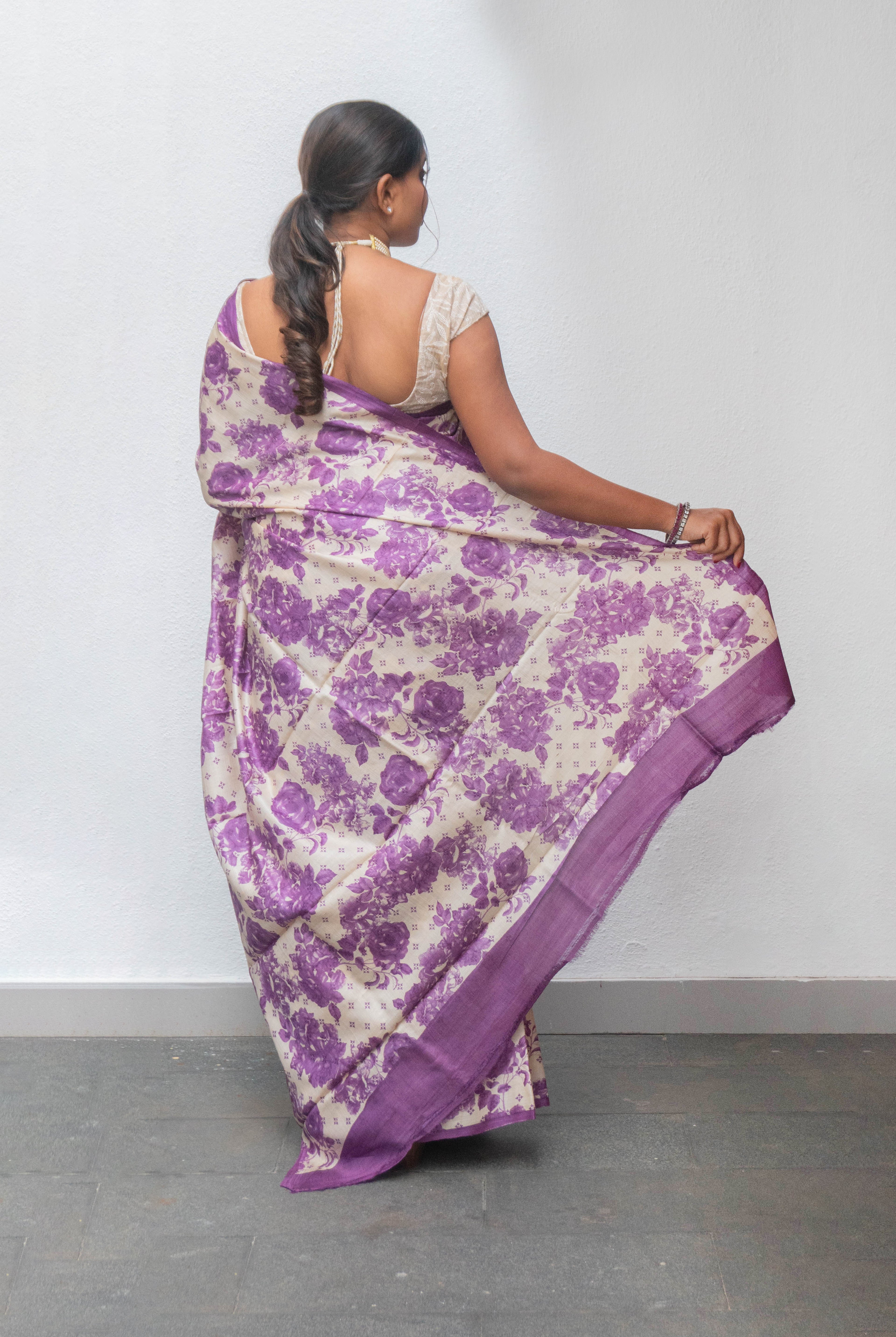 Perfect for festive occasions, weddings, and cultural celebrations, this floral tussar silk saree pairs effortlessly with traditional or contemporary blouses.