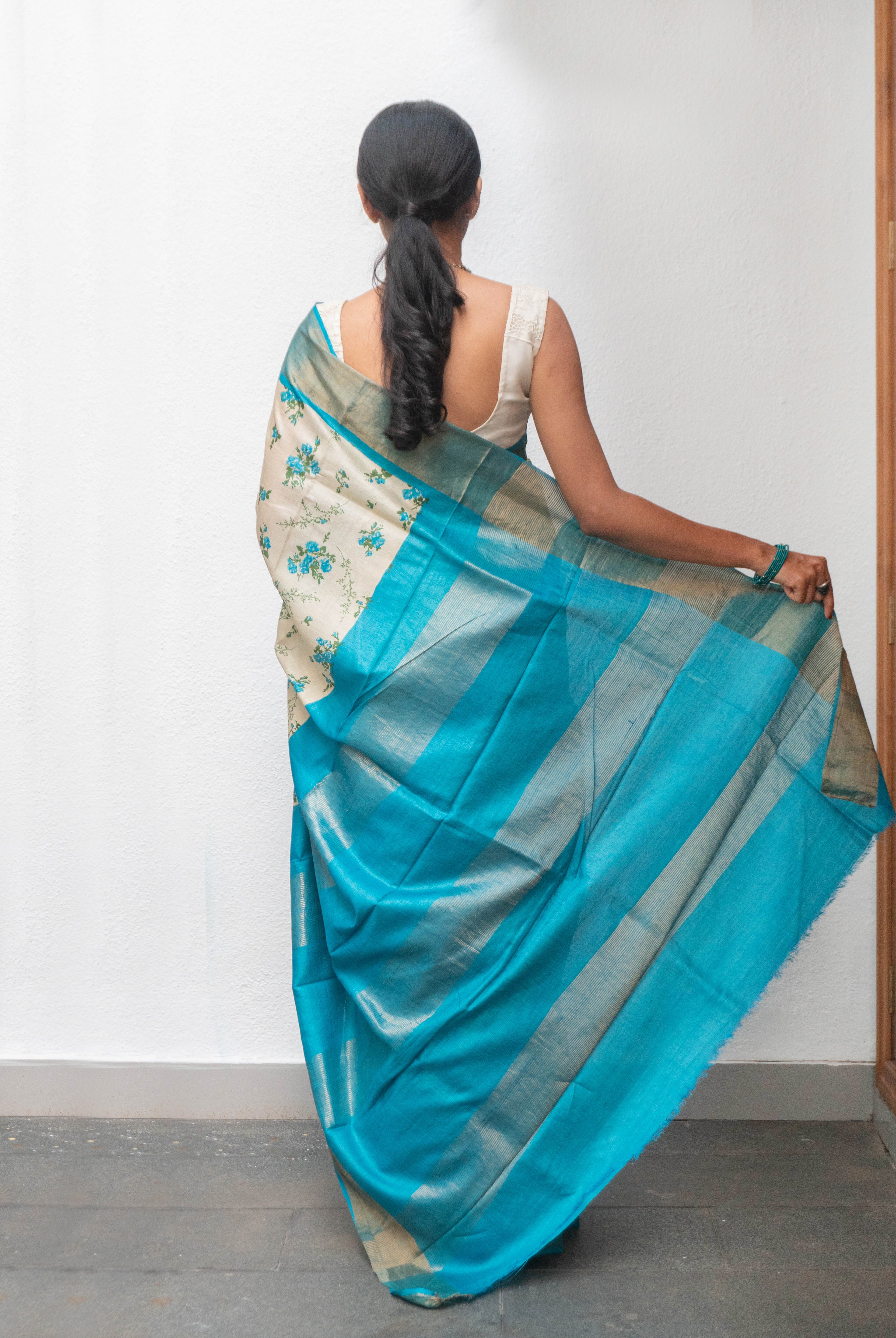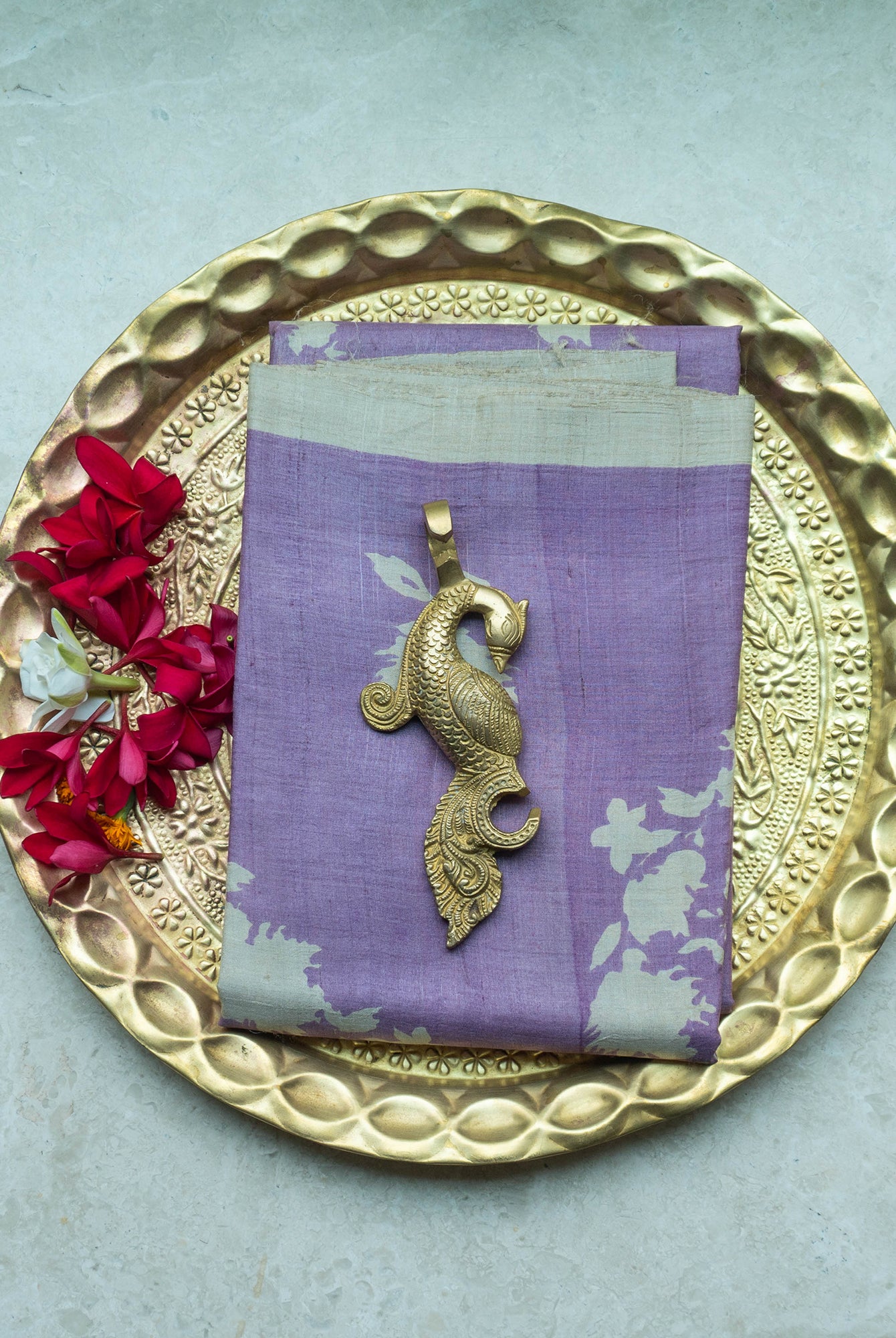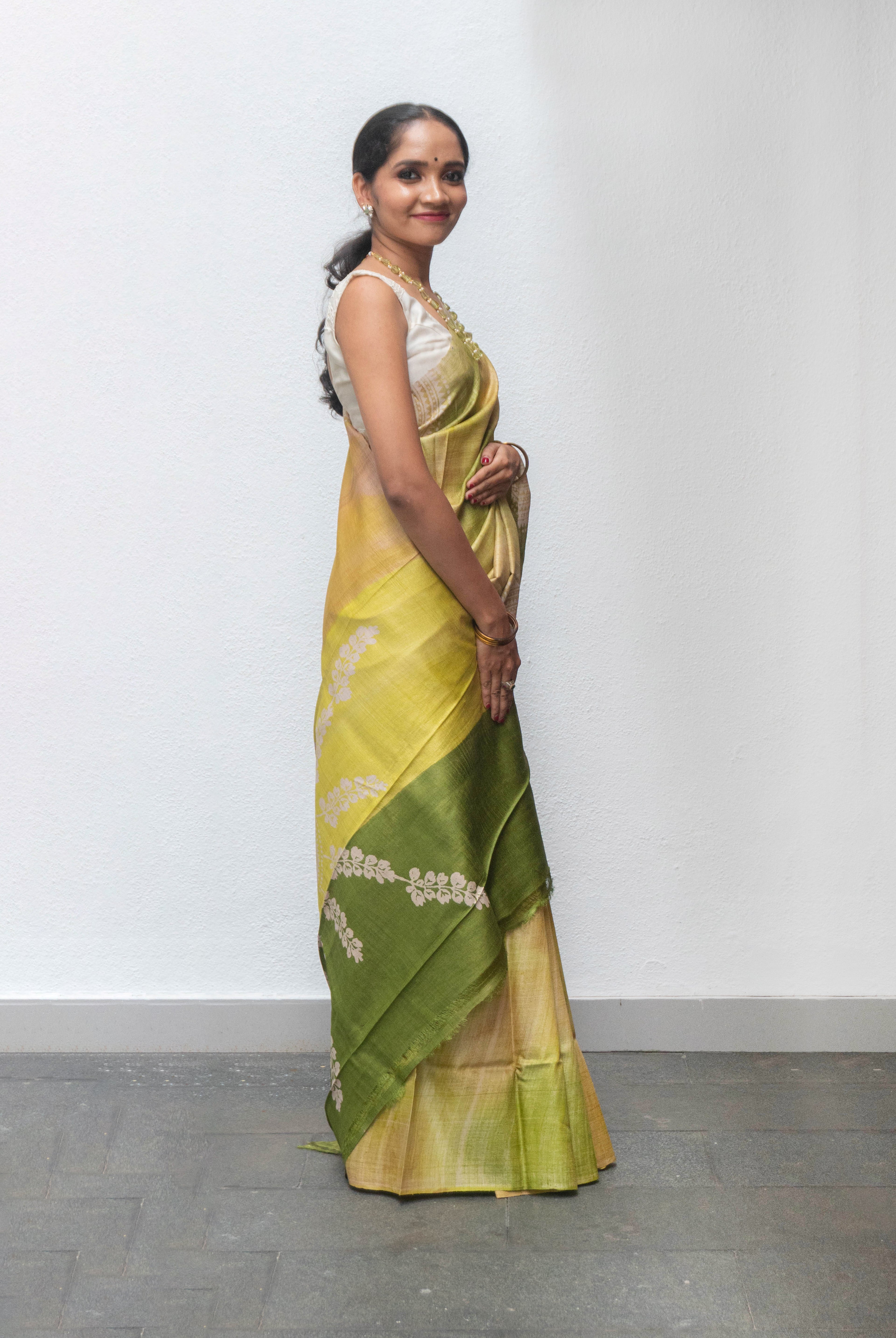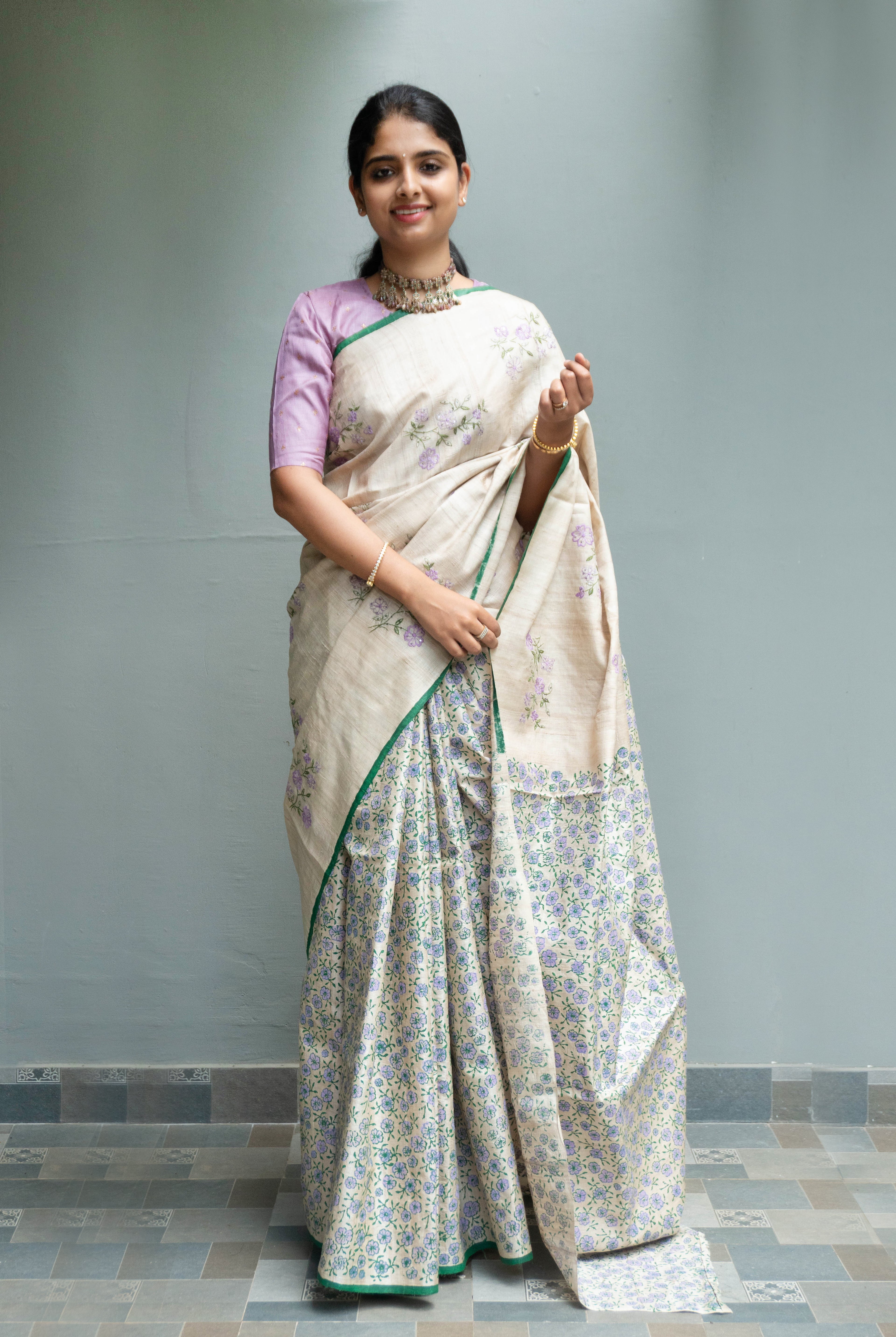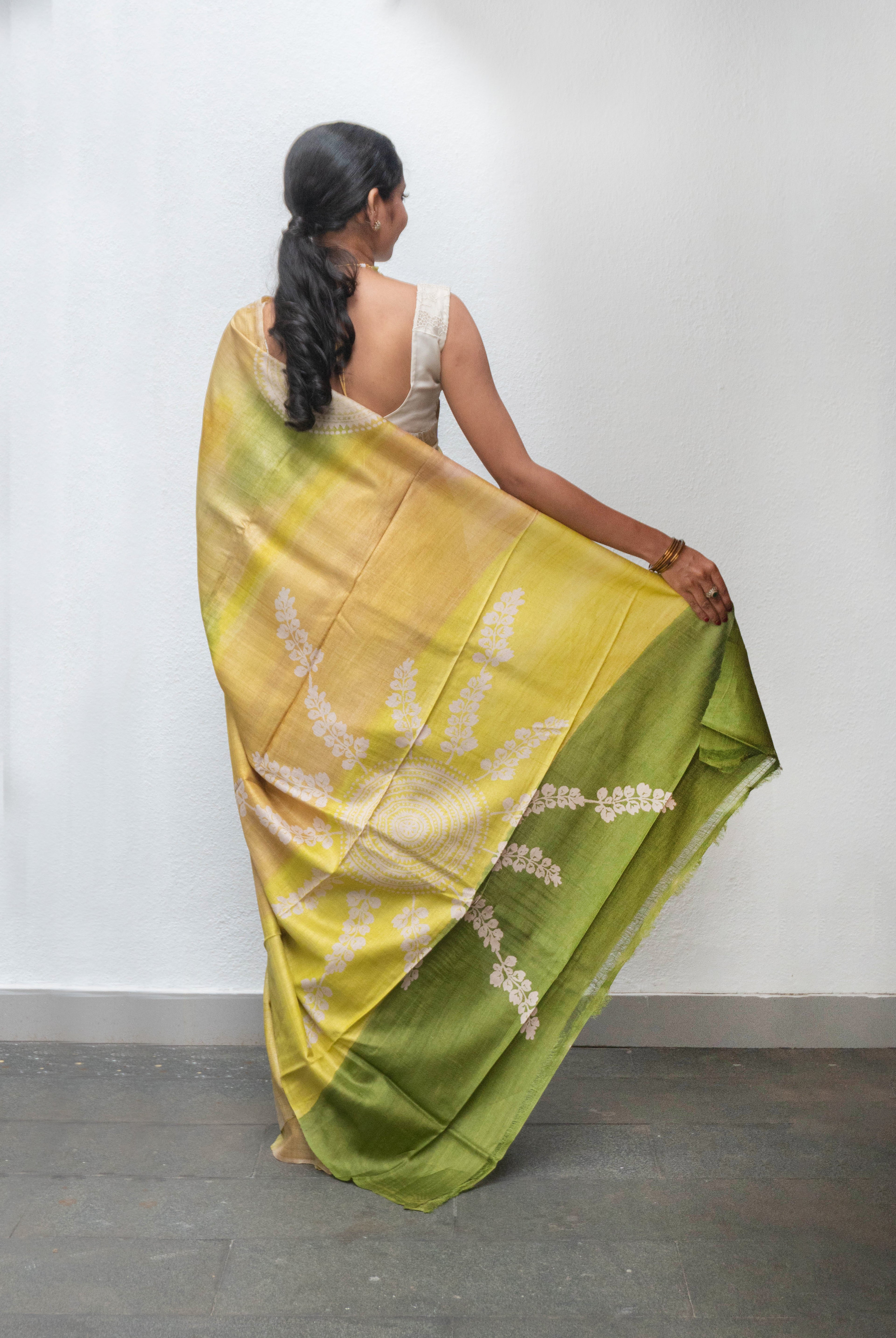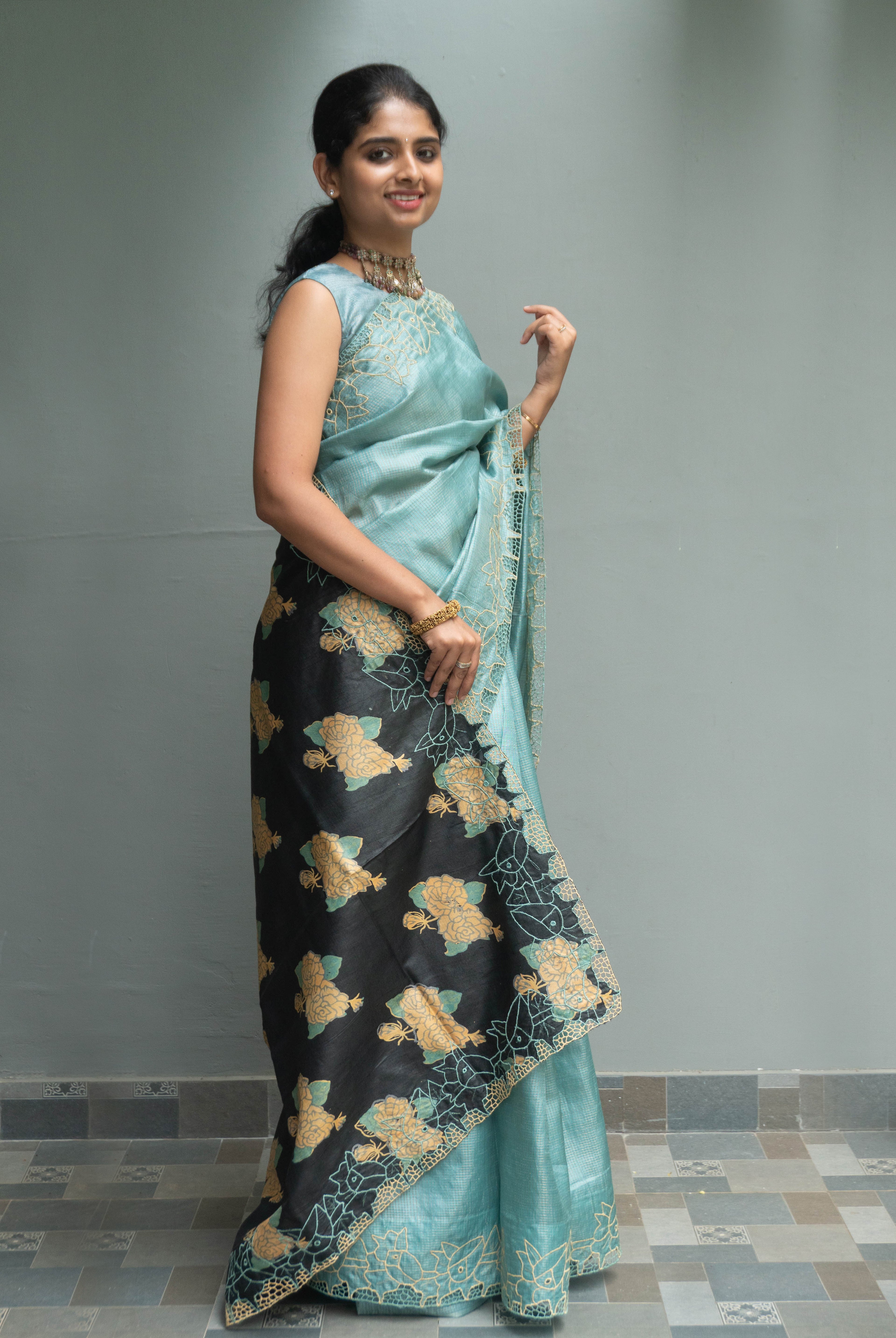 Perfect for festive occasions, weddings, and cultural celebrations, this floral tussar silk saree pairs effortlessly with traditional or contemporary blouses.