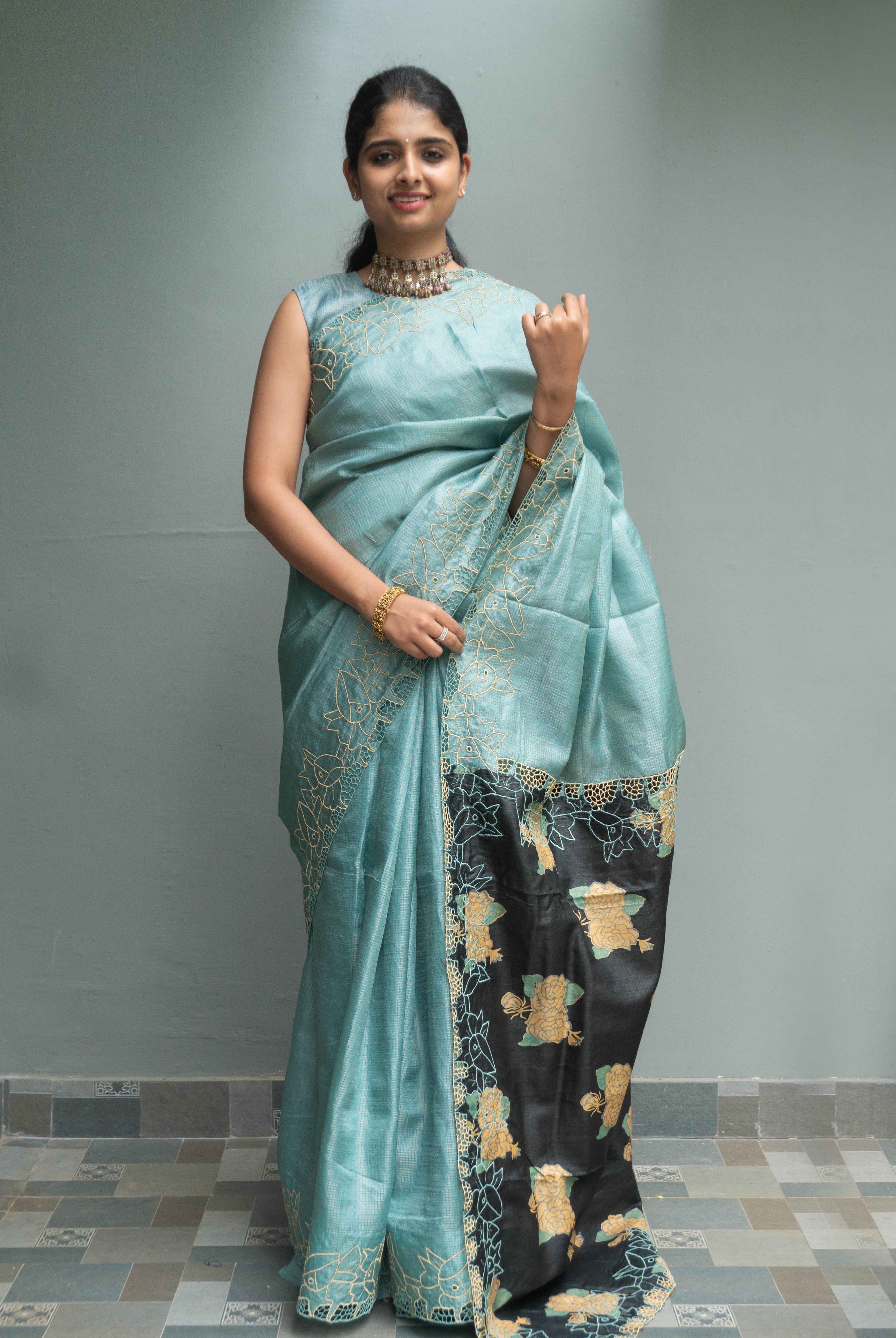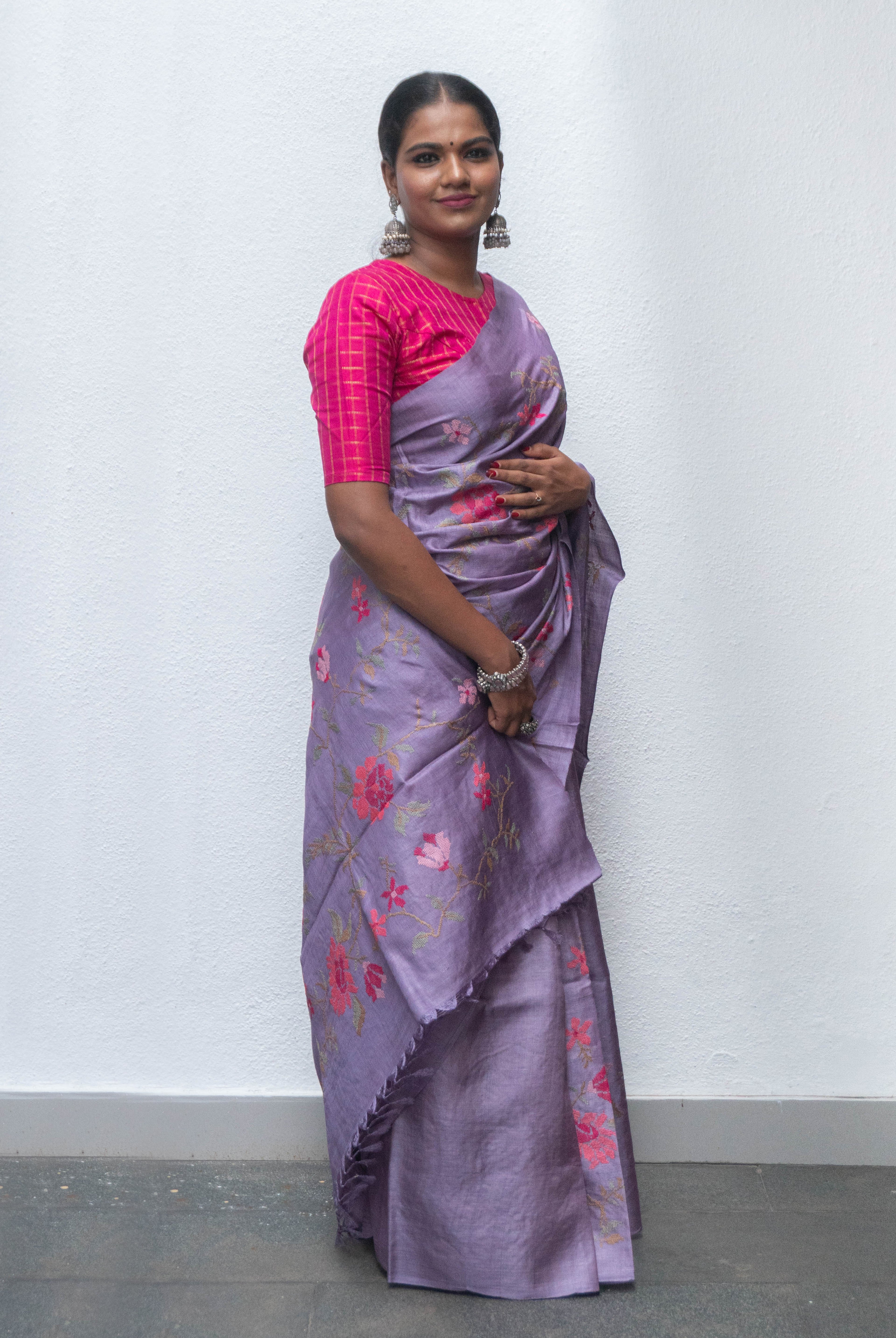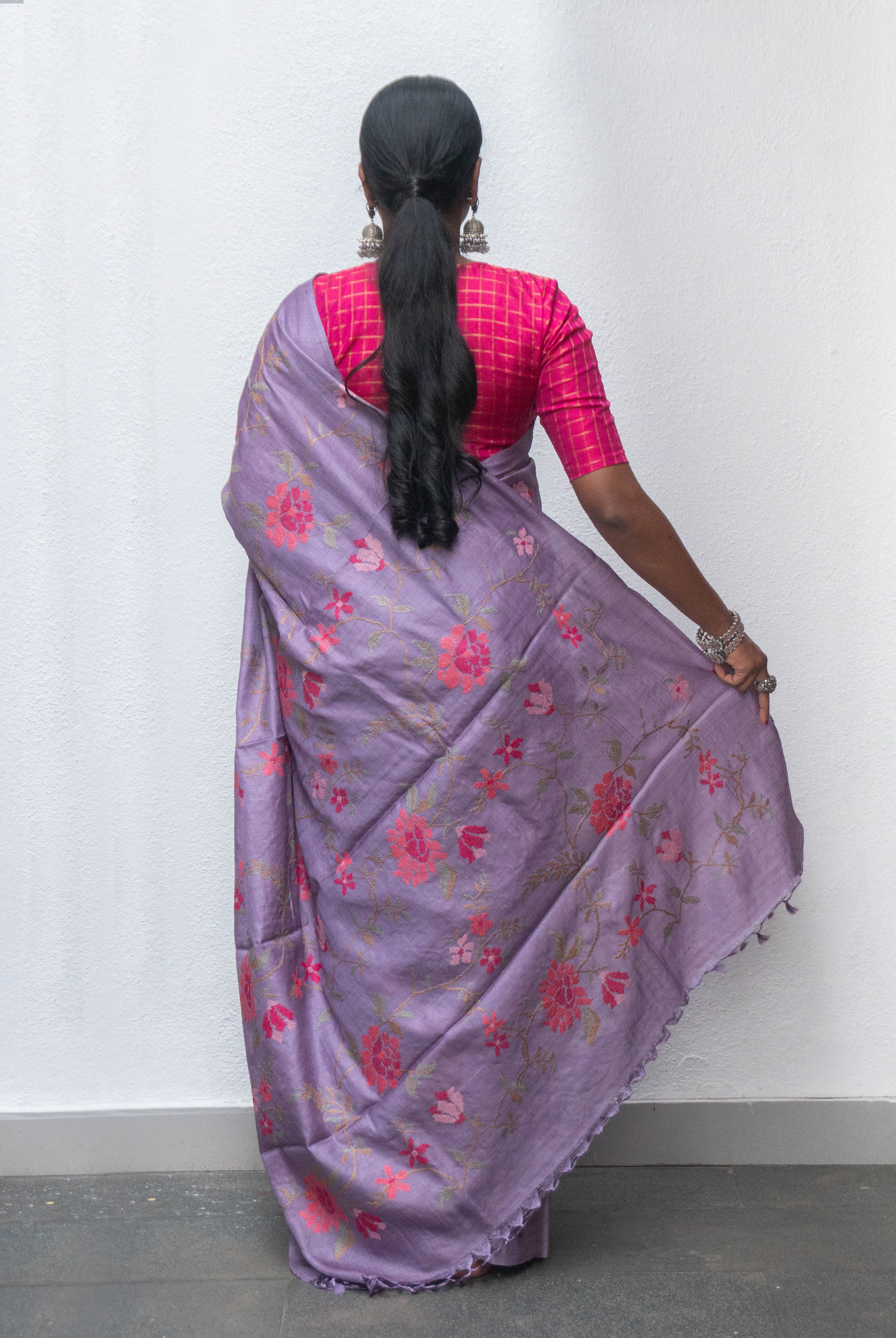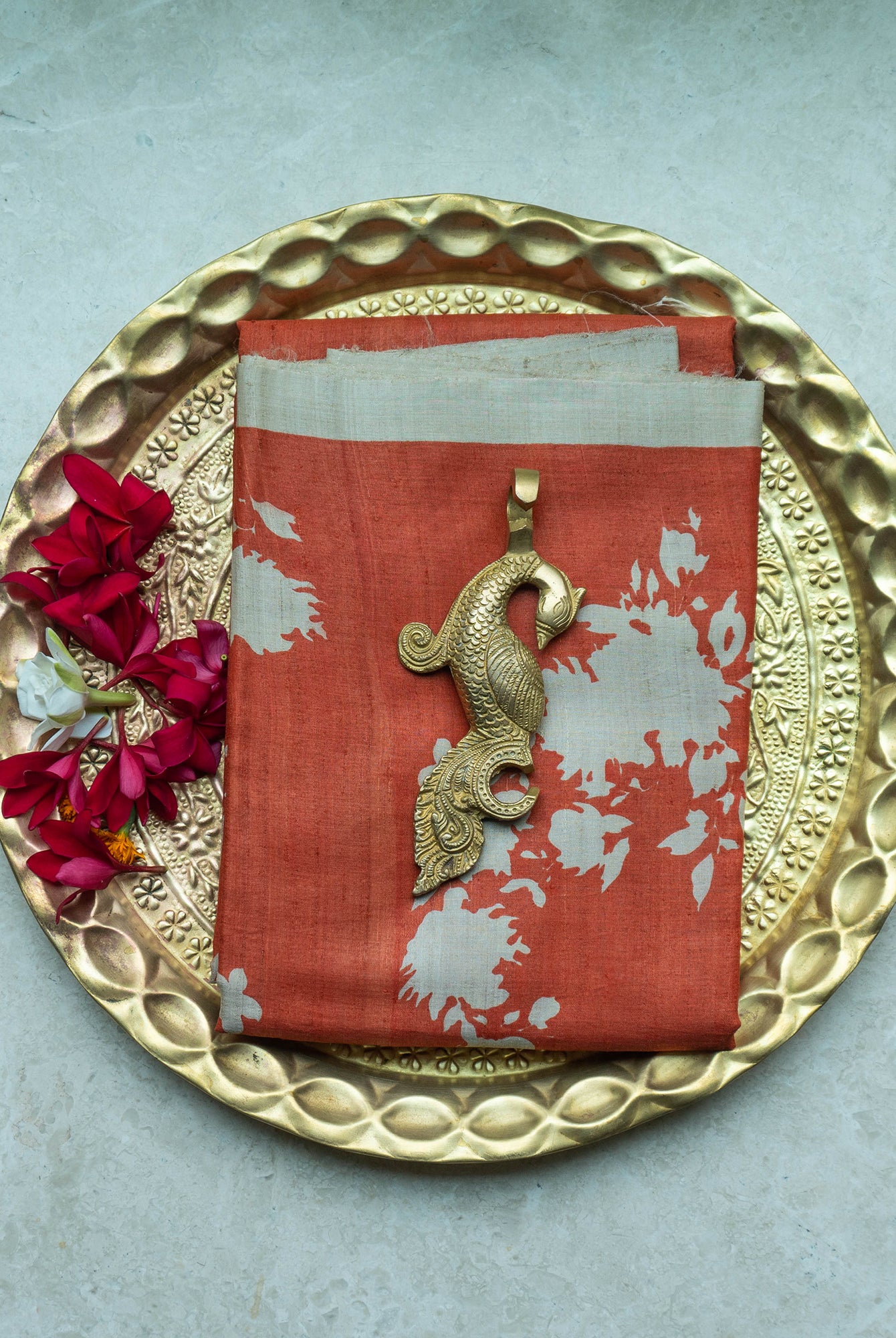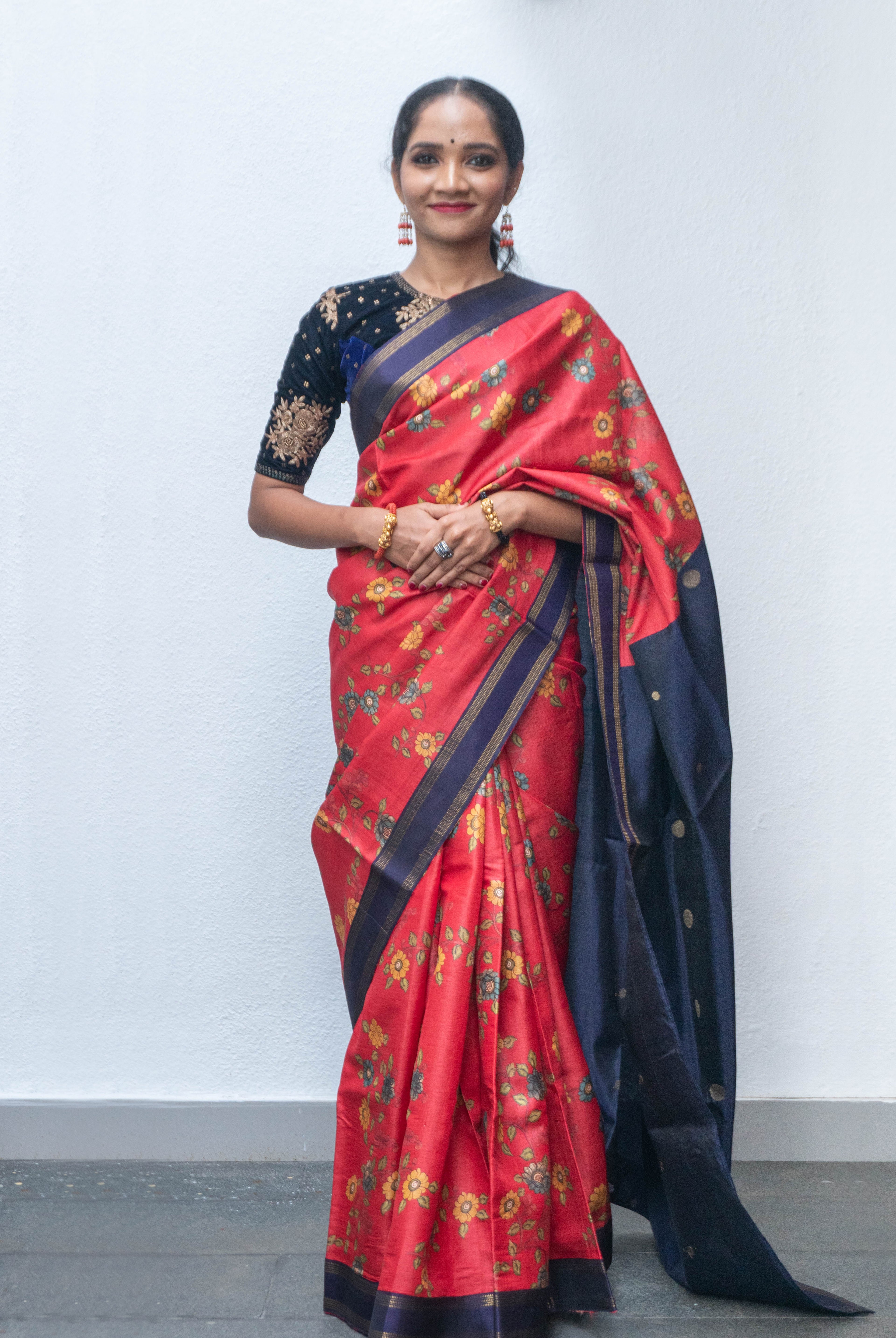 Perfect for festive occasions, weddings, and cultural celebrations, this floral tussar silk saree pairs effortlessly with traditional or contemporary blouses.