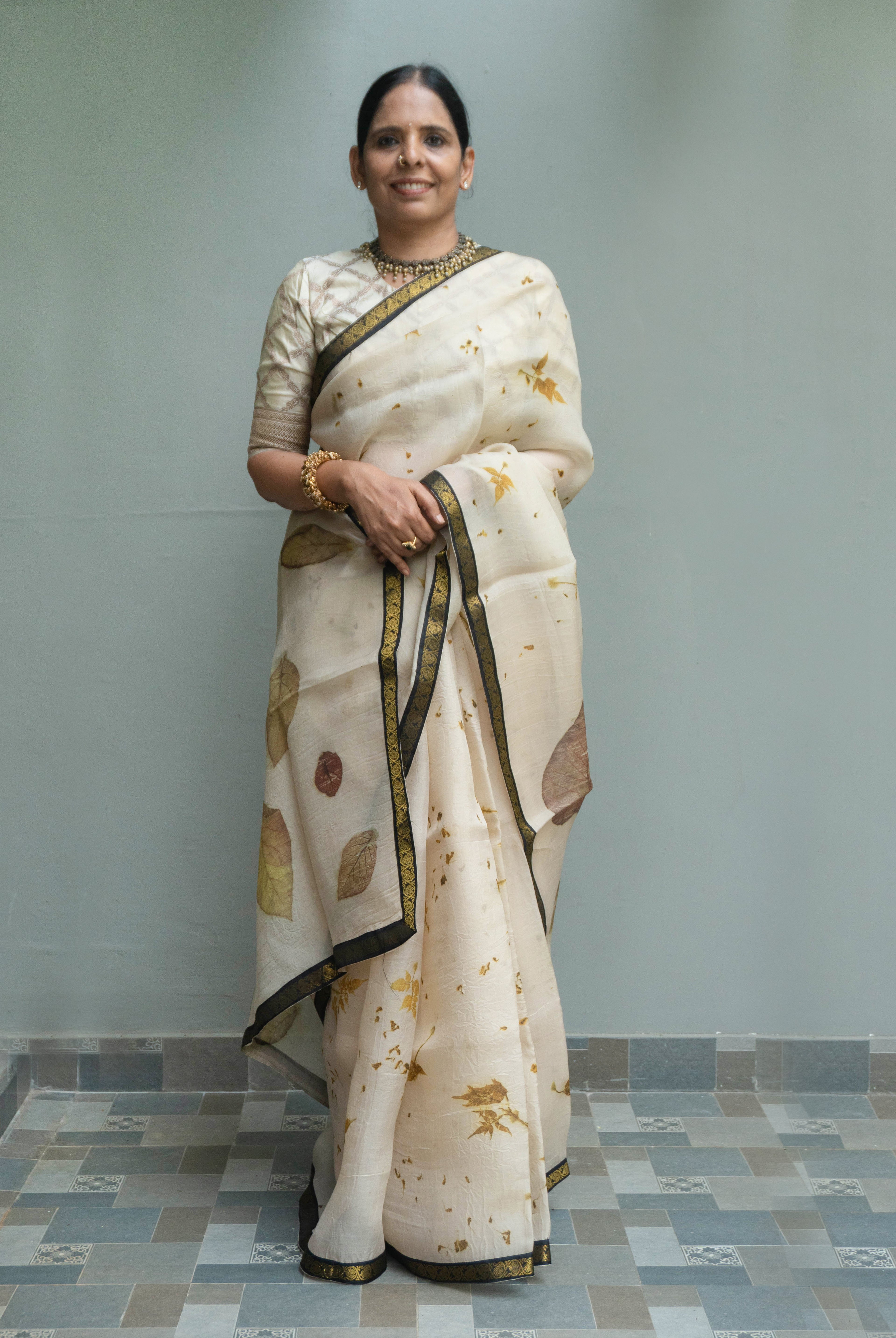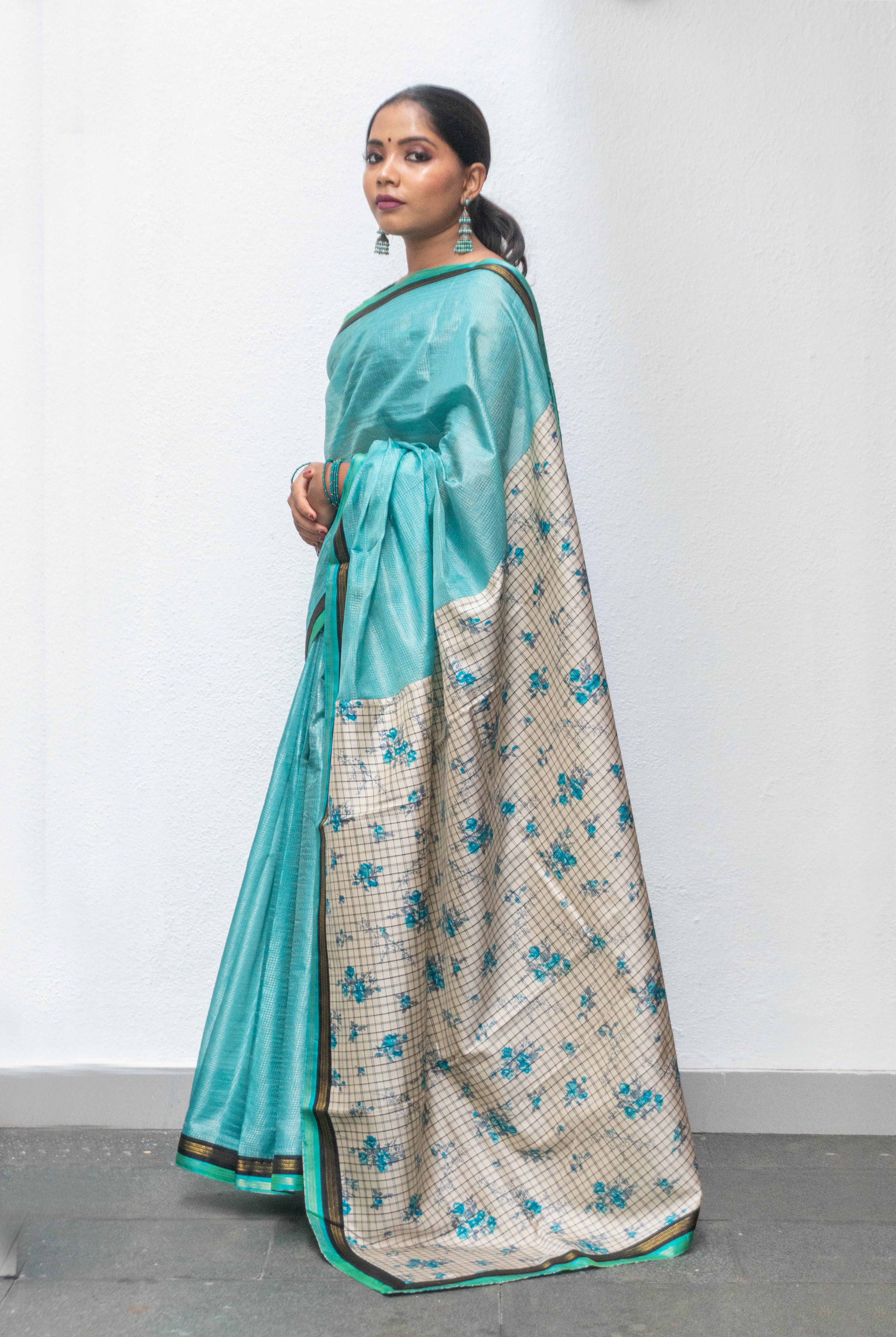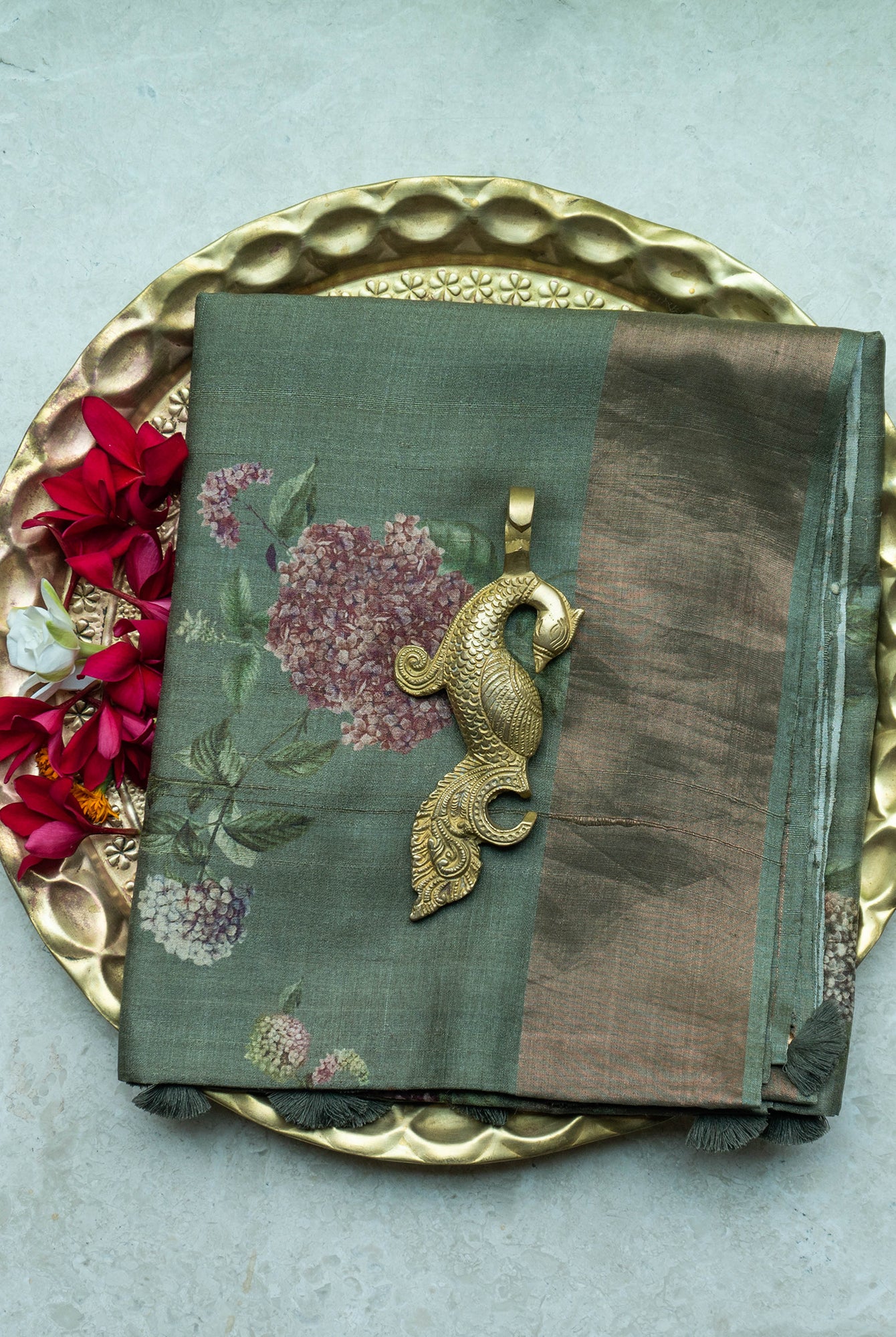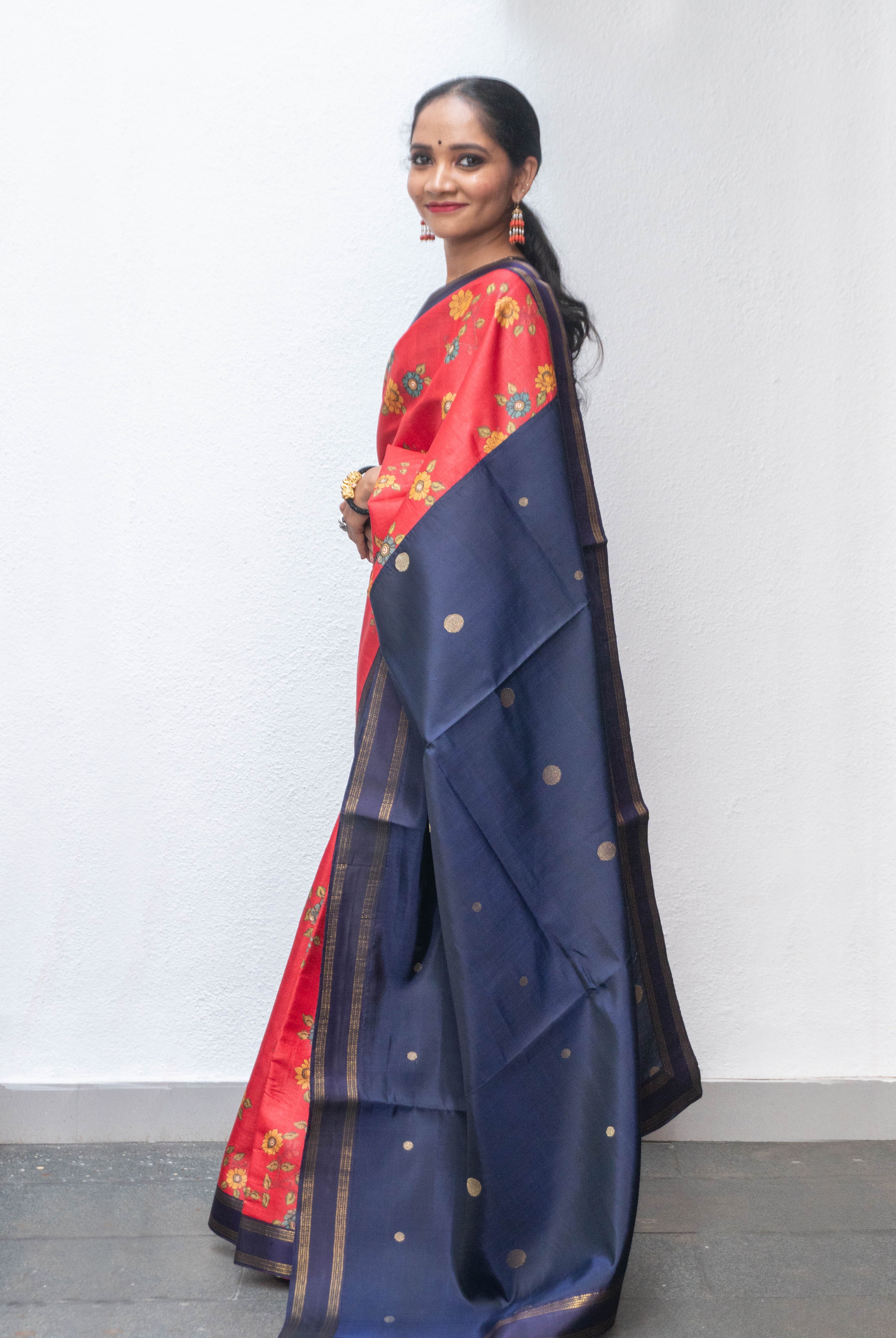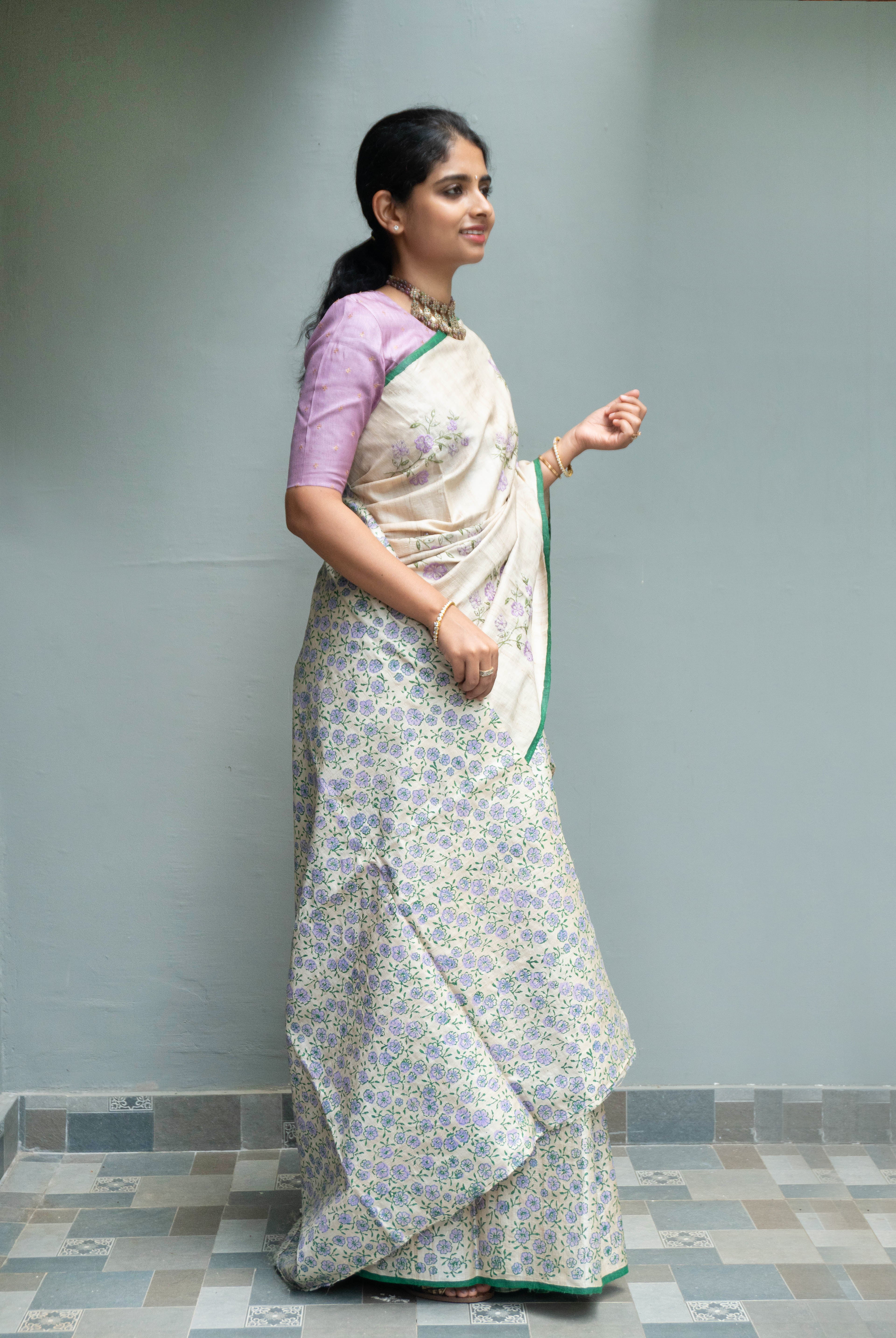 Perfect for festive occasions, weddings, and cultural celebrations, this floral tussar silk saree pairs effortlessly with traditional or contemporary blouses.